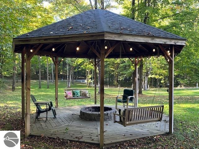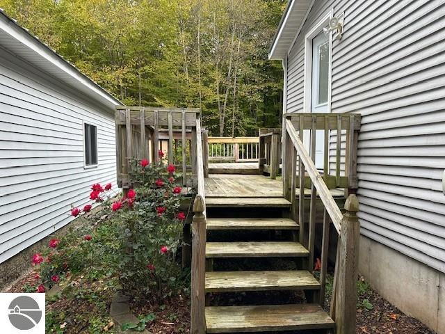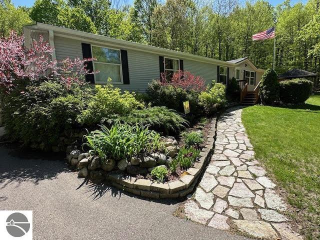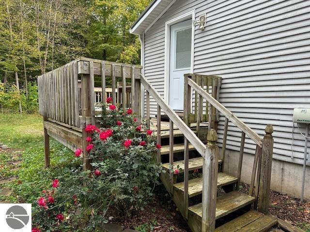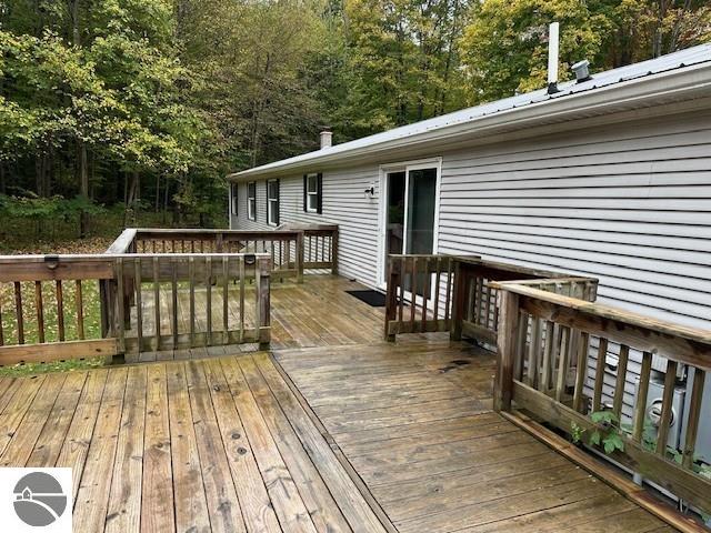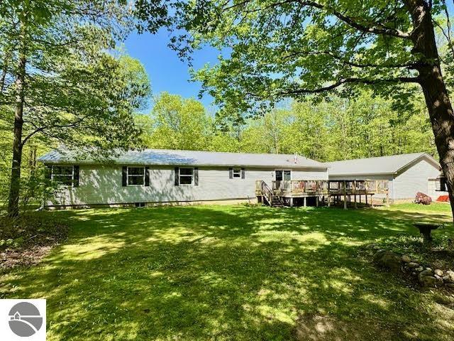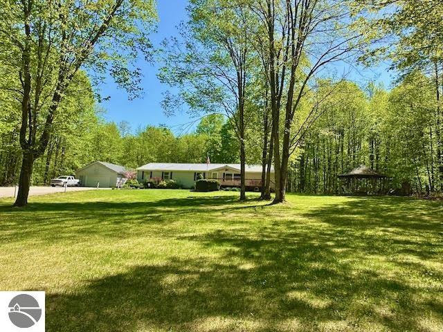 Nestled just outside of Bellaire, this 4 bedroom, 3.5 bath home offers a peaceful wooded oasis on nearly 4 acres. Features laminate flooring throughout the main floor, open kitchen with island, family room with new electric fireplace, spacious master bedroom with private bath, newly painted walls, full, completely encapsulated basement with 2 large, finished craft/hobby/workshop rooms and built-in bar area, Beautiful landscaped yard, outdoor gazebo and 24x44 insulated, detached garage w/new lighting and opener. Many new updates in 2024 including rain gutters, furnace, AC unit, hot water heater, refrigerator, stove, dishwasher, washer/dryer, new kitchen lights, new bath fans, air ducts cleaned, new entry door, new storm door, newly stained front deck and more. All just minutes from Shanty Creek Resort and Hawks Eye Golf Course.