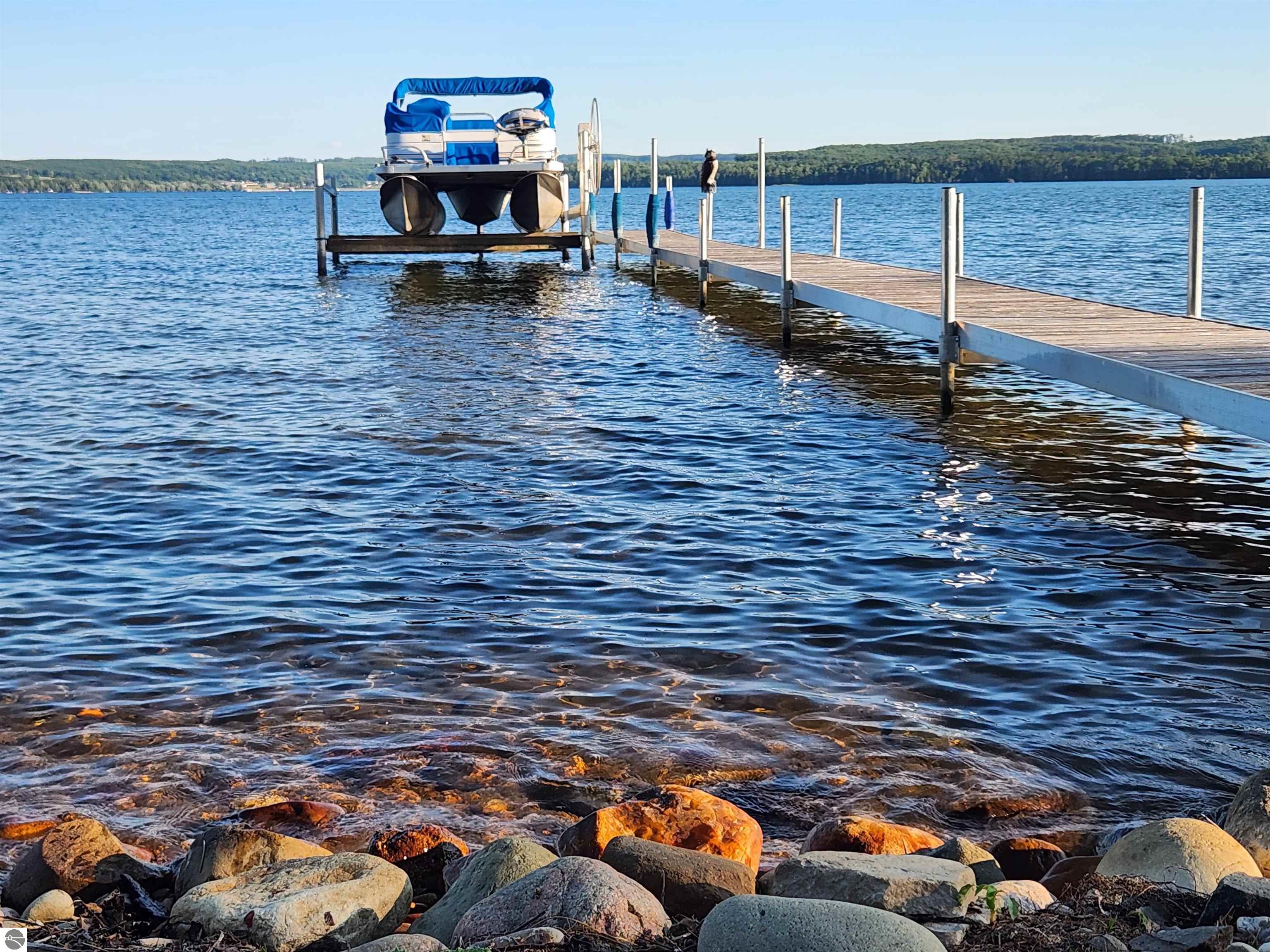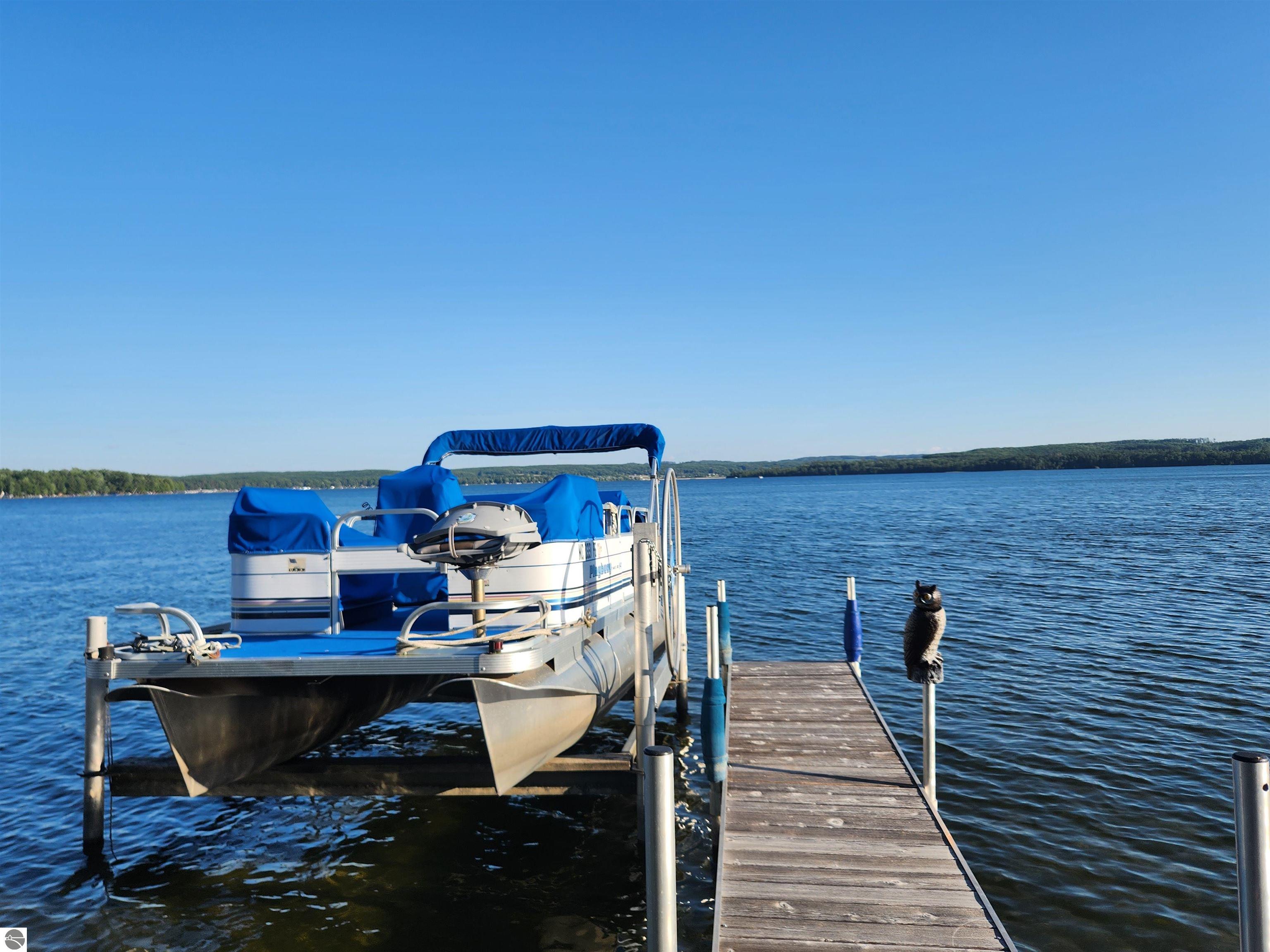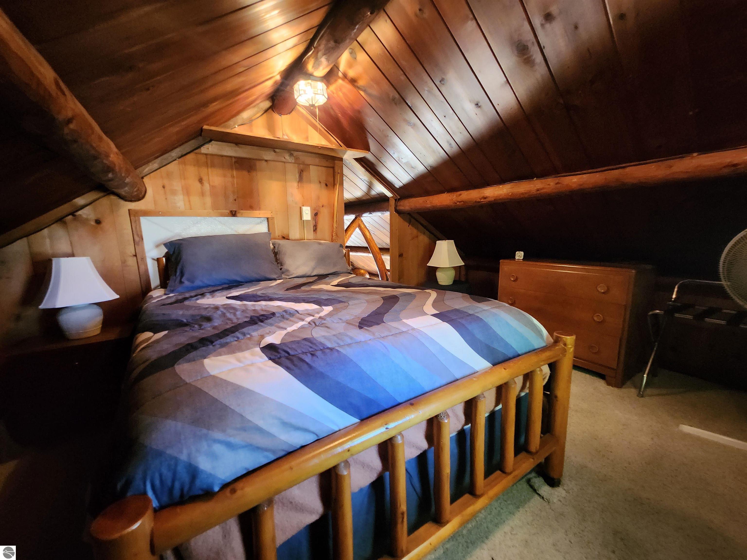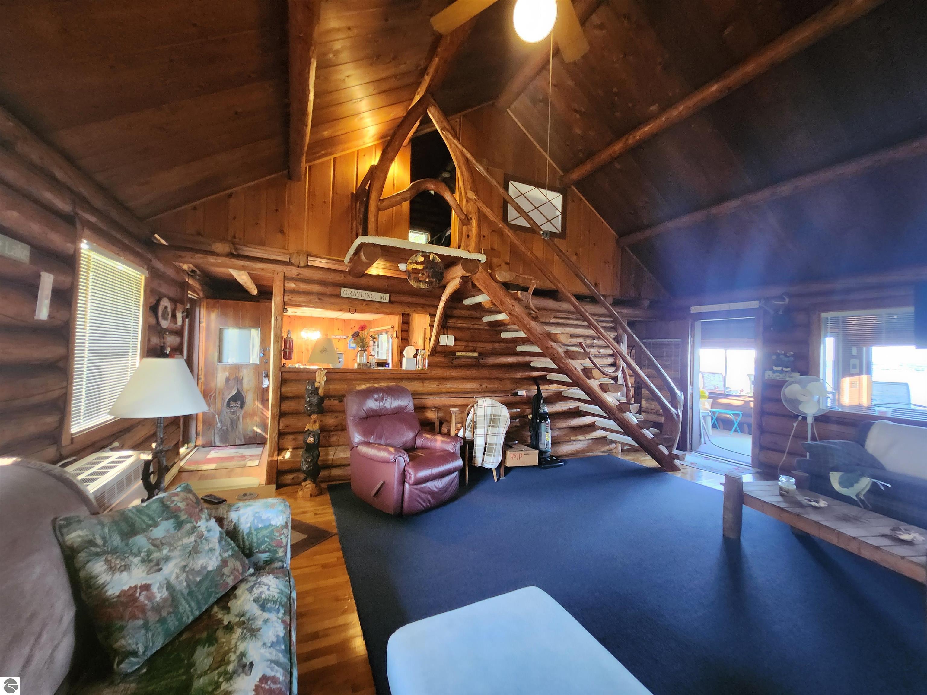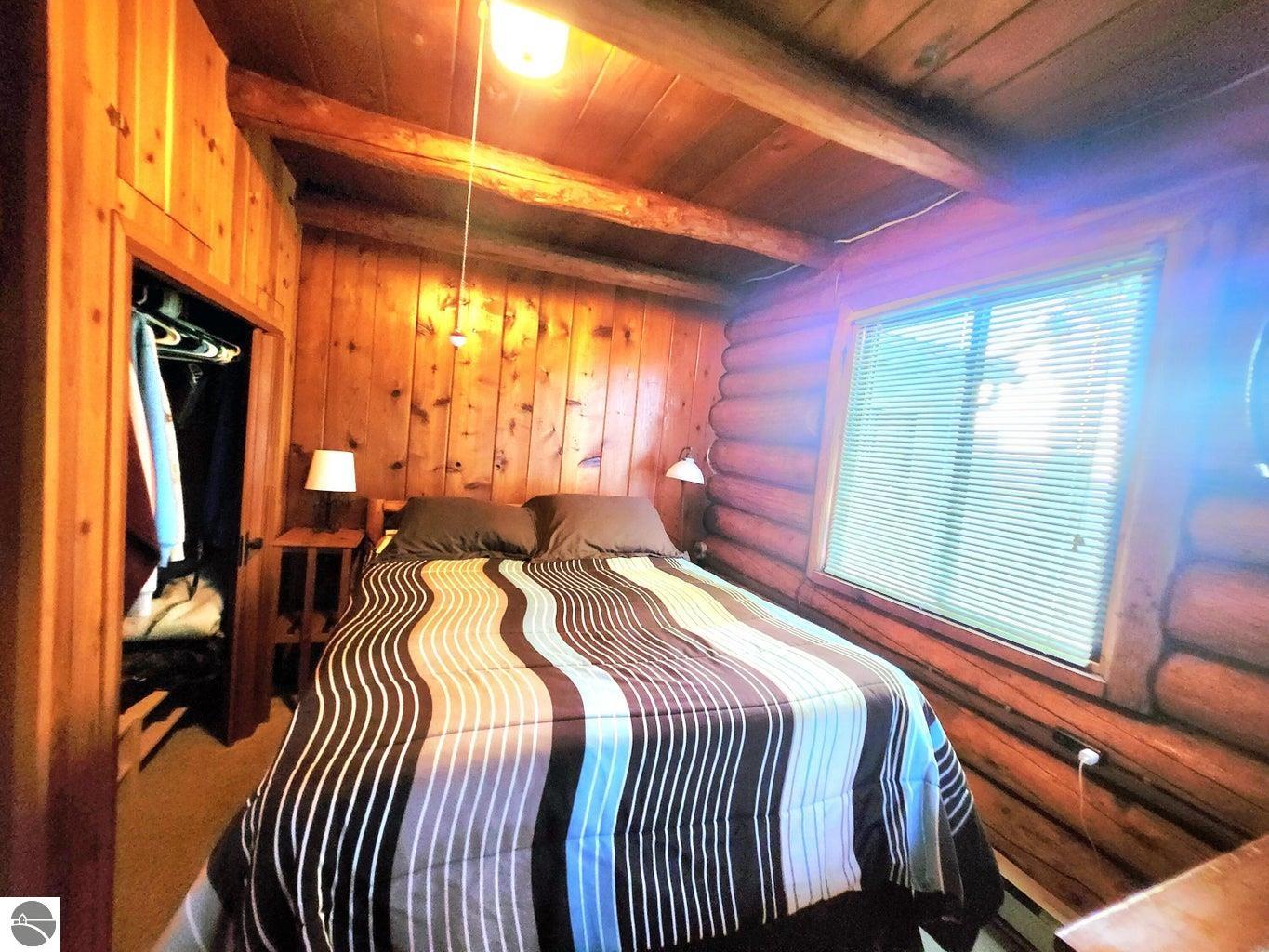 50' ON LAKE MARGRETHE (1900 ACRES) ALL SPORTS LAKE. Beautiful views of Lake Margrethe and sandy bottom shoreline. Great for young children to wade in the water. Charming full log 2 bedroom, 1 bath with vaulted log beamed ceilings. L Log staircase to 2nd loft bedroom. Wood floors and carpet in bedrooms. Beautiful floor to ceiling natural stone natural wood burning fireplace, Updated kitchen and bath. Seperate dining room. All appliances included. Stackable washer and dryer in bath. Porch/Sunroom 8 X 13 with carpet. Includes 7 sections of dock and 1998 Eagle 14'Pontoon Boat. Comes completley furnished with furniture, bedding, kitchenware, towels, etc. John Rittenhouse furniture throughout. Artesian well. Heat is 2 propane space heaters, electric baseboard and airtight insert in the fireplace. Lake side deck has awning the whole length of the deck with electric remote or hand crank. Log cottage can sleep 8 20 X 20 Insulated garage with upstairs that can sleep 5 with 2 bunk beds and a single bed. 12 X 16 Shop in Garage main level. Large shed. 4 Parking spaces by garage. Lot size is 50X 105 plus 2nd lot across the street with garage. Move in Ready Immediate Occupancy. Paved street and close to town. 5 Miles to Grayling (I-75 exit 254) just off M 72 West.