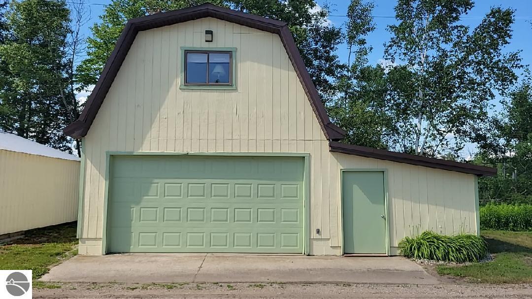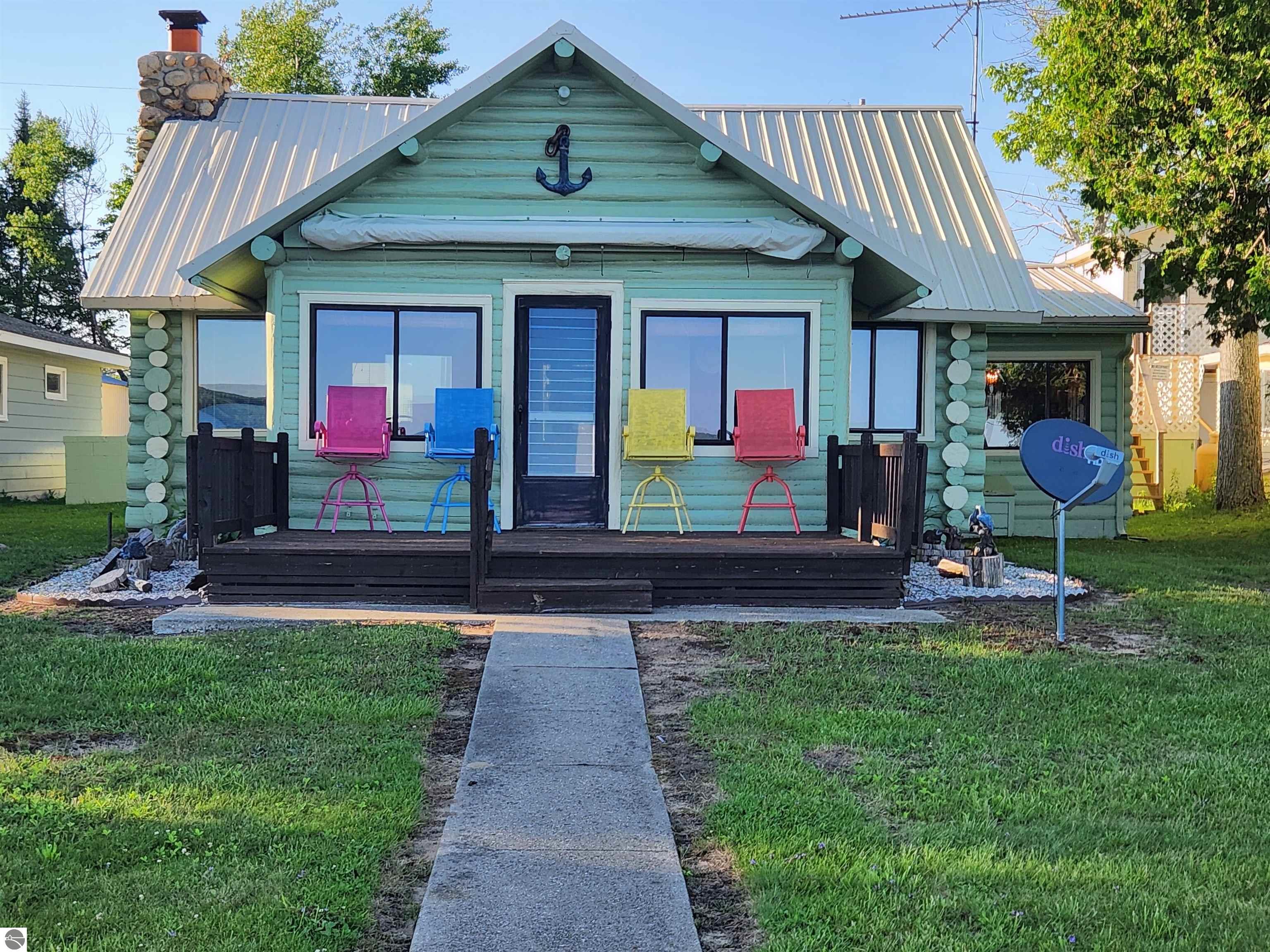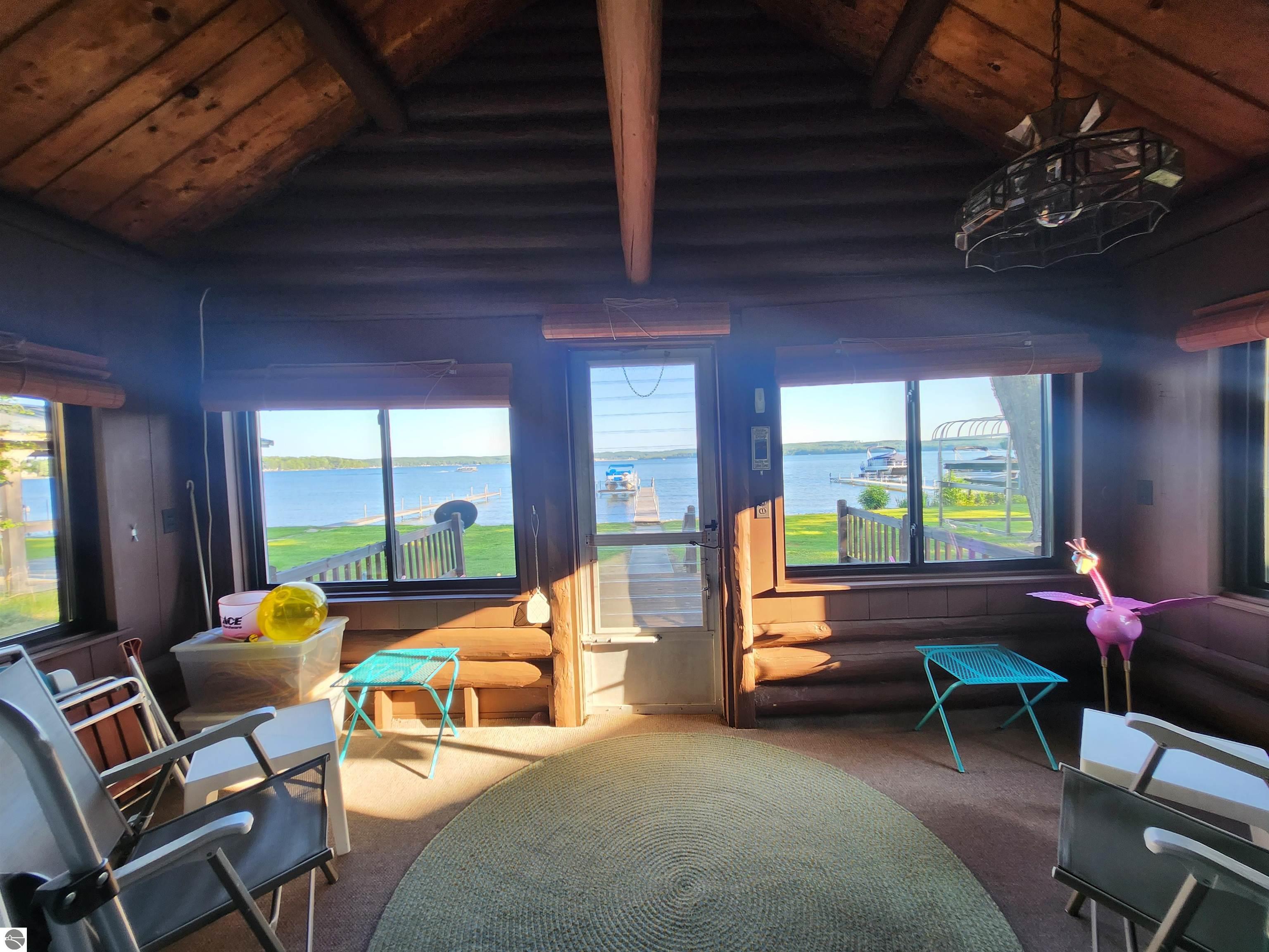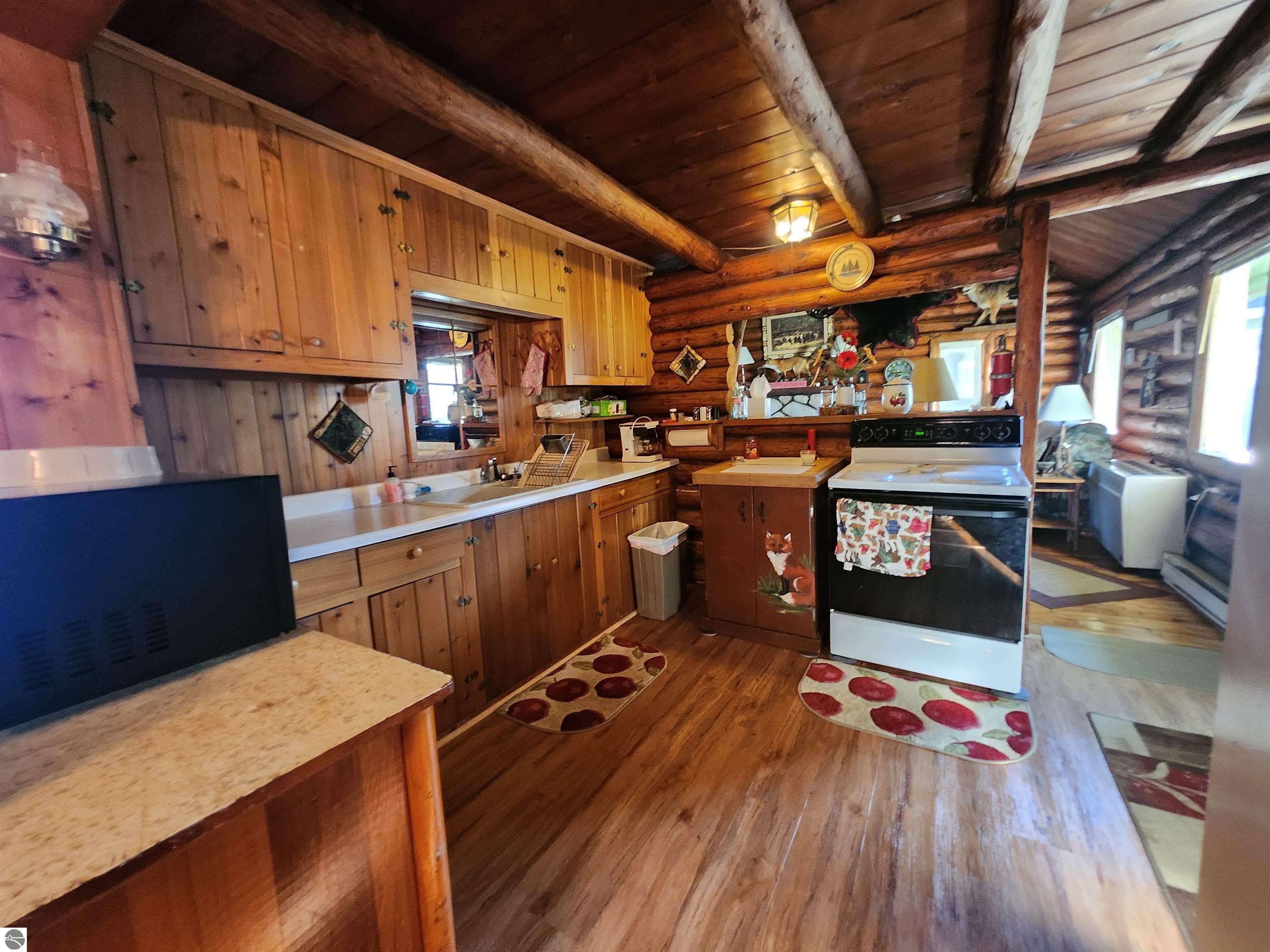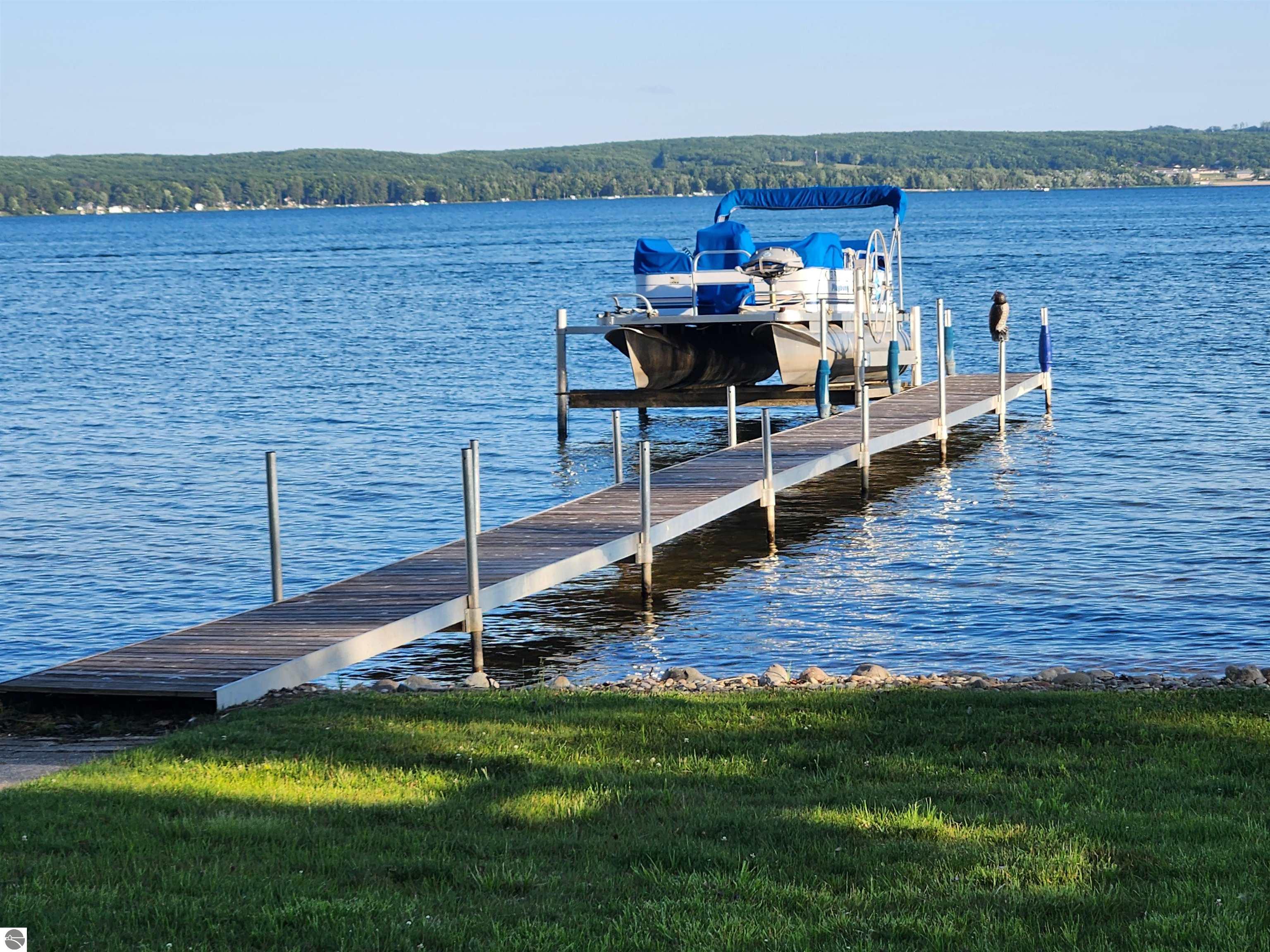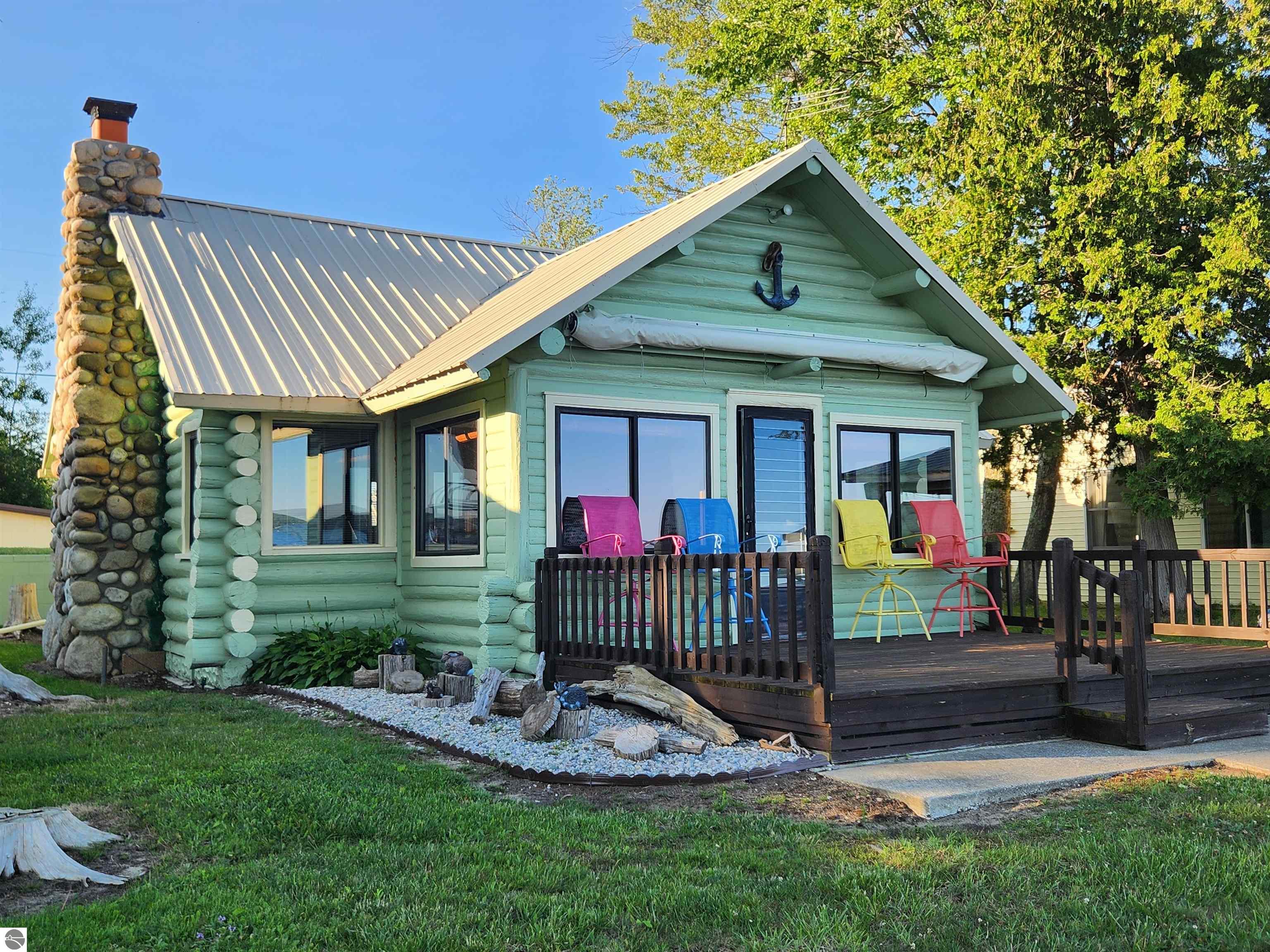 50' ON LAKE MARGRETHE (1900 ACRES) ALL SPORTS LAKE. Beautiful views of Lake Margrethe and sandy bottom shoreline. Great for young children to wade in the water. Charming full log 2 bedroom, 1 bath with vaulted log beamed ceilings. L Log staircase to 2nd loft bedroom. Wood floors and carpet in bedrooms. Beautiful floor to ceiling natural stone natural wood burning fireplace, Updated kitchen and bath. Seperate dining room. All appliances included. Stackable washer and dryer in bath. Porch/Sunroom 8 X 13 with carpet. Includes 7 sections of dock and 1998 Eagle 14'Pontoon Boat. Comes completley furnished with furniture, bedding, kitchenware, towels, etc. John Rittenhouse furniture throughout. Artesian well. Heat is 2 propane space heaters, electric baseboard and airtight insert in the fireplace. Lake side deck has awning the whole length of the deck with electric remote or hand crank. Log cottage can sleep 8 20 X 20 Insulated garage with upstairs that can sleep 5 with 2 bunk beds and a single bed. 12 X 16 Shop in Garage main level. Large shed. 4 Parking spaces by garage. Lot size is 50X 105 plus 2nd lot across the street with garage. Move in Ready Immediate Occupancy. Paved street and close to town. 5 Miles to Grayling (I-75 exit 254) just off M 72 West.