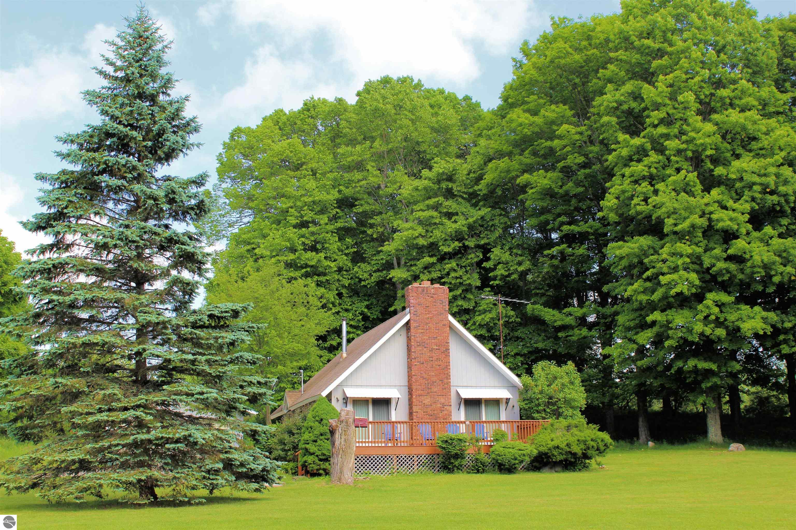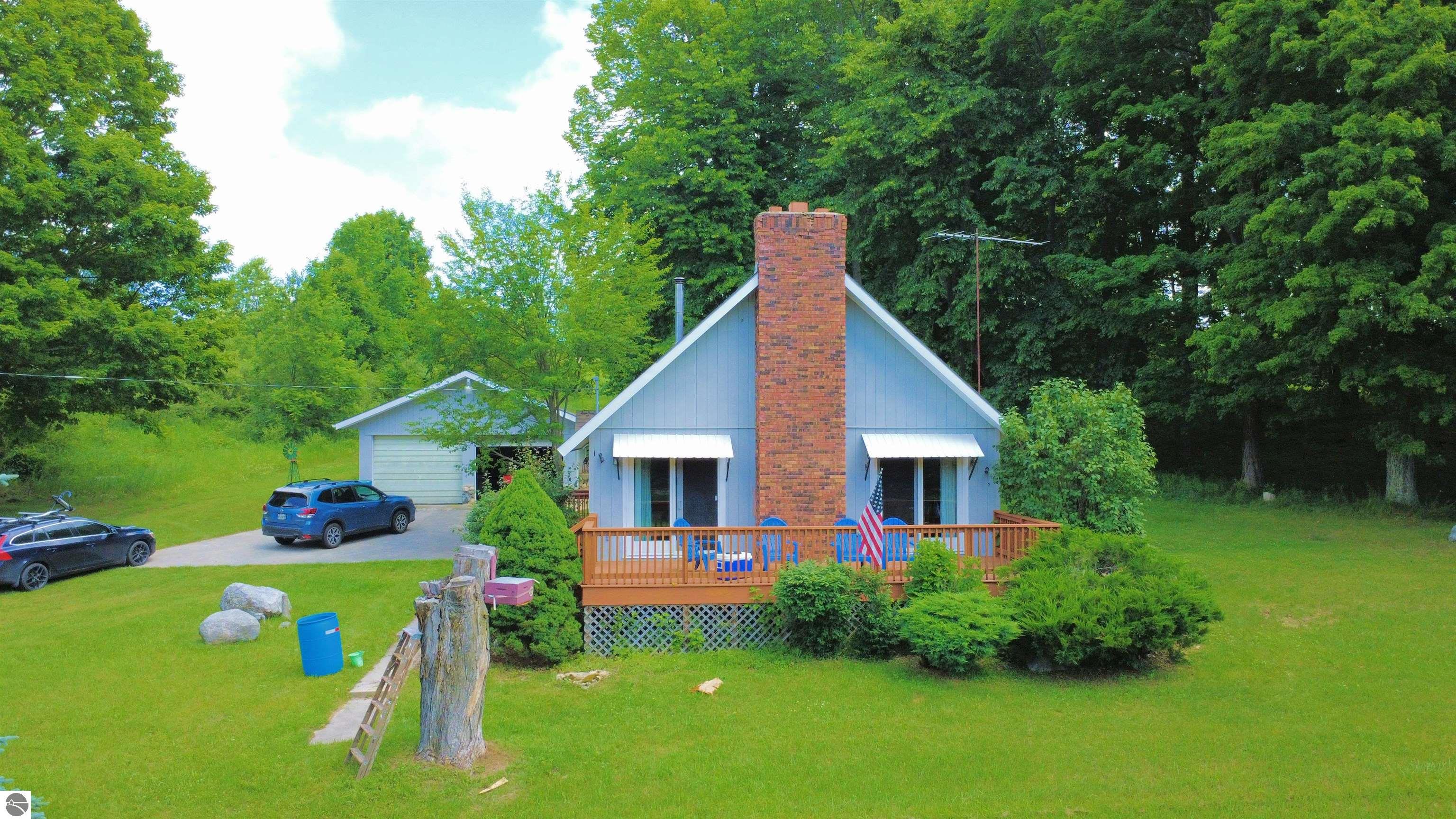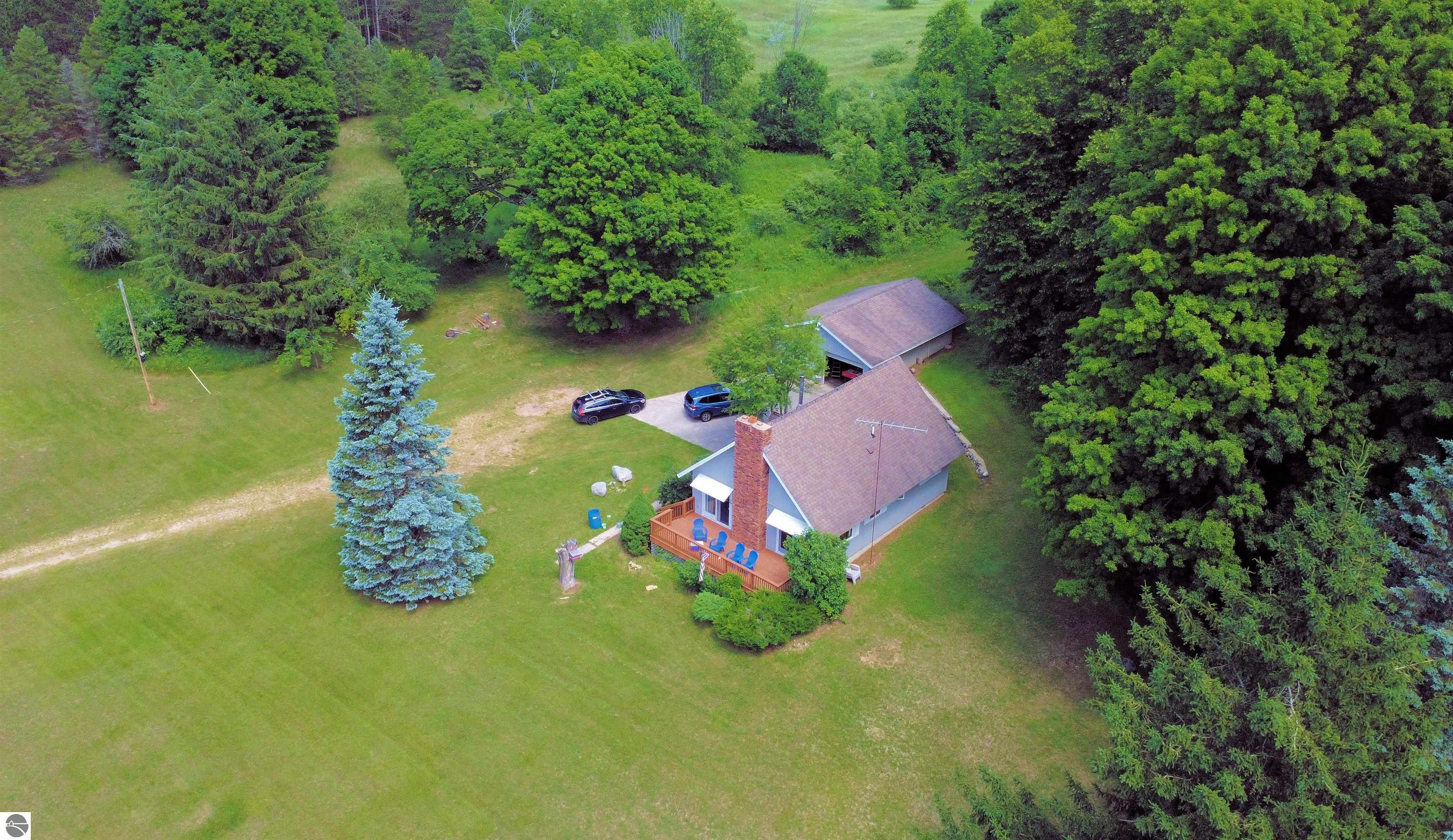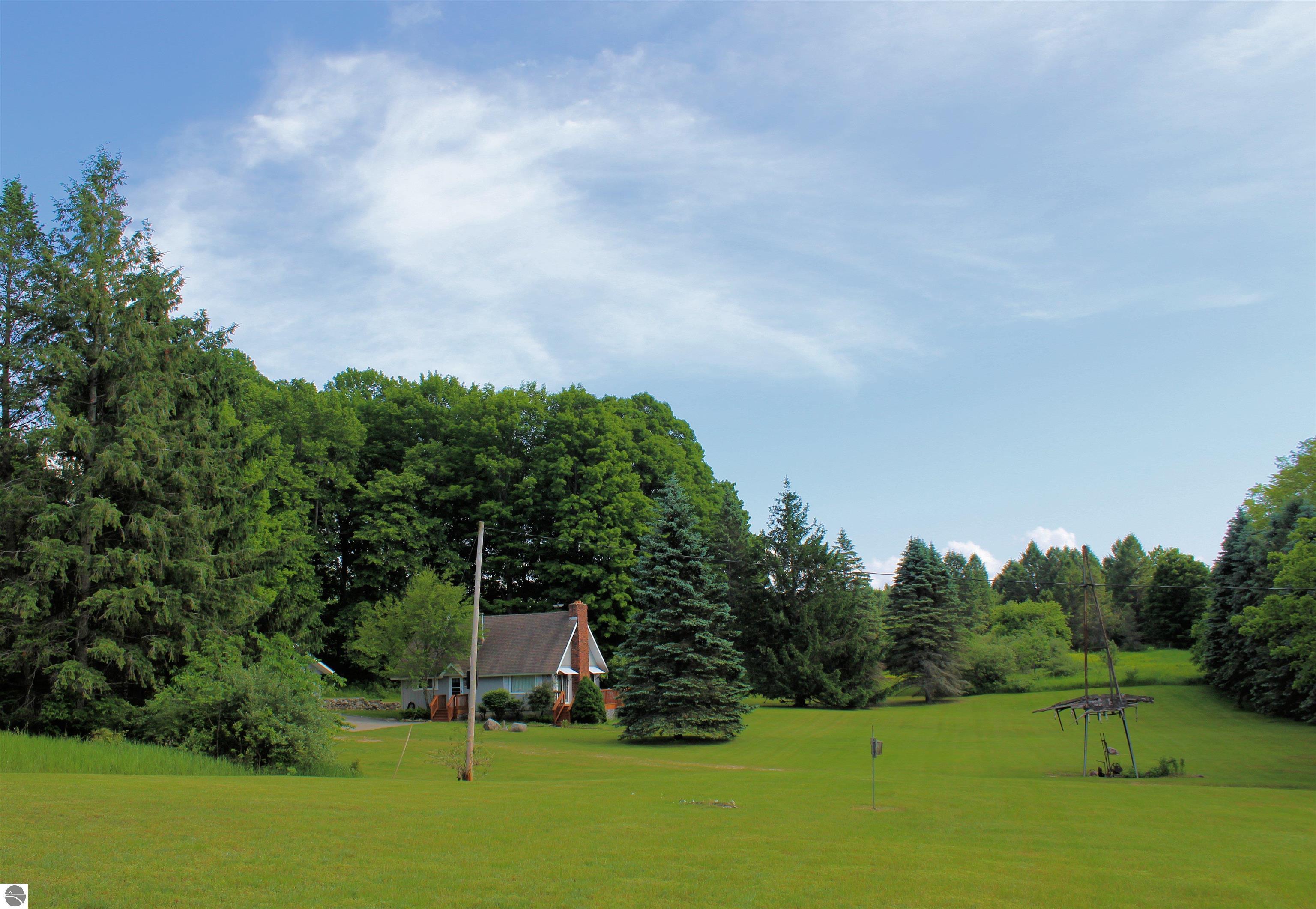 Nestled on 40 acres of pristine high ground and partially wooded land, this beautiful 3-bedroom chalet offers the perfect blend of rustic charm and modern comforts. Just minutes from tranquil streams and the pristine waters of Crystal and Platte Lakes, this expansive property provides an unparalleled opportunity for nature lovers, outdoor enthusiasts, and those seeking a peaceful retreat. High, vaulted ceilings create an inviting, spacious atmosphere. A brick fireplace adds to the warmth of the living area, making it the perfect spot to unwind after a day of outdoor adventures. Whether you enjoy fishing, kayaking, or simply relaxing by the water, both Crystal and Platte Lakes are just a short drive away, offering endless recreational opportunities. Perfect for full-time living, seasonal use, or as a vacation getaway. If you’re looking for privacy, peace, and proximity to some of Michigan’s most beautiful lakes and outdoor recreation areas, this chalet is a must-see.