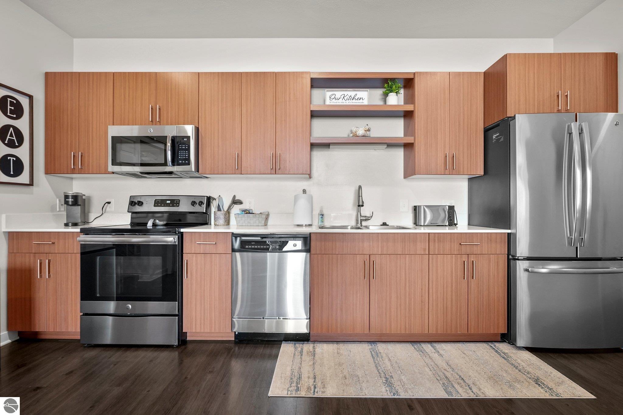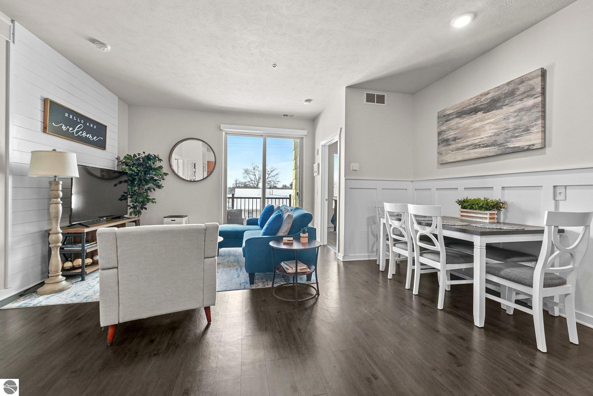 This 2 bed, 2 bath condo is located at the eastern edge of Traverse City's Downtown, Trailside 45 is a well known residential condominium community. It's adjacent to the TART trail, which allows pedestrian and bicycle access throughout Traverse City and beyond. This unit has been thoughtfully designed and has been a utilized as a cash-flowing short term rental. The building has a number of design features reminiscent of high-end condominiums in larger cities. A spacious and well appointed community room is available to owners, oversized bike locker rooms are located immediately off the elevators on each floor, and the units themselves offer outstanding layouts with modern finishes. This unit has been beautifully remodeled with quartz countertop in the kitchen and baths, and a brand new heat pump to last for many years to come. Additional amenities include high energy efficiency, on-site 24 hour maintenance, no steps, wide hallways, and elevator access, a private covered balcony, washer/dryer, window coverings, and built-in closet organization. One assigned parking pass is included. Association dues are only $350/month and includes a lot! This fee includes city water/sewer, trash, cable tv, and cable internet! The building is a short five minute pedal from Front Street, multiple beaches, marinas and Bay front parks, the Civic Center, The Filling Station Microbrewery, Elev8 Climbing Gym, three bike shops, Silver Spruce Brewing Company, and so many more of downtown TC’s award-winning offerings!