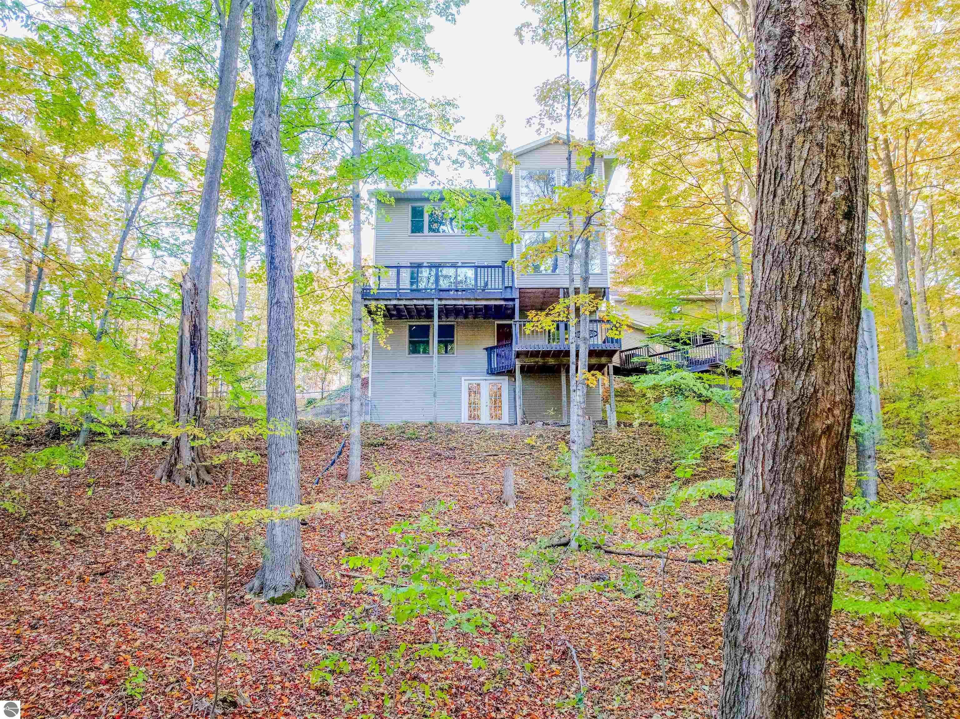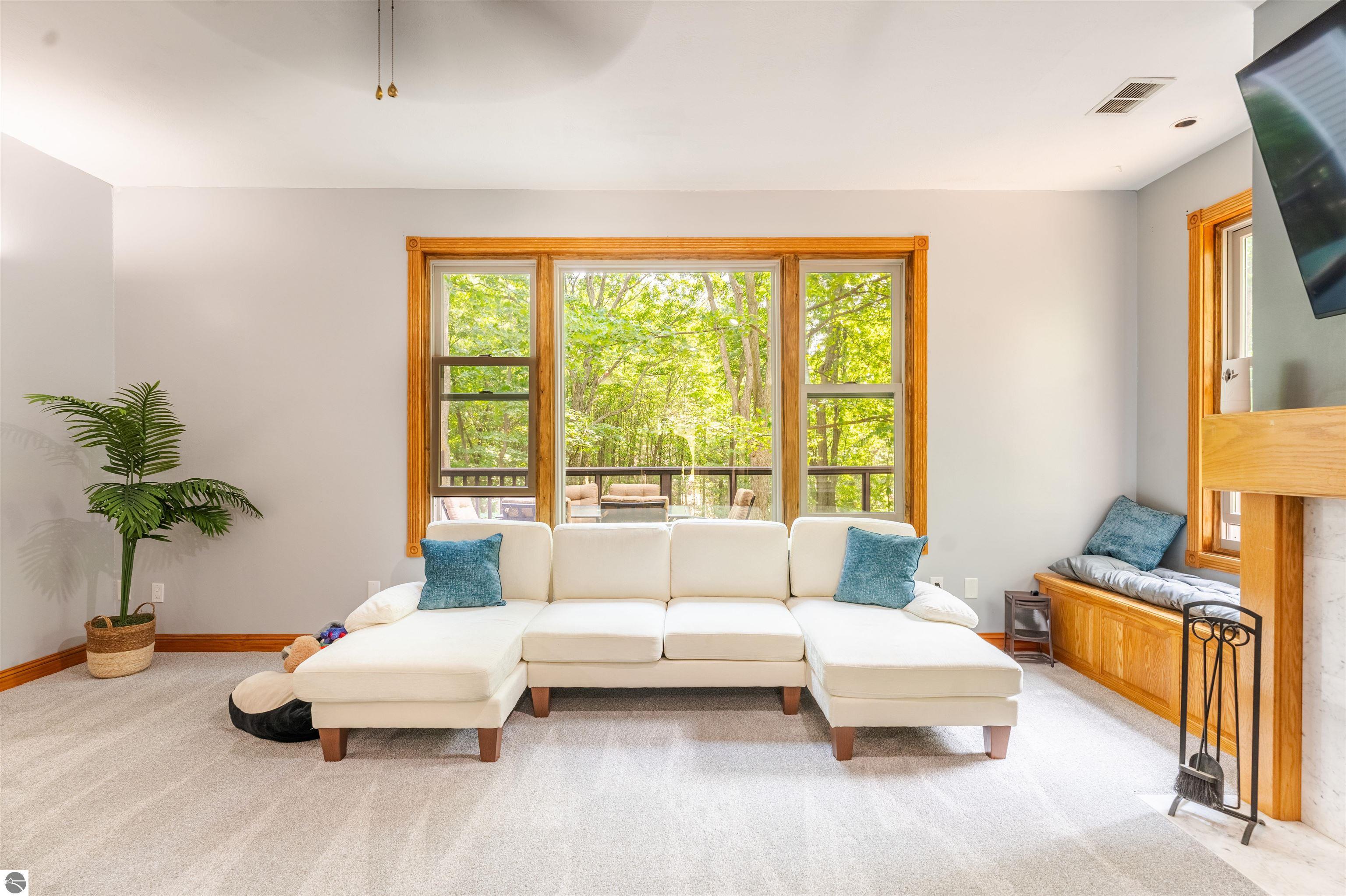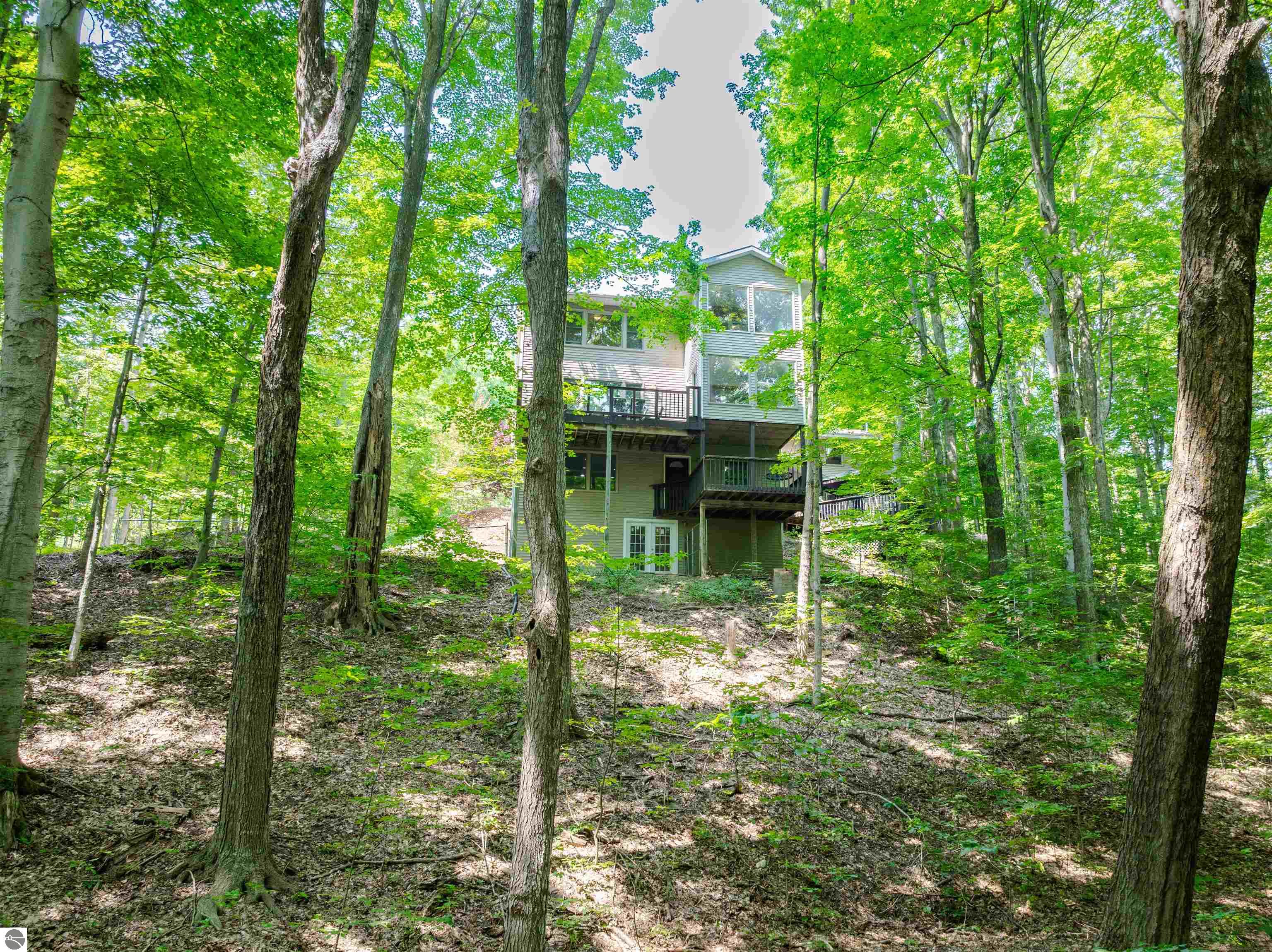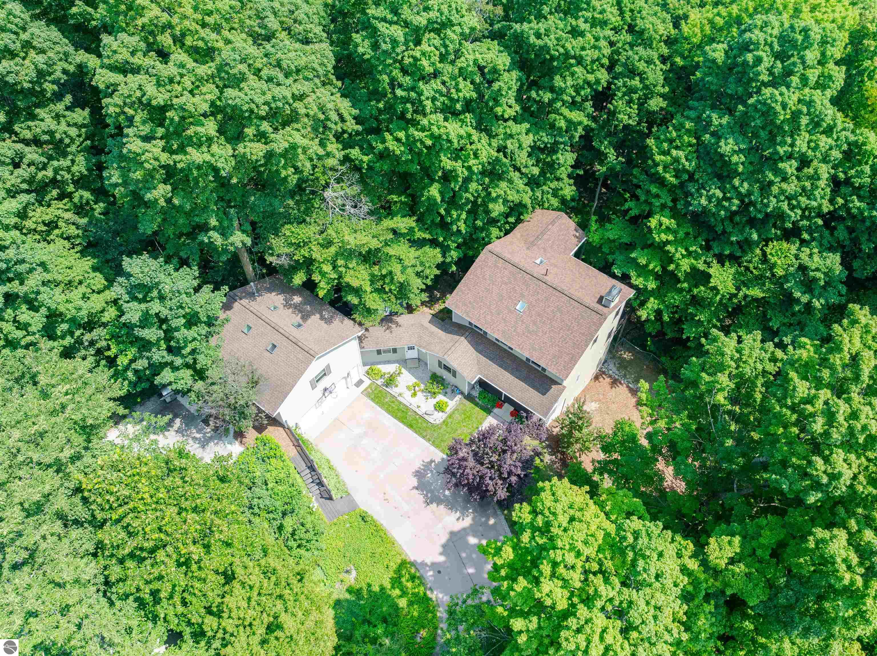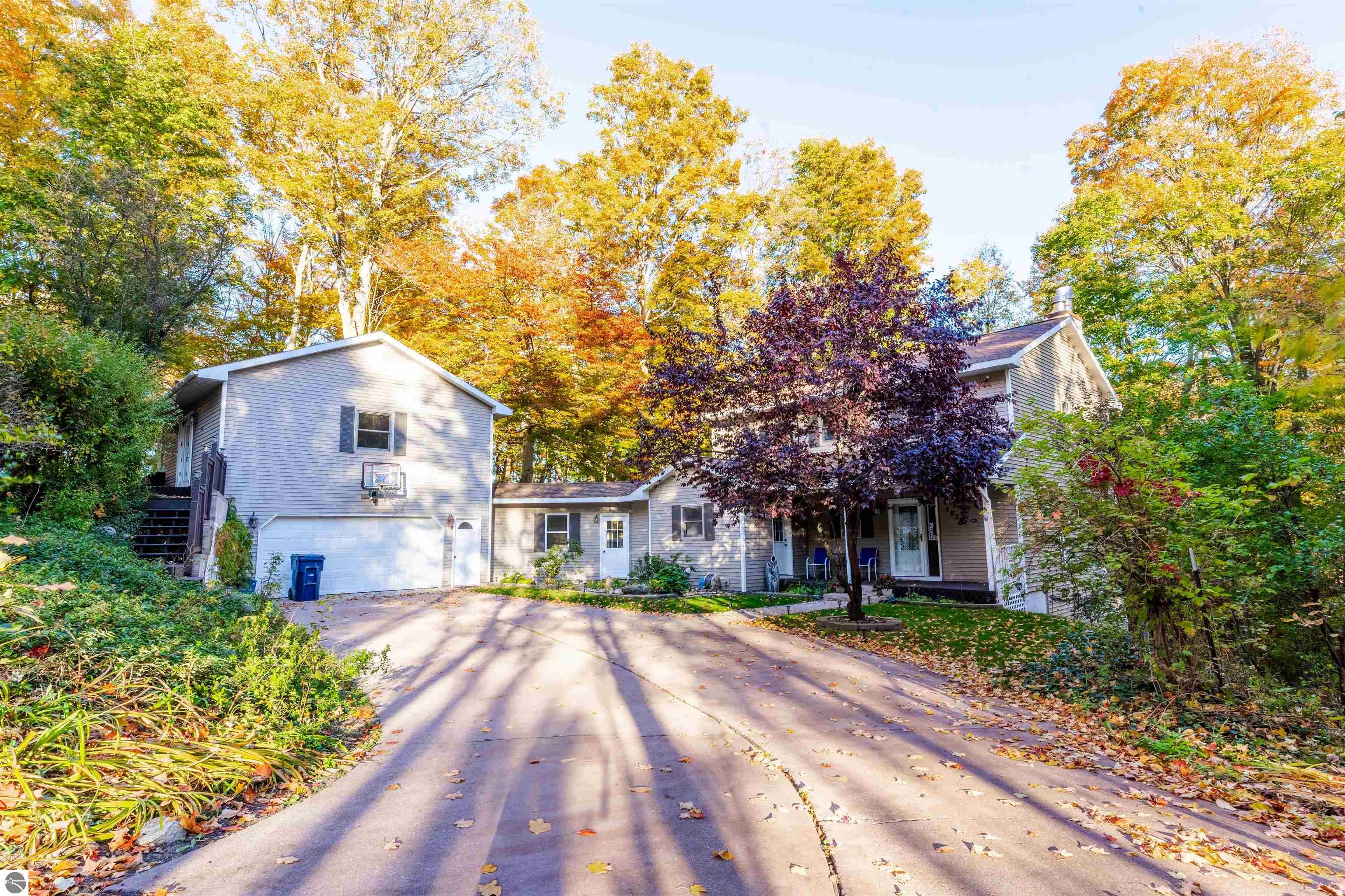 This inviting two-story home blends classic comfort with modern updates, set against a backdrop of mature trees that provide privacy and natural beauty. The exterior features neutral-toned siding with crisp white trim and a welcoming covered front porch, perfect for relaxing or greeting guests. Inside, you’ll find four spacious bedrooms and three and a half bathrooms. New carpet throughout creates a fresh and comfortable feel in every room. Large windows fill the interior with natural light, while the surrounding greenery offers a serene and secluded feel. This property combines practicality, charm, and a prime location. The primary bedroom includes its own attached sitting room or private office, offering a peaceful retreat for work or relaxation. A wide concrete driveway leads to a spacious attached two-car garage with a bonus living space above, which has most recently been used as a guest suite and has its own parking and entrance, kitchen, bathroom, and living space. Situated on two private acres, this home offers both space and convenience. It’s located just minutes from Traverse City, Munson Medical Center, and local schools, making it the perfect balance of peaceful living and easy access to everything you need. New roof on most the home in 2025. In-Law suite 625 SF not included in SF or 4 bed/3.5 bed description in listing data.
