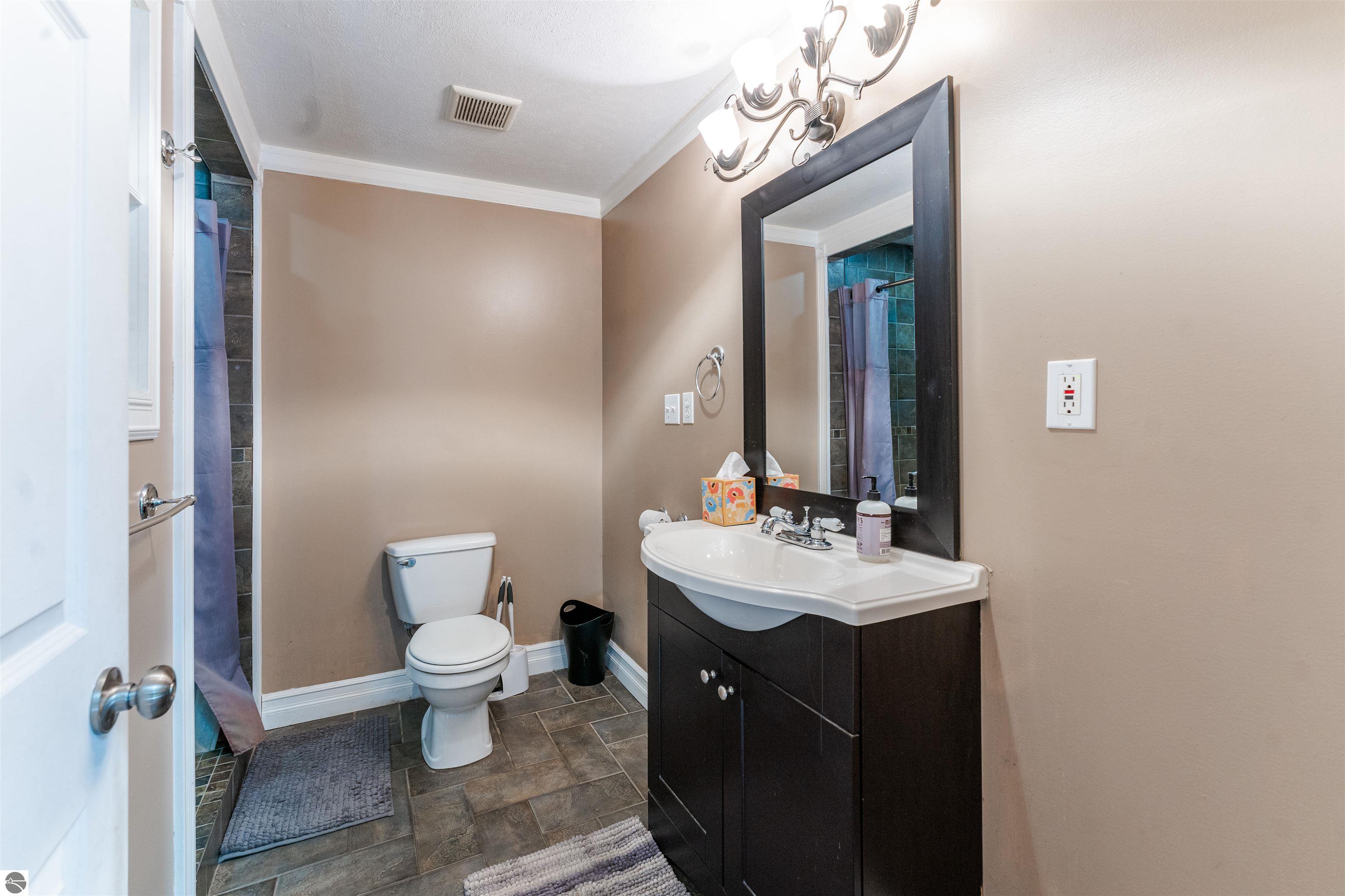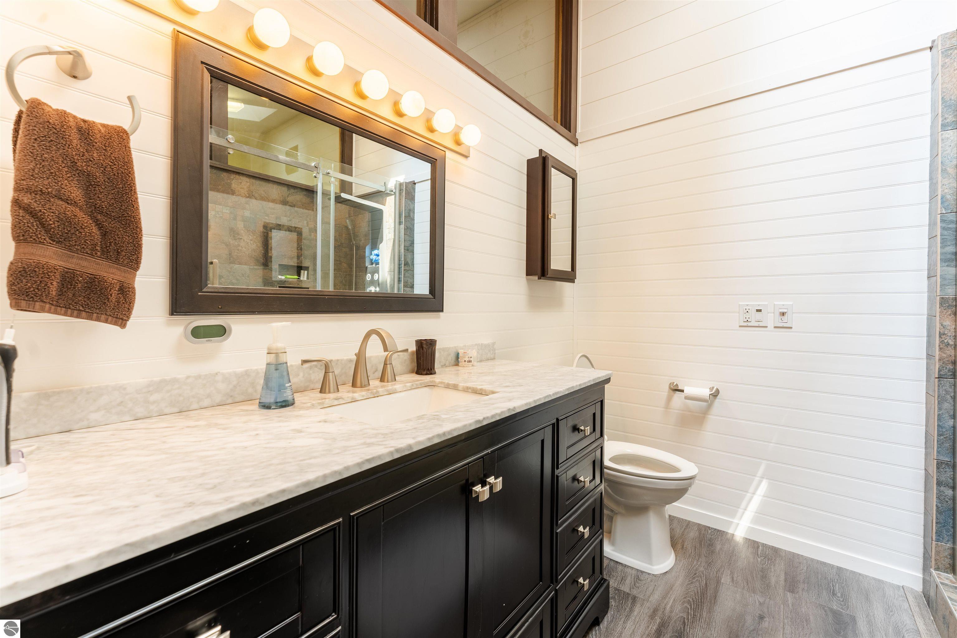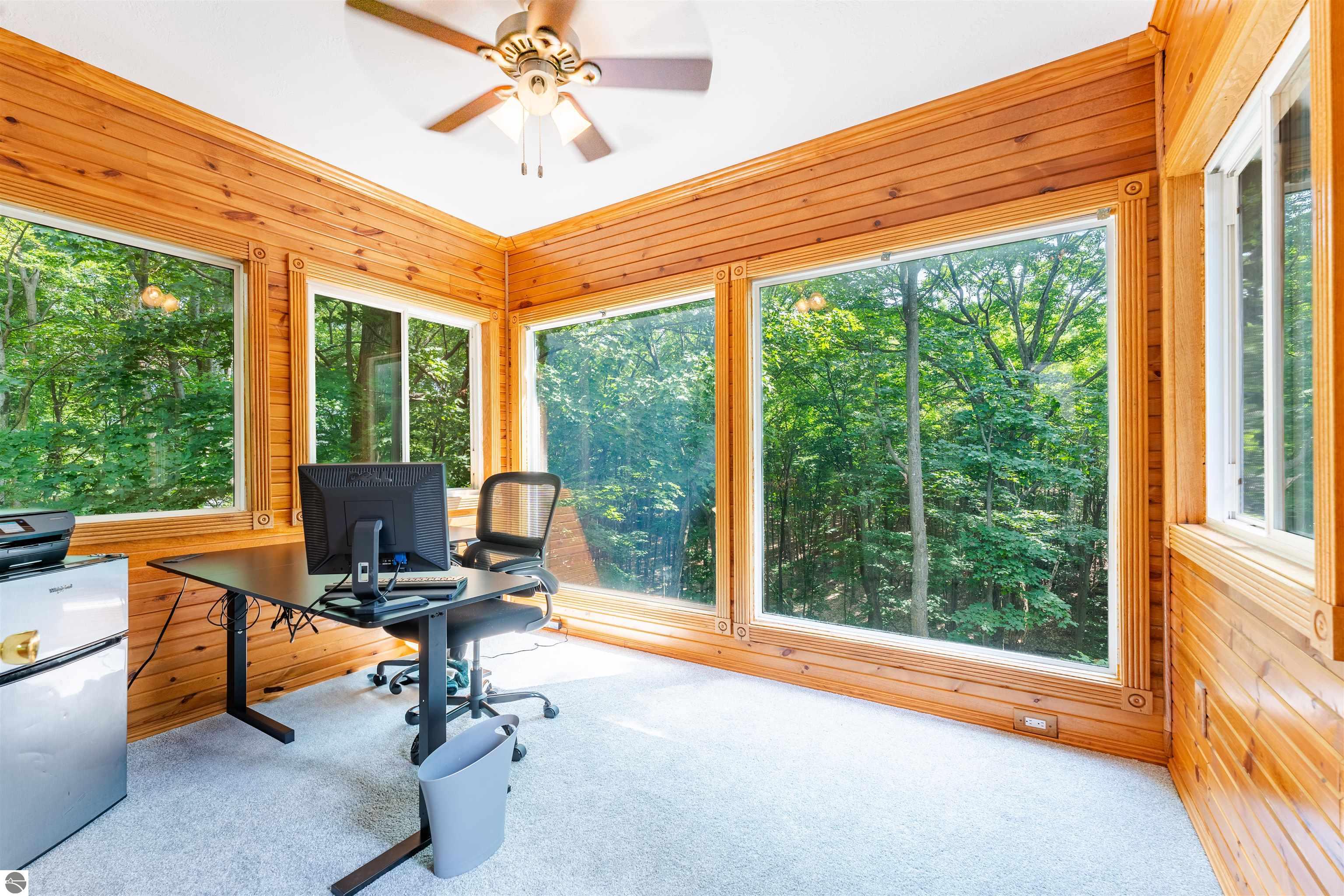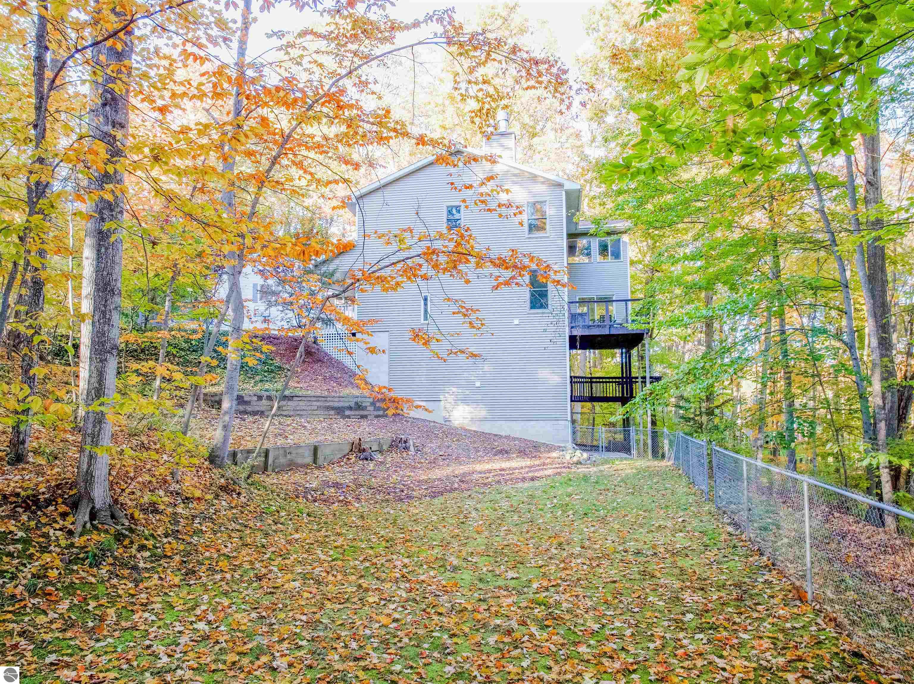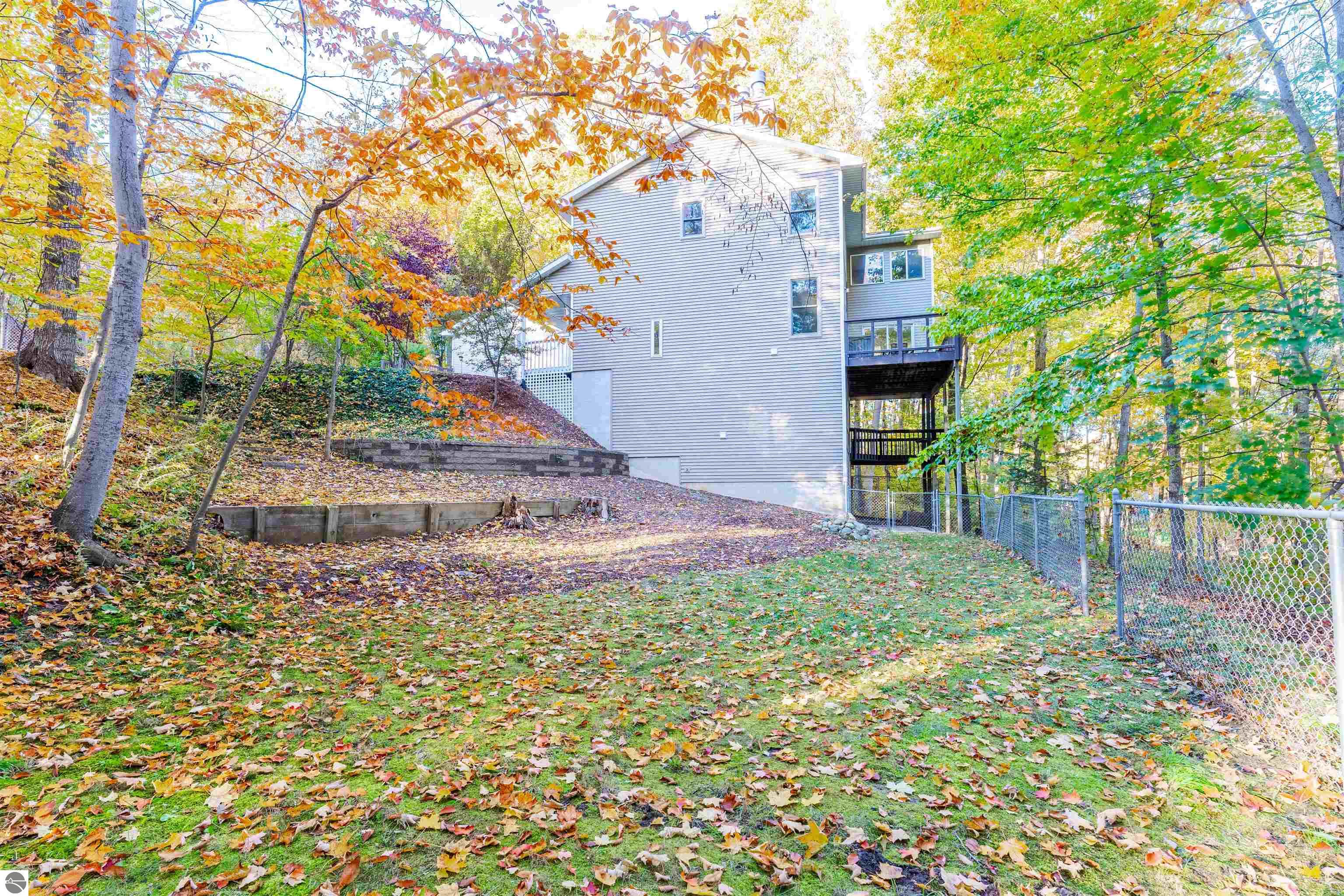 This inviting two-story home blends classic comfort with modern updates, set against a backdrop of mature trees that provide privacy and natural beauty. The exterior features neutral-toned siding with crisp white trim and a welcoming covered front porch, perfect for relaxing or greeting guests. Inside, you’ll find four spacious bedrooms and three and a half bathrooms. New carpet throughout creates a fresh and comfortable feel in every room. Large windows fill the interior with natural light, while the surrounding greenery offers a serene and secluded feel. This property combines practicality, charm, and a prime location. The primary bedroom includes its own attached sitting room or private office, offering a peaceful retreat for work or relaxation. A wide concrete driveway leads to a spacious attached two-car garage with a bonus living space above, which has most recently been used as a guest suite and has its own parking and entrance, kitchen, bathroom, and living space. Situated on two private acres, this home offers both space and convenience. It’s located just minutes from Traverse City, Munson Medical Center, and local schools, making it the perfect balance of peaceful living and easy access to everything you need. New roof on most the home in 2025. In-Law suite 625 SF not included in SF or 4 bed/3.5 bed description in listing data.