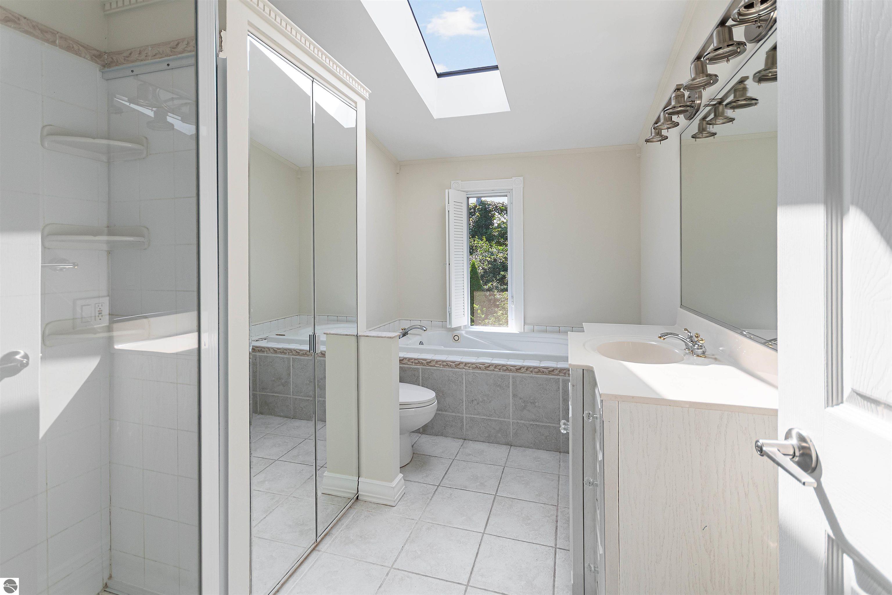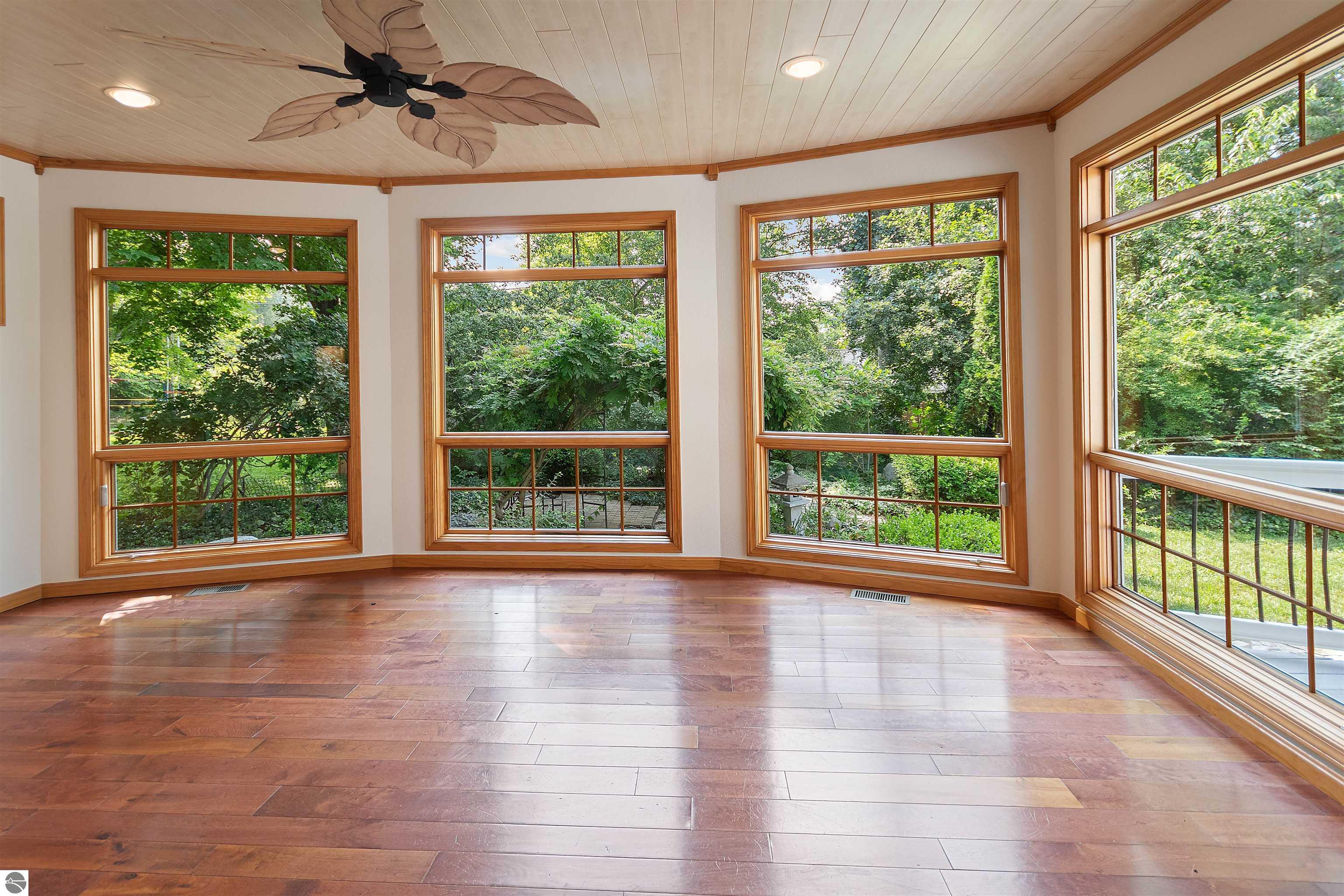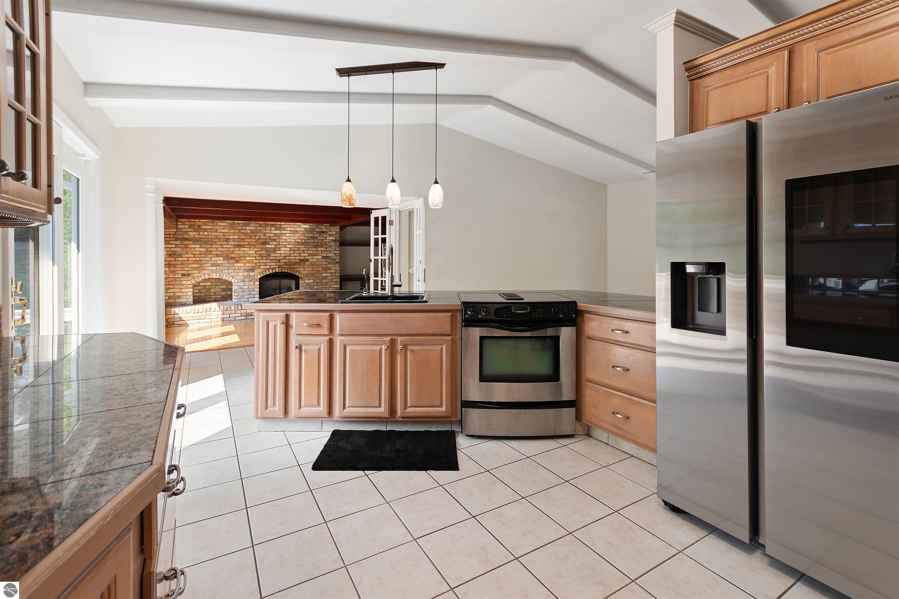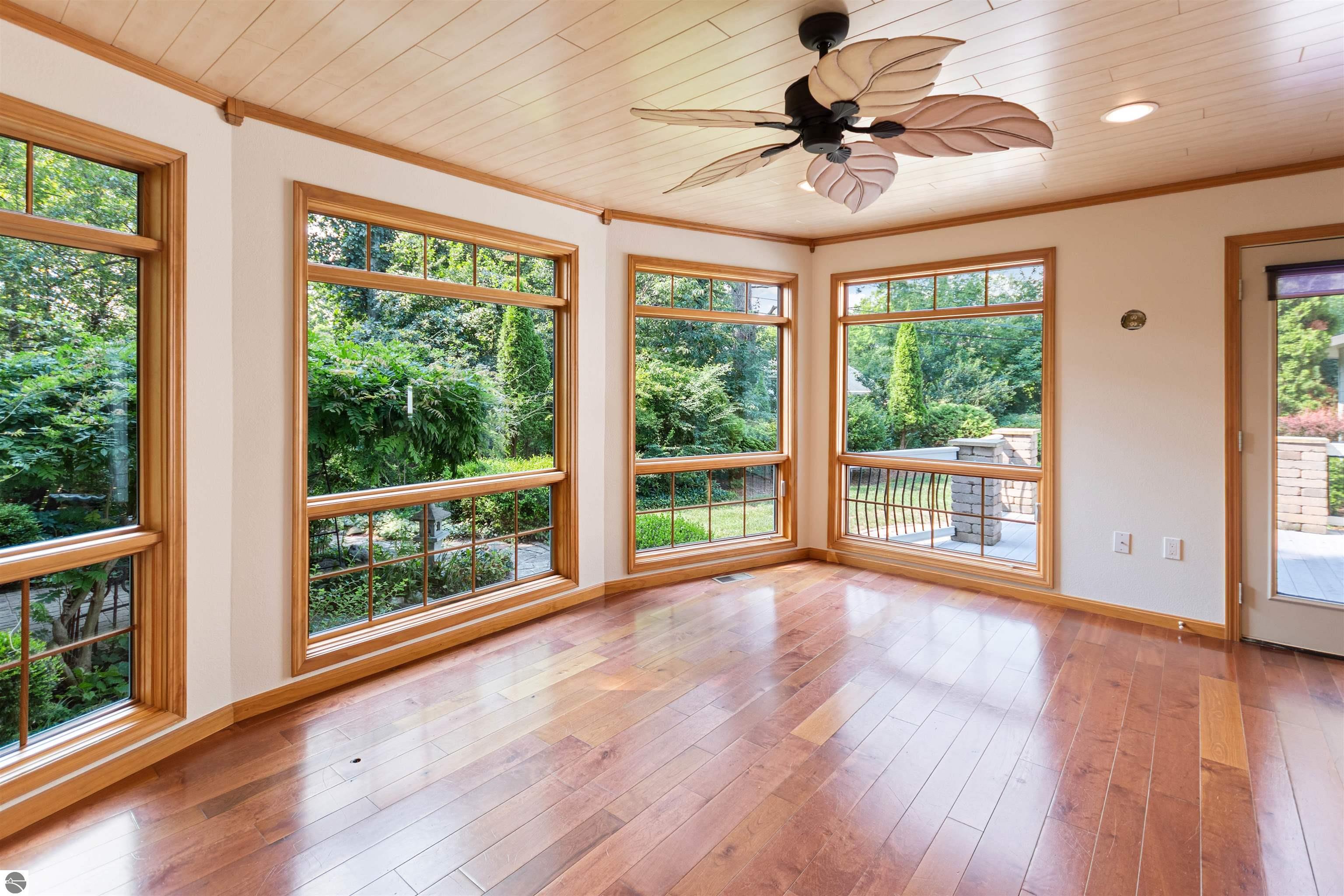 Base of Old Mission Peninsula. Beautifully remodeled 1 1/2 story ranch situated on a secluded, peaceful cul-de-sac. Features an expansive kitchen with storage pantry, flowing into a grand post and beam sunken living area boasting a gas fireplace with striking brick mantle and integrated cherry-wood media center. Elegant dining space and inviting sun room, showcasing floor-to-ceiling Pella windows overlooking a meticulously landscaped backyard zen garden with stone-columned deck and patio. Upper floor features a generous master retreat including a jet tub, separate shower enclosure, and overhead skylight. Lower level features a finished recreation room with gas fireplace, custom floor-to-ceiling bookcase, and office or wine storage space. Well-appointed garage with insulation, drywall, dedicated storage room, attic space, and epoxy flooring. Exterior features attractive white Canadian cedar shake siding and beautiful perennial gardens. This charming residence offers exceptional appeal with interesting architectural elements throughout. Convenient access to West Bay, Bryant Park, Civic Center, neighborhood Clancy Park, and downtown Traverse City and situated at the start of the OMP Wine Trail. Click on virtual tour for an incredibly realistic view of the interior.
