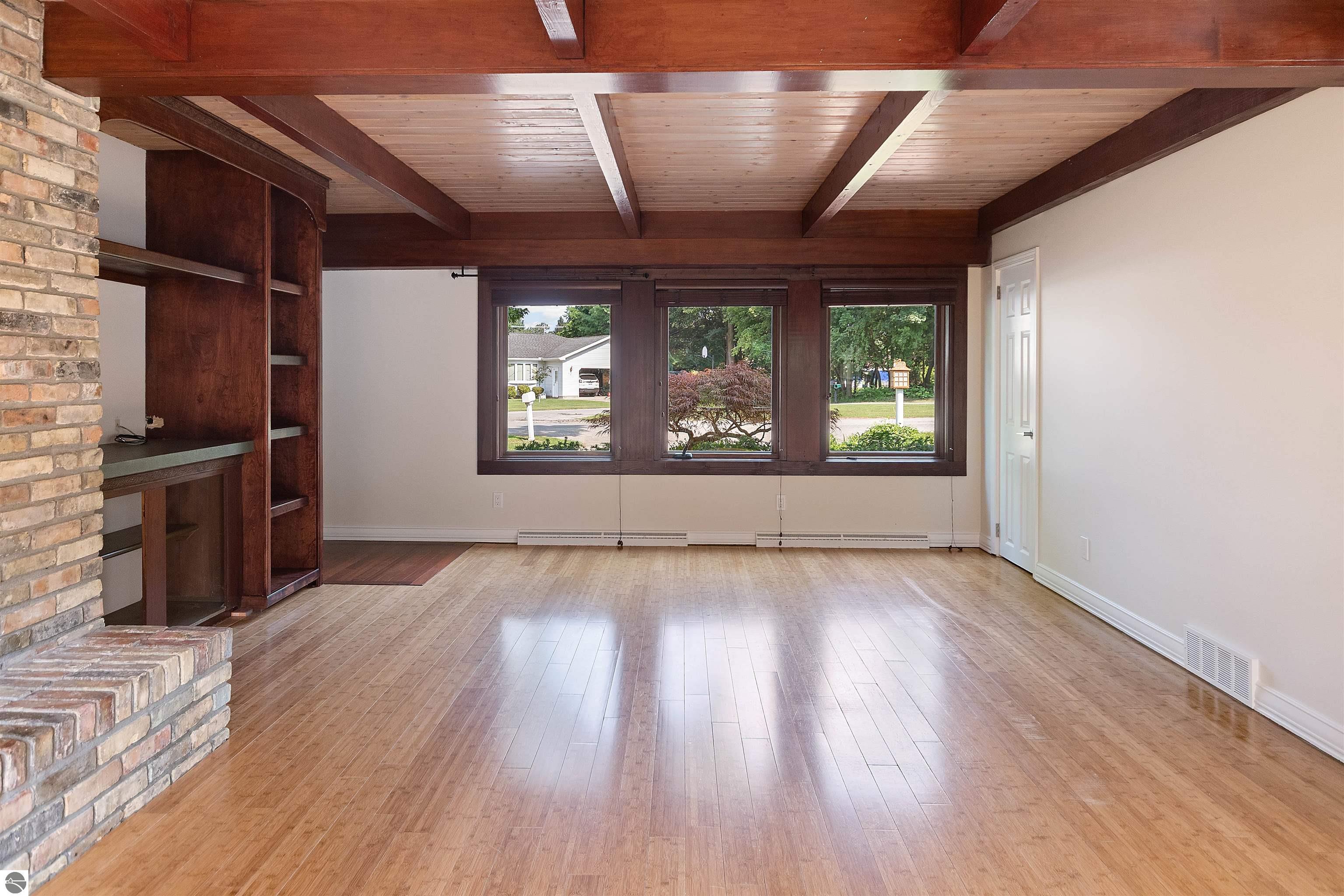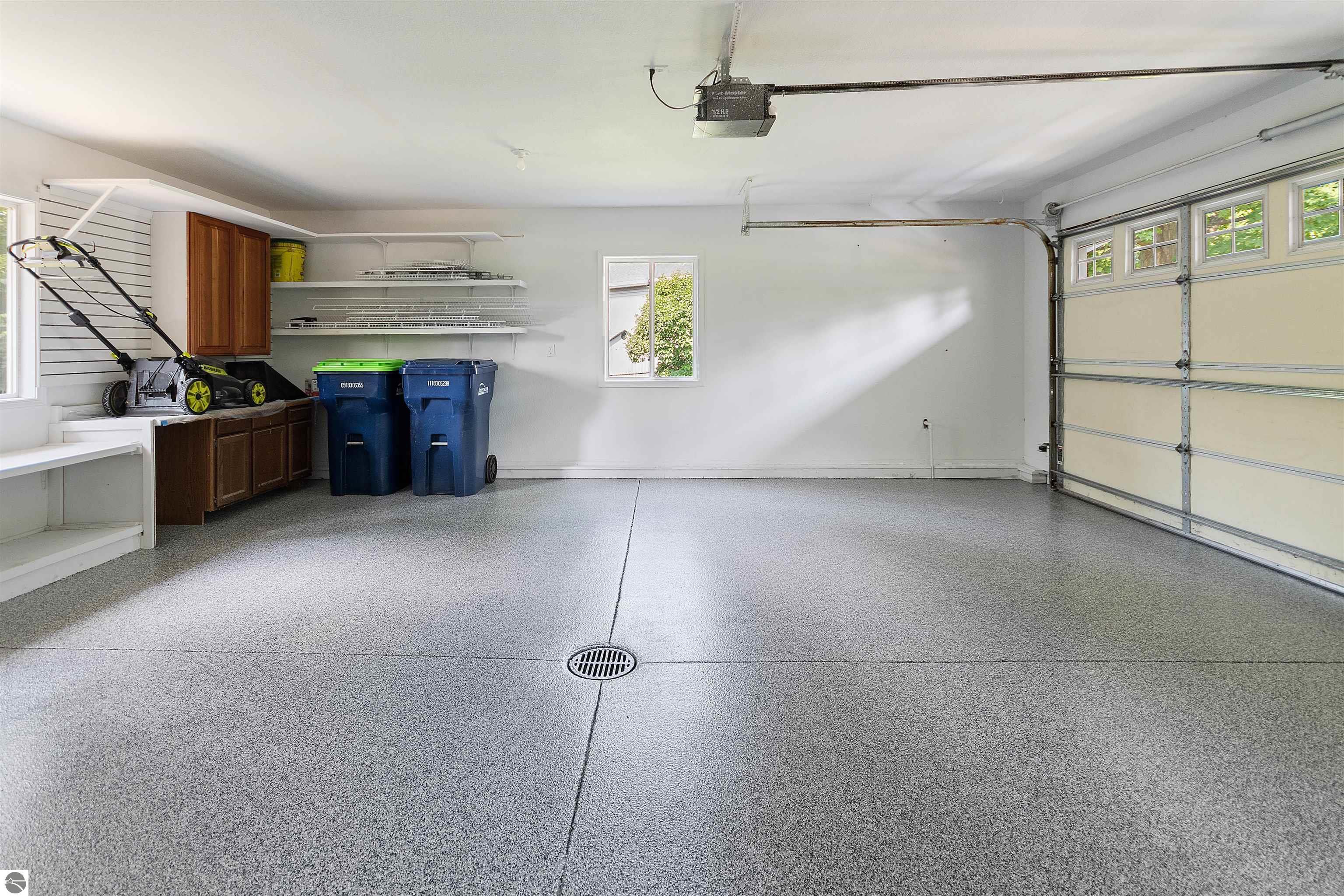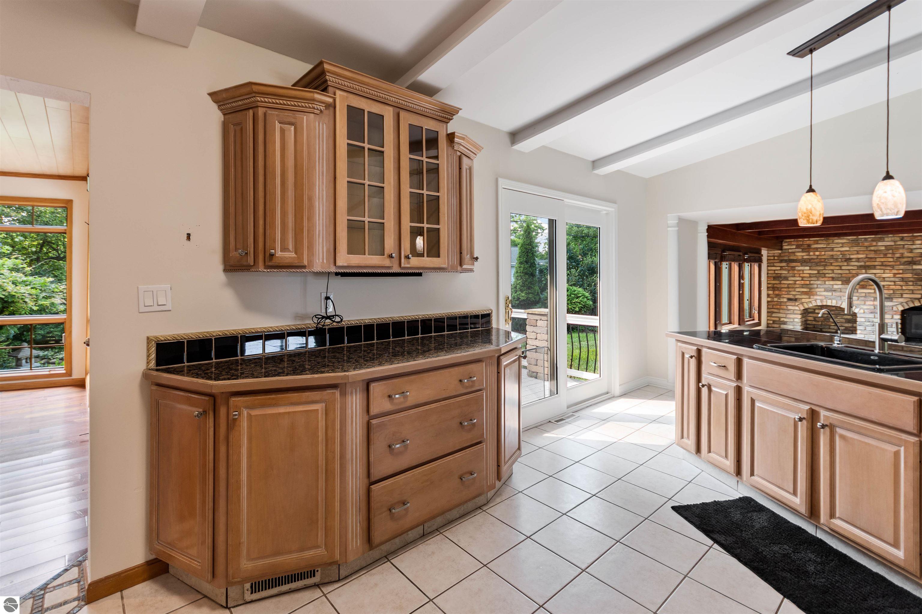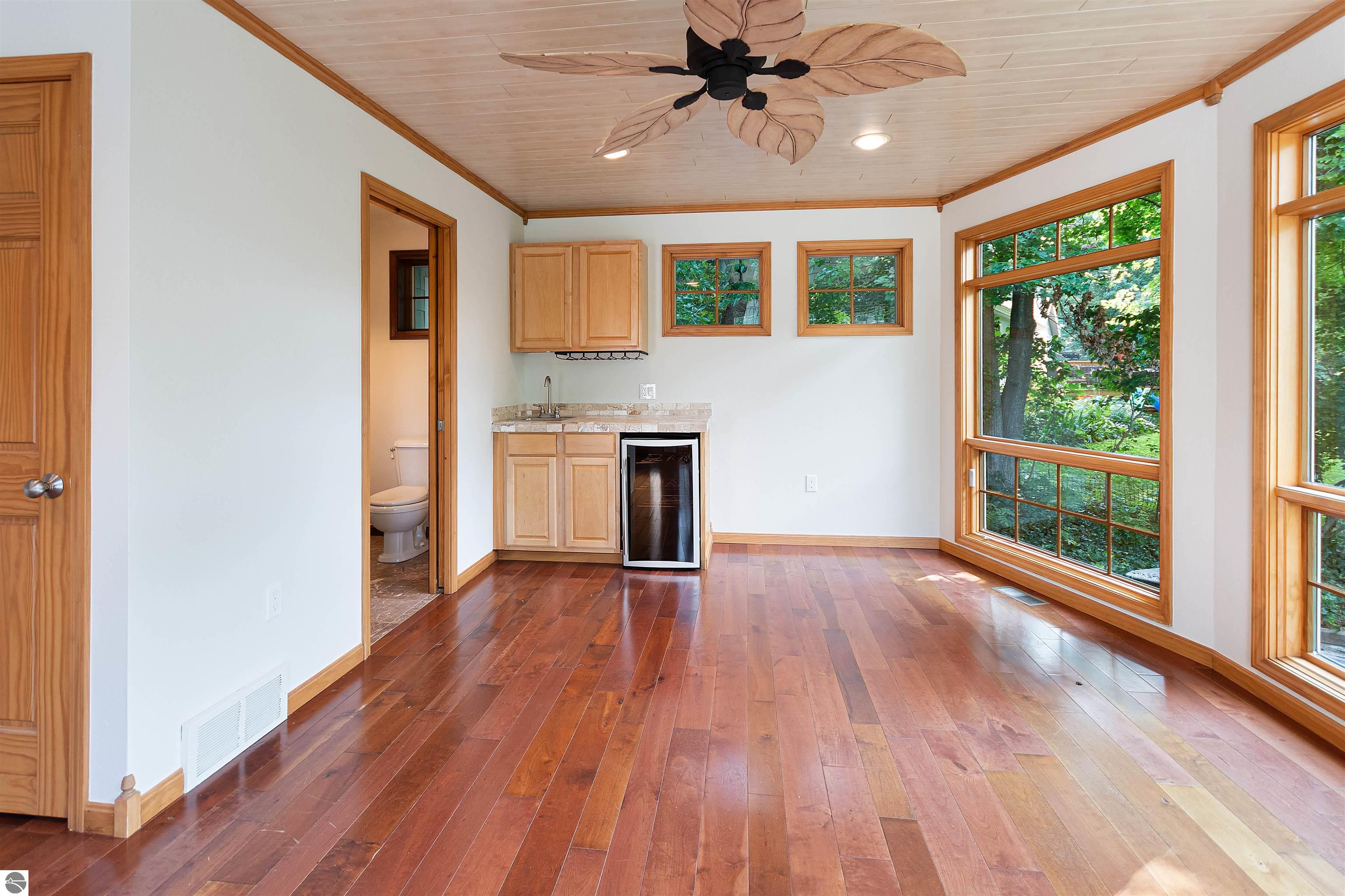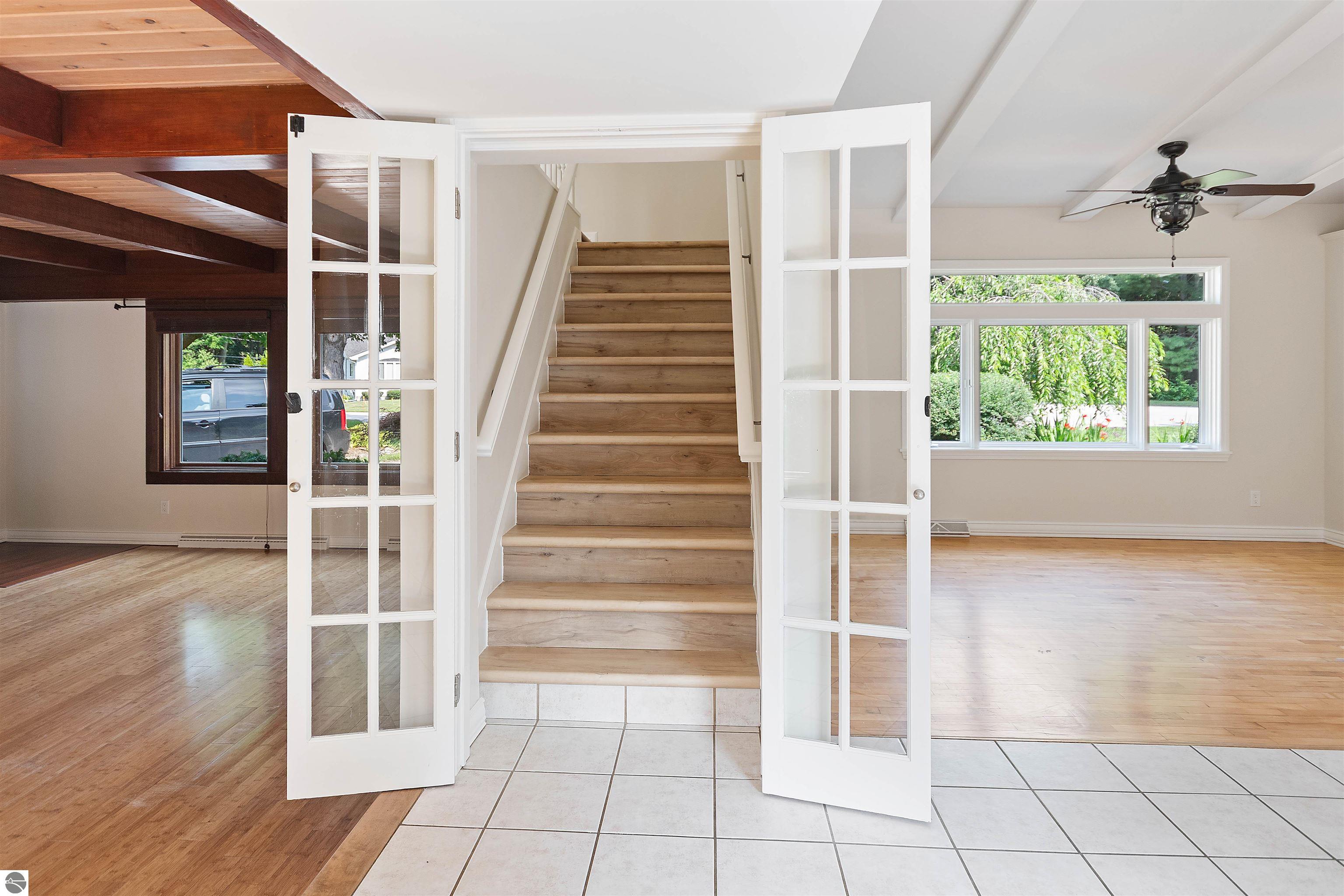 Base of Old Mission Peninsula. Beautifully remodeled 1 1/2 story ranch situated on a secluded, peaceful cul-de-sac. Features an expansive kitchen with storage pantry, flowing into a grand post and beam sunken living area boasting a gas fireplace with striking brick mantle and integrated cherry-wood media center. Elegant dining space and inviting sun room, showcasing floor-to-ceiling Pella windows overlooking a meticulously landscaped backyard zen garden with stone-columned deck and patio. Upper floor features a generous master retreat including a jet tub, separate shower enclosure, and overhead skylight. Lower level features a finished recreation room with gas fireplace, custom floor-to-ceiling bookcase, and office or wine storage space. Well-appointed garage with insulation, drywall, dedicated storage room, attic space, and epoxy flooring. Exterior features attractive white Canadian cedar shake siding and beautiful perennial gardens. This charming residence offers exceptional appeal with interesting architectural elements throughout. Convenient access to West Bay, Bryant Park, Civic Center, neighborhood Clancy Park, and downtown Traverse City and situated at the start of the OMP Wine Trail. Click on virtual tour for an incredibly realistic view of the interior.