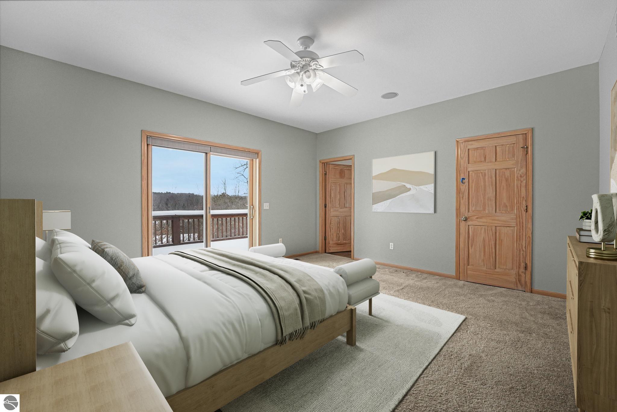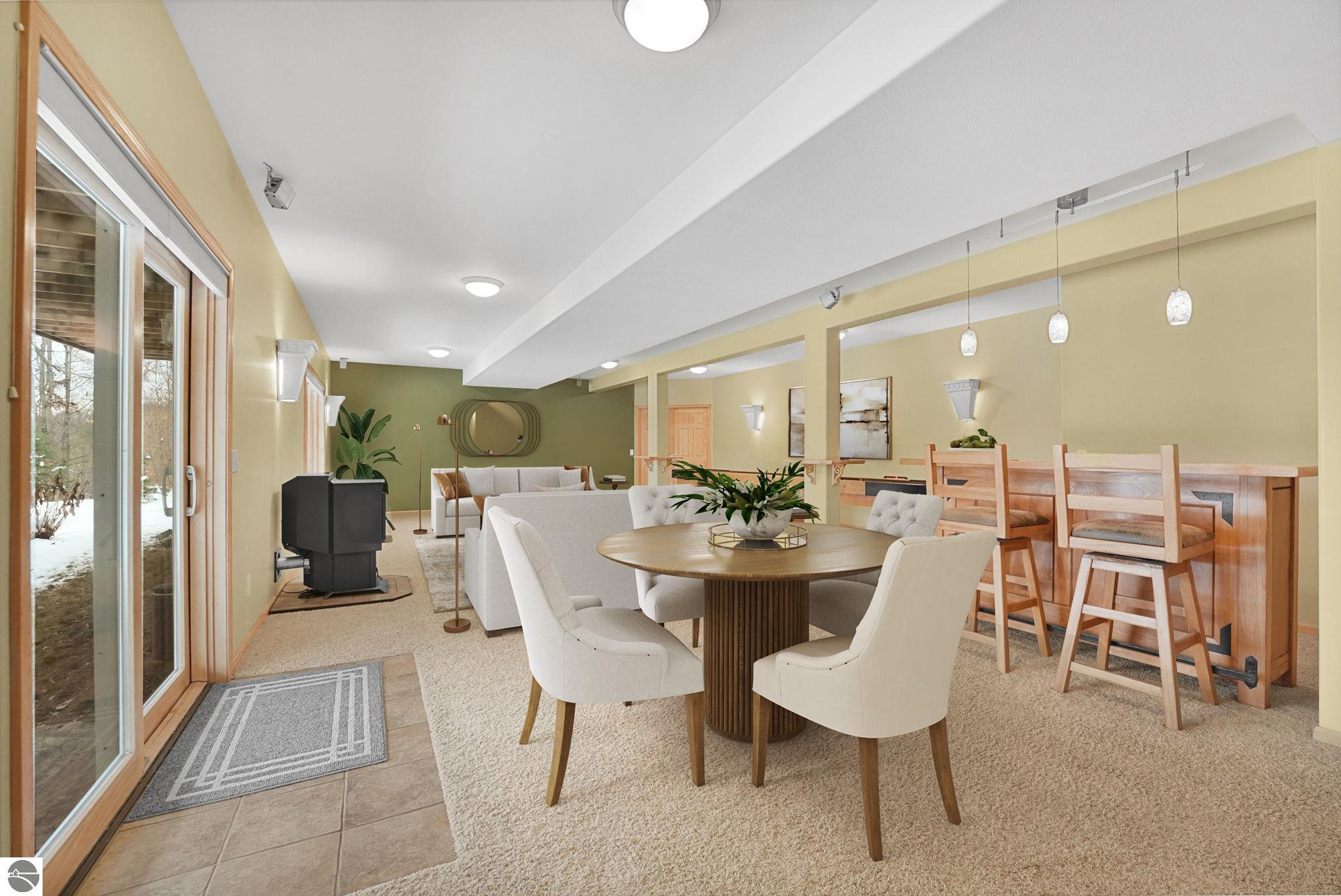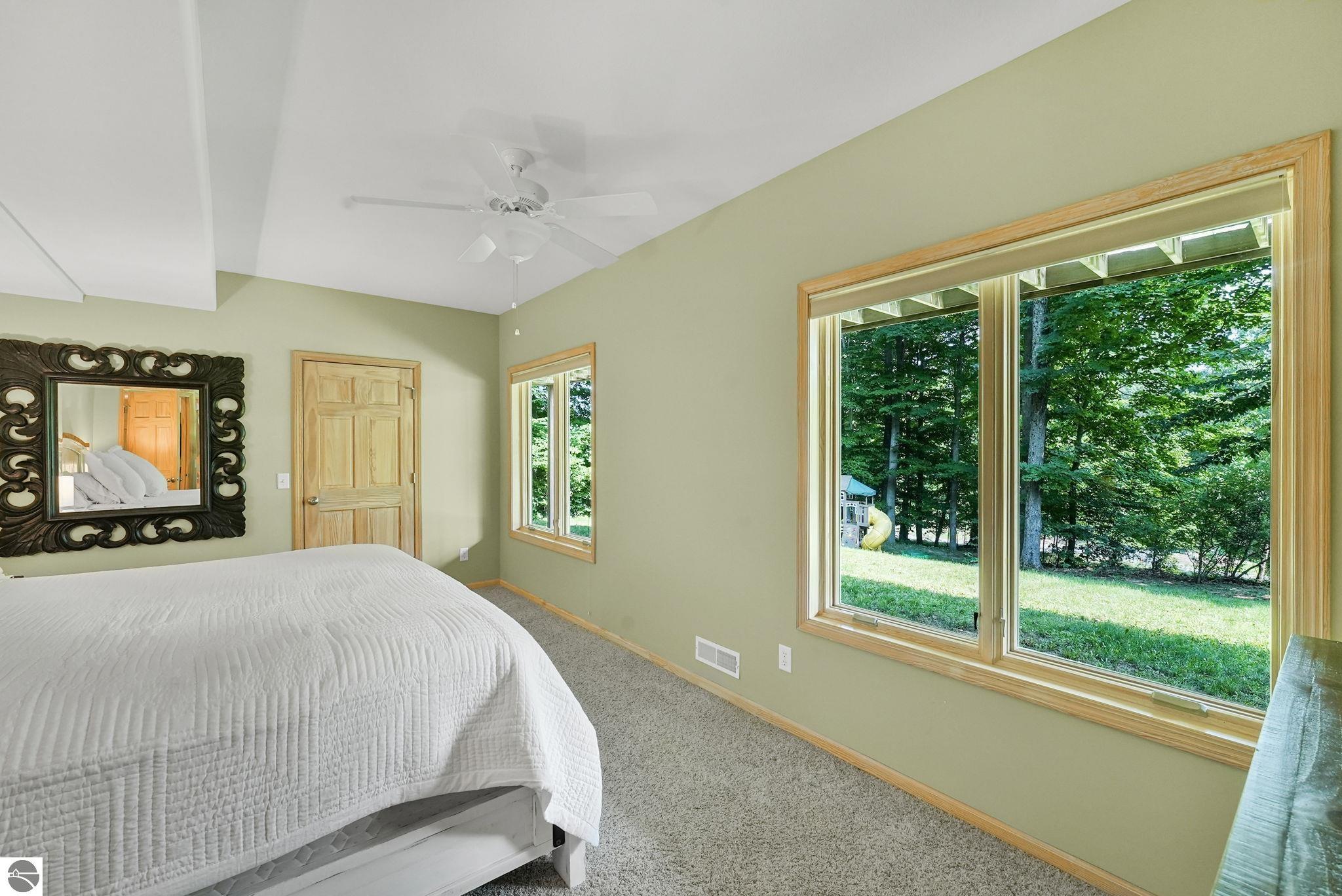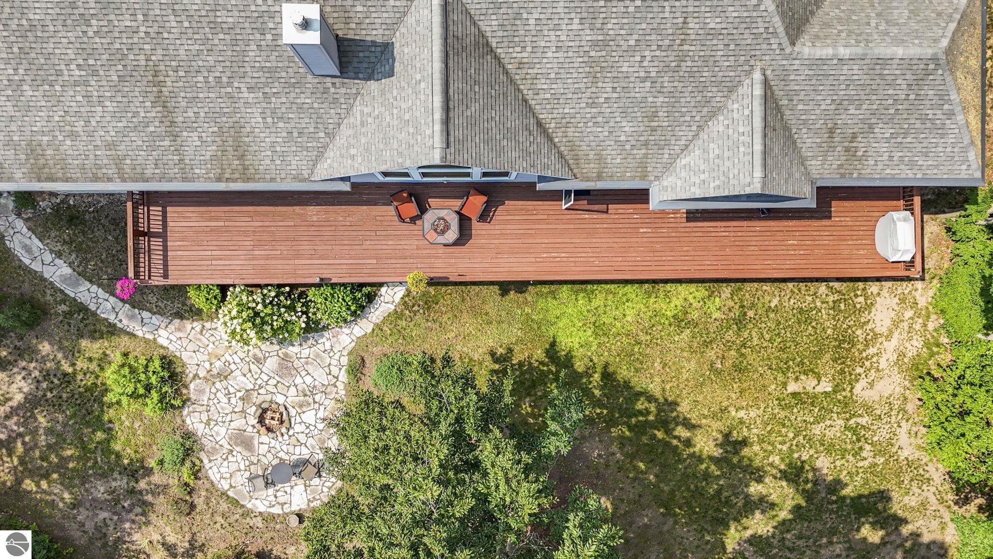 Nestled in a tranquil, treehouse-like setting on 1.6 acres, this 4-bedroom, 3.5-bath home in Truax Lake captures the essence of Up North living. This neighborhood enjoys a private access point to the Pere Marquette State Forest, with thousands of miles of scenic trails for hiking, biking, and year-round recreation. Step inside to vaulted ceilings and an open concept living space anchored by a floor-to-ceiling river stone fireplace. The spacious kitchen is well-appointed with solid wood cabinetry, natural stone countertops, stainless steel appliances, and picturesque views of the tree-lined backyard. The elevated deck spans the length of the home, overlooking the woodland canopy views. A cozy three seasons porch, wrapped in knotty pine, invites you to relax amidst the forested surroundings throughout the year. The primary bedroom features private deck access, walk-in closet and an ensuite bath with a dual vanity, jetted tub, and walk-in shower. Two additional bedrooms, a full bathroom, powder room, and laundry room complete this floor - offering the ease of single-level living. The walk-out lower level provides a large recreation room, bar area, guest bedroom, full bathroom, and an additional 1,225 sq. ft. of storage space. A landscaped backyard with a flagstone path leads to a fire pit, perfect for gathering under the stars and enjoying the peaceful Northern Michigan nights.