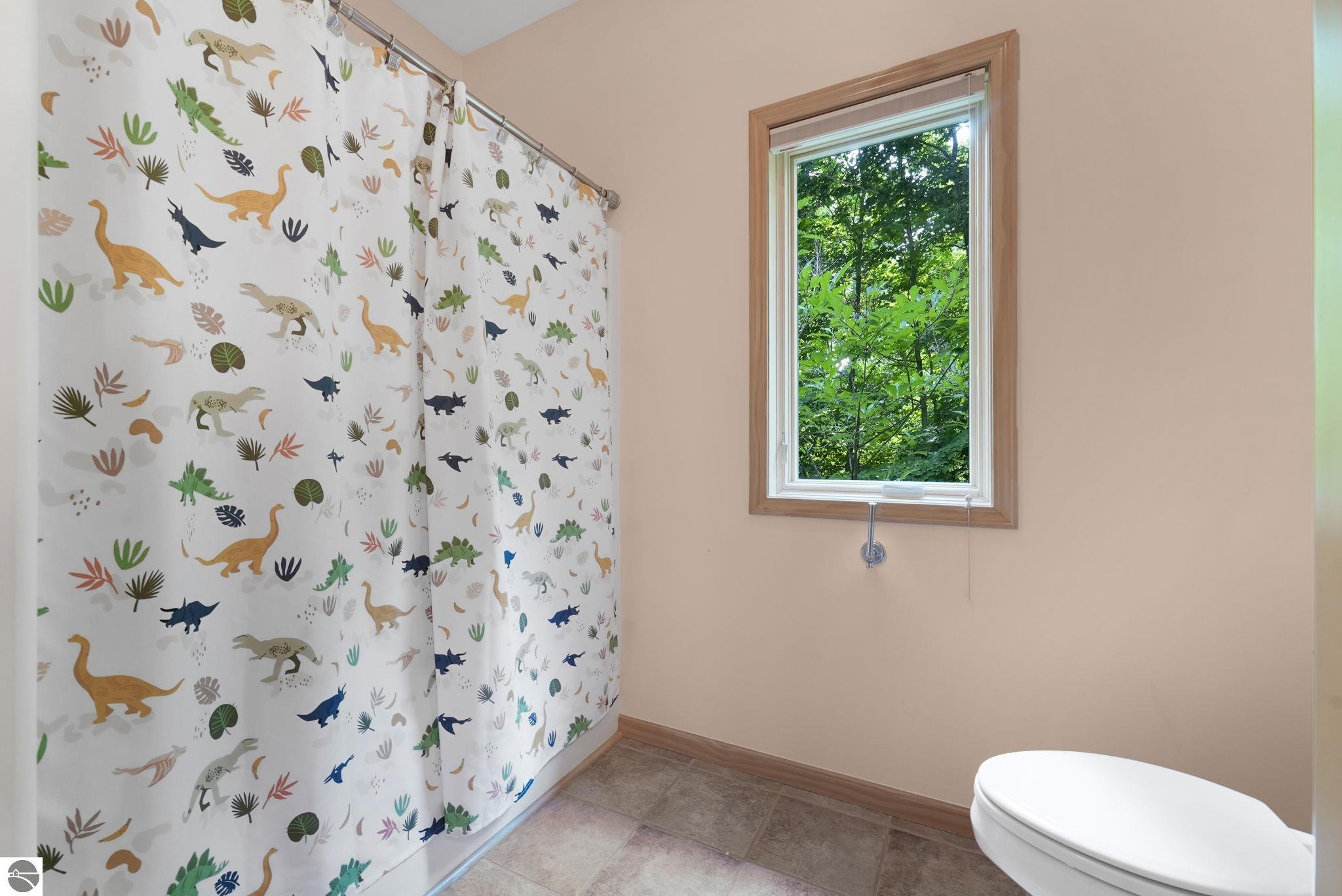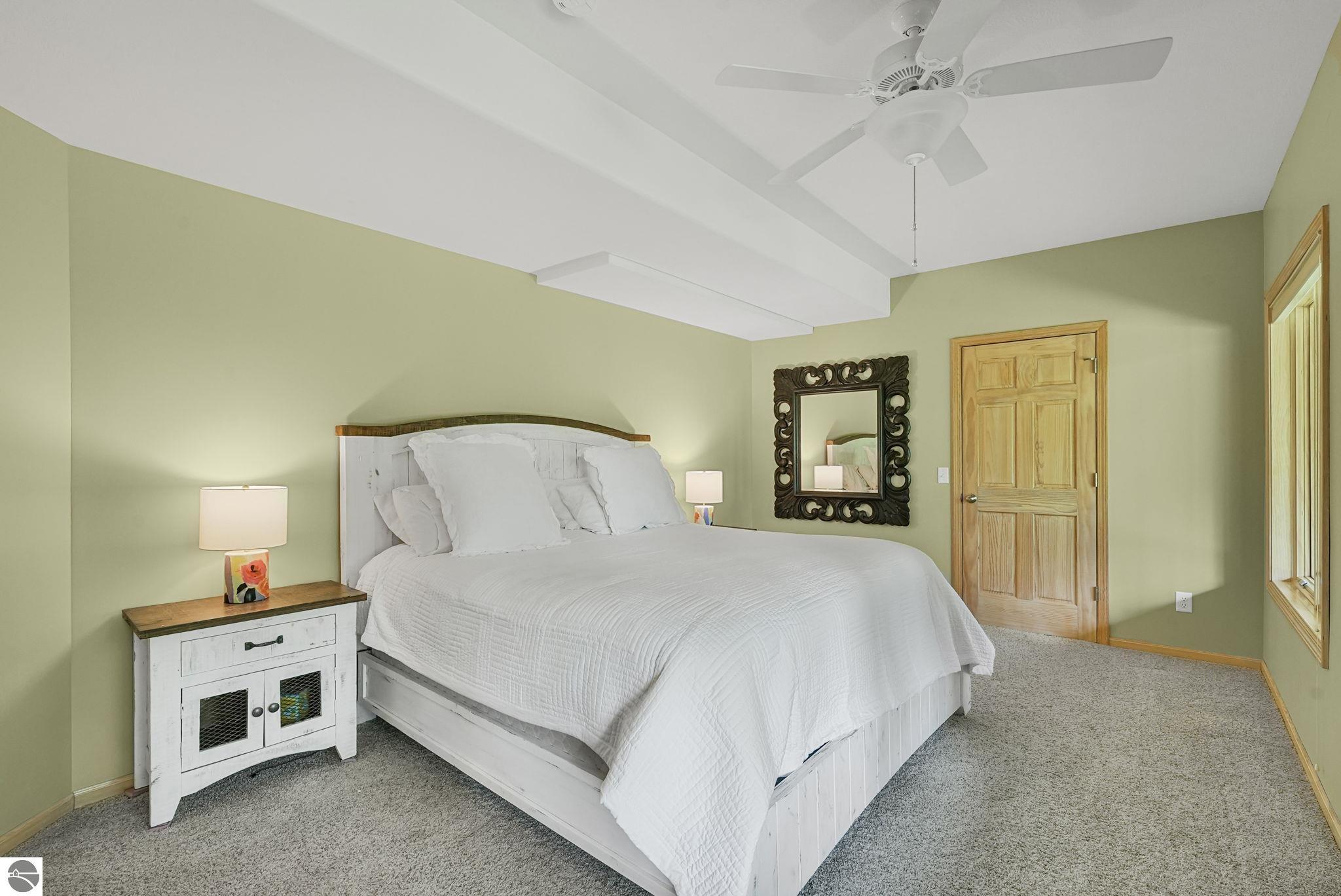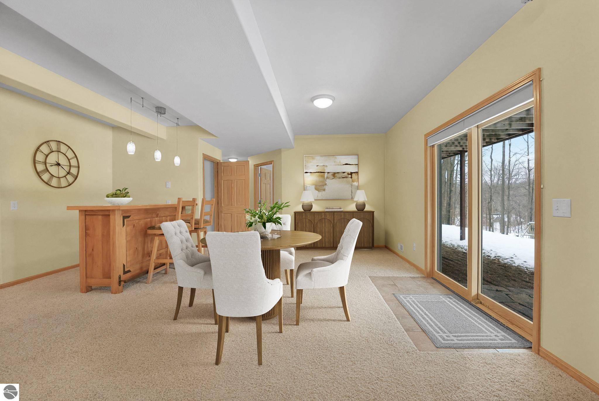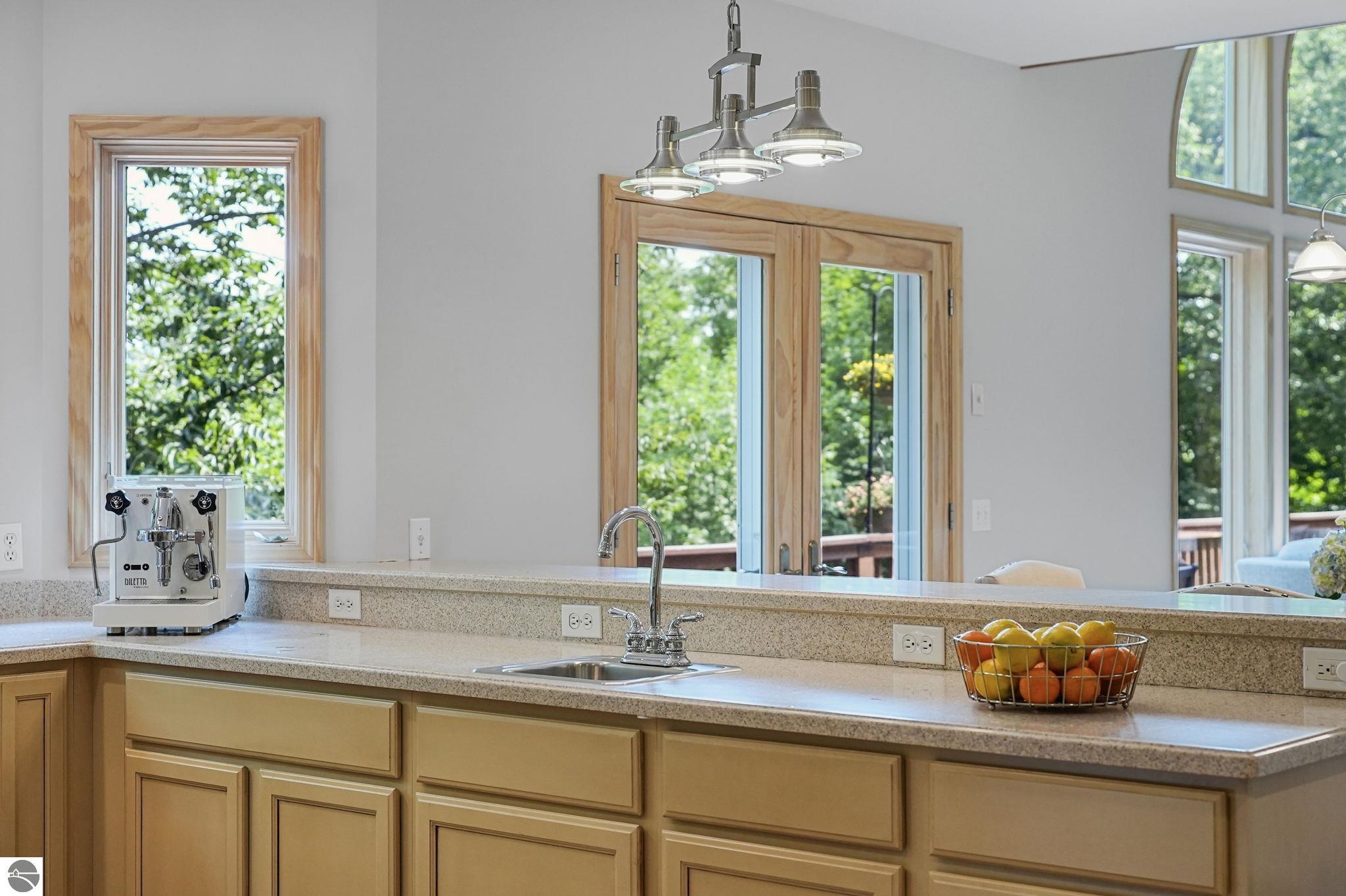 Nestled in a tranquil, treehouse-like setting on 1.6 acres, this 4-bedroom, 3.5-bath home in Truax Lake captures the essence of Up North living. This neighborhood enjoys a private access point to the Pere Marquette State Forest, with thousands of miles of scenic trails for hiking, biking, and year-round recreation. Step inside to vaulted ceilings and an open concept living space anchored by a floor-to-ceiling river stone fireplace. The spacious kitchen is well-appointed with solid wood cabinetry, natural stone countertops, stainless steel appliances, and picturesque views of the tree-lined backyard. The elevated deck spans the length of the home, overlooking the woodland canopy views. A cozy three seasons porch, wrapped in knotty pine, invites you to relax amidst the forested surroundings throughout the year. The primary bedroom features private deck access, walk-in closet and an ensuite bath with a dual vanity, jetted tub, and walk-in shower. Two additional bedrooms, a full bathroom, powder room, and laundry room complete this floor - offering the ease of single-level living. The walk-out lower level provides a large recreation room, bar area, guest bedroom, full bathroom, and an additional 1,225 sq. ft. of storage space. A landscaped backyard with a flagstone path leads to a fire pit, perfect for gathering under the stars and enjoying the peaceful Northern Michigan nights.