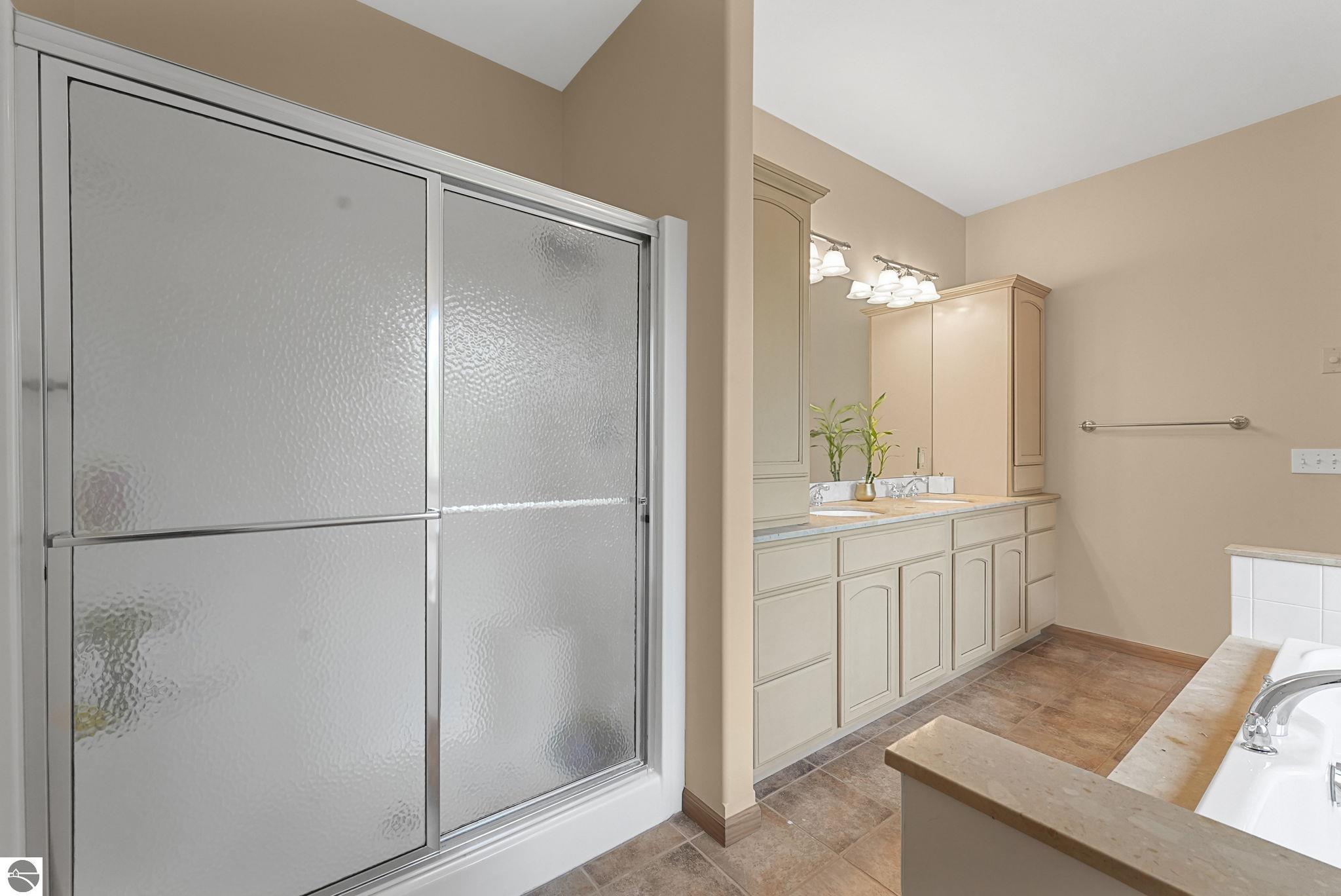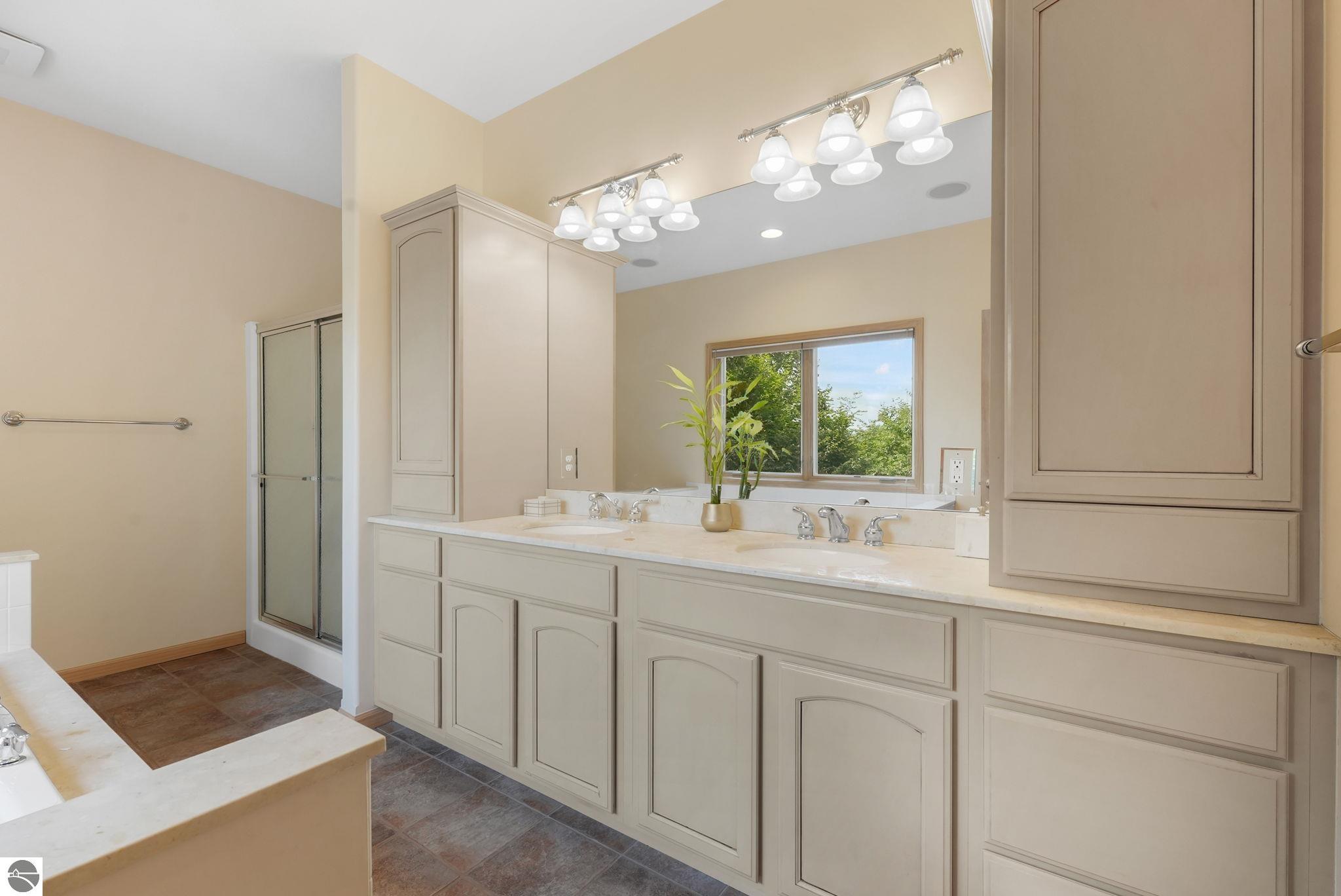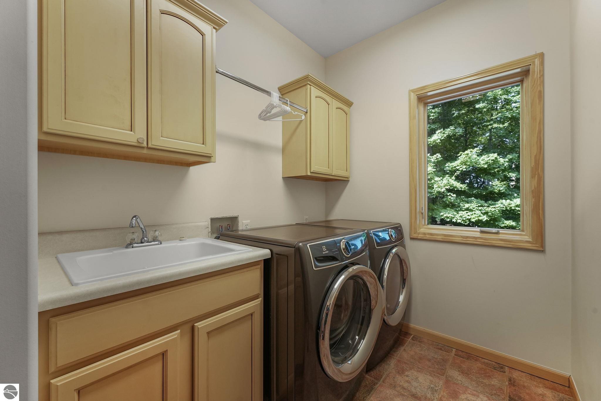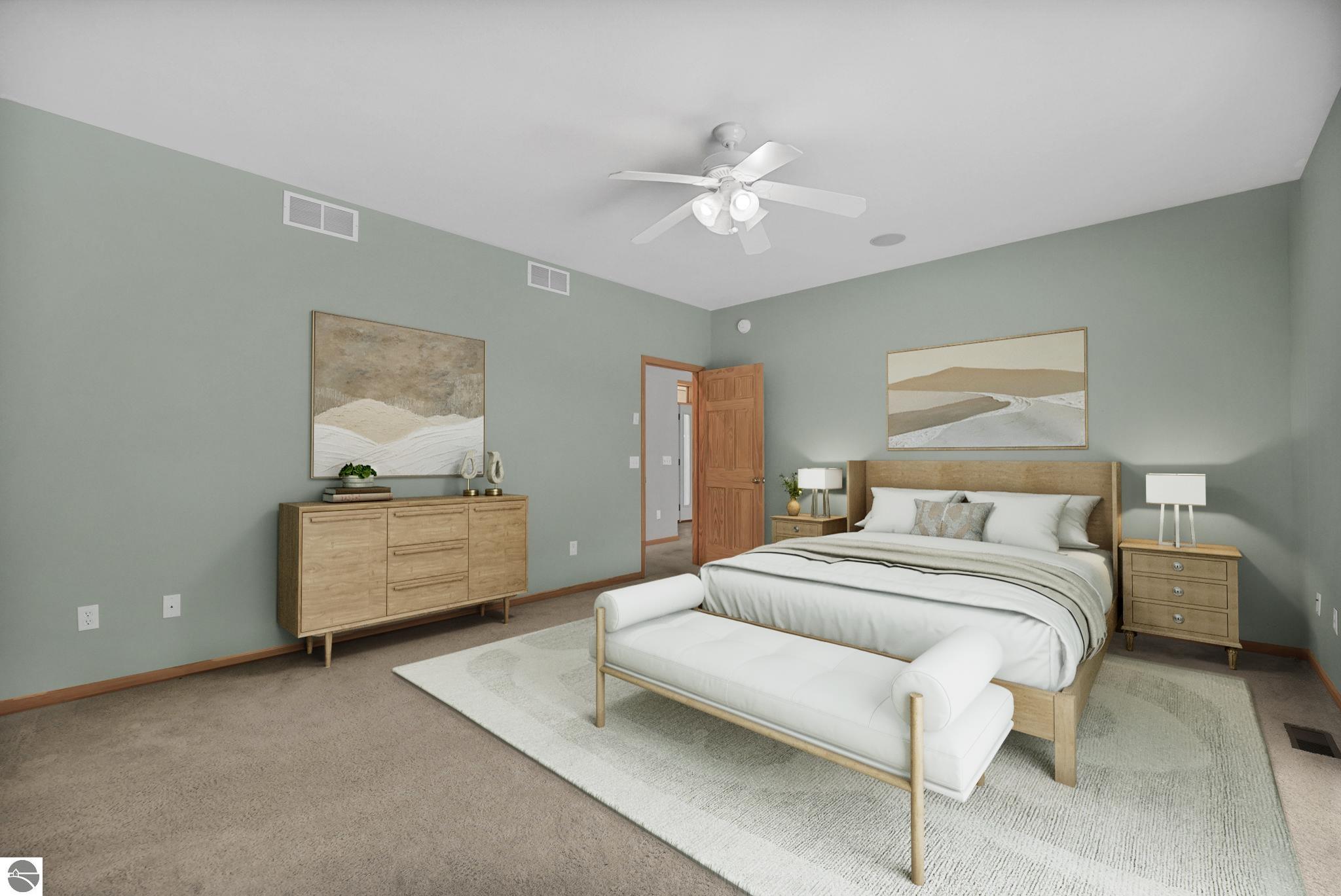 Nestled in a tranquil, treehouse-like setting on 1.6 acres, this 4-bedroom, 3.5-bath home in Truax Lake captures the essence of Up North living. This neighborhood enjoys a private access point to the Pere Marquette State Forest, with thousands of miles of scenic trails for hiking, biking, and year-round recreation. Step inside to vaulted ceilings and an open concept living space anchored by a floor-to-ceiling river stone fireplace. The spacious kitchen is well-appointed with solid wood cabinetry, natural stone countertops, stainless steel appliances, and picturesque views of the tree-lined backyard. The elevated deck spans the length of the home, overlooking the woodland canopy views. A cozy three seasons porch, wrapped in knotty pine, invites you to relax amidst the forested surroundings throughout the year. The primary bedroom features private deck access, walk-in closet and an ensuite bath with a dual vanity, jetted tub, and walk-in shower. Two additional bedrooms, a full bathroom, powder room, and laundry room complete this floor - offering the ease of single-level living. The walk-out lower level provides a large recreation room, bar area, guest bedroom, full bathroom, and an additional 1,225 sq. ft. of storage space. A landscaped backyard with a flagstone path leads to a fire pit, perfect for gathering under the stars and enjoying the peaceful Northern Michigan nights.