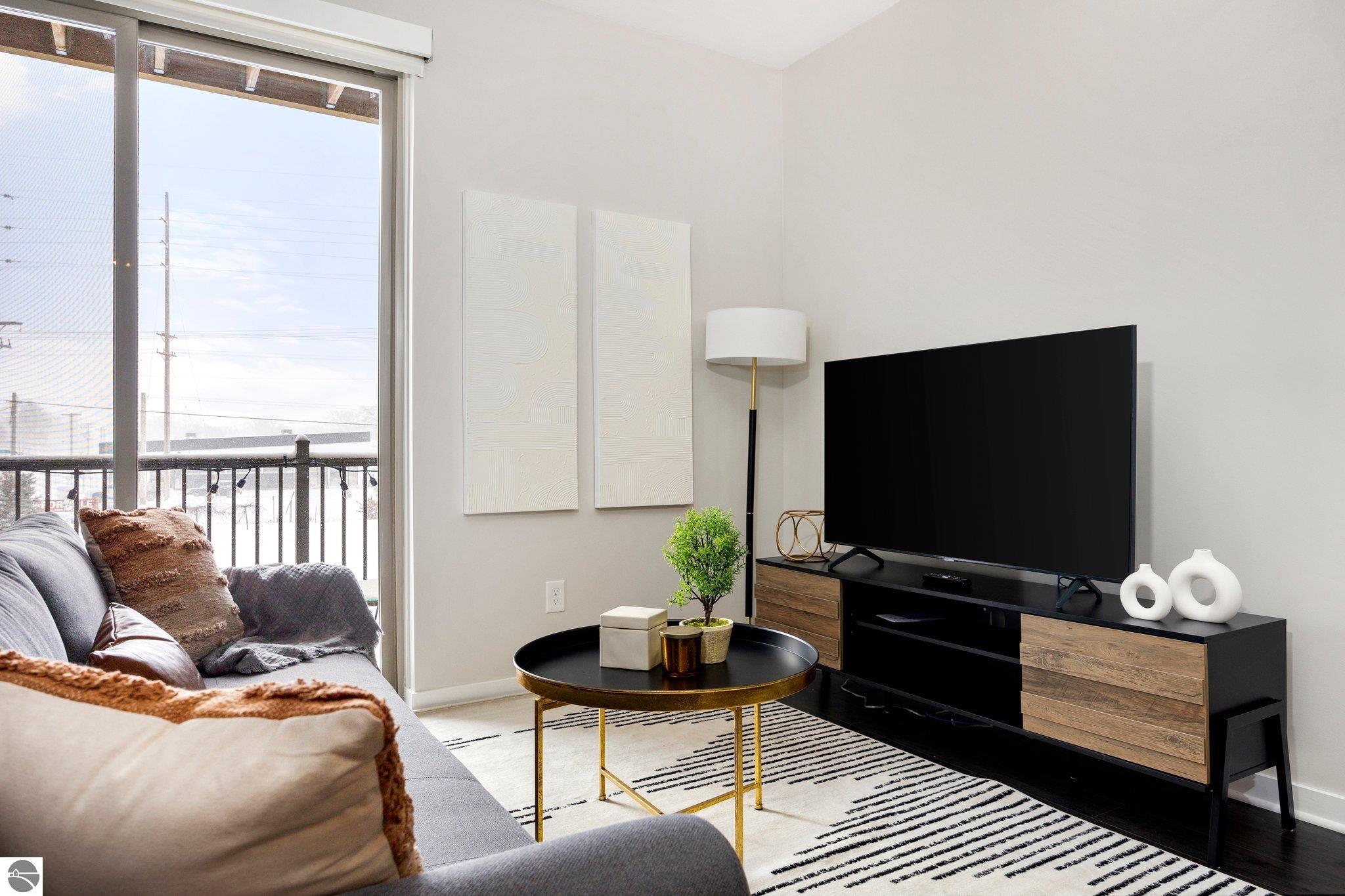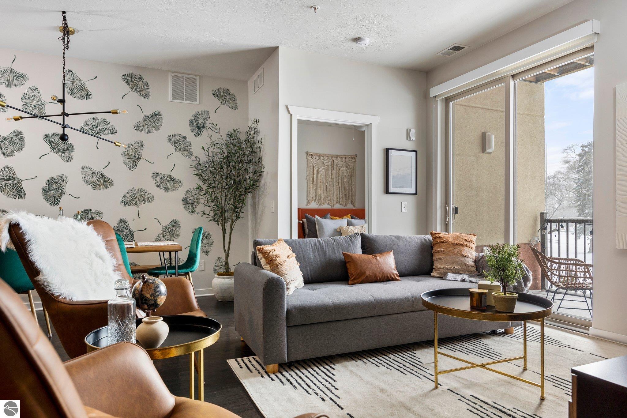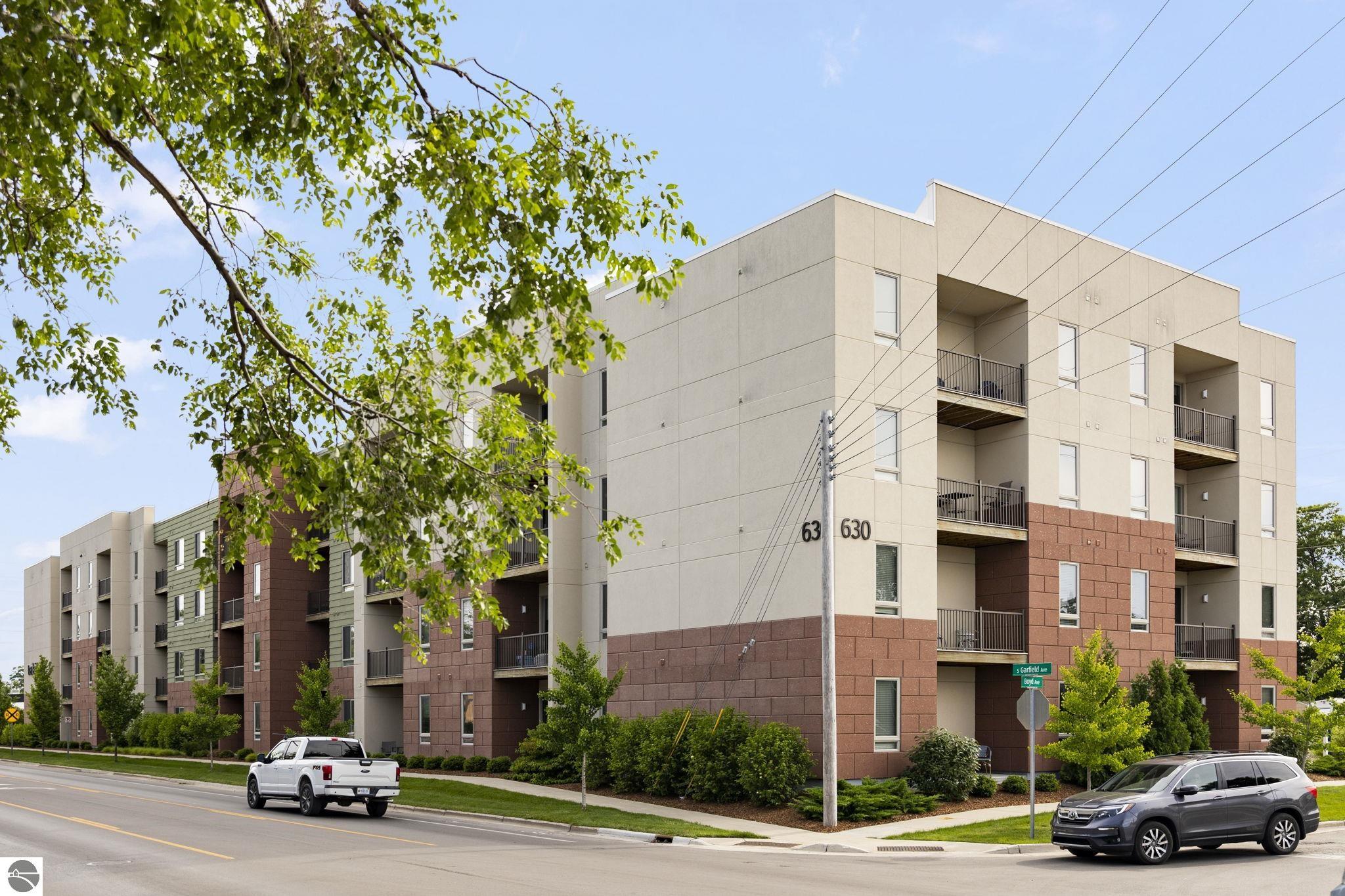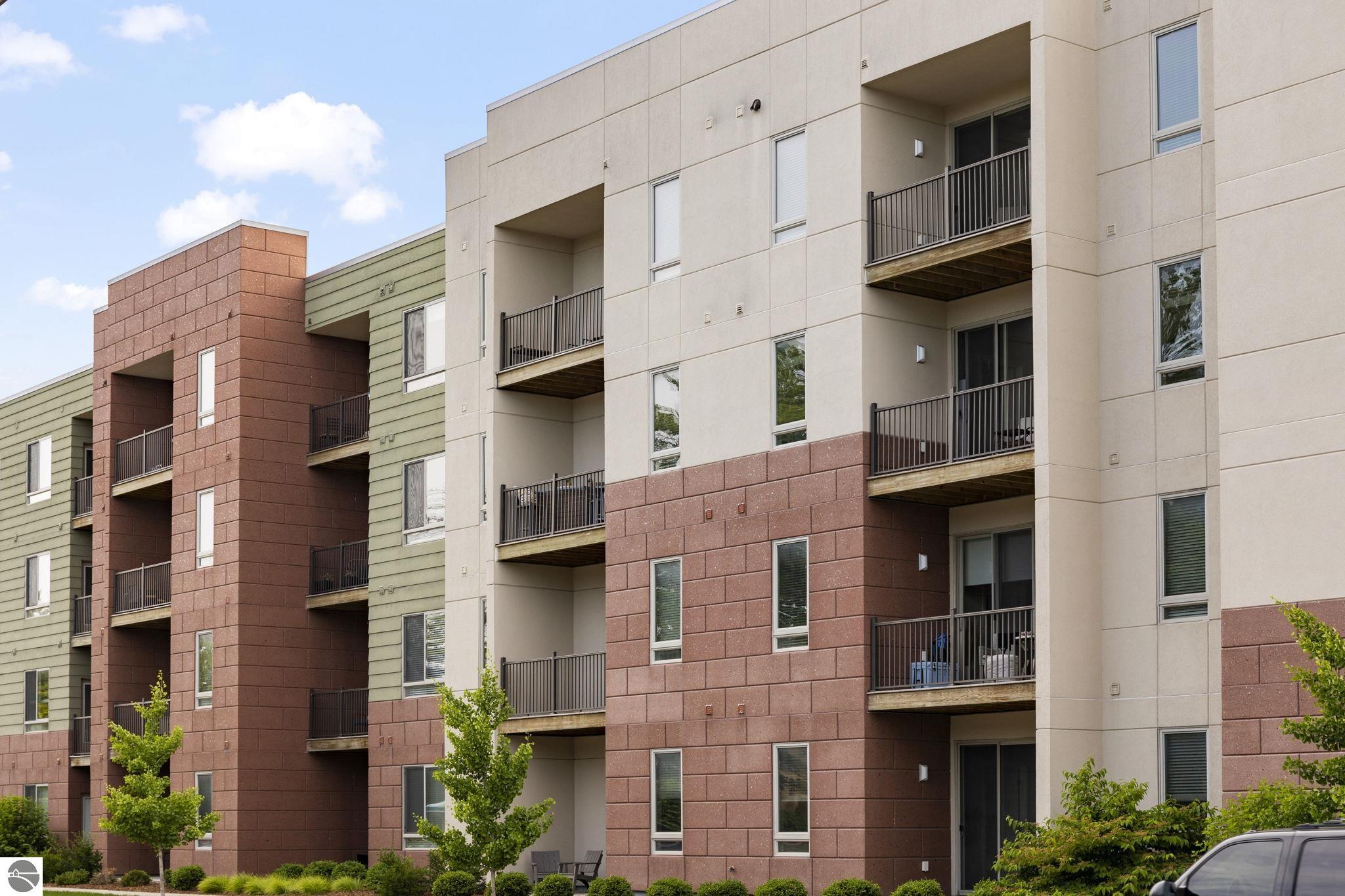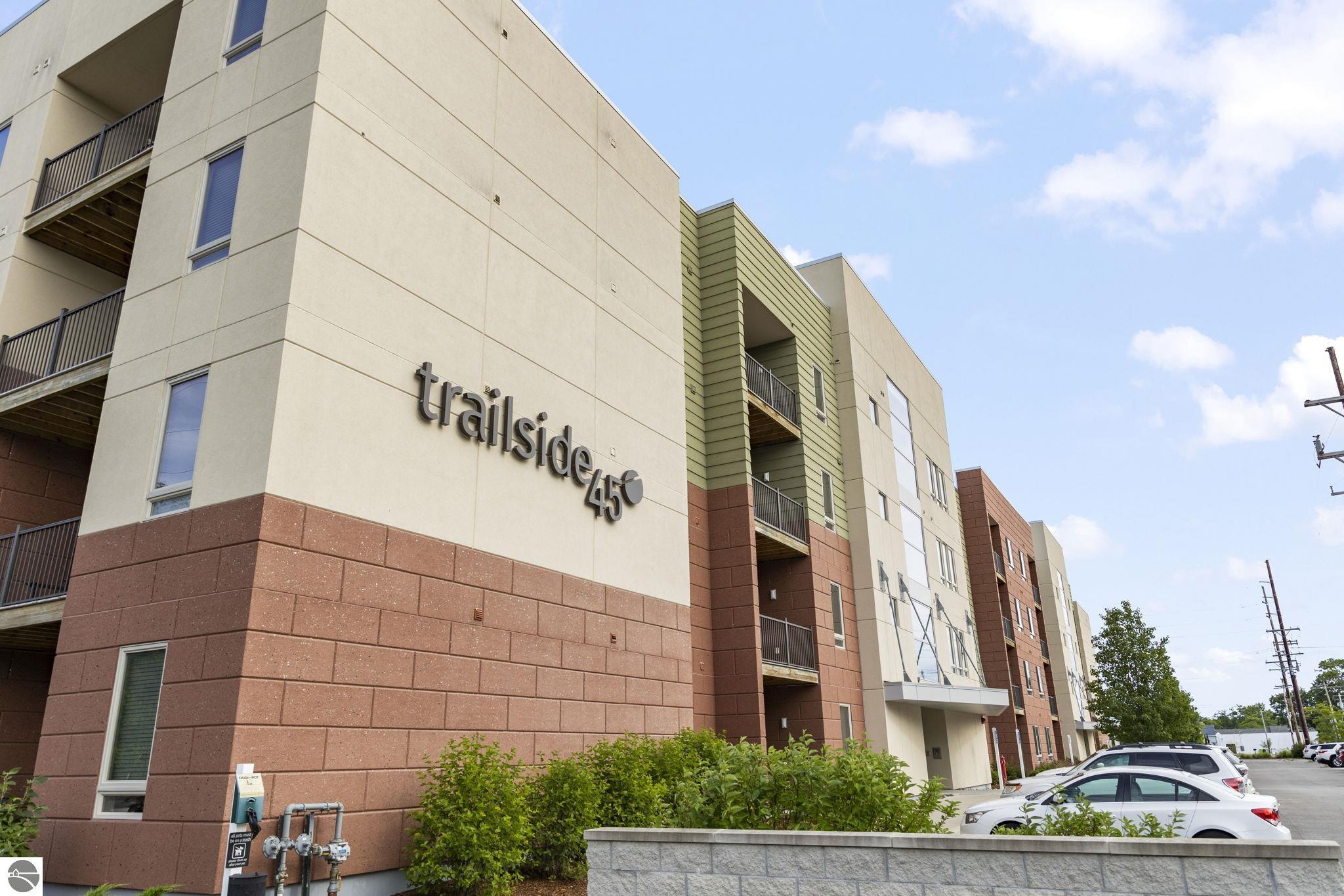 Welcome to Trailside 45, where modern convenience meets the best of Traverse City living. Being sold fully furnished, this 2 bed/2 bath condo sits at the eastern edge of downtown, offering immediate access to both nature and culture. Step outside and you’re on the TART Trail- your gateway to the Civic Center, beaches, parks, bike shops, Elev8 Climbing Gym, and the library. Just down the trail, you'll find local favorites like The Filling Station microbrewery and a long list of cafes, coffee shops, eateries, and gathering spots. Inside, the condo is designed for comfort and simplicity, with an open-concept layout and clean, contemporary finishes, featuring quartz countertops in the kitchen and bathrooms, an in-unit washer and dryer, and built-in closet organization. Additional amenities include high energy efficiency, no steps, elevator access, and on-site 24 hour maintenance. Oversized bike locker rooms, conveniently located right off the elevator on each floor, make storing your gear easy and secure. Owners also enjoy access to a spacious, well-appointed community room, perfect for hosting gatherings or connecting with neighbors. One assigned parking pass per unit adds convenience to your daily routine. Whether you’re looking for your own home base or a smart investment, Trailside 45 offers low-maintenance living in one of Traverse City’s most walkable and bikeable neighborhoods. Enjoy being close to everything, while tucked into a peaceful, modern community built for active, connected living.