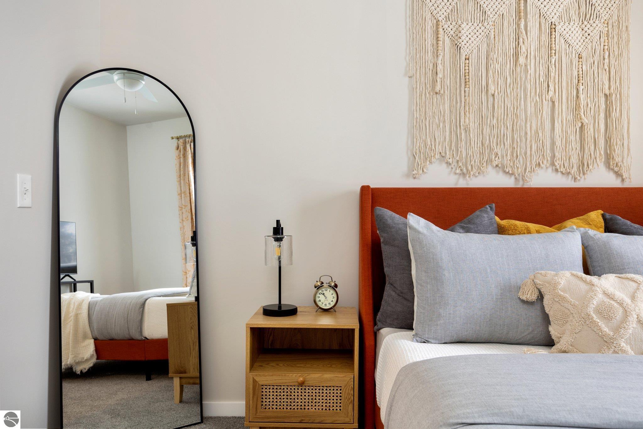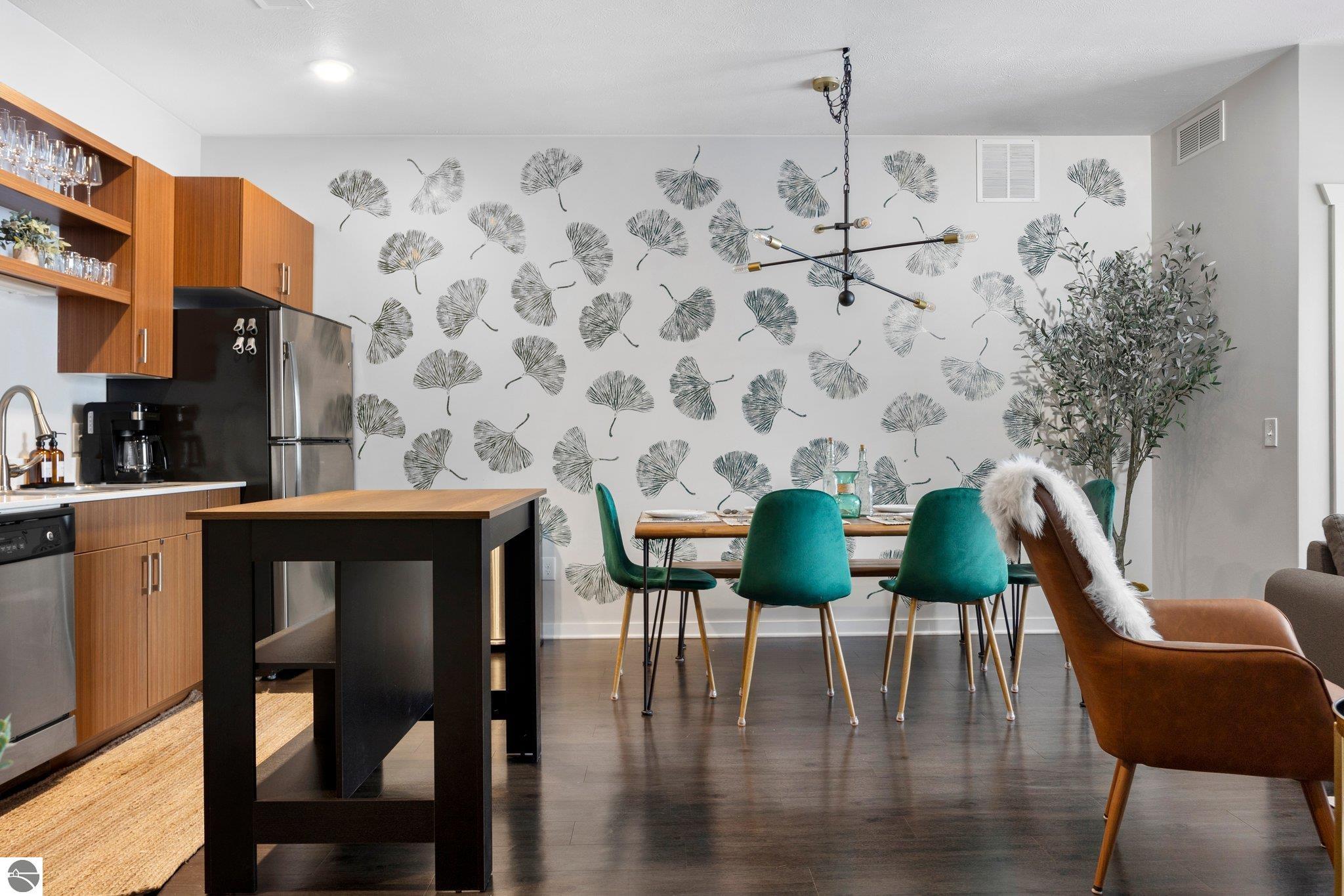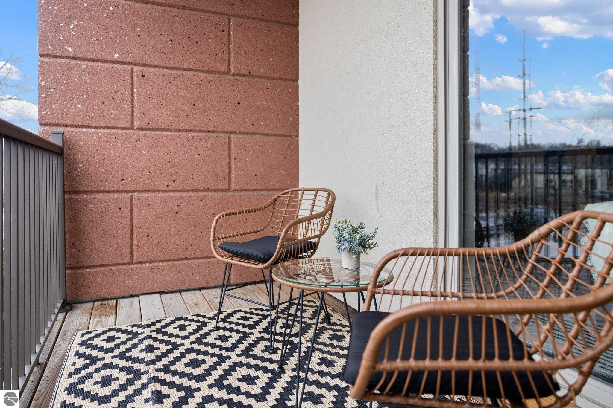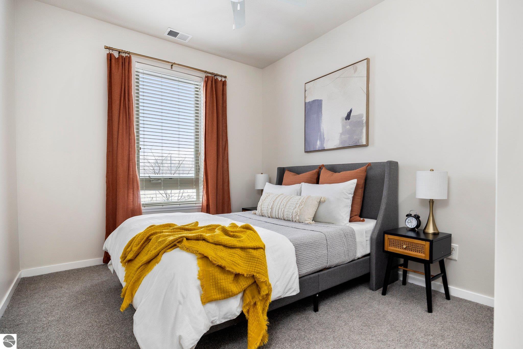 Welcome to Trailside 45, where modern convenience meets the best of Traverse City living. Being sold fully furnished, this 2 bed/2 bath condo sits at the eastern edge of downtown, offering immediate access to both nature and culture. Step outside and you’re on the TART Trail- your gateway to the Civic Center, beaches, parks, bike shops, Elev8 Climbing Gym, and the library. Just down the trail, you'll find local favorites like The Filling Station microbrewery and a long list of cafes, coffee shops, eateries, and gathering spots. Inside, the condo is designed for comfort and simplicity, with an open-concept layout and clean, contemporary finishes, featuring quartz countertops in the kitchen and bathrooms, an in-unit washer and dryer, and built-in closet organization. Additional amenities include high energy efficiency, no steps, elevator access, and on-site 24 hour maintenance. Oversized bike locker rooms, conveniently located right off the elevator on each floor, make storing your gear easy and secure. Owners also enjoy access to a spacious, well-appointed community room, perfect for hosting gatherings or connecting with neighbors. One assigned parking pass per unit adds convenience to your daily routine. Whether you’re looking for your own home base or a smart investment, Trailside 45 offers low-maintenance living in one of Traverse City’s most walkable and bikeable neighborhoods. Enjoy being close to everything, while tucked into a peaceful, modern community built for active, connected living.