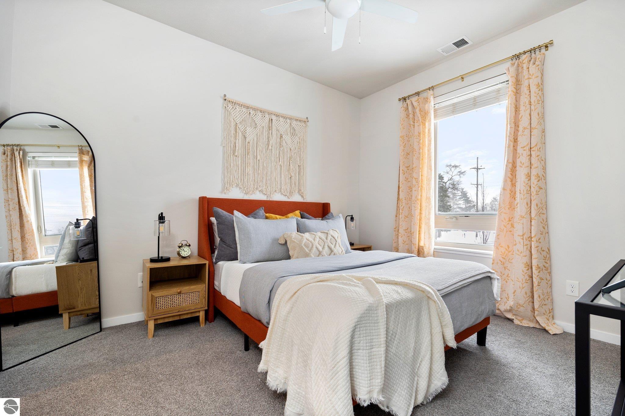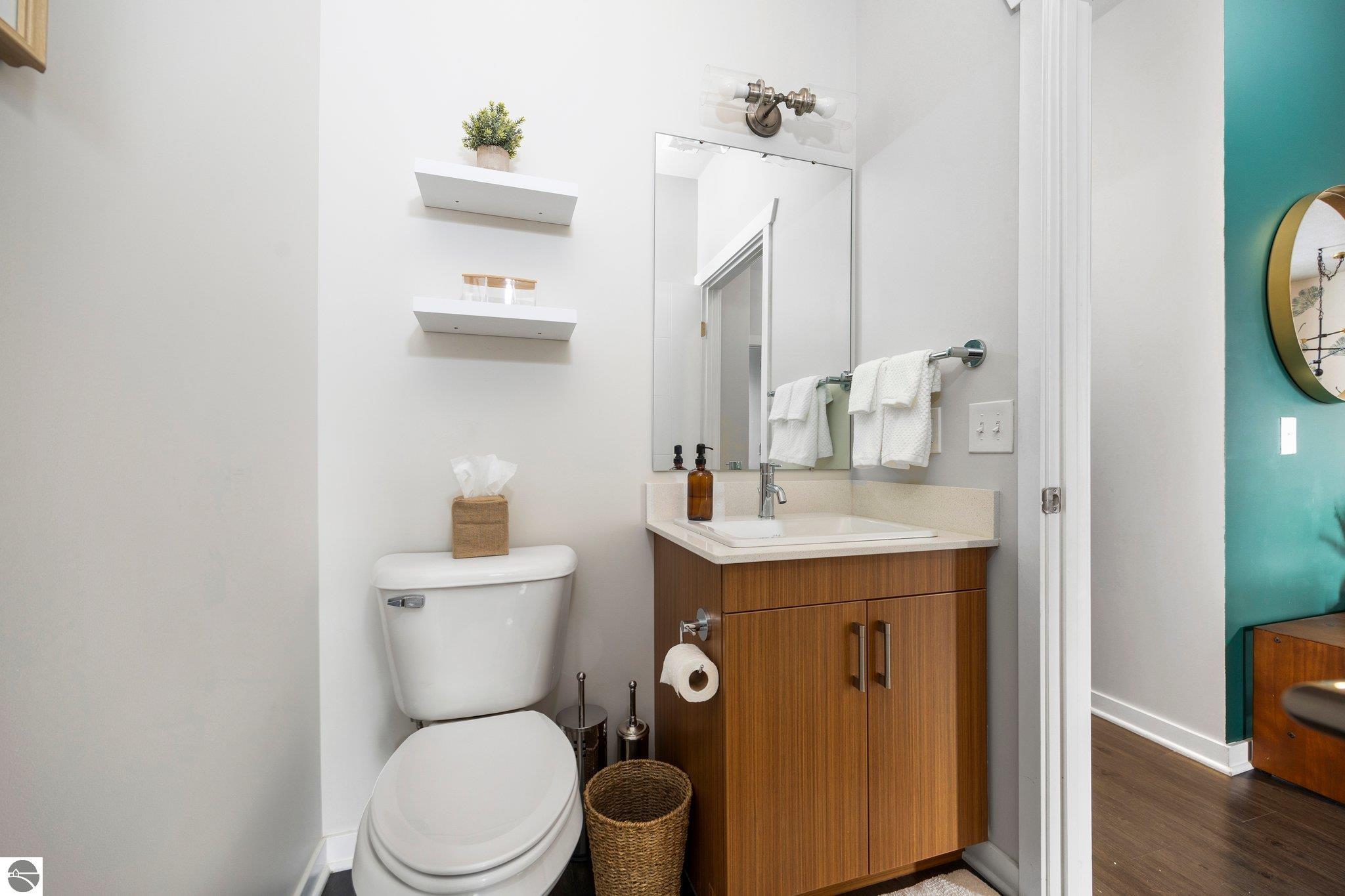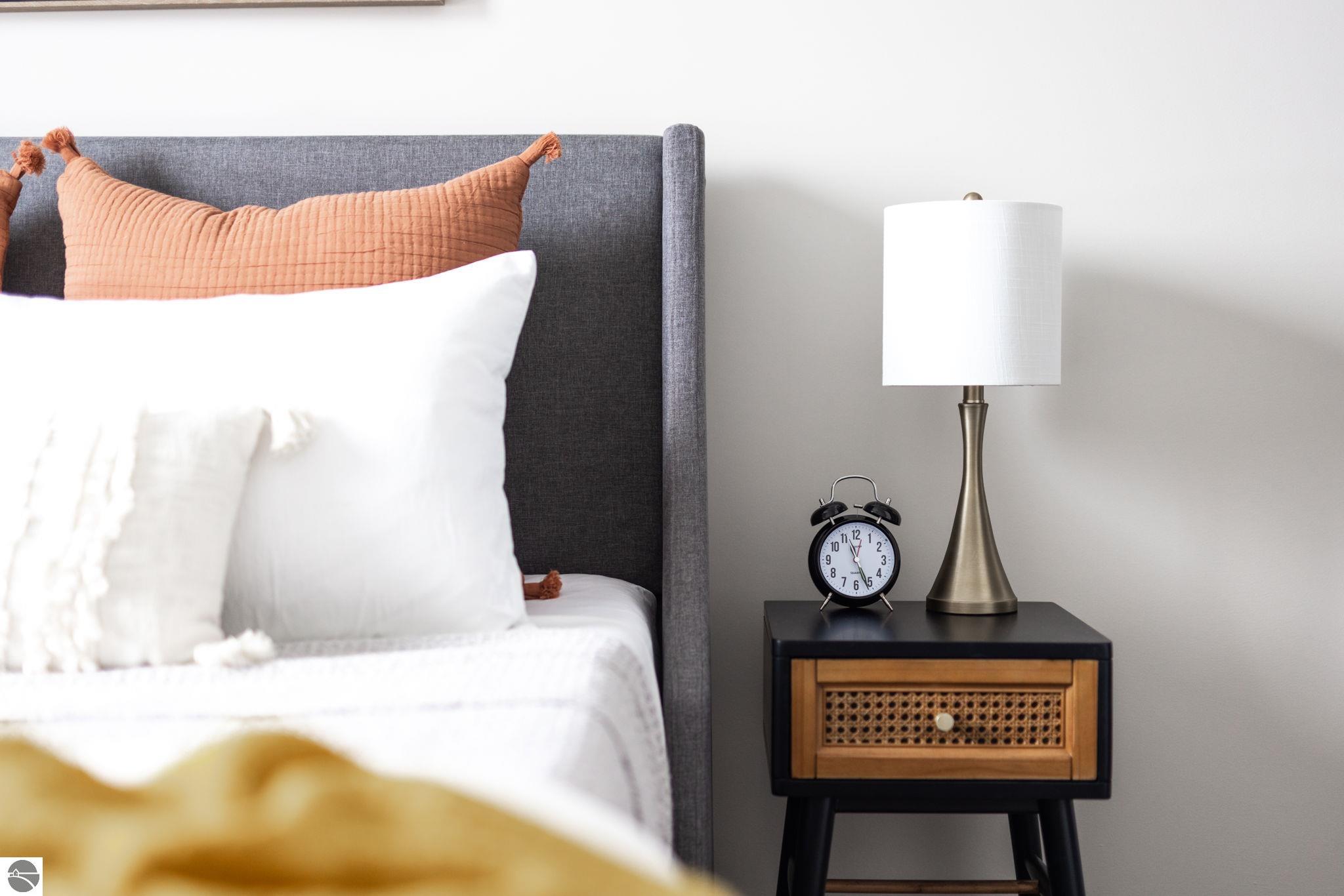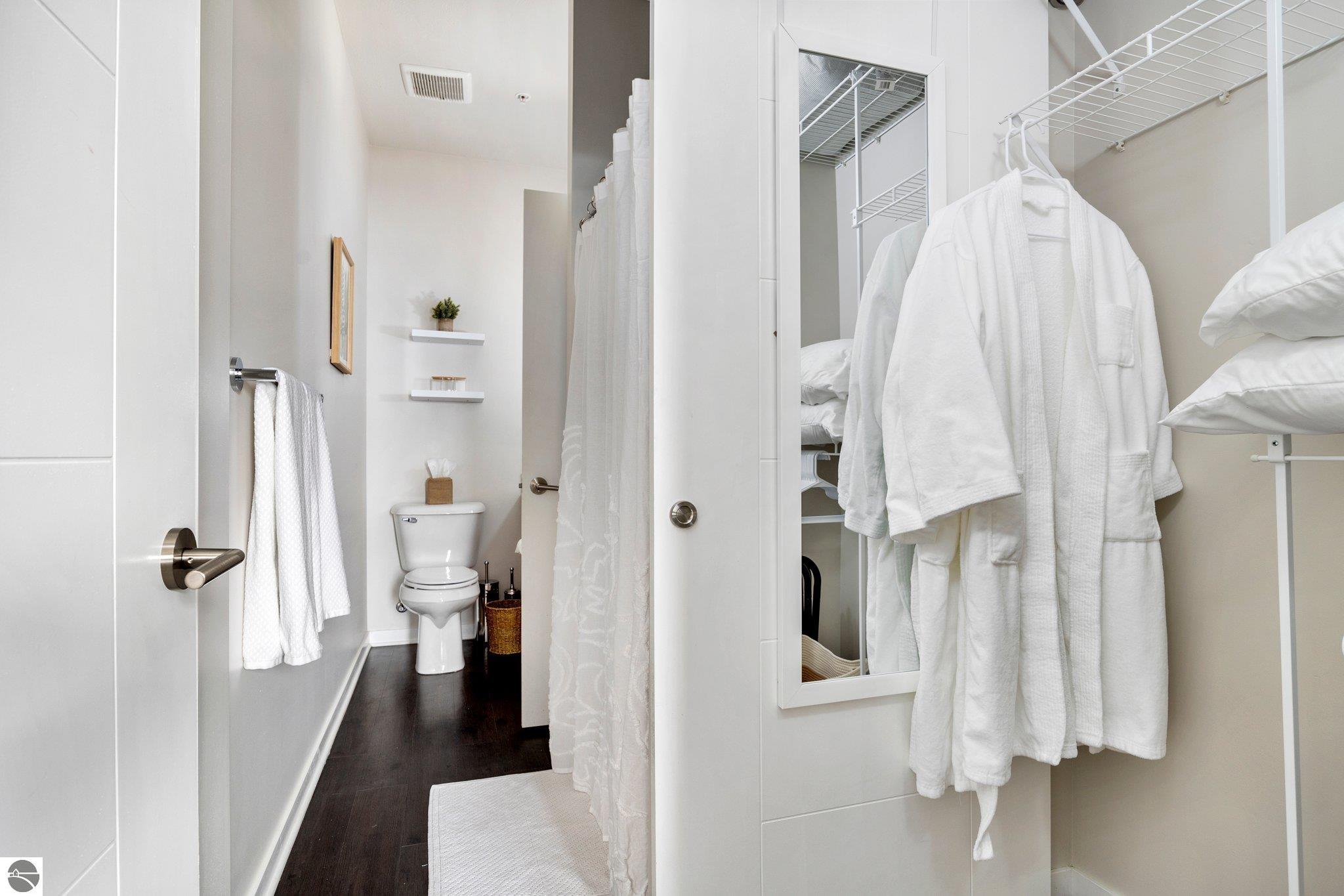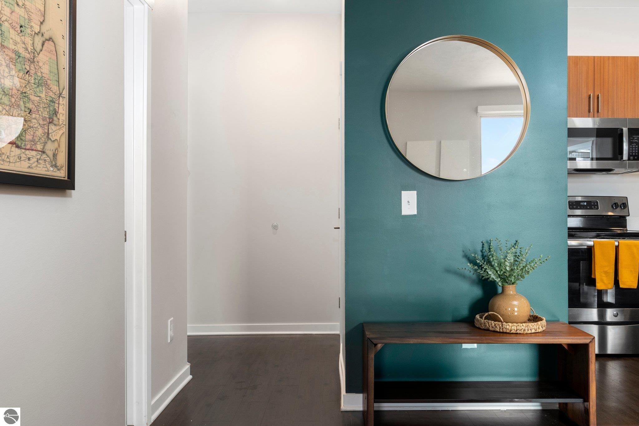 Welcome to Trailside 45, where modern convenience meets the best of Traverse City living. Being sold fully furnished, this 2 bed/2 bath condo sits at the eastern edge of downtown, offering immediate access to both nature and culture. Step outside and you’re on the TART Trail- your gateway to the Civic Center, beaches, parks, bike shops, Elev8 Climbing Gym, and the library. Just down the trail, you'll find local favorites like The Filling Station microbrewery and a long list of cafes, coffee shops, eateries, and gathering spots. Inside, the condo is designed for comfort and simplicity, with an open-concept layout and clean, contemporary finishes, featuring quartz countertops in the kitchen and bathrooms, an in-unit washer and dryer, and built-in closet organization. Additional amenities include high energy efficiency, no steps, elevator access, and on-site 24 hour maintenance. Oversized bike locker rooms, conveniently located right off the elevator on each floor, make storing your gear easy and secure. Owners also enjoy access to a spacious, well-appointed community room, perfect for hosting gatherings or connecting with neighbors. One assigned parking pass per unit adds convenience to your daily routine. Whether you’re looking for your own home base or a smart investment, Trailside 45 offers low-maintenance living in one of Traverse City’s most walkable and bikeable neighborhoods. Enjoy being close to everything, while tucked into a peaceful, modern community built for active, connected living.