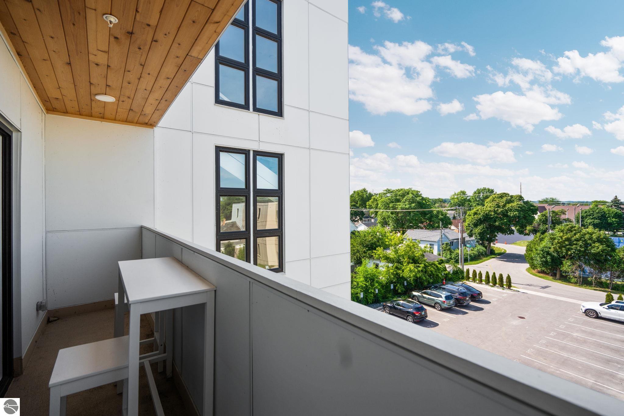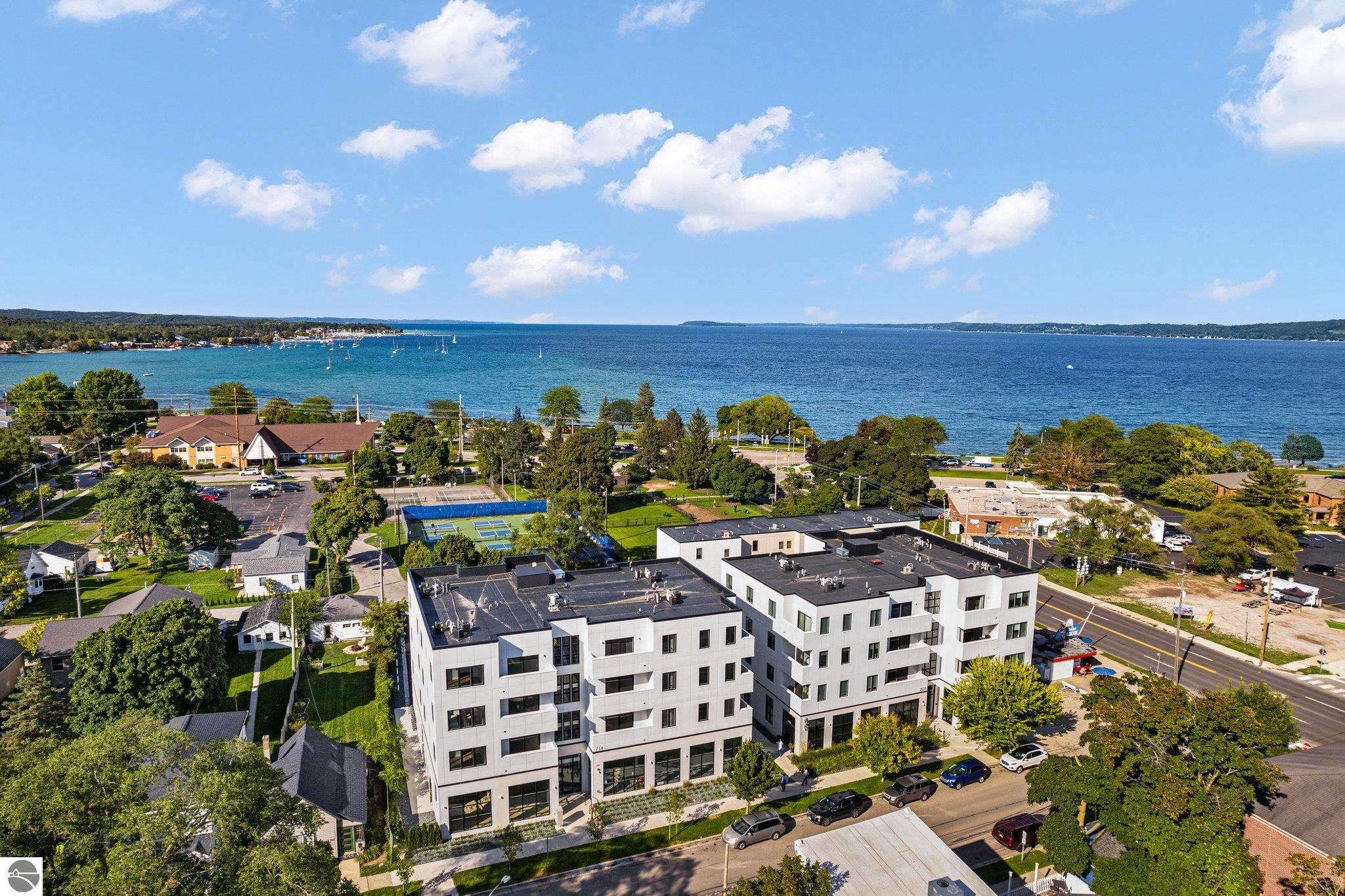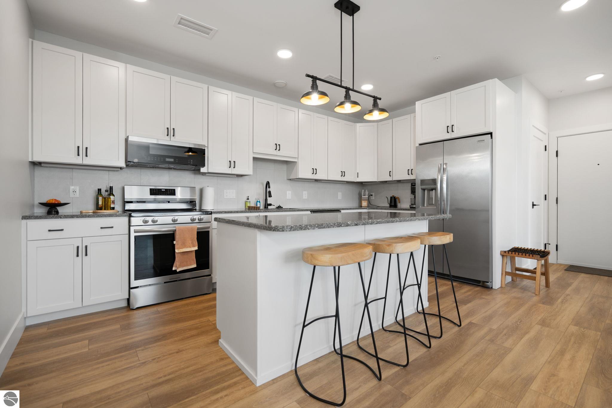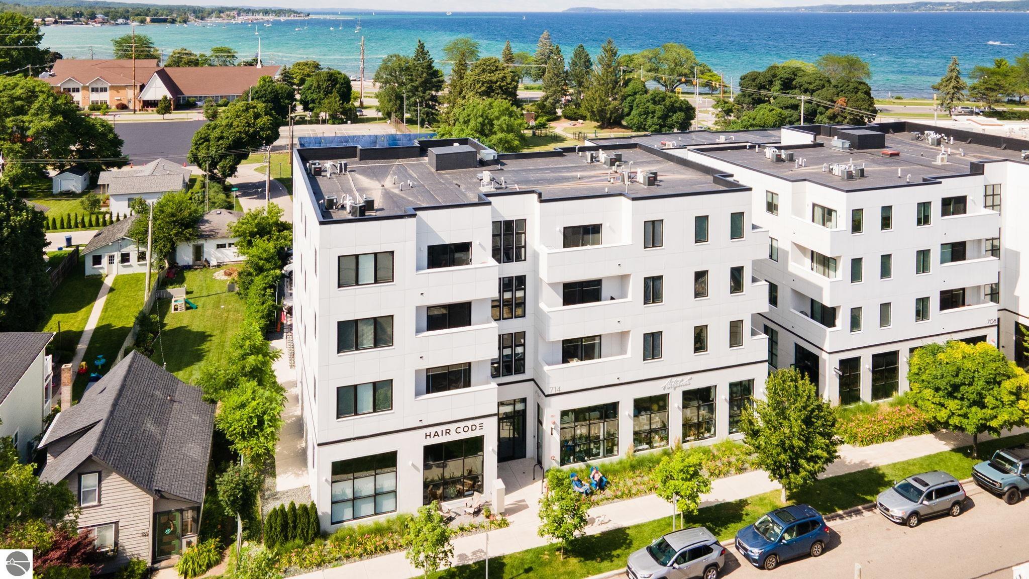 Step into easy downtown living, in the coveted Slabtown neighborhood, where West Grand Traverse Bay is just a short stroll away and the best of Traverse City is right outside your door. Completed in 2023, this 2 bed/2 bath condo pairs clean design with everyday comfort. Sunlight pours through large windows, filling the airy living space and connecting seamlessly to your private balcony, perfect for morning coffee or evening unwinding. The island kitchen is both sleek and welcoming, ideal for casual dinners or hosting friends. Retreat to the spacious primary suite with its own full bath, while an additional bedroom, hallway bath, and dedicated laundry room round out the single-level floor plan. With elevator access, a reserved parking space, a location across from the historic Sleders Tavern, and only steps from downtown dining, shopping, and waterfront fun, this condo is all about living well in the heart of TC.