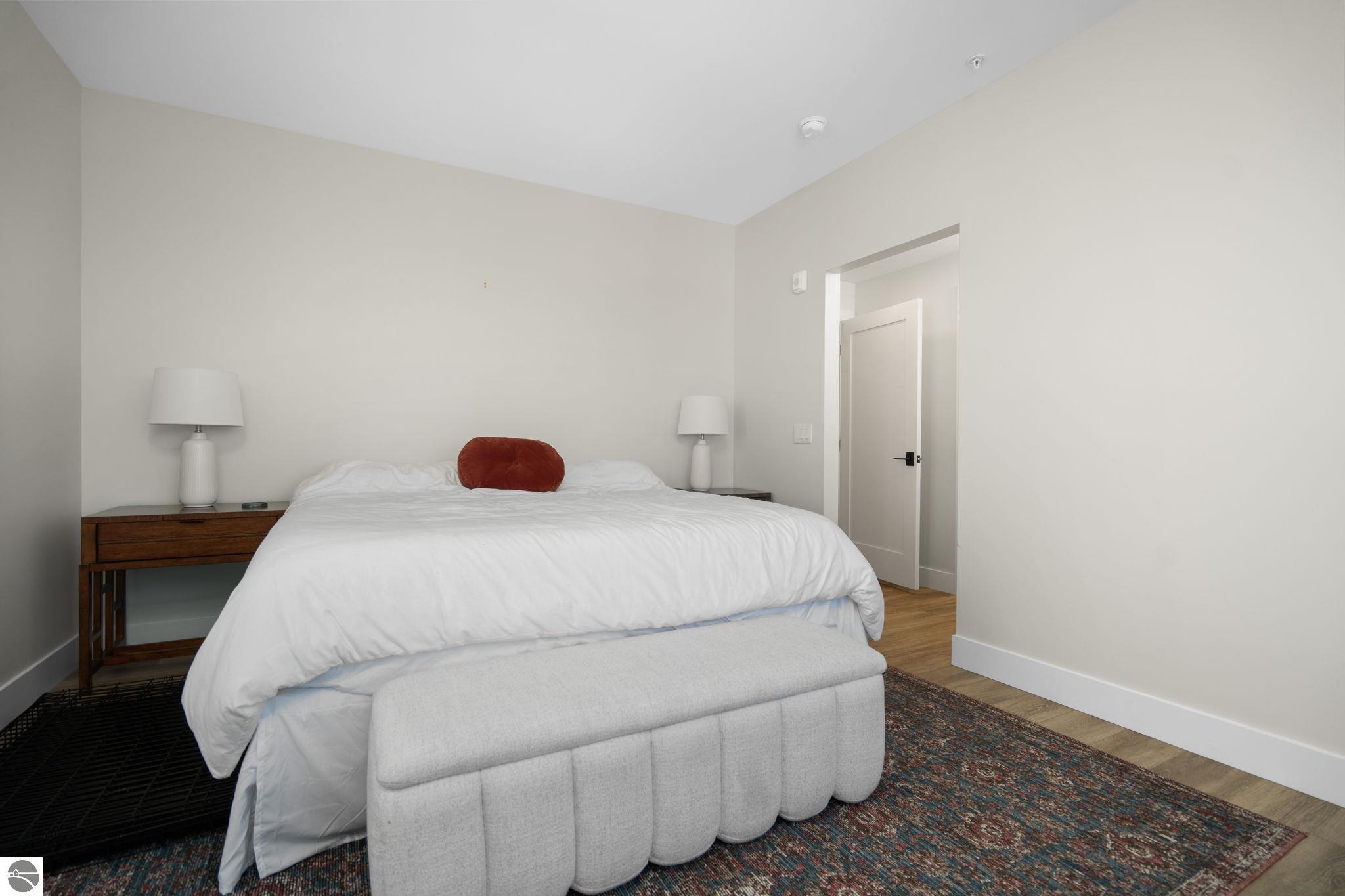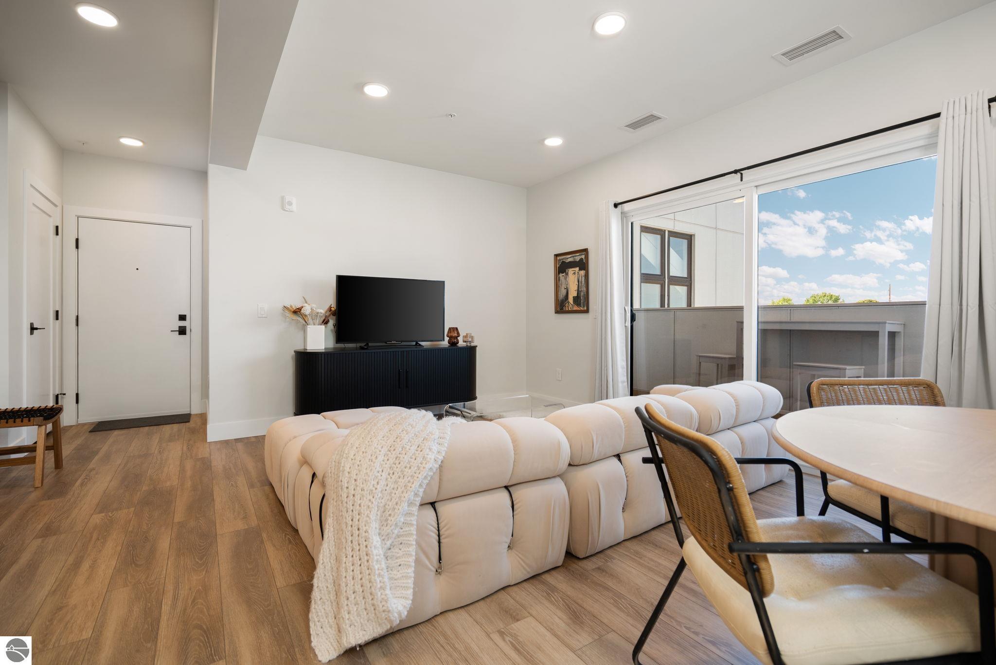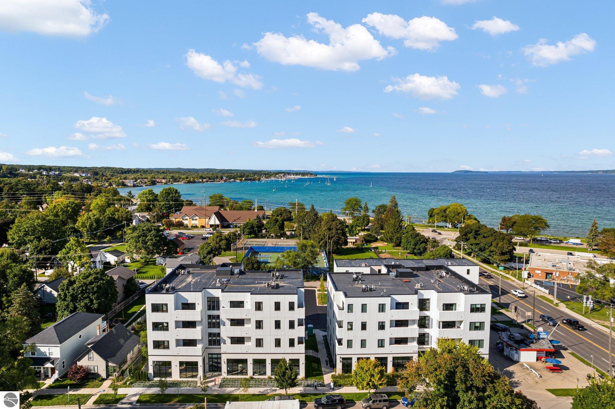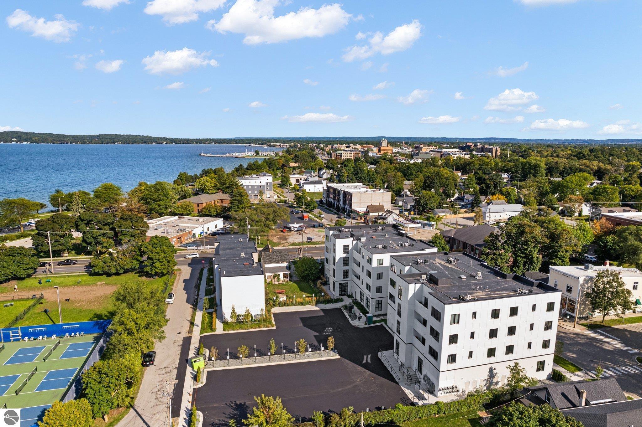 Step into easy downtown living, in the coveted Slabtown neighborhood, where West Grand Traverse Bay is just a short stroll away and the best of Traverse City is right outside your door. Completed in 2023, this 2 bed/2 bath condo pairs clean design with everyday comfort. Sunlight pours through large windows, filling the airy living space and connecting seamlessly to your private balcony, perfect for morning coffee or evening unwinding. The island kitchen is both sleek and welcoming, ideal for casual dinners or hosting friends. Retreat to the spacious primary suite with its own full bath, while an additional bedroom, hallway bath, and dedicated laundry room round out the single-level floor plan. With elevator access, a reserved parking space, a location across from the historic Sleders Tavern, and only steps from downtown dining, shopping, and waterfront fun, this condo is all about living well in the heart of TC.