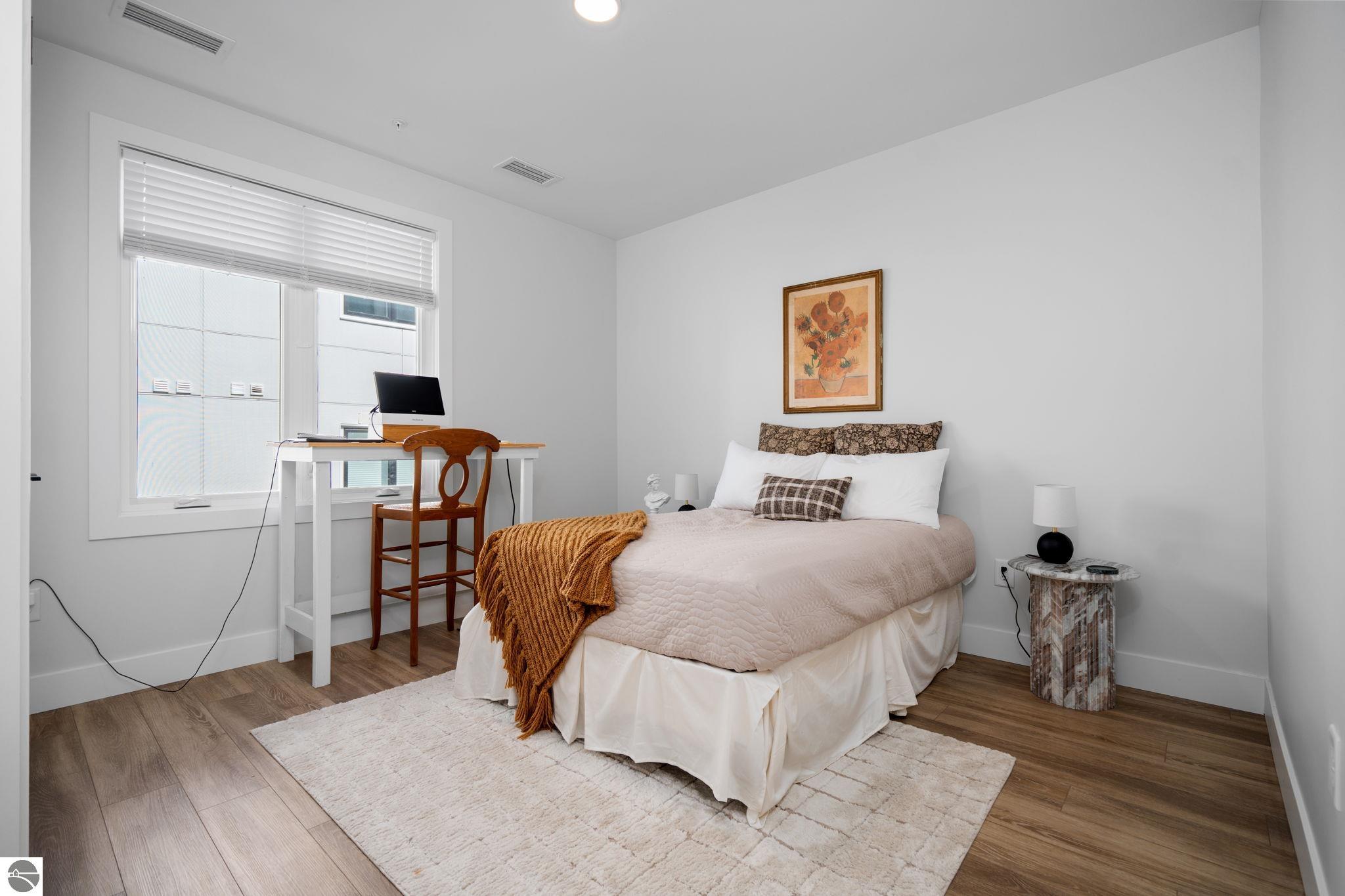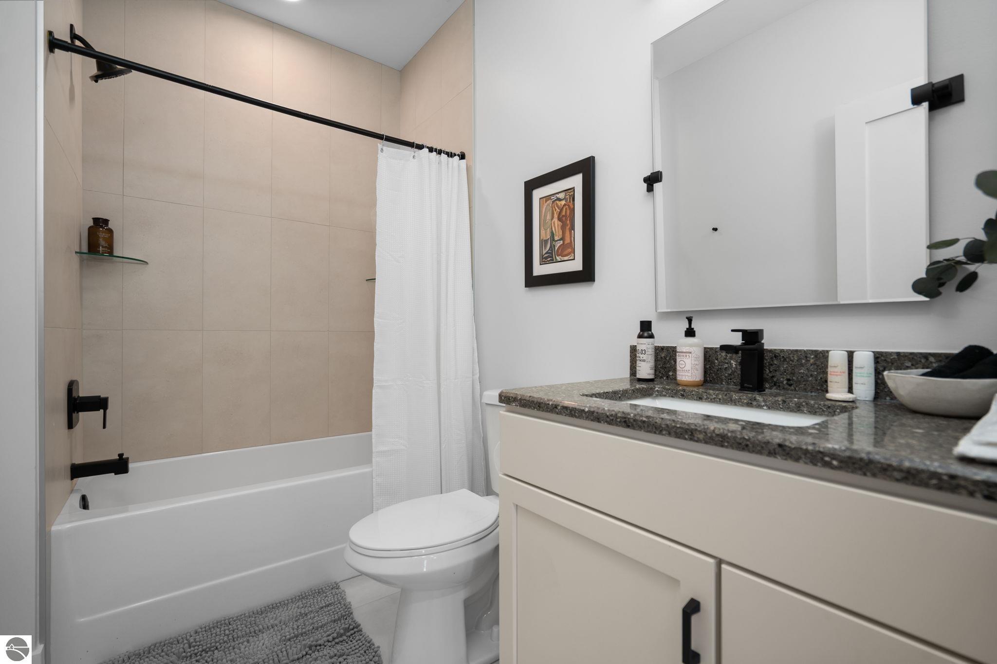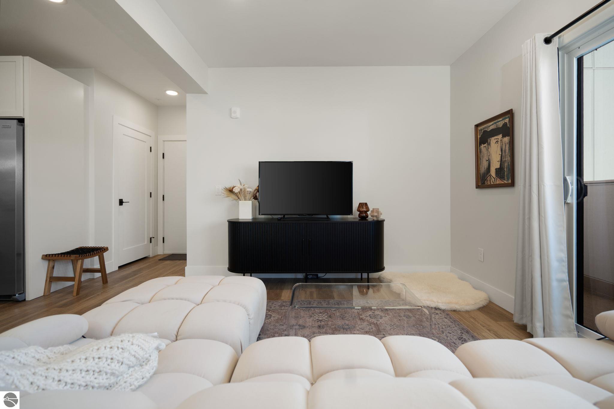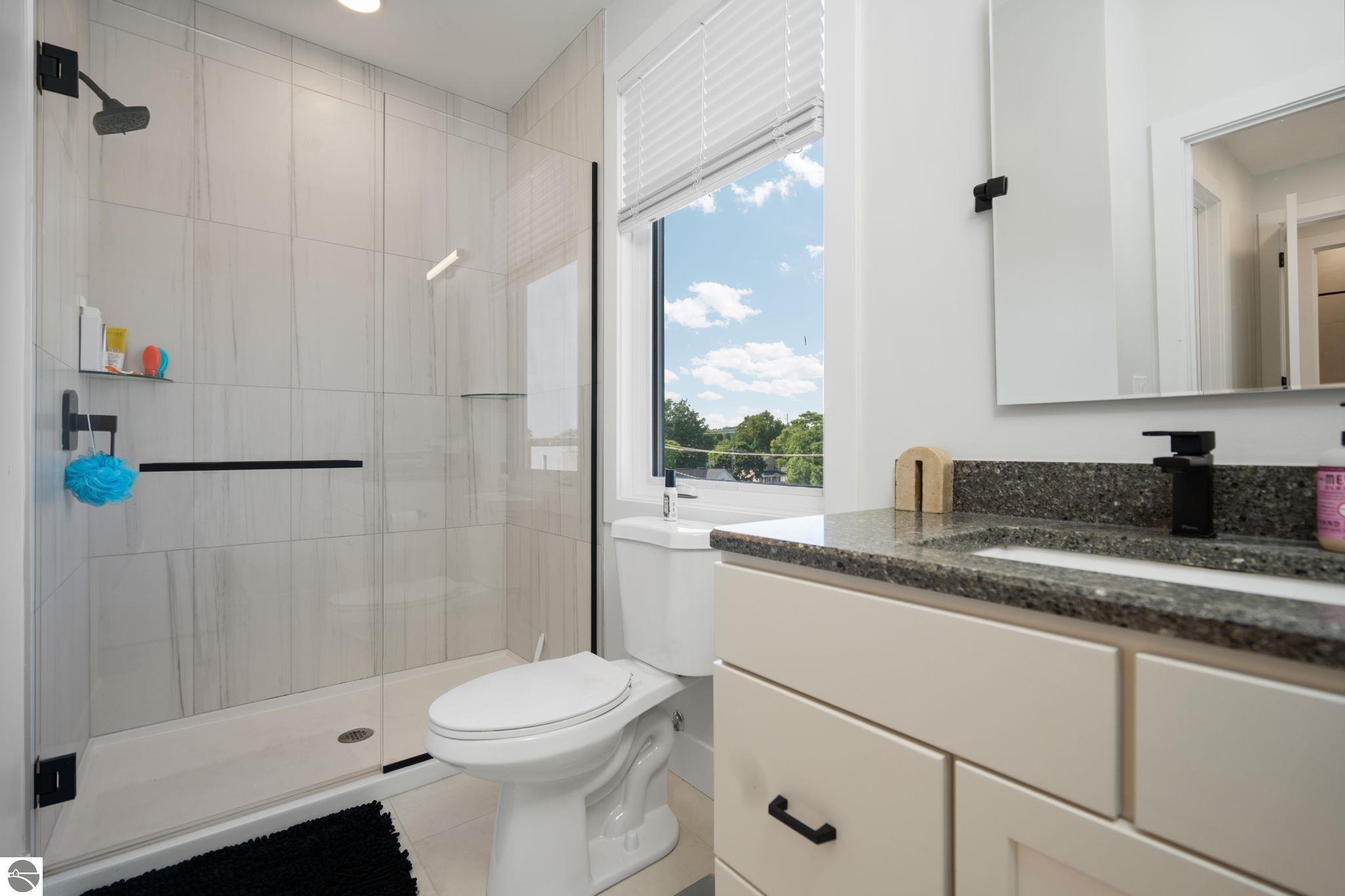 Step into easy downtown living, in the coveted Slabtown neighborhood, where West Grand Traverse Bay is just a short stroll away and the best of Traverse City is right outside your door. Completed in 2023, this 2 bed/2 bath condo pairs clean design with everyday comfort. Sunlight pours through large windows, filling the airy living space and connecting seamlessly to your private balcony, perfect for morning coffee or evening unwinding. The island kitchen is both sleek and welcoming, ideal for casual dinners or hosting friends. Retreat to the spacious primary suite with its own full bath, while an additional bedroom, hallway bath, and dedicated laundry room round out the single-level floor plan. With elevator access, a reserved parking space, a location across from the historic Sleders Tavern, and only steps from downtown dining, shopping, and waterfront fun, this condo is all about living well in the heart of TC.