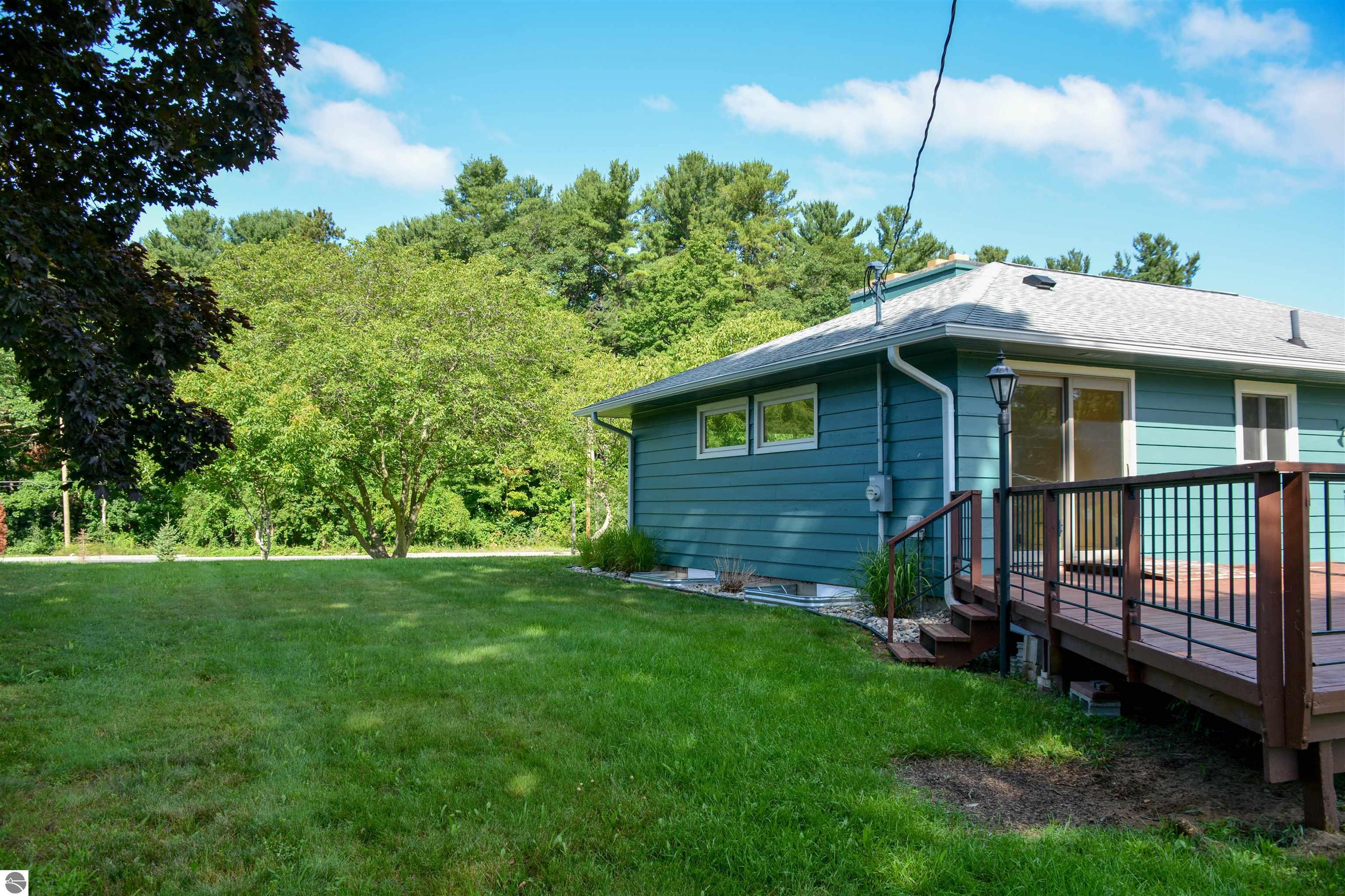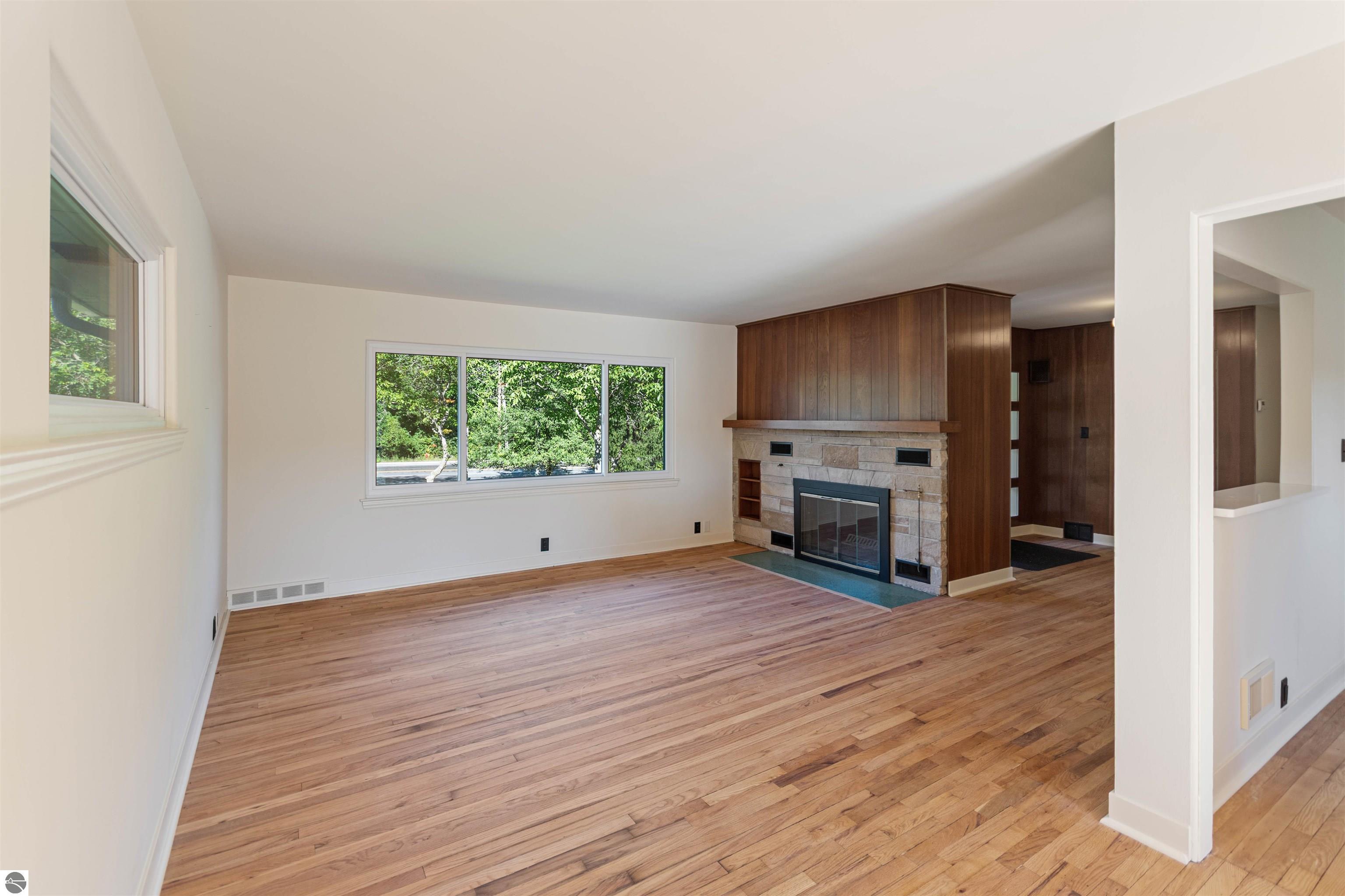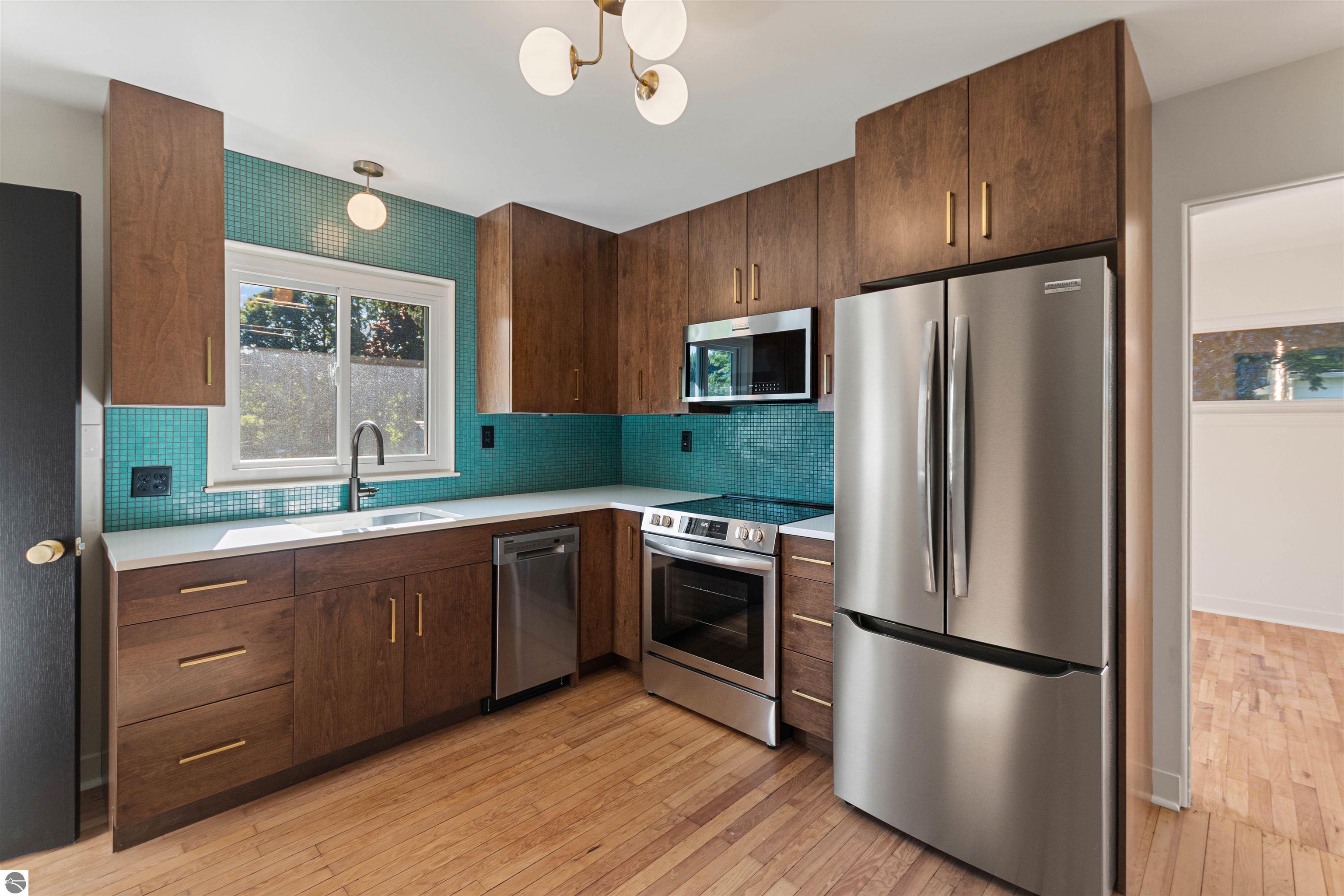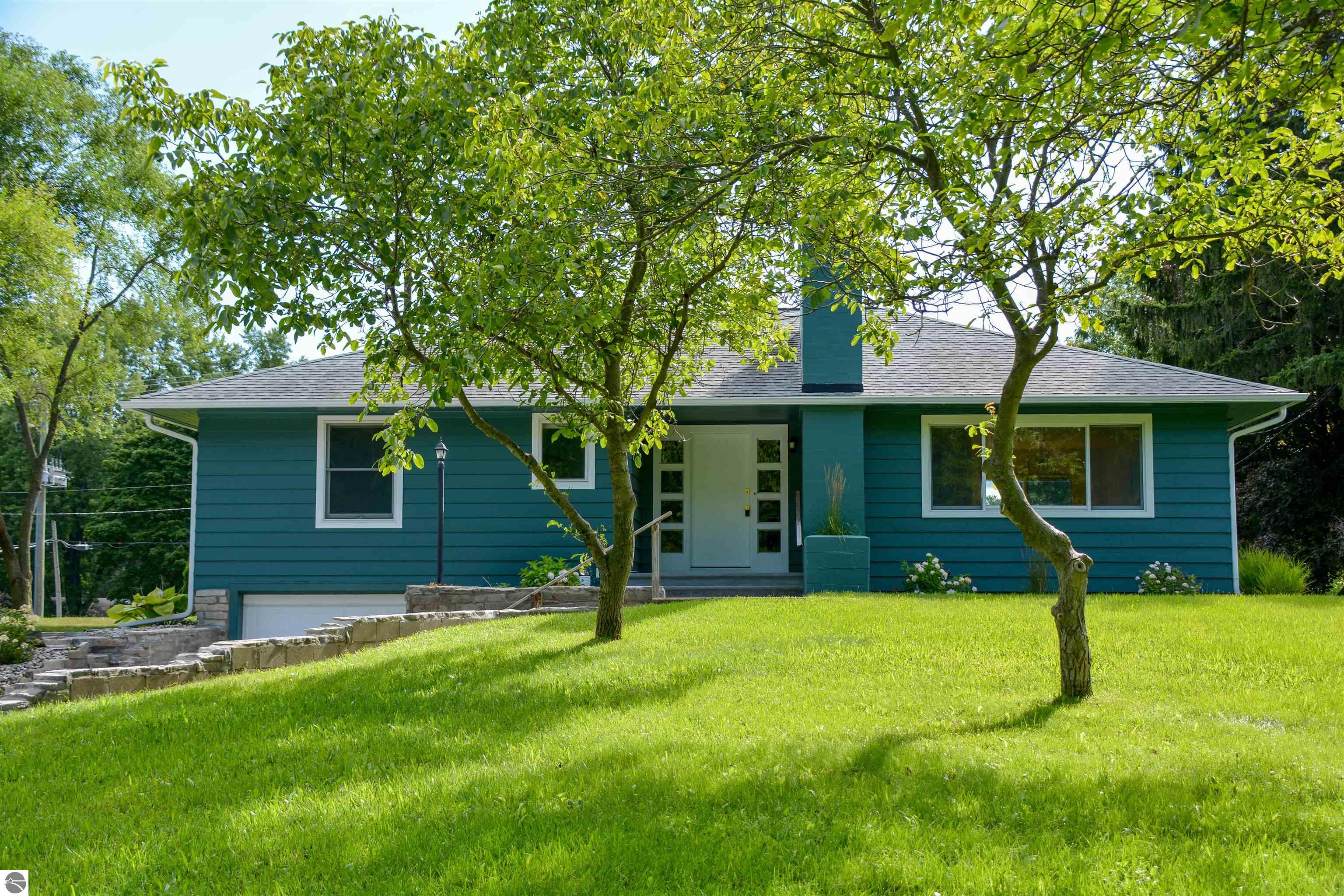 Welcome to this captivating mid-century modern, ranch style home nestled at the base of Old Mission Peninsula in the heart of Traverse City, Michigan. Situated in a highly sought-after and well established neighborhood, this meticulously refurbished residence offers the perfect blend of classic charm and modern amenities. The property's prime location places you just moments away from both the serene waters of East and West Grand Traverse Bays. The convenient setting also provides easy walking and biking access to several key destinations, including the prestigious Northwestern Michigan College, Central High School, the recreational haven of Clancy Park, and all the vibrant attractions of downtown Traverse City. The home's centerpiece is an exquisite mid-century, wood-burning stone fireplace that serves as both a stunning architectural feature and a cozy gathering spot, infusing the living space with warmth and sophisticated elegance. The expansive westerly facing picture window stands as another lovely design element, flooding the interior with natural light throughout the day. The property has been thoughtfully updated with brand new appliances, modern fixtures, contemporary cabinets, and completely renovated bathrooms, all completed in 2024. The main level showcases original oak flooring, adding timeless beauty to the space. The lower level offers generous proportions, featuring a versatile large bedroom or family room, a laundry area, bathroom, and extensive storage solutions. Step through to the outdoor living space, where a sun-drenched deck provides the perfect setting for hosting gatherings or savoring peaceful moments with your morning coffee. The exterior is enhanced by an impressive stone retaining wall and expansive yard space with underground irrigation. The home's desirable end of cul-de-sac position offers ample parking space for residents & guests. Click on virtual tour for an incredibly realistic view of the interior