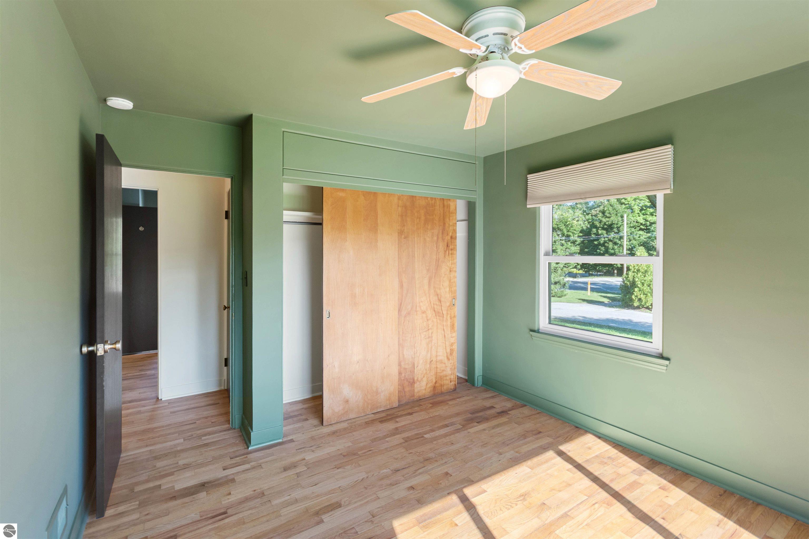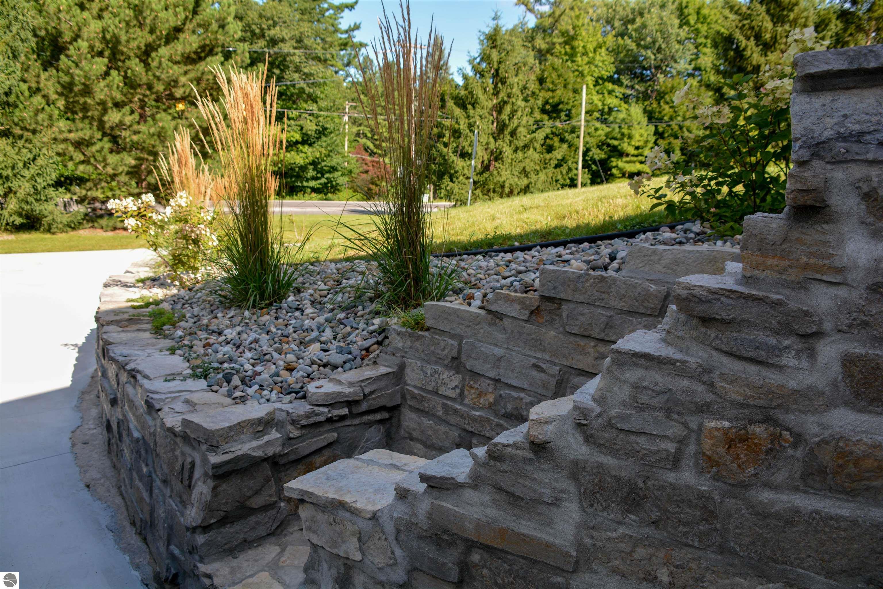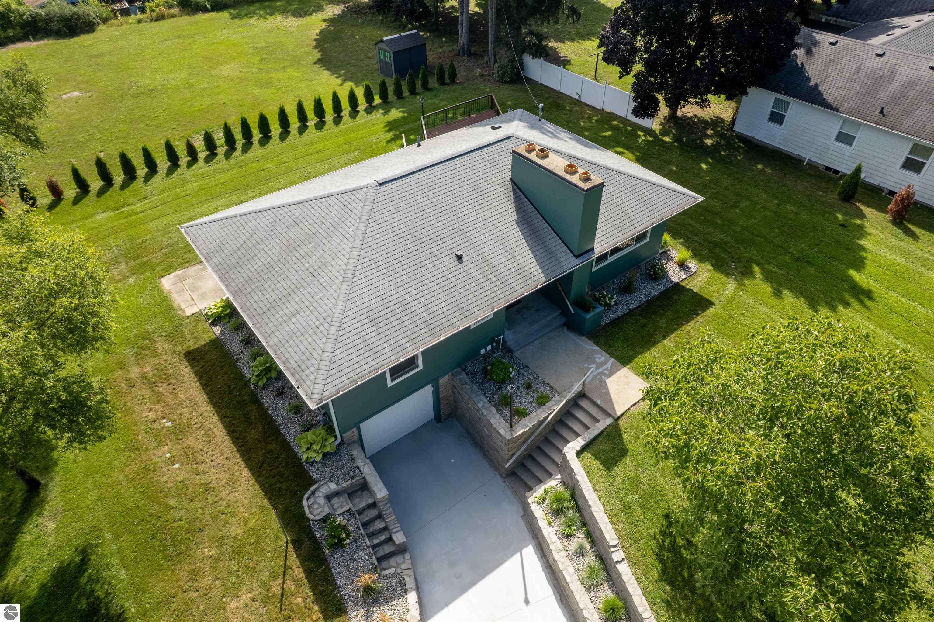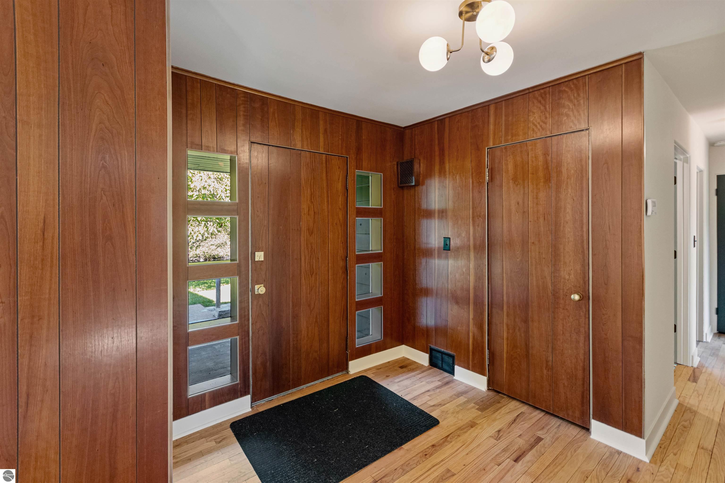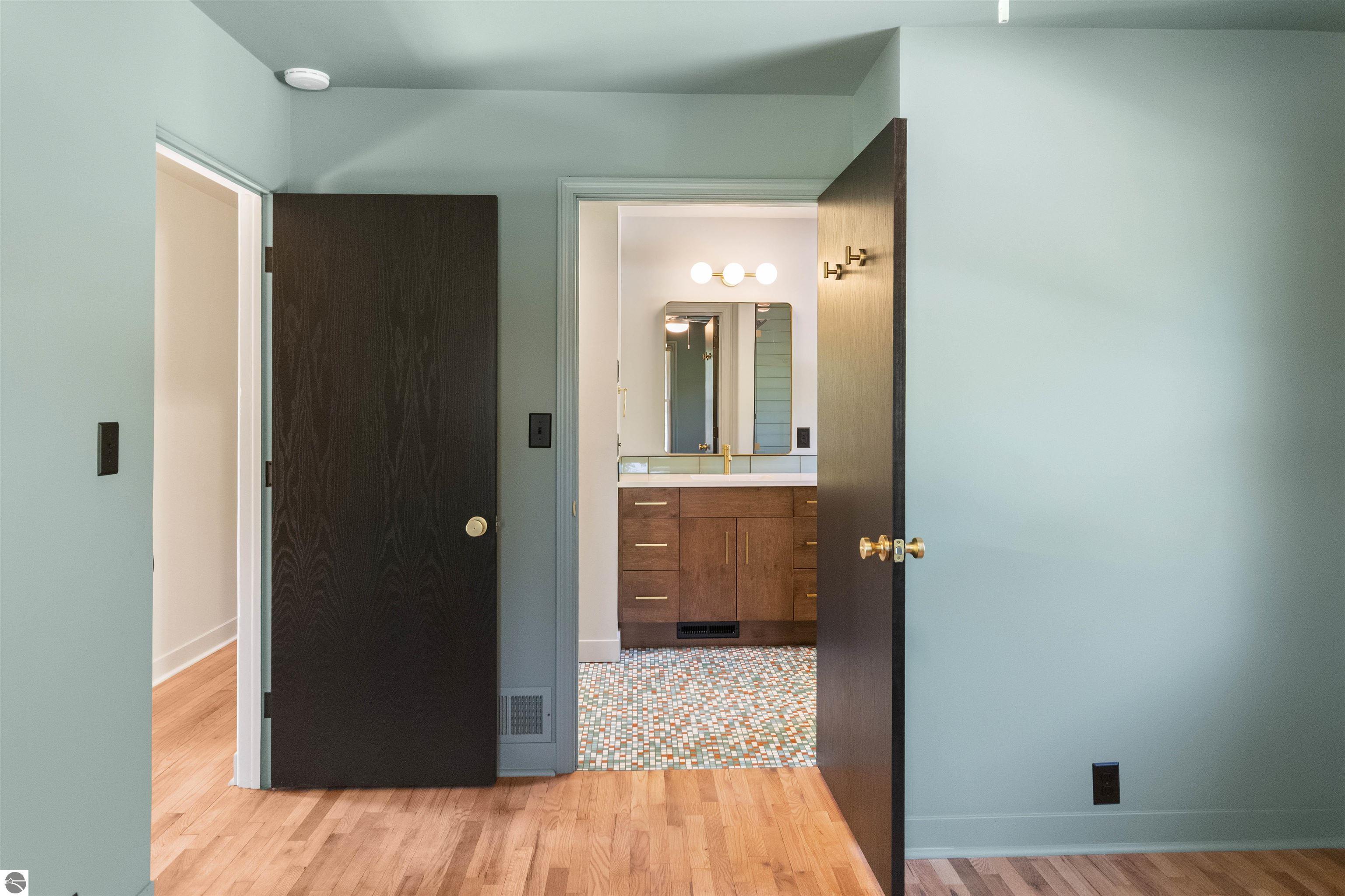 Welcome to this captivating mid-century modern, ranch style home nestled at the base of Old Mission Peninsula in the heart of Traverse City, Michigan. Situated in a highly sought-after and well established neighborhood, this meticulously refurbished residence offers the perfect blend of classic charm and modern amenities. The property's prime location places you just moments away from both the serene waters of East and West Grand Traverse Bays. The convenient setting also provides easy walking and biking access to several key destinations, including the prestigious Northwestern Michigan College, Central High School, the recreational haven of Clancy Park, and all the vibrant attractions of downtown Traverse City. The home's centerpiece is an exquisite mid-century, wood-burning stone fireplace that serves as both a stunning architectural feature and a cozy gathering spot, infusing the living space with warmth and sophisticated elegance. The expansive westerly facing picture window stands as another lovely design element, flooding the interior with natural light throughout the day. The property has been thoughtfully updated with brand new appliances, modern fixtures, contemporary cabinets, and completely renovated bathrooms, all completed in 2024. The main level showcases original oak flooring, adding timeless beauty to the space. The lower level offers generous proportions, featuring a versatile large bedroom or family room, a laundry area, bathroom, and extensive storage solutions. Step through to the outdoor living space, where a sun-drenched deck provides the perfect setting for hosting gatherings or savoring peaceful moments with your morning coffee. The exterior is enhanced by an impressive stone retaining wall and expansive yard space with underground irrigation. The home's desirable end of cul-de-sac position offers ample parking space for residents & guests. Click on virtual tour for an incredibly realistic view of the interior