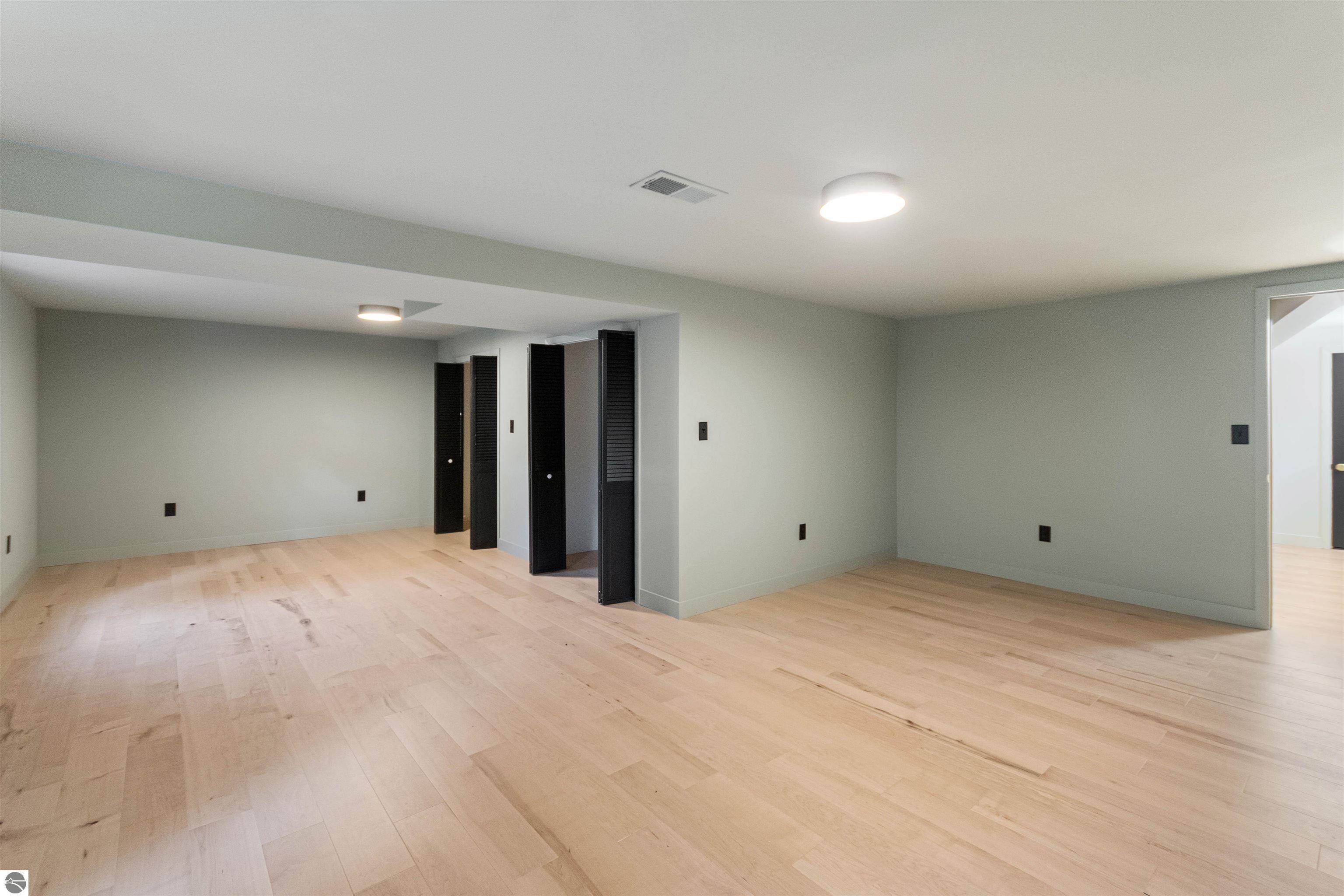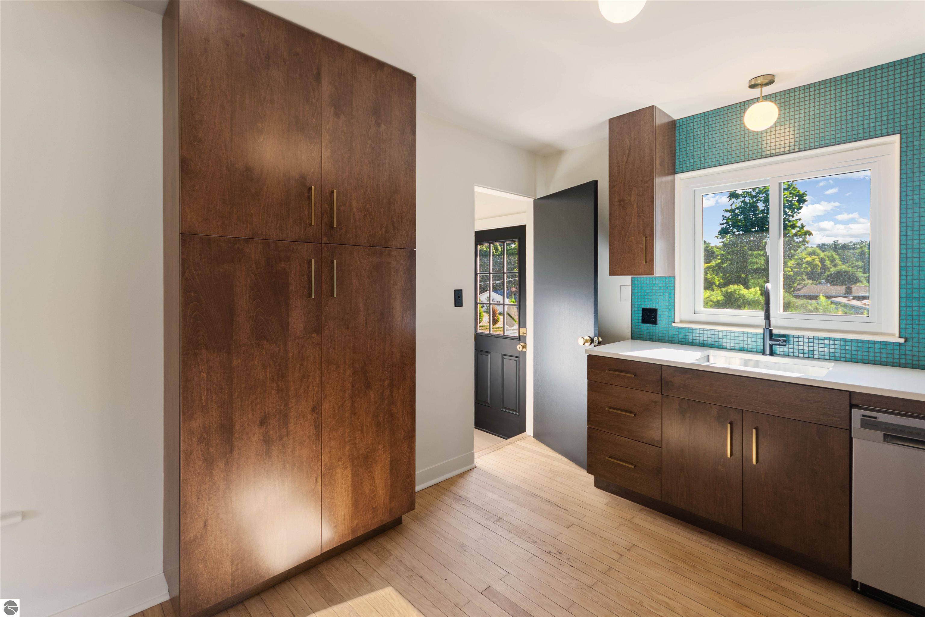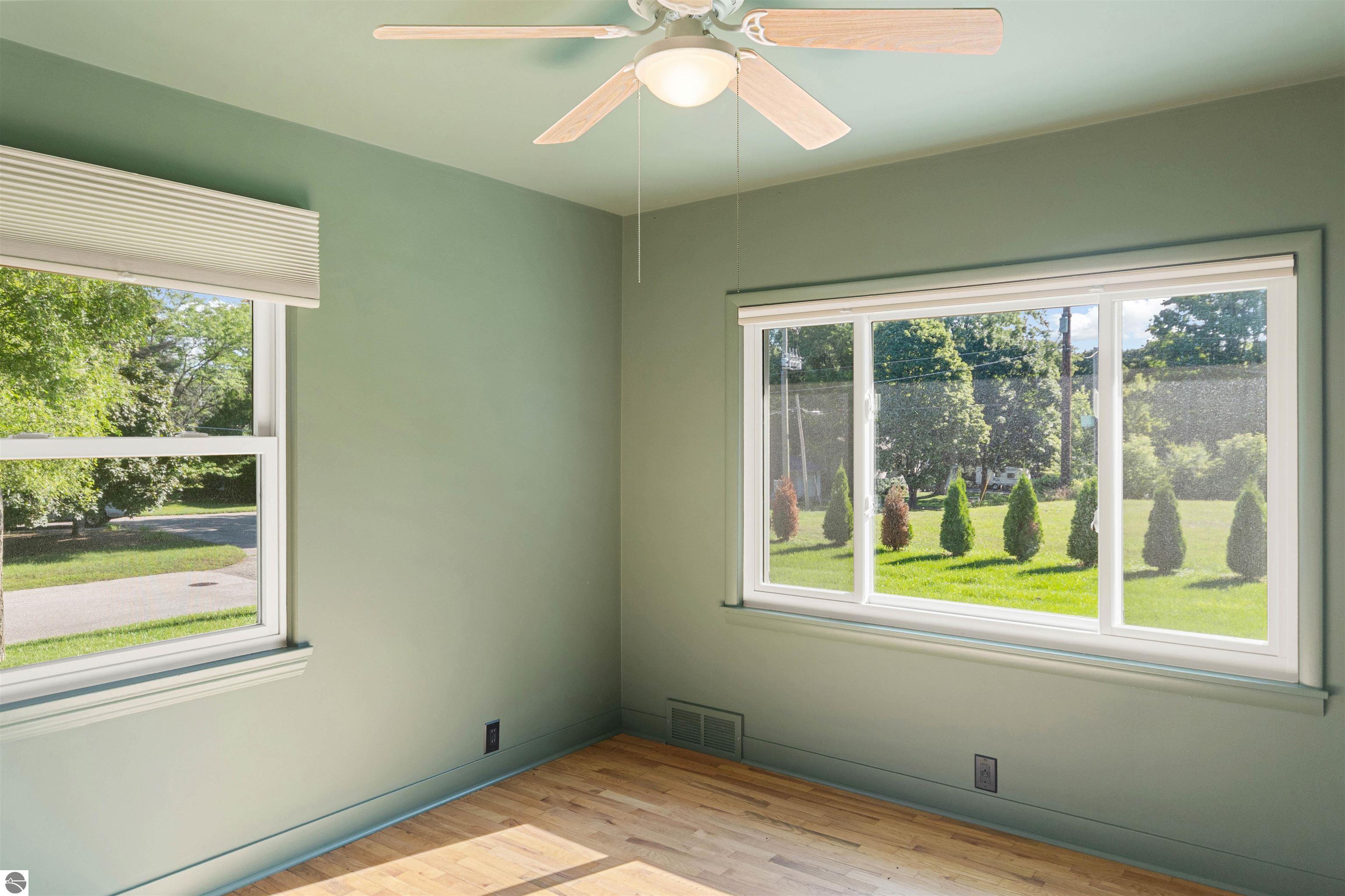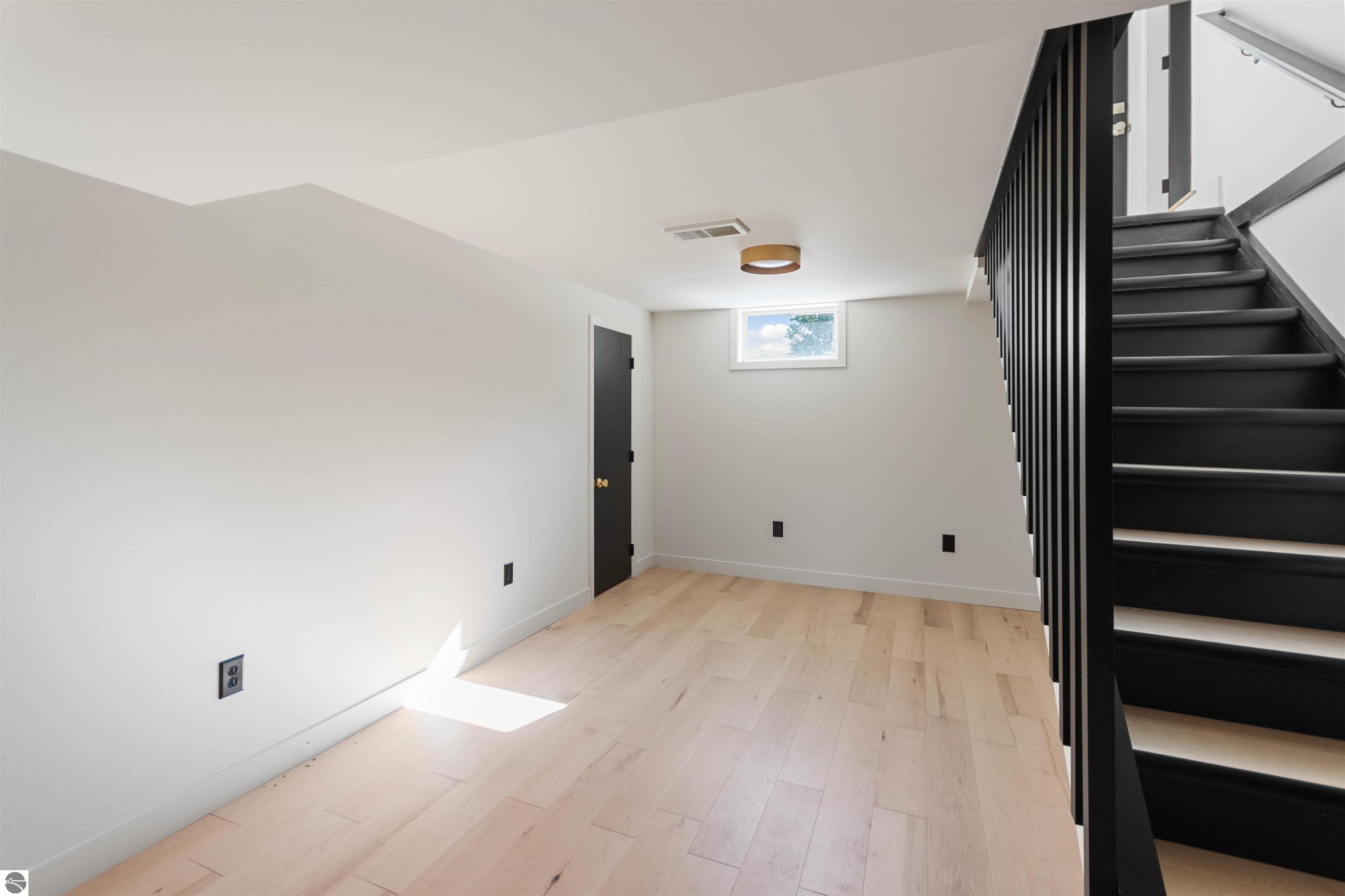 Welcome to this captivating mid-century modern, ranch style home nestled at the base of Old Mission Peninsula in the heart of Traverse City, Michigan. Situated in a highly sought-after and well established neighborhood, this meticulously refurbished residence offers the perfect blend of classic charm and modern amenities. The property's prime location places you just moments away from both the serene waters of East and West Grand Traverse Bays. The convenient setting also provides easy walking and biking access to several key destinations, including the prestigious Northwestern Michigan College, Central High School, the recreational haven of Clancy Park, and all the vibrant attractions of downtown Traverse City. The home's centerpiece is an exquisite mid-century, wood-burning stone fireplace that serves as both a stunning architectural feature and a cozy gathering spot, infusing the living space with warmth and sophisticated elegance. The expansive westerly facing picture window stands as another lovely design element, flooding the interior with natural light throughout the day. The property has been thoughtfully updated with brand new appliances, modern fixtures, contemporary cabinets, and completely renovated bathrooms, all completed in 2024. The main level showcases original oak flooring, adding timeless beauty to the space. The lower level offers generous proportions, featuring a versatile large bedroom or family room, a laundry area, bathroom, and extensive storage solutions. Step through to the outdoor living space, where a sun-drenched deck provides the perfect setting for hosting gatherings or savoring peaceful moments with your morning coffee. The exterior is enhanced by an impressive stone retaining wall and expansive yard space with underground irrigation. The home's desirable end of cul-de-sac position offers ample parking space for residents & guests. Click on virtual tour for an incredibly realistic view of the interior