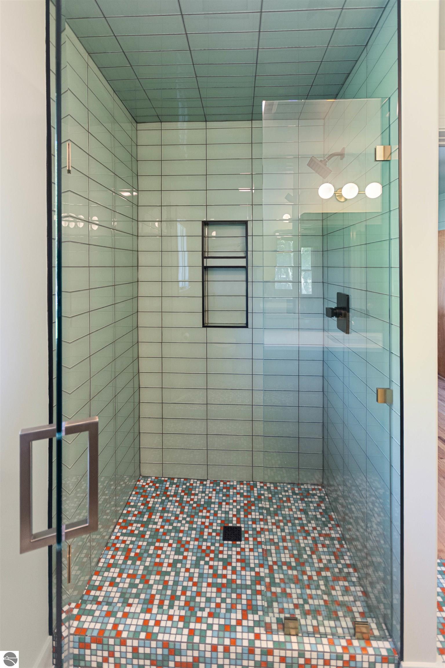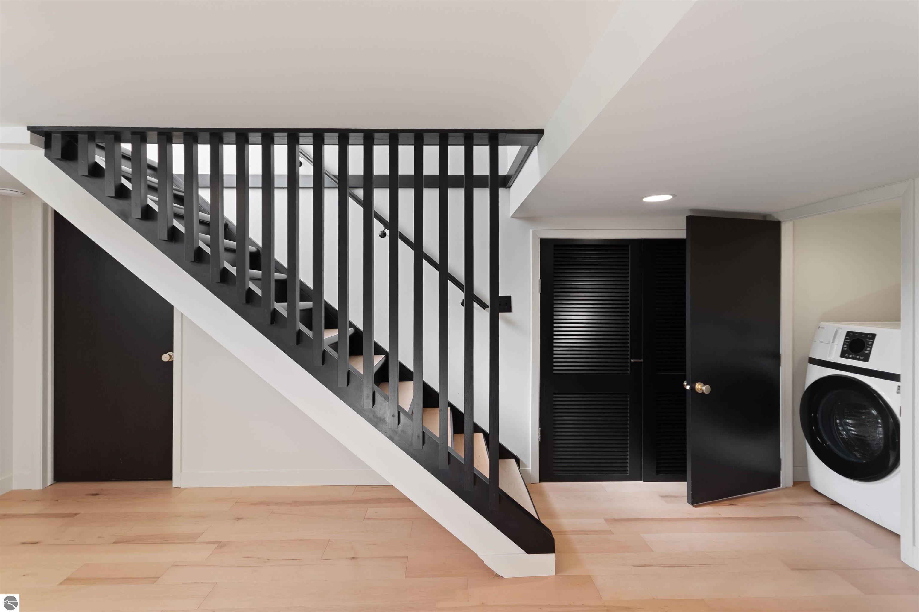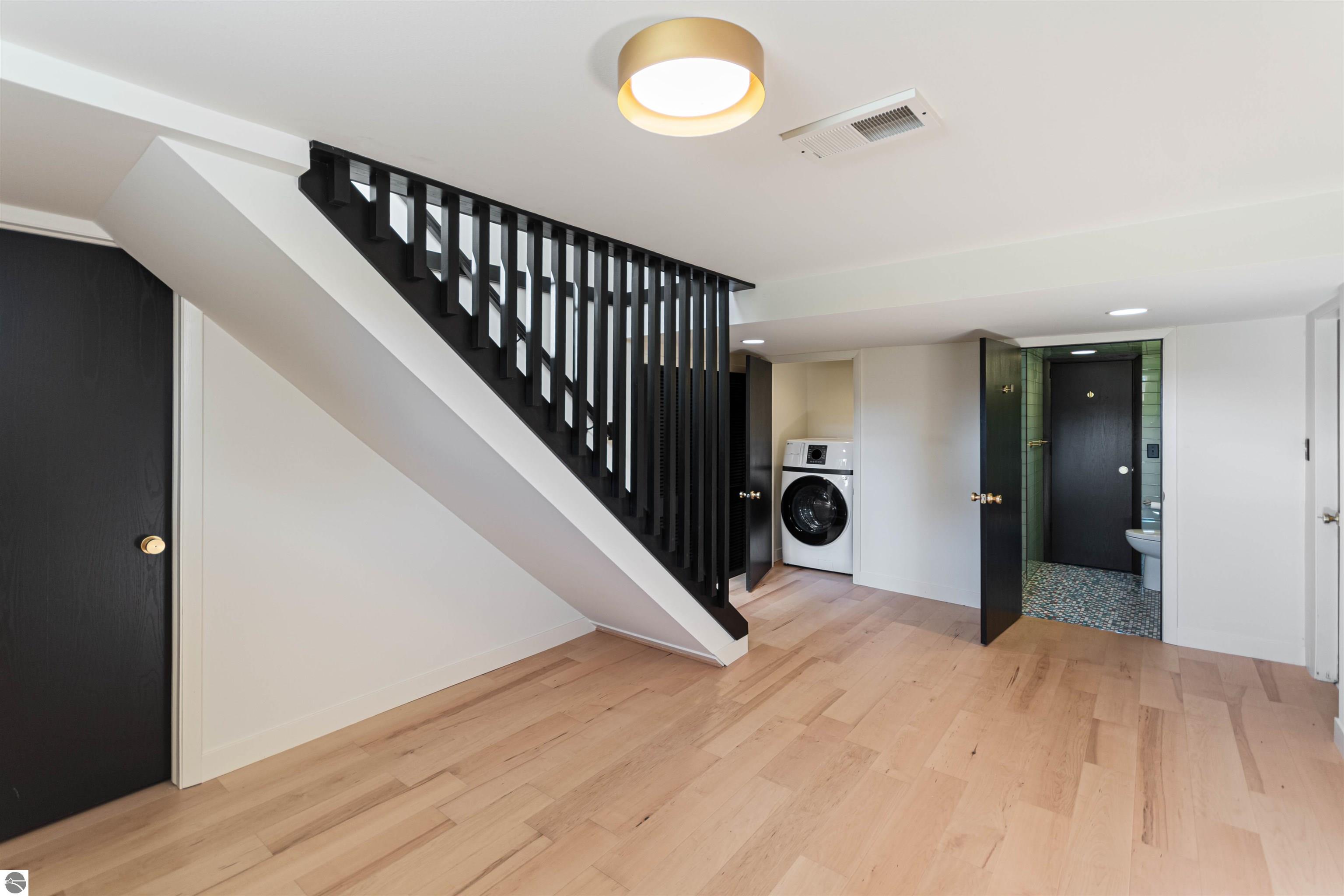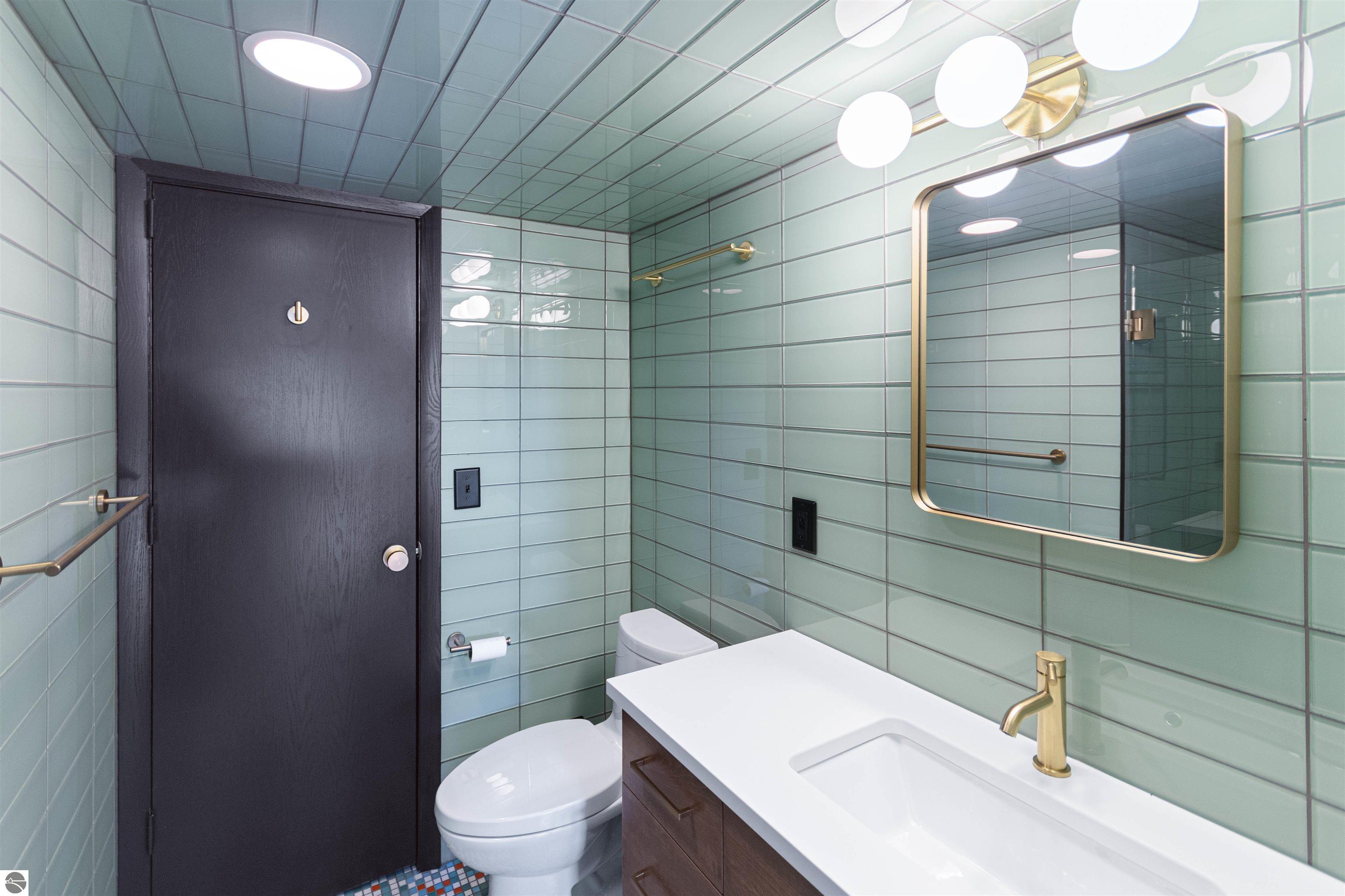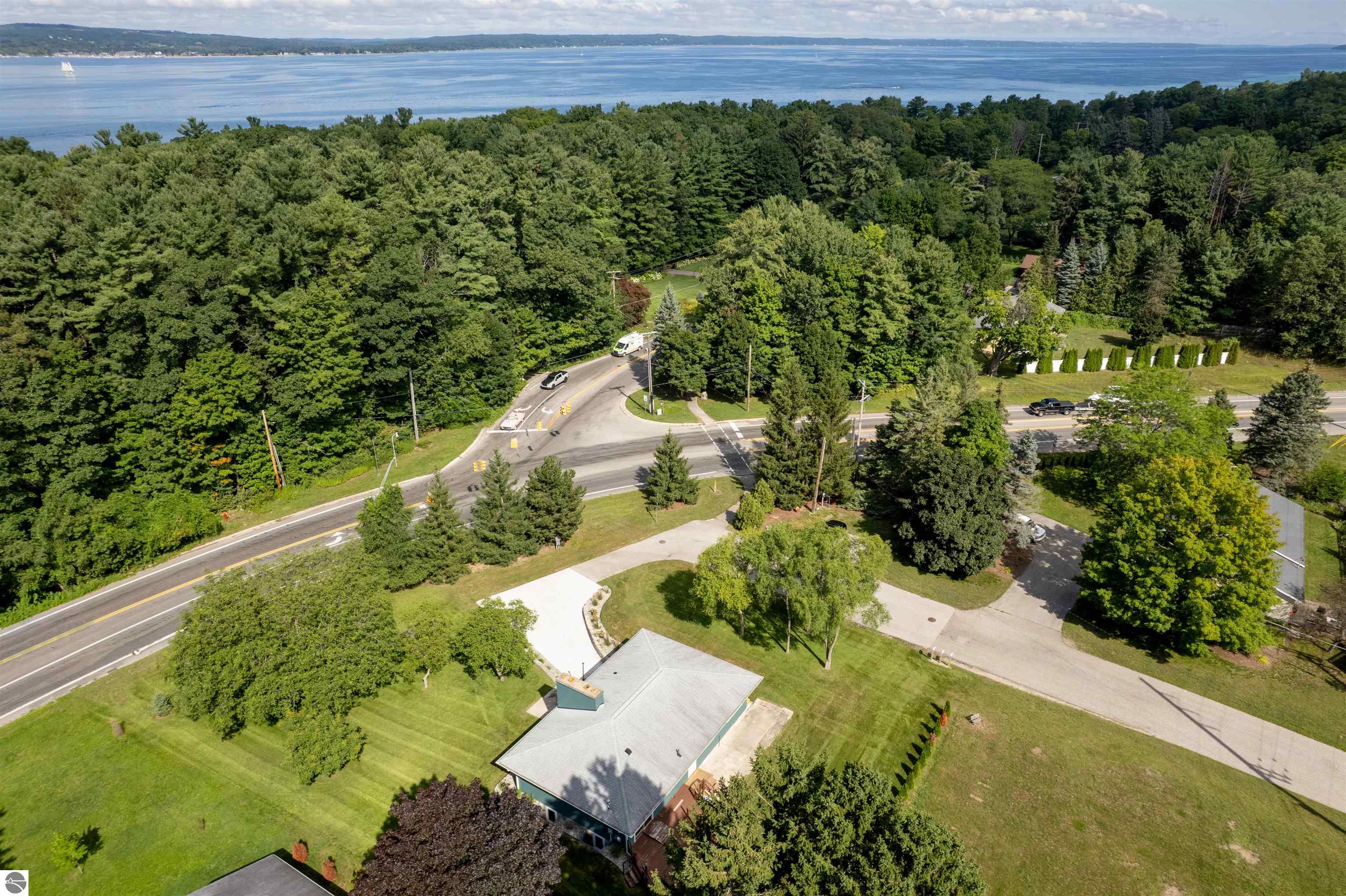 Welcome to this captivating mid-century modern, ranch style home nestled at the base of Old Mission Peninsula in the heart of Traverse City, Michigan. Situated in a highly sought-after and well established neighborhood, this meticulously refurbished residence offers the perfect blend of classic charm and modern amenities. The property's prime location places you just moments away from both the serene waters of East and West Grand Traverse Bays. The convenient setting also provides easy walking and biking access to several key destinations, including the prestigious Northwestern Michigan College, Central High School, the recreational haven of Clancy Park, and all the vibrant attractions of downtown Traverse City. The home's centerpiece is an exquisite mid-century, wood-burning stone fireplace that serves as both a stunning architectural feature and a cozy gathering spot, infusing the living space with warmth and sophisticated elegance. The expansive westerly facing picture window stands as another lovely design element, flooding the interior with natural light throughout the day. The property has been thoughtfully updated with brand new appliances, modern fixtures, contemporary cabinets, and completely renovated bathrooms, all completed in 2024. The main level showcases original oak flooring, adding timeless beauty to the space. The lower level offers generous proportions, featuring a versatile large bedroom or family room, a laundry area, bathroom, and extensive storage solutions. Step through to the outdoor living space, where a sun-drenched deck provides the perfect setting for hosting gatherings or savoring peaceful moments with your morning coffee. The exterior is enhanced by an impressive stone retaining wall and expansive yard space with underground irrigation. The home's desirable end of cul-de-sac position offers ample parking space for residents & guests. Click on virtual tour for an incredibly realistic view of the interior