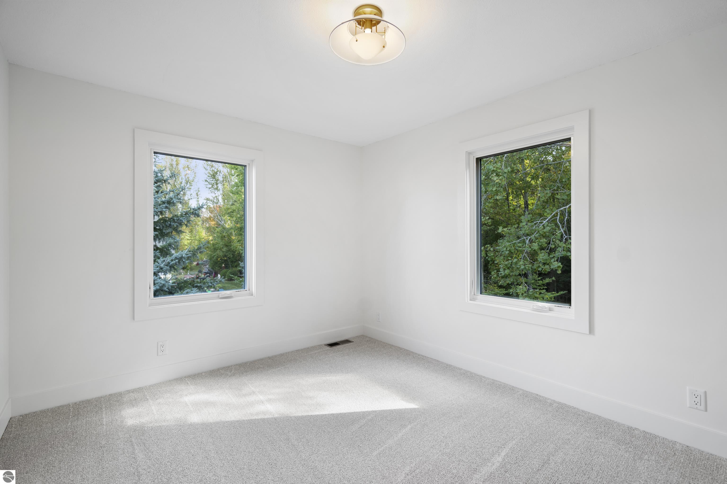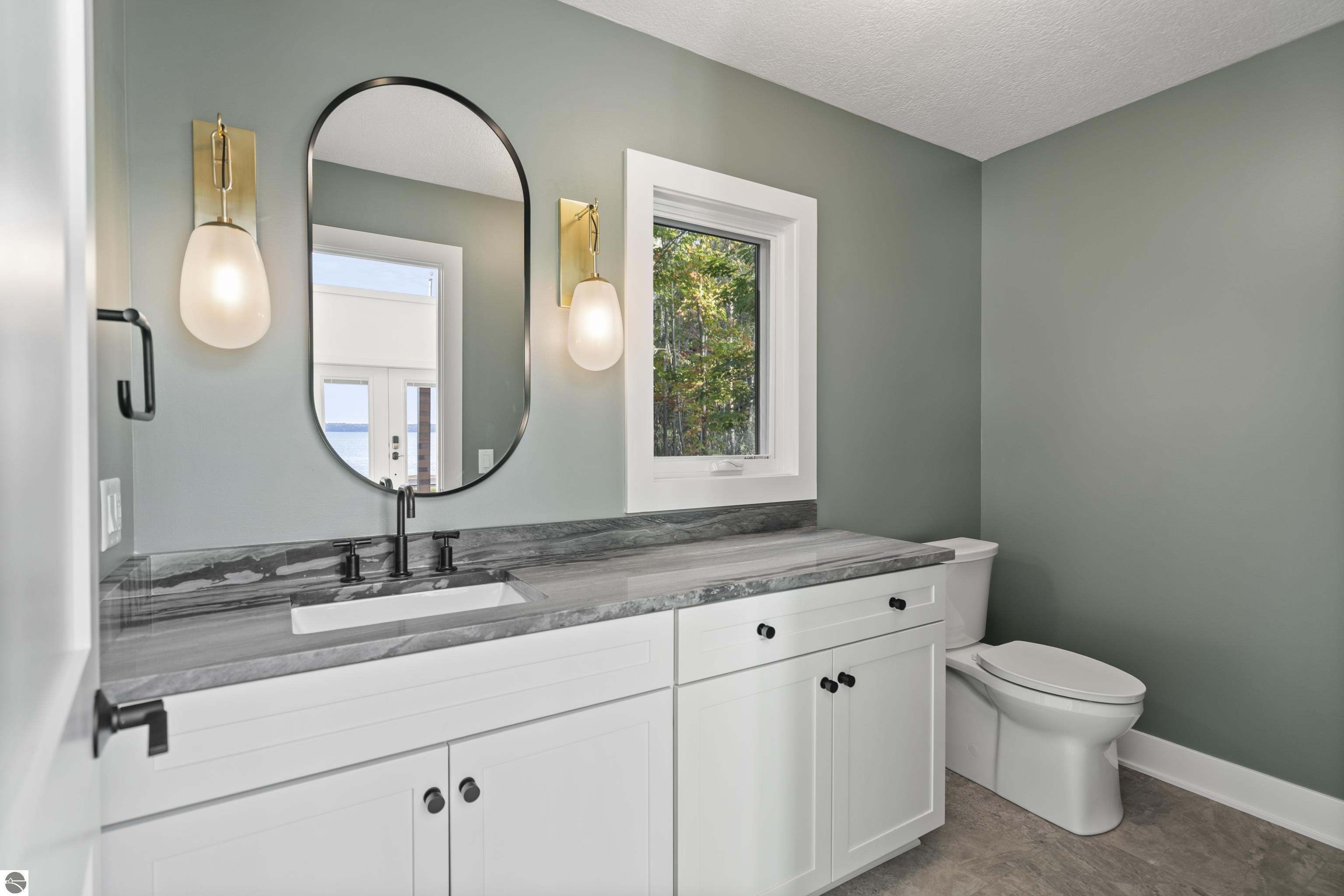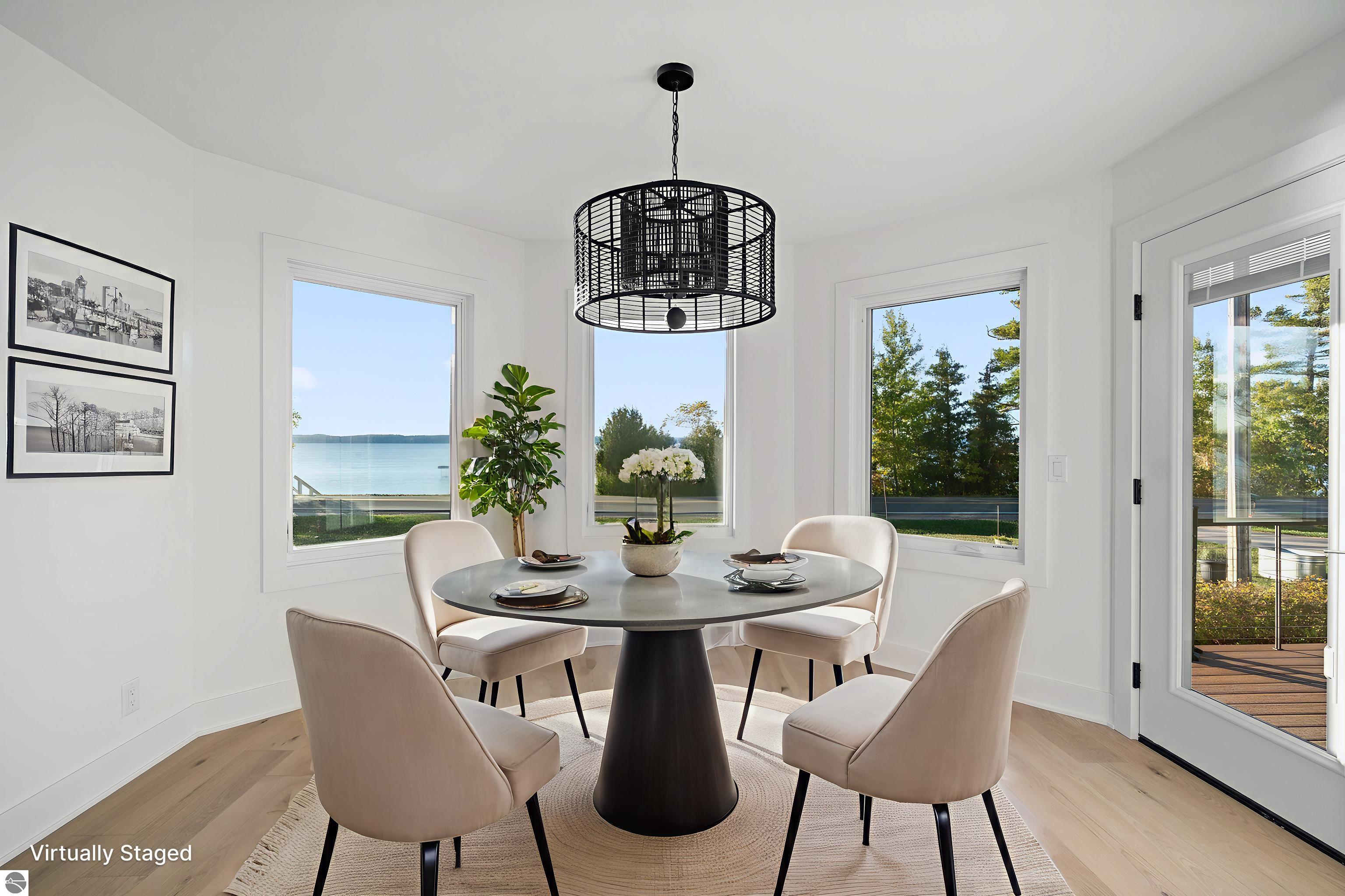 Views of West Bay from every room on the front of the house! Contemporary on Old Mission! The bay sparkles are endlessly beautiful on your extra-wide 109' private beach. And then... your first step into the home is right into the coolest foyer entry in TC! It's a masterpiece featuring a 15 ft. chandelier, which perfectly ignites the beauty from outside, while warming the interior with soft light. The staircase itself is magazine-worthy, with its handmade maple wood treads that will have LED lighting & custom-welded bannister once complete. Everything is new in this renovated home featuring 4 bedrooms, 3.5 baths & a spa-like master bedroom suite with heated floors & a soaking tub overlooking the bay. Top-quality metal roof and siding mean low maintenance for easy living. The second-floor media room is wired for surround sound, has a wet bar, shiplap wall cover, and large easterly facing windows. The room has a balcony overlooking West Bay accessible by 3 walkout sliders, while the third-story bedrooms also feature walk-out balconies, all overlooking beautiful West Bay. All the sights, sounds, and feels are here!