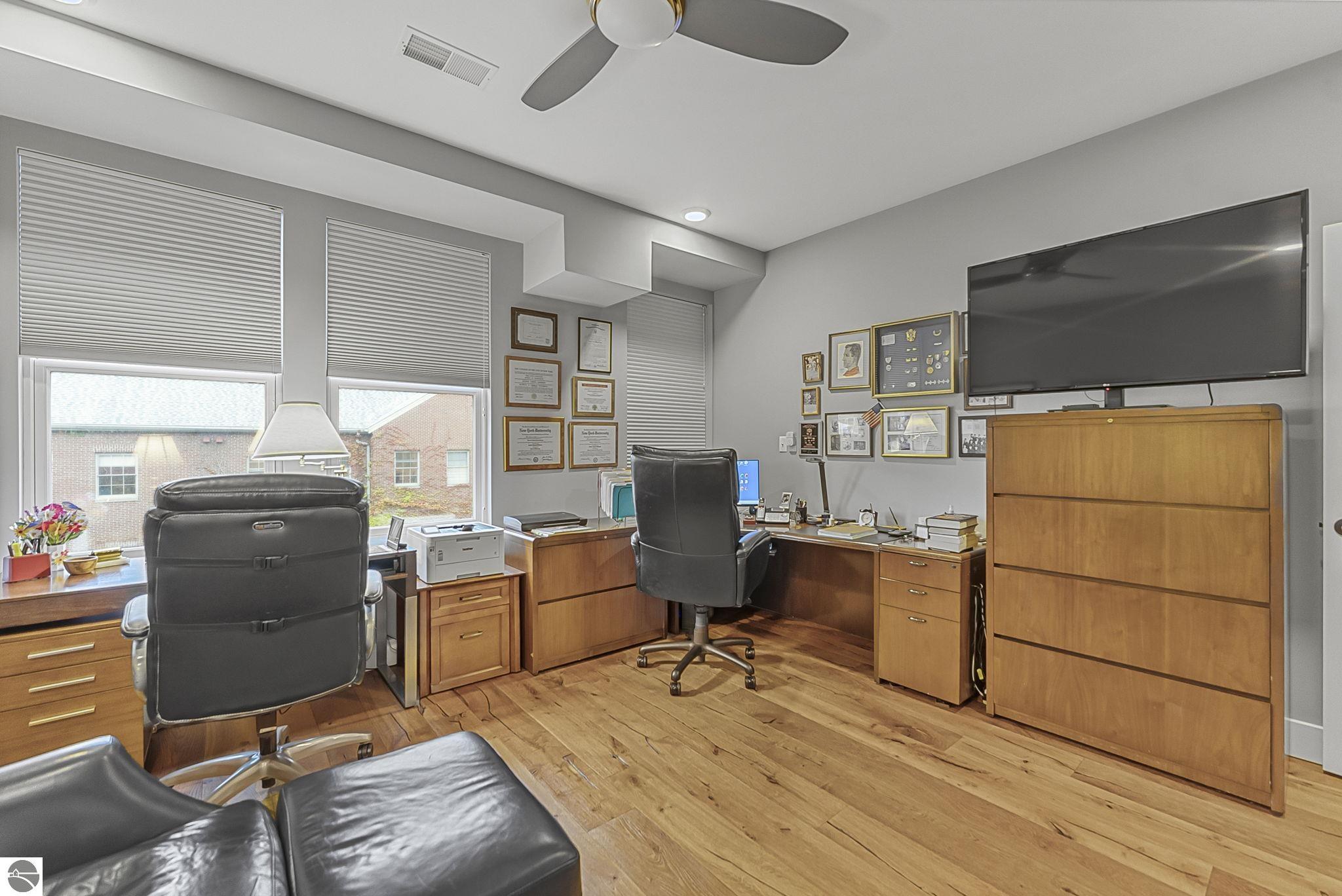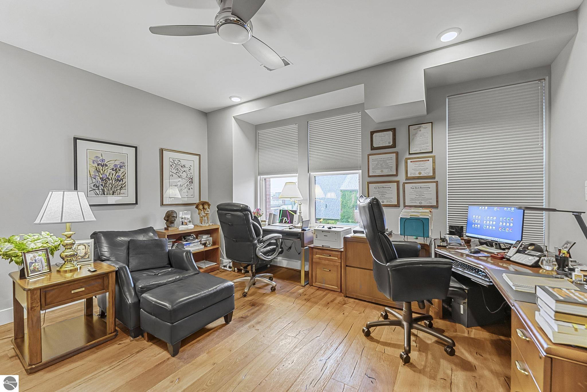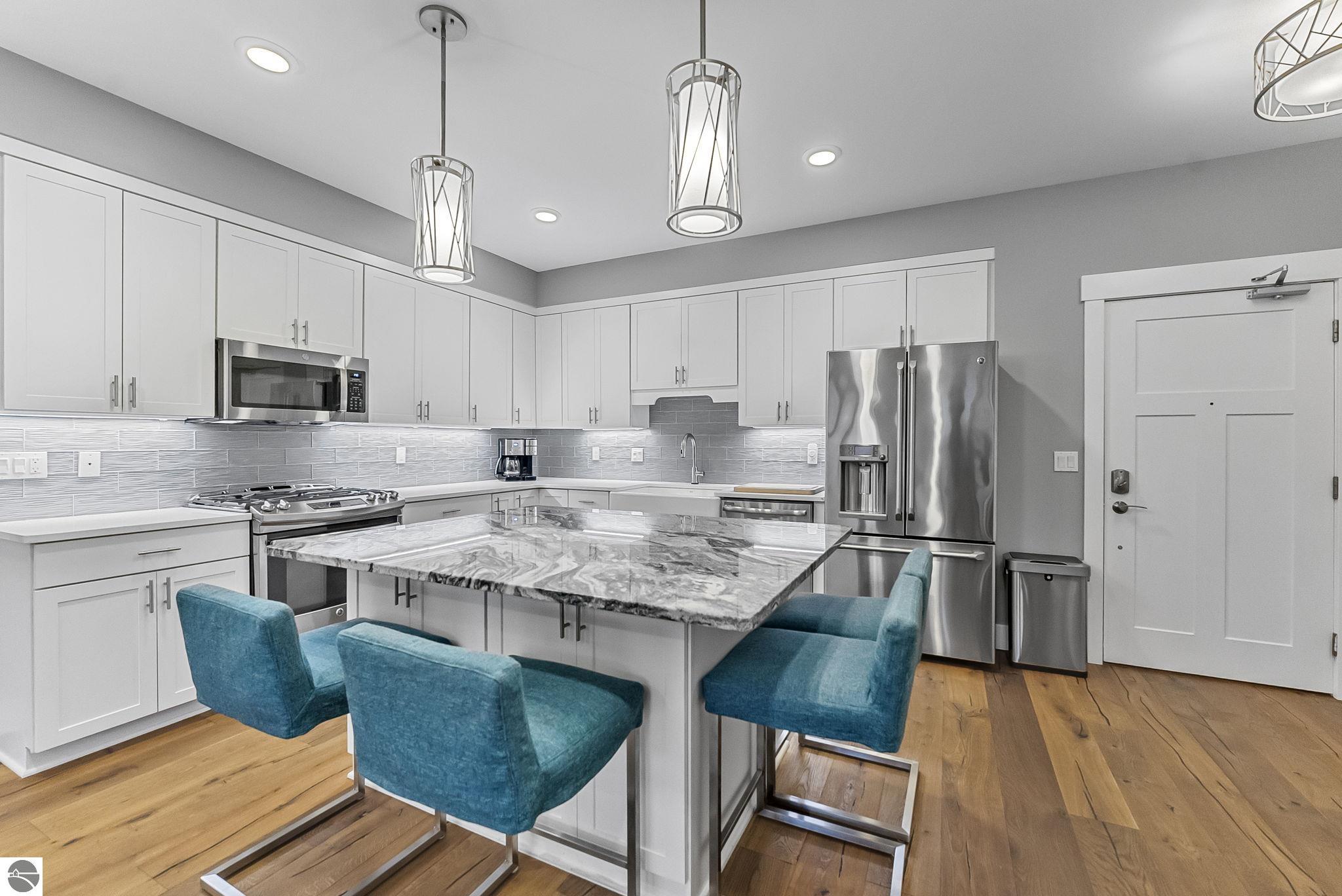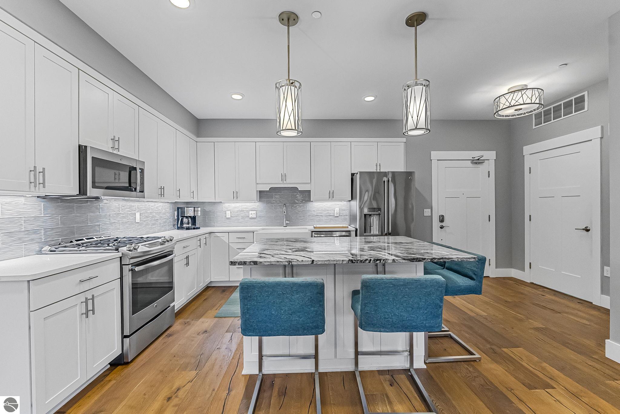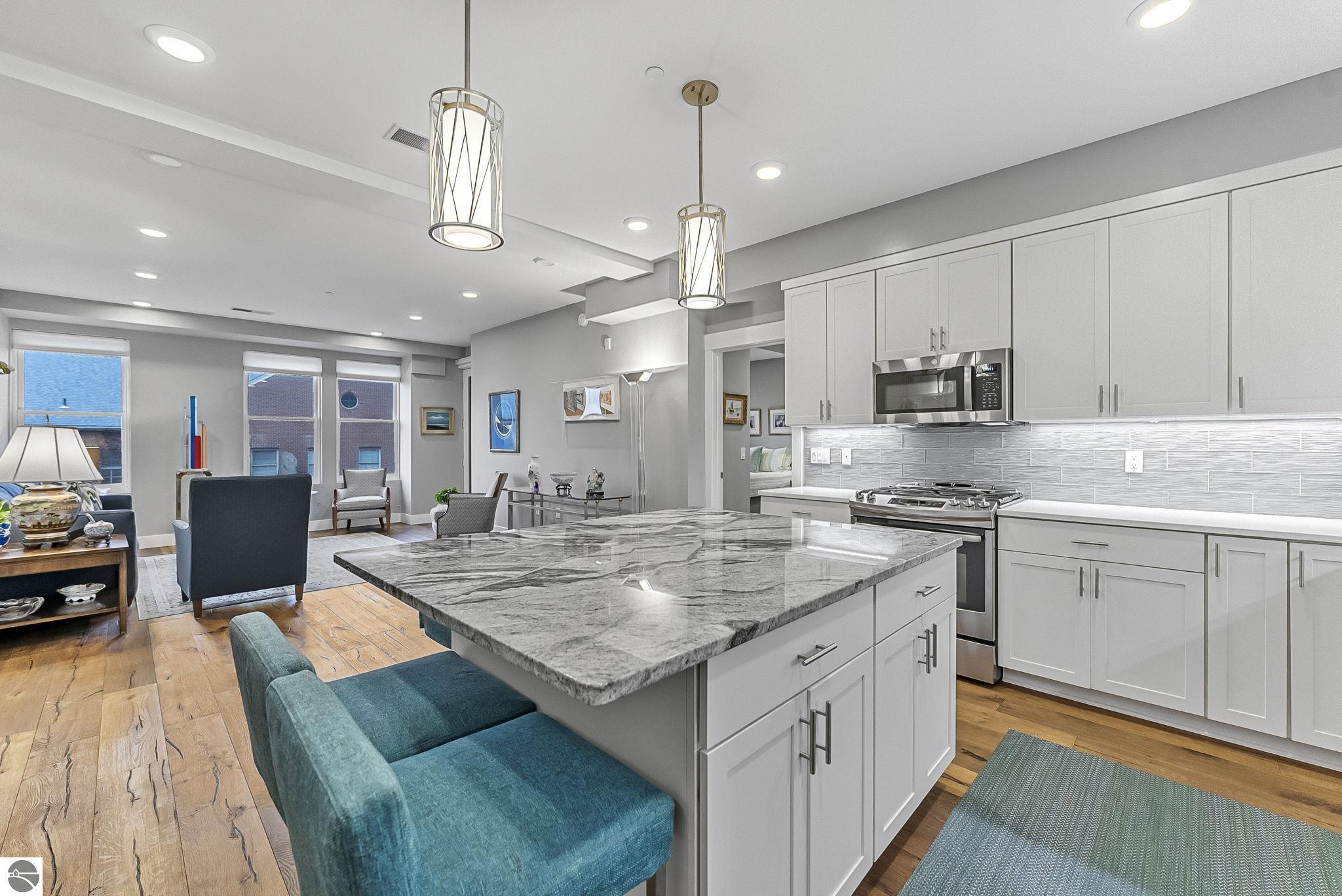 Experience luxury living in one of Traverse City’s most coveted addresses. This well-appointed 2-bedroom, 2-bath residence offers the perfect blend of comfort, privacy, and convenience. Located in the heart of downtown, Washington Place puts you within walking distance of dining, shopping, and the waterfront. The building borders a park along Cass Street with peaceful river views, creating a serene backdrop right outside your door. Inside, you’ll find an open, thoughtfully designed floor plan with high-end finishes throughout. Enjoy the outdoors from your private patio, an ideal spot to relax or entertain. The home includes an underground, covered parking space and a locked storage closet for your extra belongings. Washington Place residents appreciate the quiet, private atmosphere, secure elevator access, and strong sense of community. Heated garage and sidewalks surround the living space for extra security and ease in the colder months. With its prime location, upscale amenities, and inviting lifestyle, this is truly an excellent offering in downtown Traverse City.