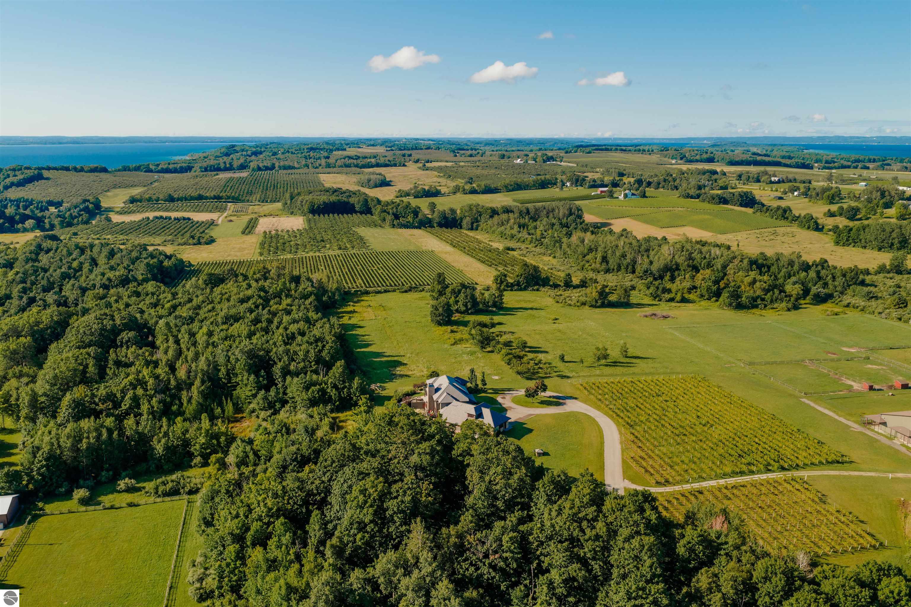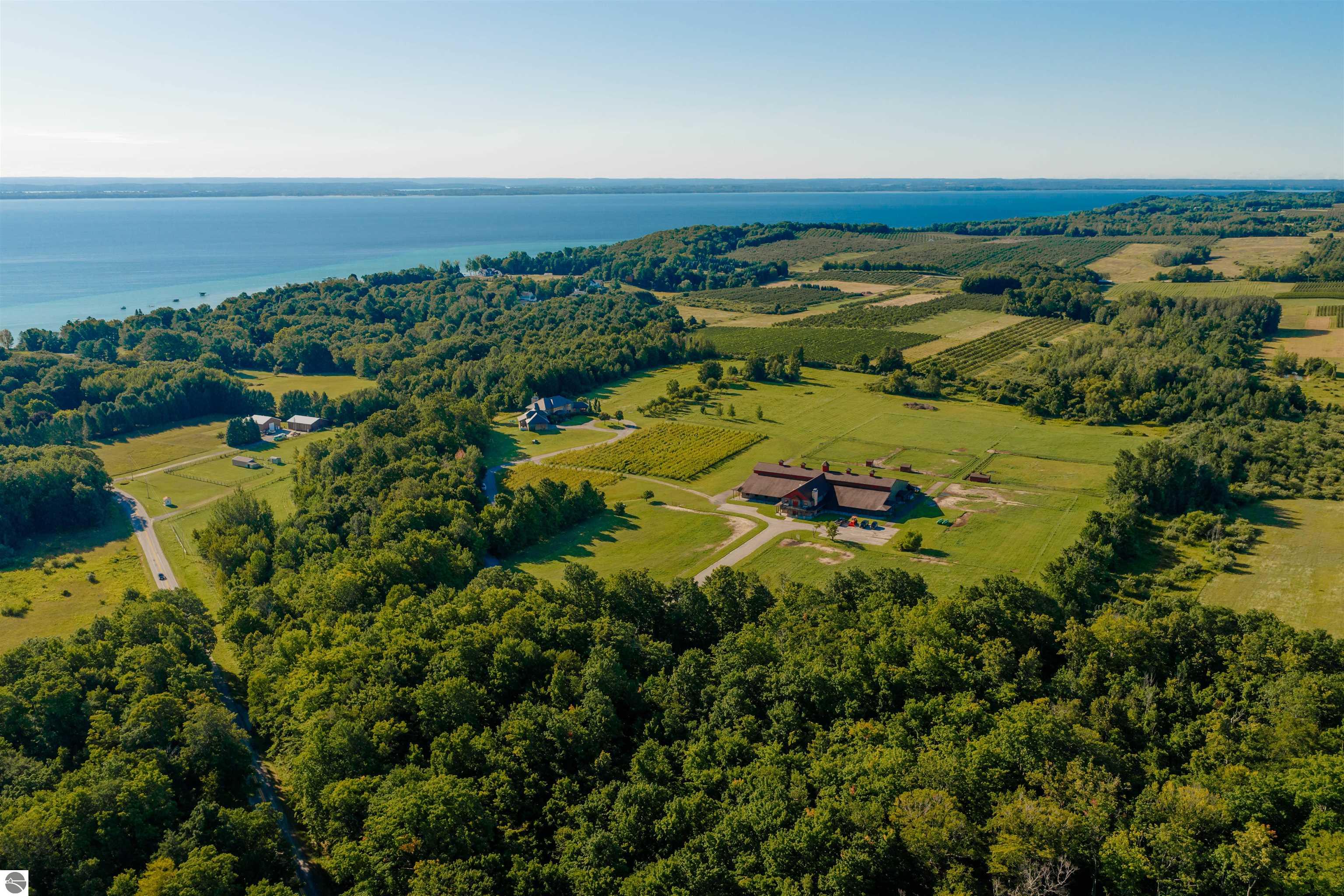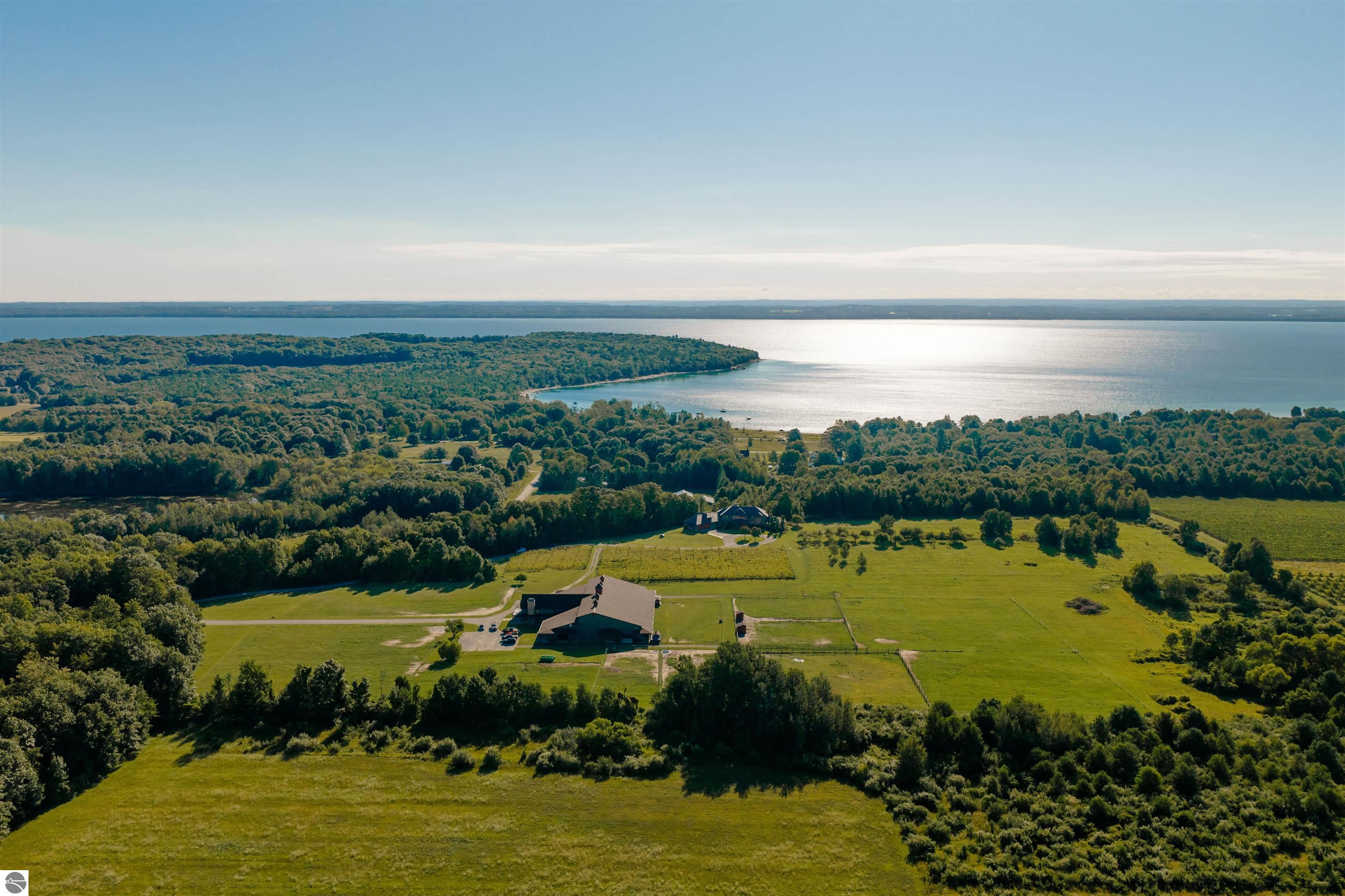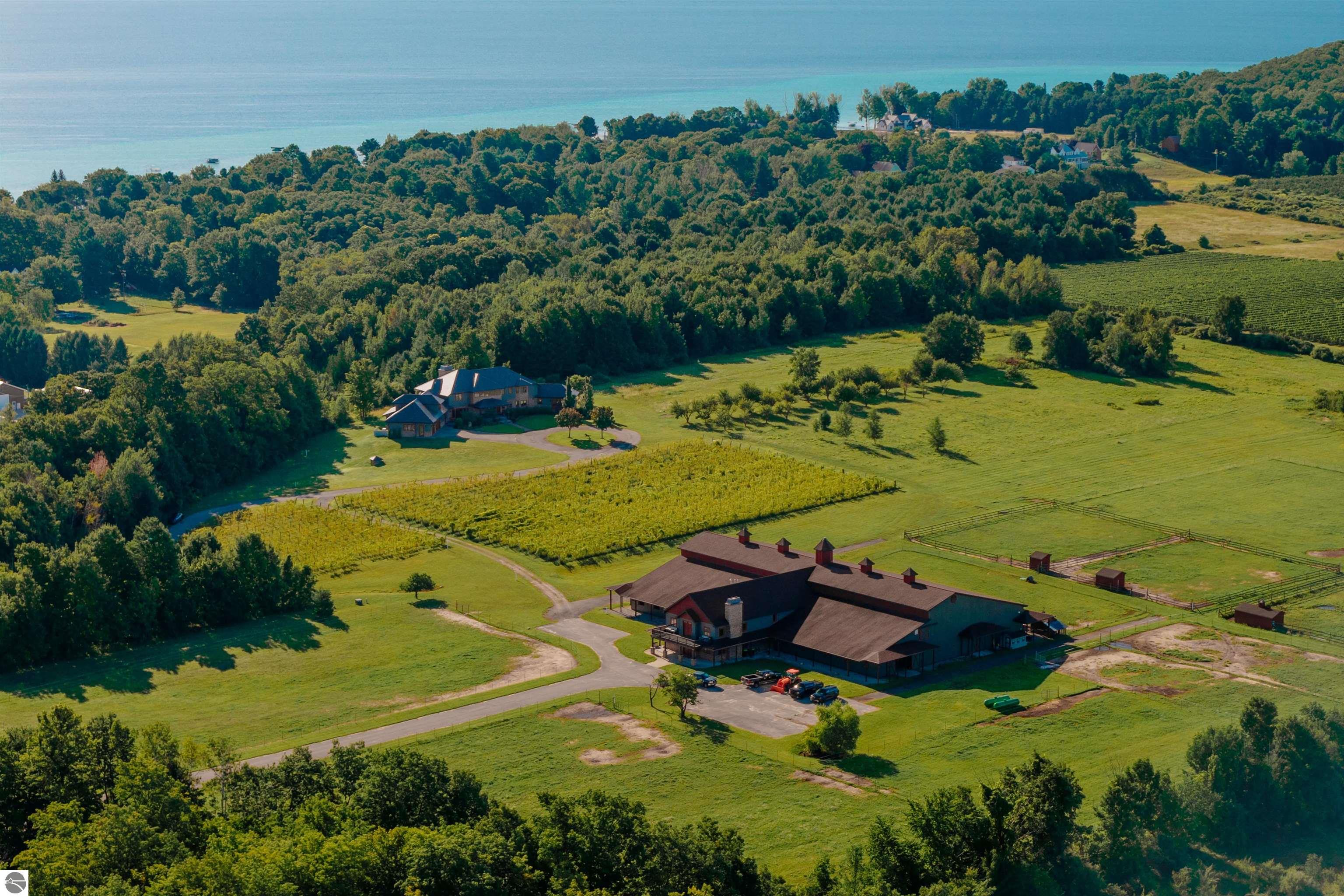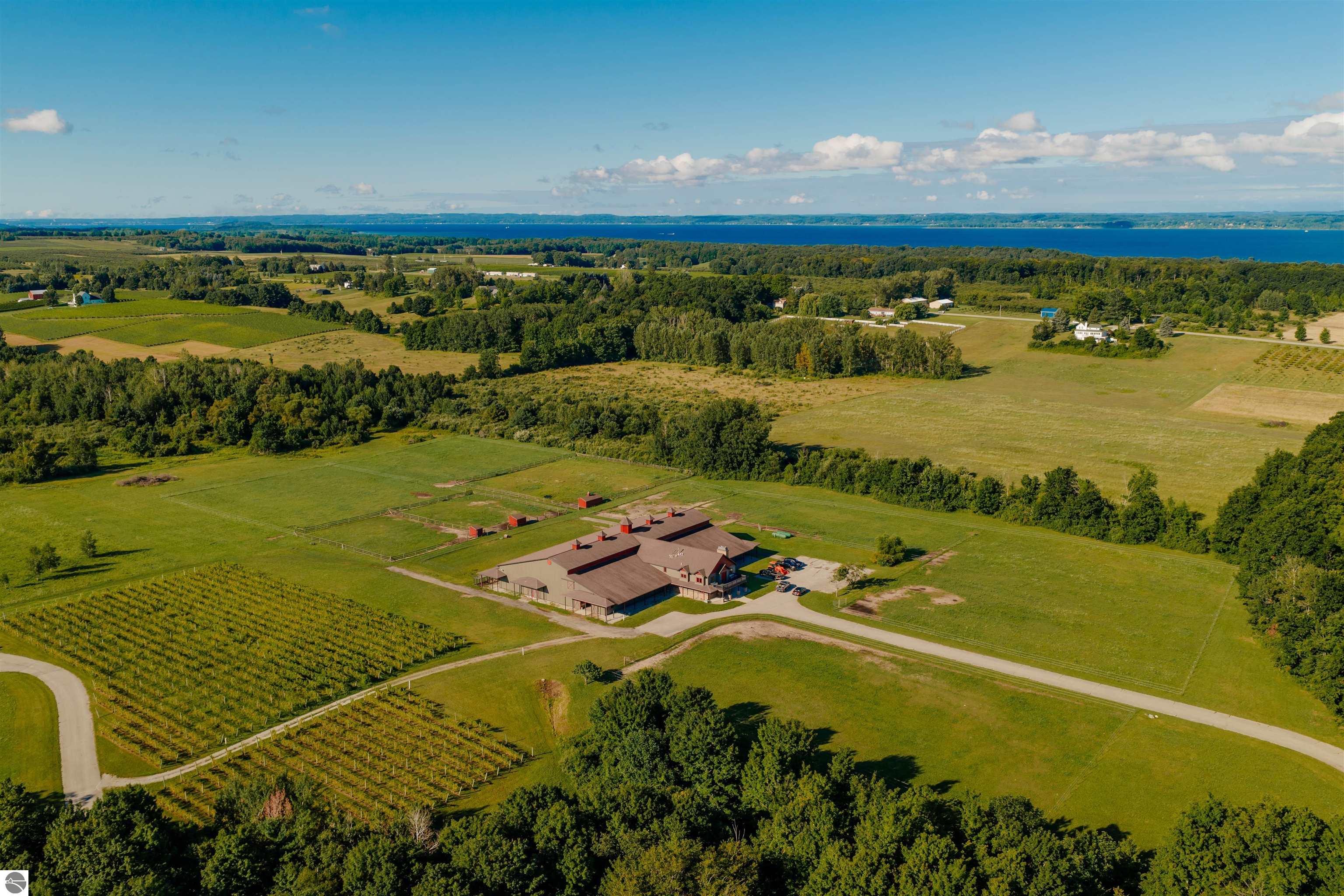 Nestled on the coveted Old Mission Peninsula, this majestic equestrian estate offers breathtaking, panoramic views of East Bay. Just a short distance from one of Michigan's most pristine beaches, this one-of-a-kind property combines luxury, functionality and natural beauty. The home is replete with distinctive, custom amenities, beginning with rich African Teak wood flooring, heated marble floors and custom moldings throughout. Fireplaces grace each level of spacious living rooms adding warmth and charm. The gourmet kitchen, complete with large walk-in pantry, a cozy eat-in nook and attached family room serves as the heart of the home. The adjacent dining room sets the stage for elegant entertaining. This estate offers an abundance of spaces for work, leisure and relaxation. The luxurious primary suite boasts a private sitting area, dual vanities, soaking tub, a spacious walk-in closet, laundry area and a private wrap around balcony overlooking the bay. Perfect for sun and moonrises over the water. The expansive walkout lower floor offers additional living and recreational spaces ideal for hosting gatherings as the doors open to patios and a level backyard lawn. Also included on this level are the theatre room, sauna, large marble steam room, billiards room/bar area, additional office space, indoor sports court, laundry and a large bonus room. Set amid a mature vineyard and apple orchard. This estate is designed for equestrian enthusiasts with a 21 stall barn equipped with living quarters and indoor arena. 3 Ramm-fenced paddocks with run-ins and an additional seven large paddocks. A separate 3 stall stable with fenced pastures is in the northeast corner of the property and provides additional space for horses. Includes a market stand and 3 custom made chicken coops. The versatile potential for horse training, boarding and winemaking makes this a rare to find estate and once-in-a-lifetime opportunity in a highly sought after location.