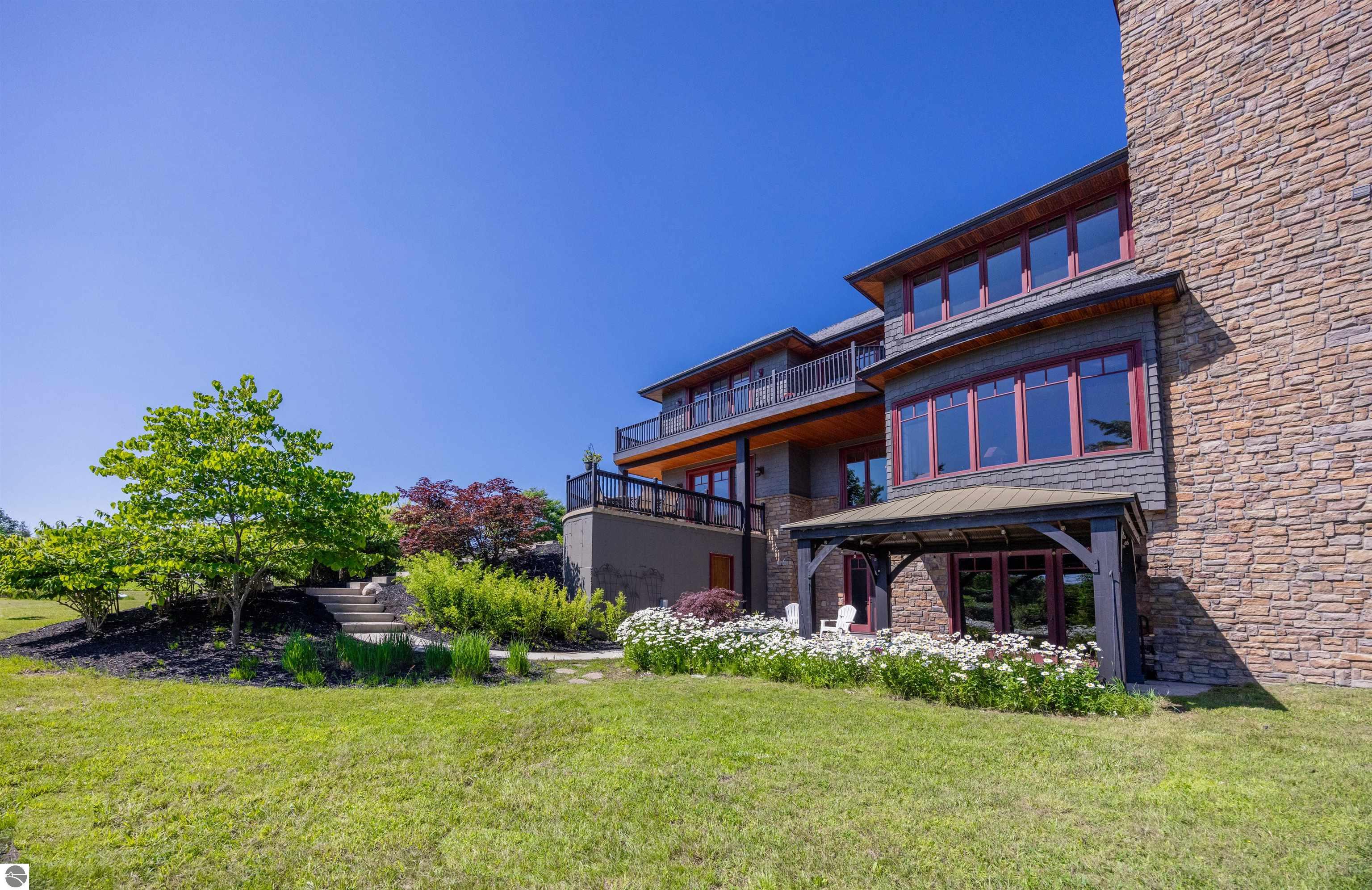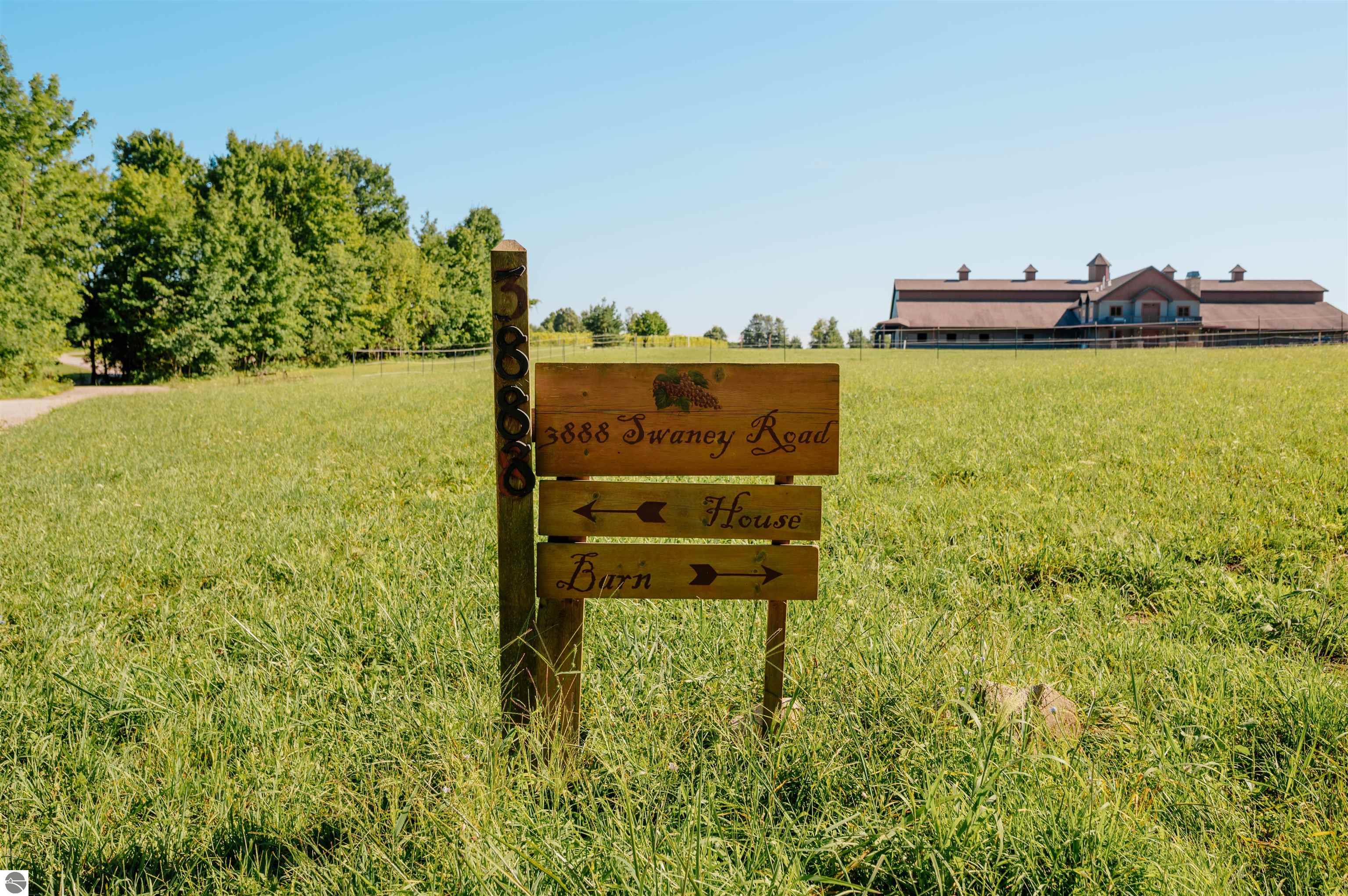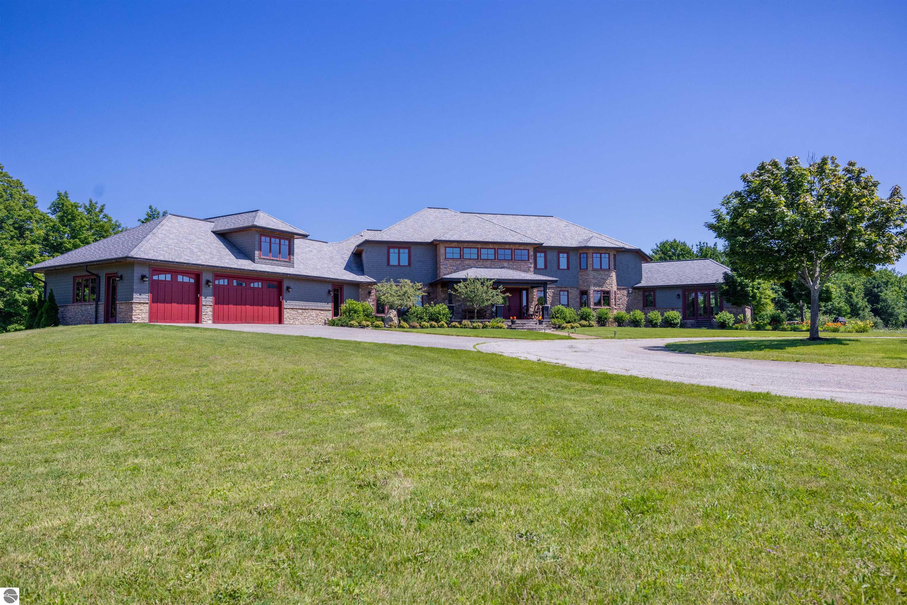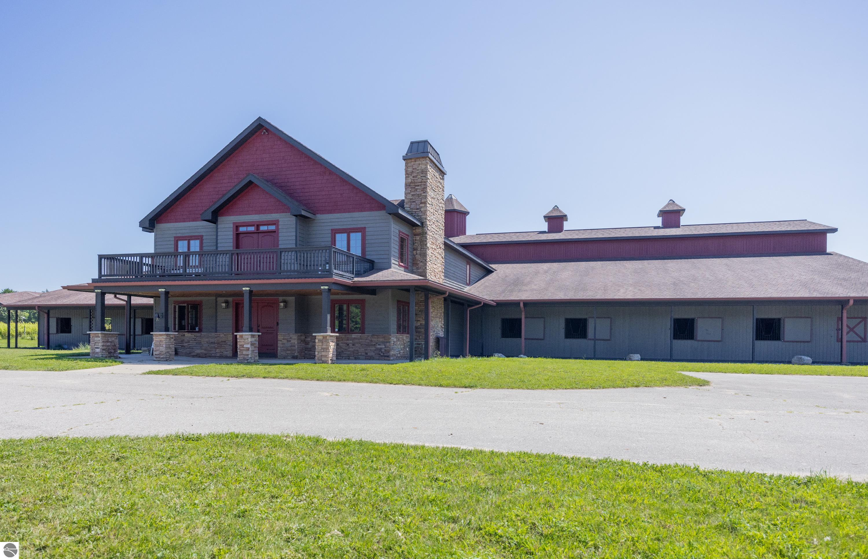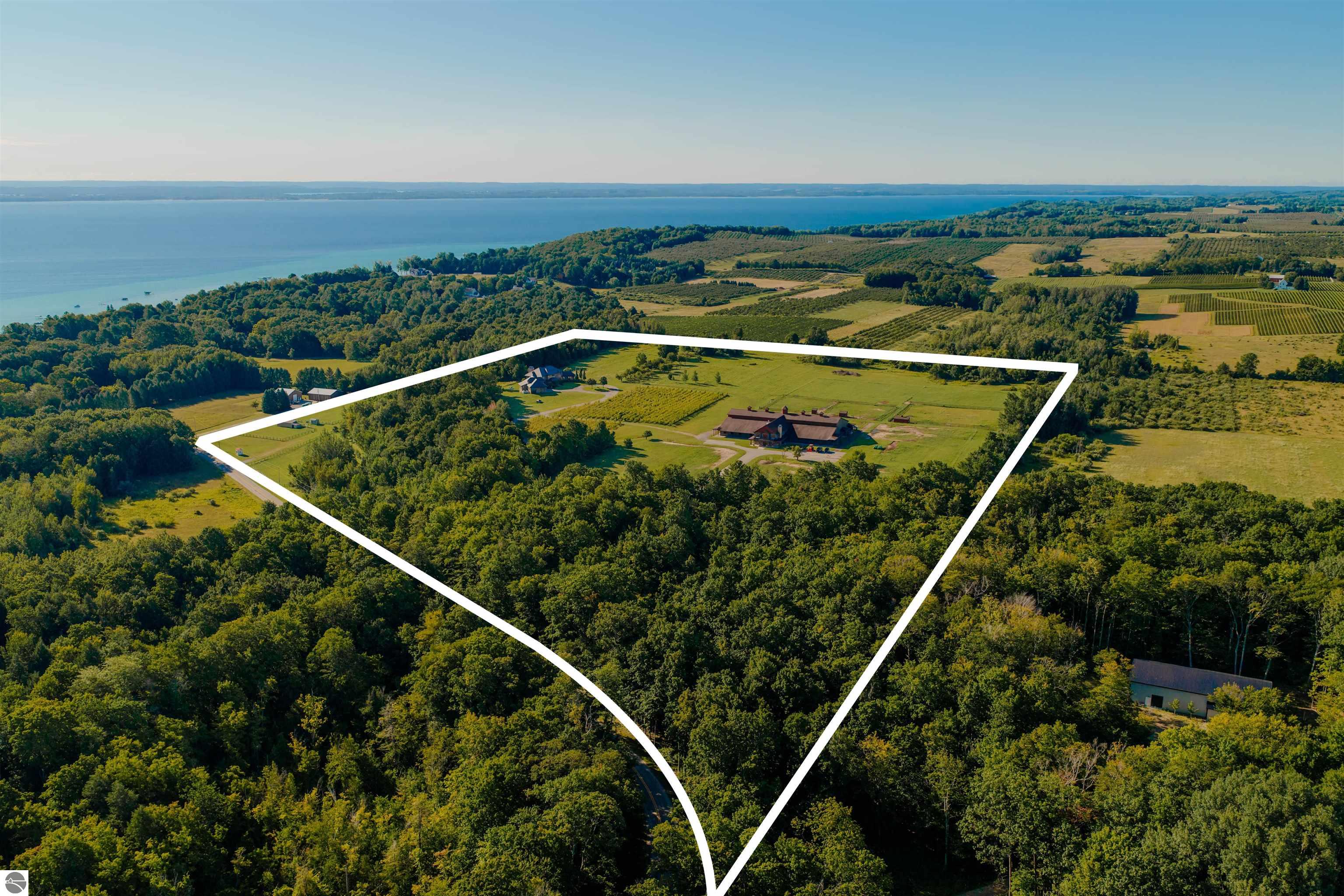Nestled on the coveted Old Mission Peninsula, this majestic equestrian estate offers breathtaking, panoramic views of East Bay. Just a short distance from one of Michigan's most pristine beaches, this one-of-a-kind property combines luxury, functionality and natural beauty. The home is replete with distinctive, custom amenities, beginning with rich African Teak wood flooring, heated marble floors and custom moldings throughout. Fireplaces grace each level of spacious living rooms adding warmth and charm. The gourmet kitchen, complete with large walk-in pantry, a cozy eat-in nook and attached family room serves as the heart of the home. The adjacent dining room sets the stage for elegant entertaining. This estate offers an abundance of spaces for work, leisure and relaxation. The luxurious primary suite boasts a private sitting area, dual vanities, soaking tub, a spacious walk-in closet, laundry area and a private wrap around balcony overlooking the bay. Perfect for sun and moonrises over the water. The expansive walkout lower floor offers additional living and recreational spaces ideal for hosting gatherings as the doors open to patios and a level backyard lawn. Also included on this level are the theatre room, sauna, large marble steam room, billiards room/bar area, additional office space, indoor sports court, laundry and a large bonus room. Set amid a mature vineyard and apple orchard. This estate is designed for equestrian enthusiasts with a 21 stall barn equipped with living quarters and indoor arena. 3 Ramm-fenced paddocks with run-ins and an additional seven large paddocks. A separate 3 stall stable with fenced pastures is in the northeast corner of the property and provides additional space for horses. Includes a market stand and 3 custom made chicken coops. The versatile potential for horse training, boarding and winemaking makes this a rare to find estate and once-in-a-lifetime opportunity in a highly sought after location.