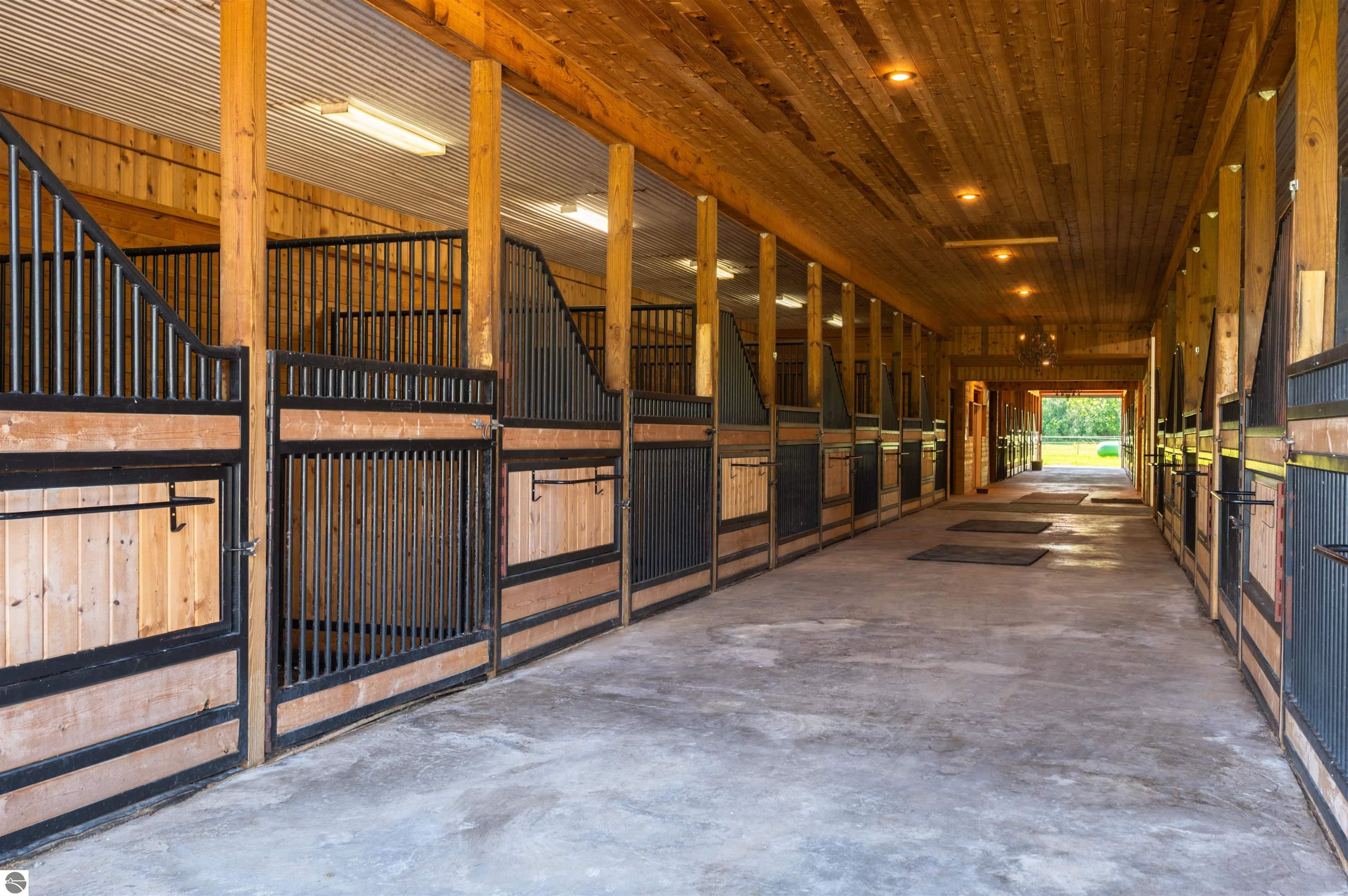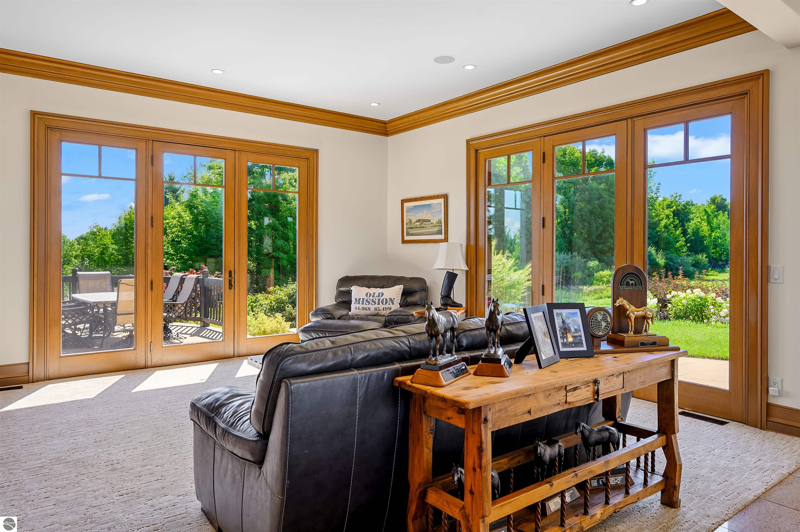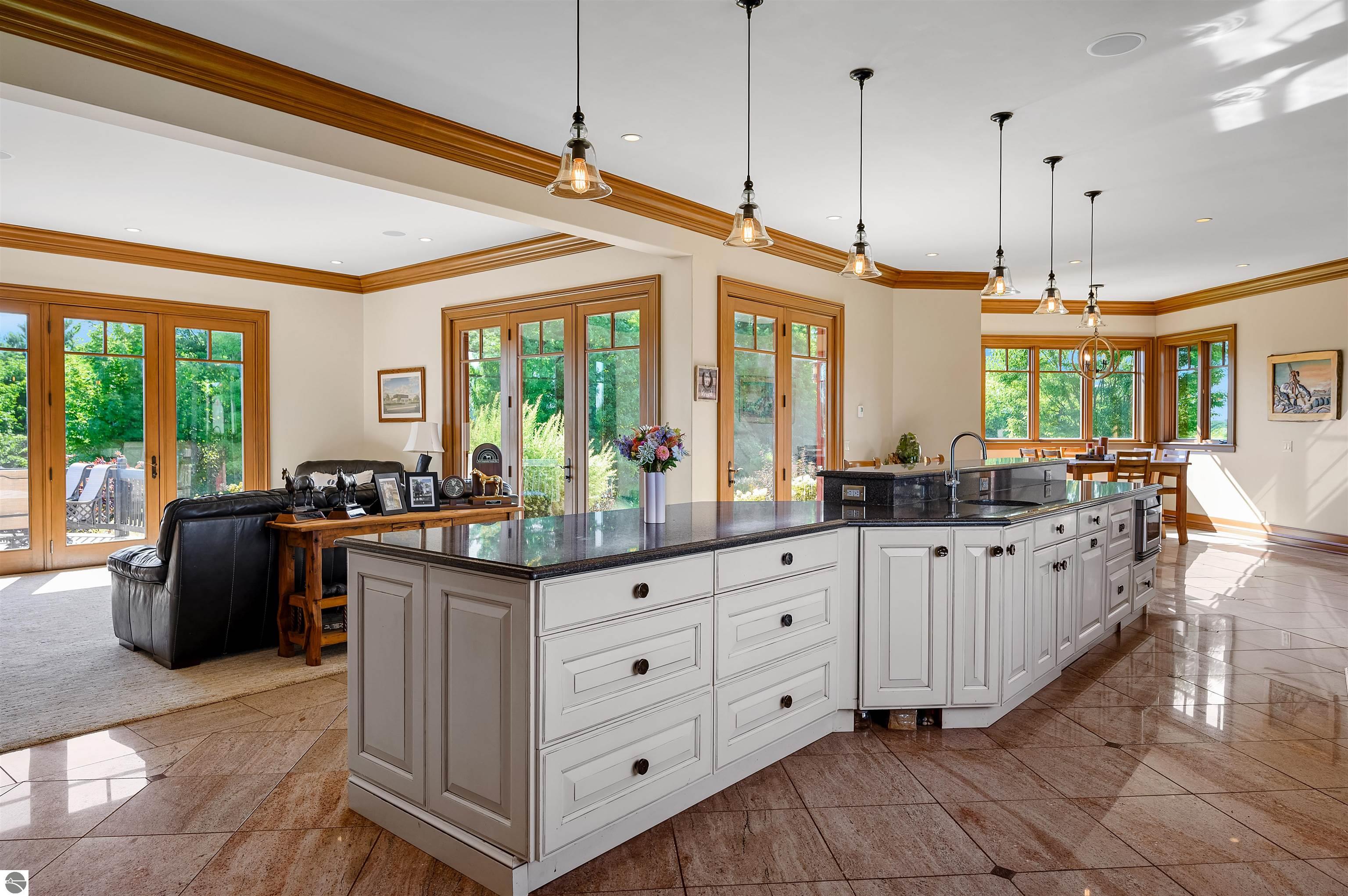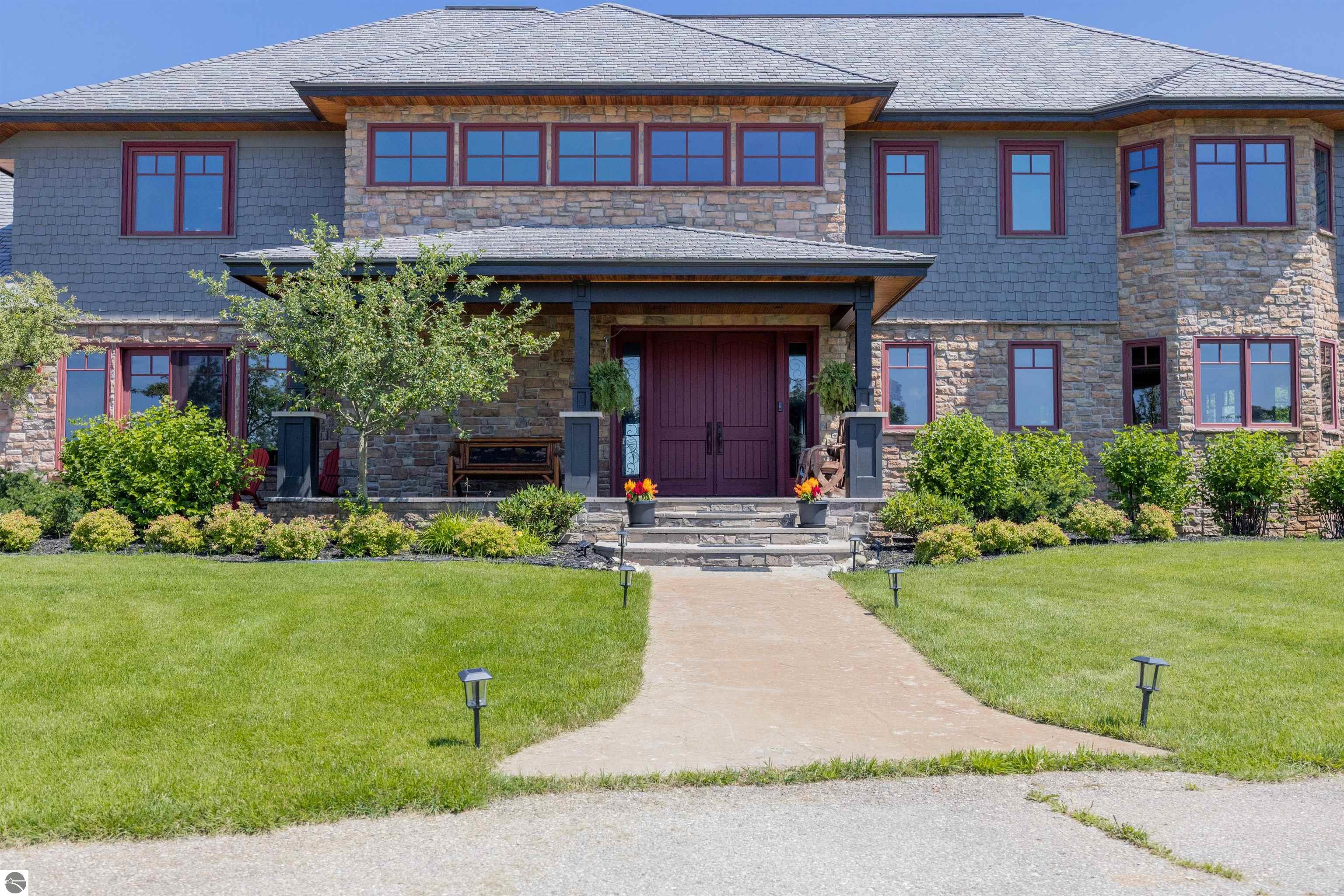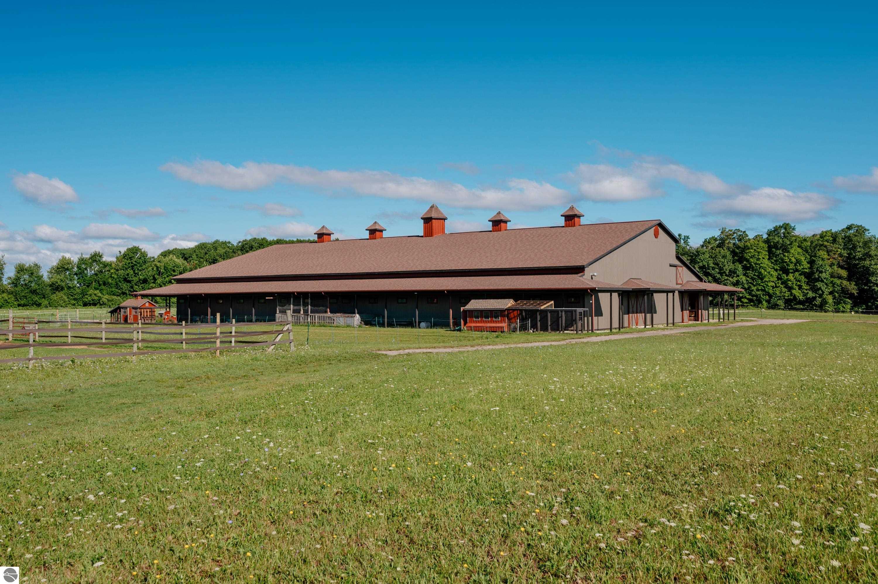 Nestled on the coveted Old Mission Peninsula, this majestic equestrian estate offers breathtaking, panoramic views of East Bay. Just a short distance from one of Michigan's most pristine beaches, this one-of-a-kind property combines luxury, functionality and natural beauty. The home is replete with distinctive, custom amenities, beginning with rich African Teak wood flooring, heated marble floors and custom moldings throughout. Fireplaces grace each level of spacious living rooms adding warmth and charm. The gourmet kitchen, complete with large walk-in pantry, a cozy eat-in nook and attached family room serves as the heart of the home. The adjacent dining room sets the stage for elegant entertaining. This estate offers an abundance of spaces for work, leisure and relaxation. The luxurious primary suite boasts a private sitting area, dual vanities, soaking tub, a spacious walk-in closet, laundry area and a private wrap around balcony overlooking the bay. Perfect for sun and moonrises over the water. The expansive walkout lower floor offers additional living and recreational spaces ideal for hosting gatherings as the doors open to patios and a level backyard lawn. Also included on this level are the theatre room, sauna, large marble steam room, billiards room/bar area, additional office space, indoor sports court, laundry and a large bonus room. Set amid a mature vineyard and apple orchard. This estate is designed for equestrian enthusiasts with a 21 stall barn equipped with living quarters and indoor arena. 3 Ramm-fenced paddocks with run-ins and an additional seven large paddocks. A separate 3 stall stable with fenced pastures is in the northeast corner of the property and provides additional space for horses. Includes a market stand and 3 custom made chicken coops. The versatile potential for horse training, boarding and winemaking makes this a rare to find estate and once-in-a-lifetime opportunity in a highly sought after location.