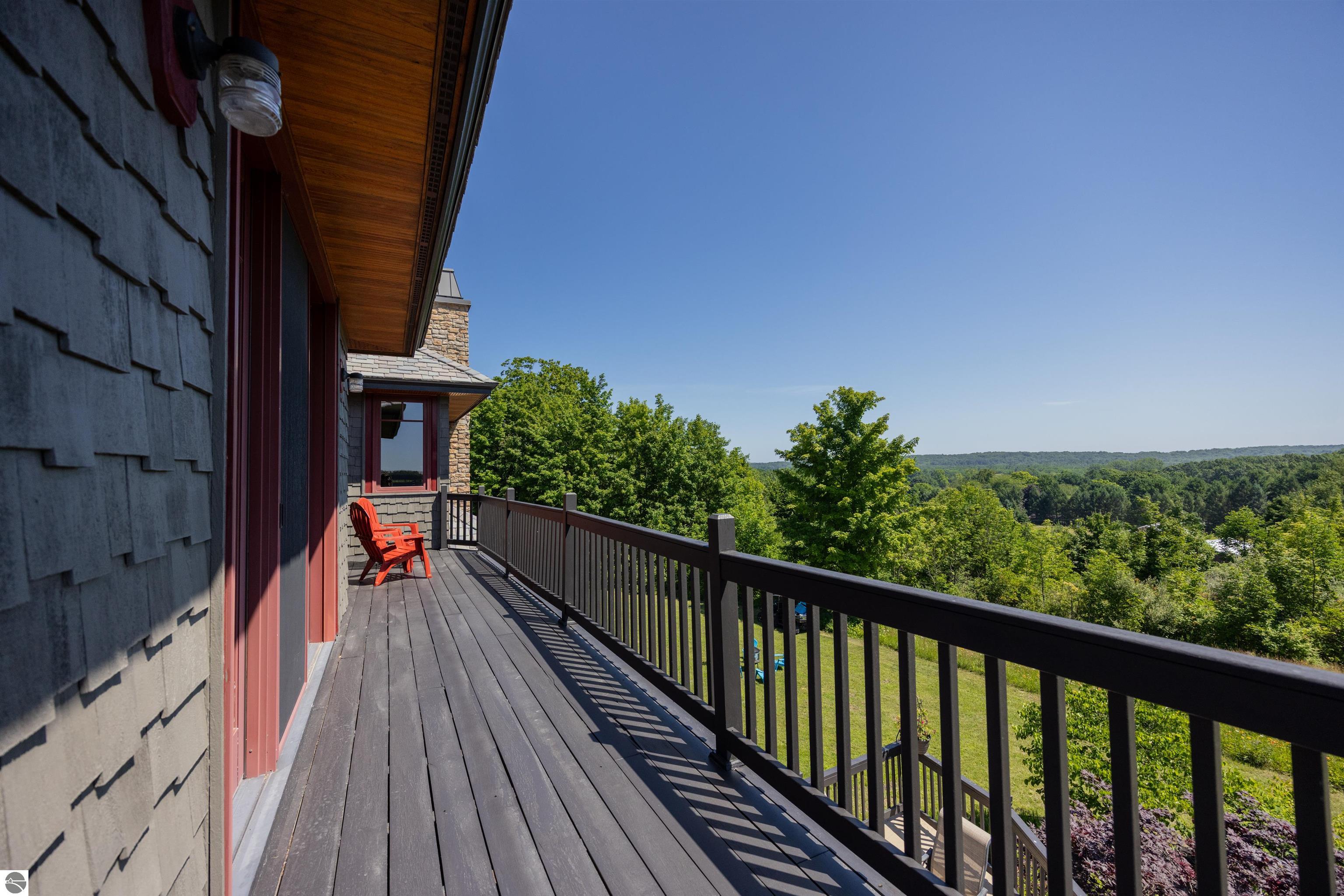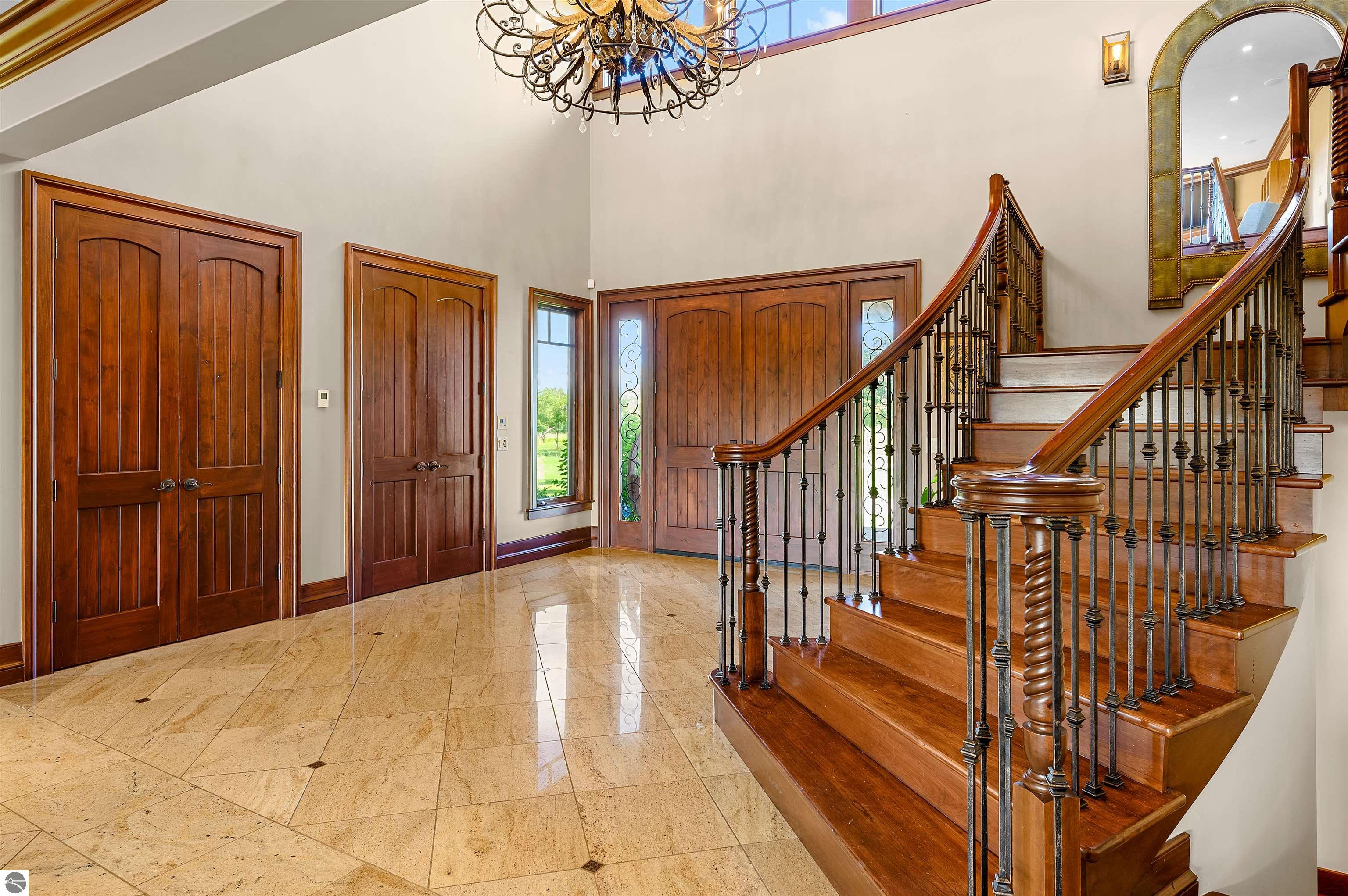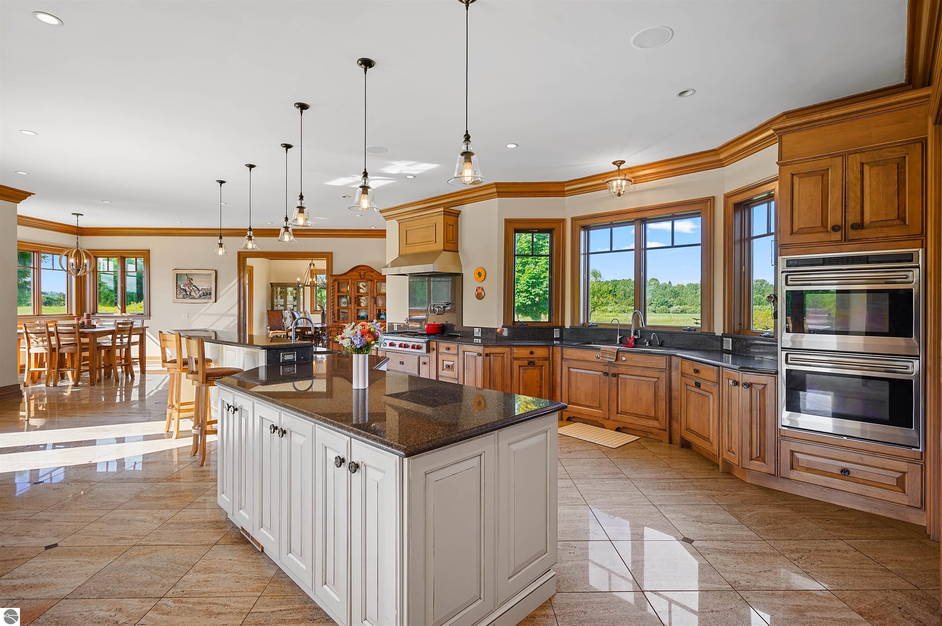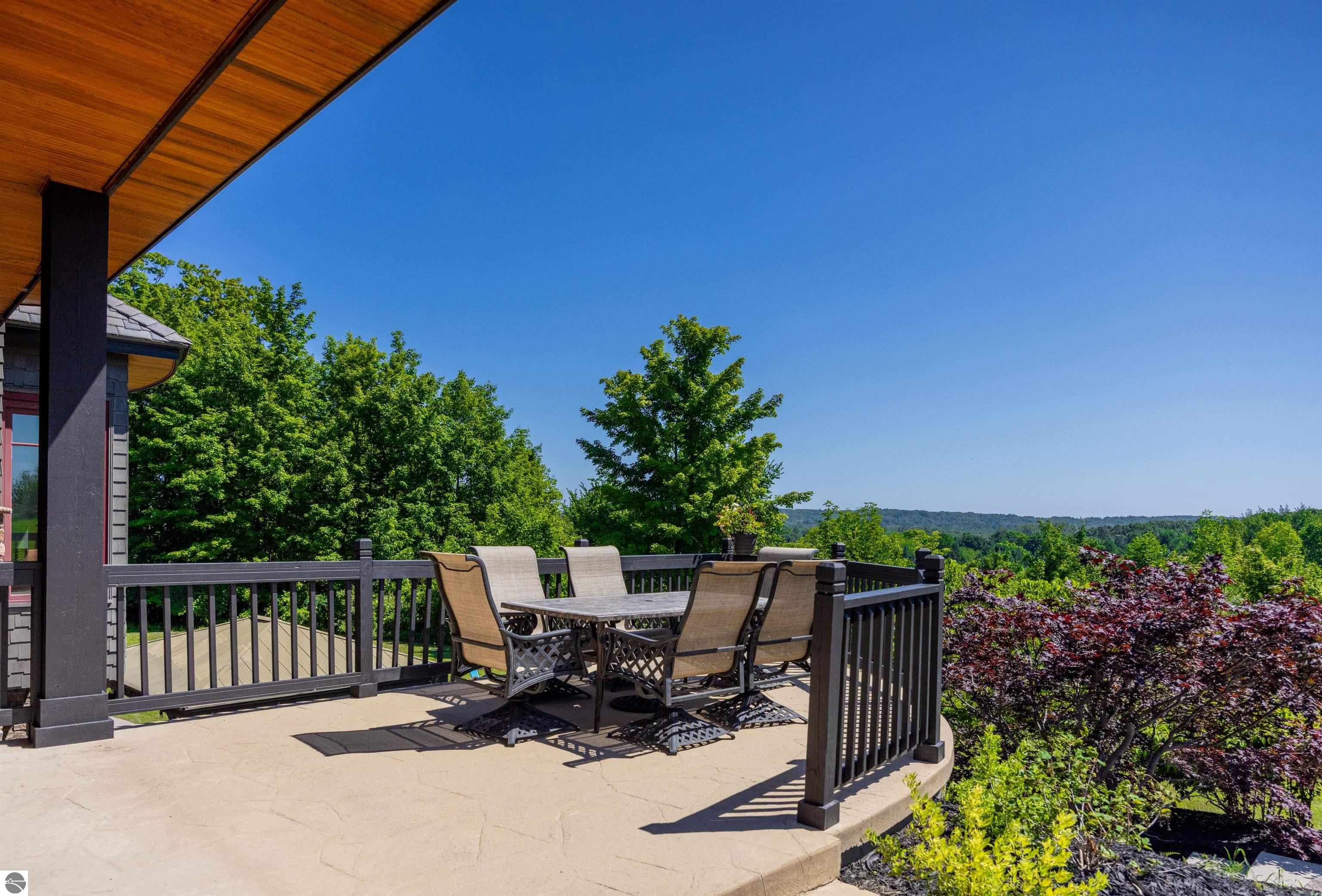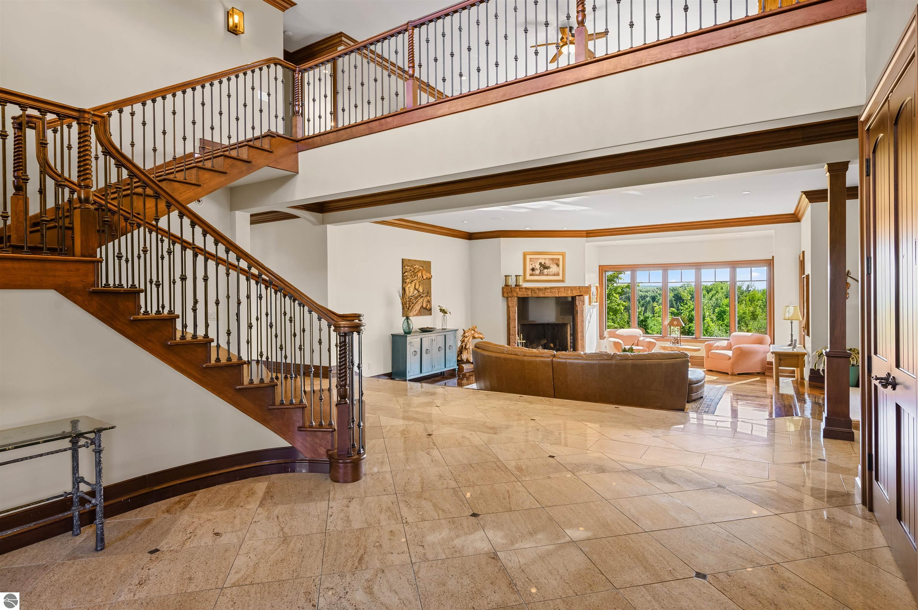 Nestled on the coveted Old Mission Peninsula, this majestic equestrian estate offers breathtaking, panoramic views of East Bay. Just a short distance from one of Michigan's most pristine beaches, this one-of-a-kind property combines luxury, functionality and natural beauty. The home is replete with distinctive, custom amenities, beginning with rich African Teak wood flooring, heated marble floors and custom moldings throughout. Fireplaces grace each level of spacious living rooms adding warmth and charm. The gourmet kitchen, complete with large walk-in pantry, a cozy eat-in nook and attached family room serves as the heart of the home. The adjacent dining room sets the stage for elegant entertaining. This estate offers an abundance of spaces for work, leisure and relaxation. The luxurious primary suite boasts a private sitting area, dual vanities, soaking tub, a spacious walk-in closet, laundry area and a private wrap around balcony overlooking the bay. Perfect for sun and moonrises over the water. The expansive walkout lower floor offers additional living and recreational spaces ideal for hosting gatherings as the doors open to patios and a level backyard lawn. Also included on this level are the theatre room, sauna, large marble steam room, billiards room/bar area, additional office space, indoor sports court, laundry and a large bonus room. Set amid a mature vineyard and apple orchard. This estate is designed for equestrian enthusiasts with a 21 stall barn equipped with living quarters and indoor arena. 3 Ramm-fenced paddocks with run-ins and an additional seven large paddocks. A separate 3 stall stable with fenced pastures is in the northeast corner of the property and provides additional space for horses. Includes a market stand and 3 custom made chicken coops. The versatile potential for horse training, boarding and winemaking makes this a rare to find estate and once-in-a-lifetime opportunity in a highly sought after location.