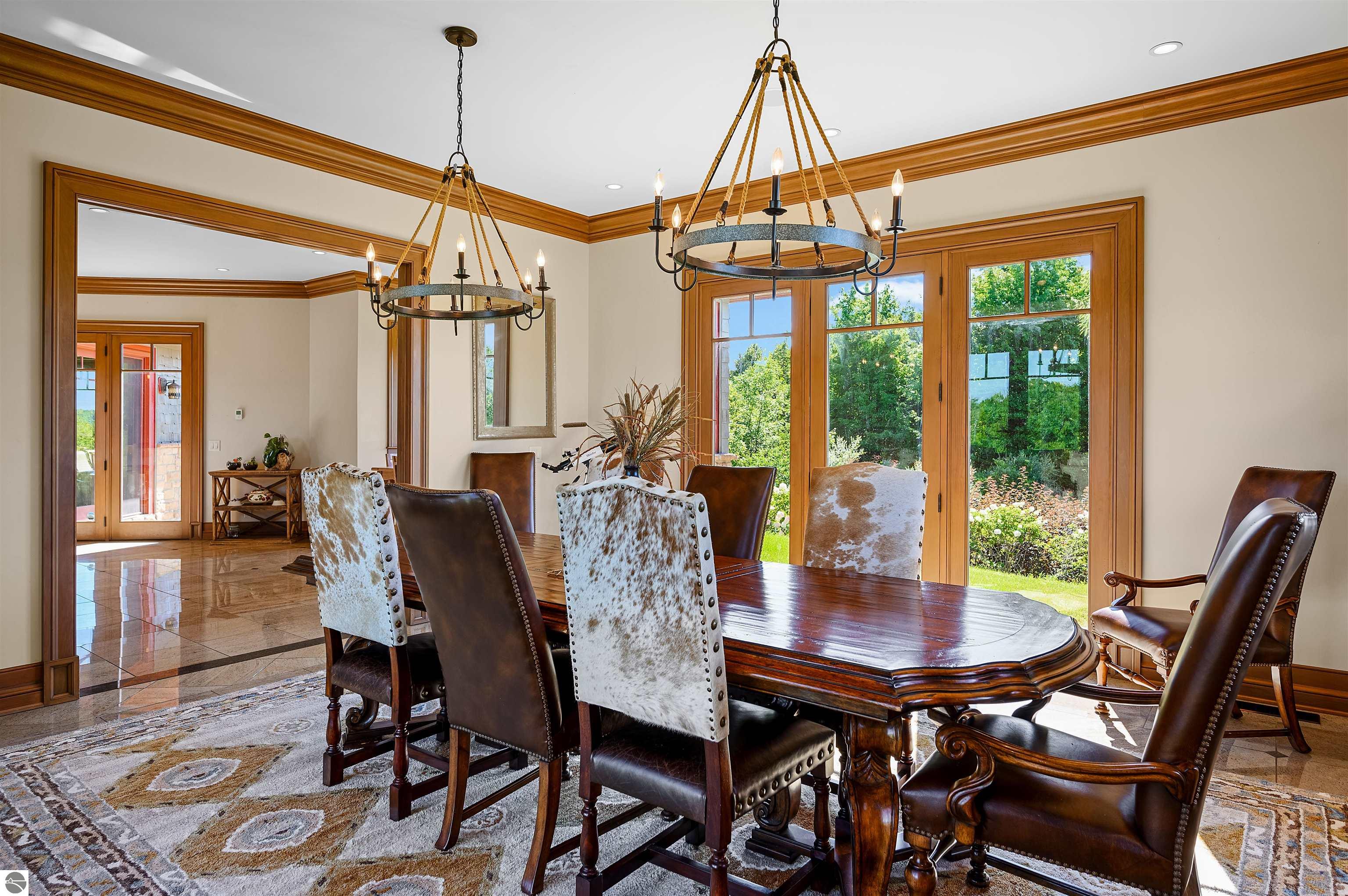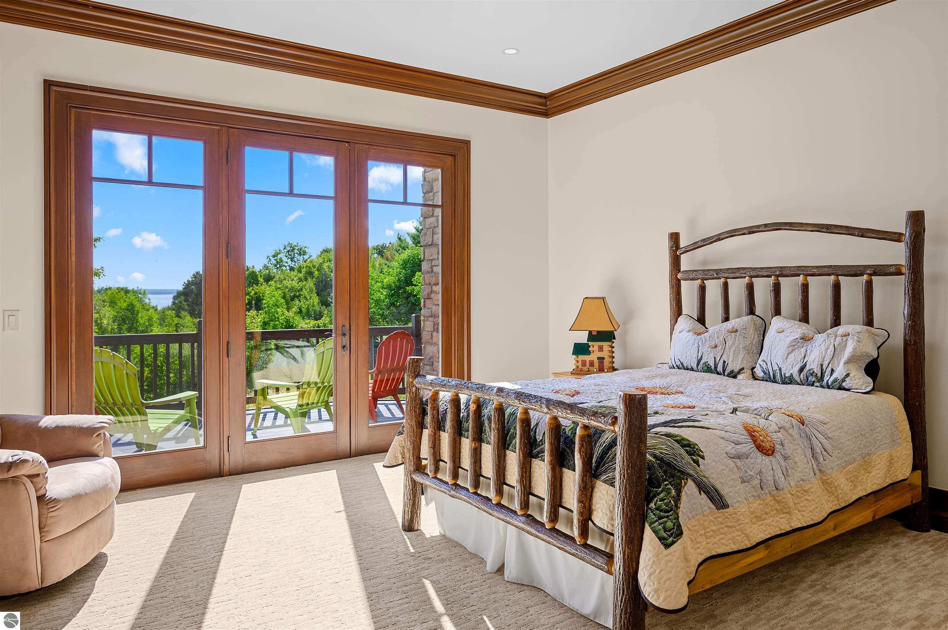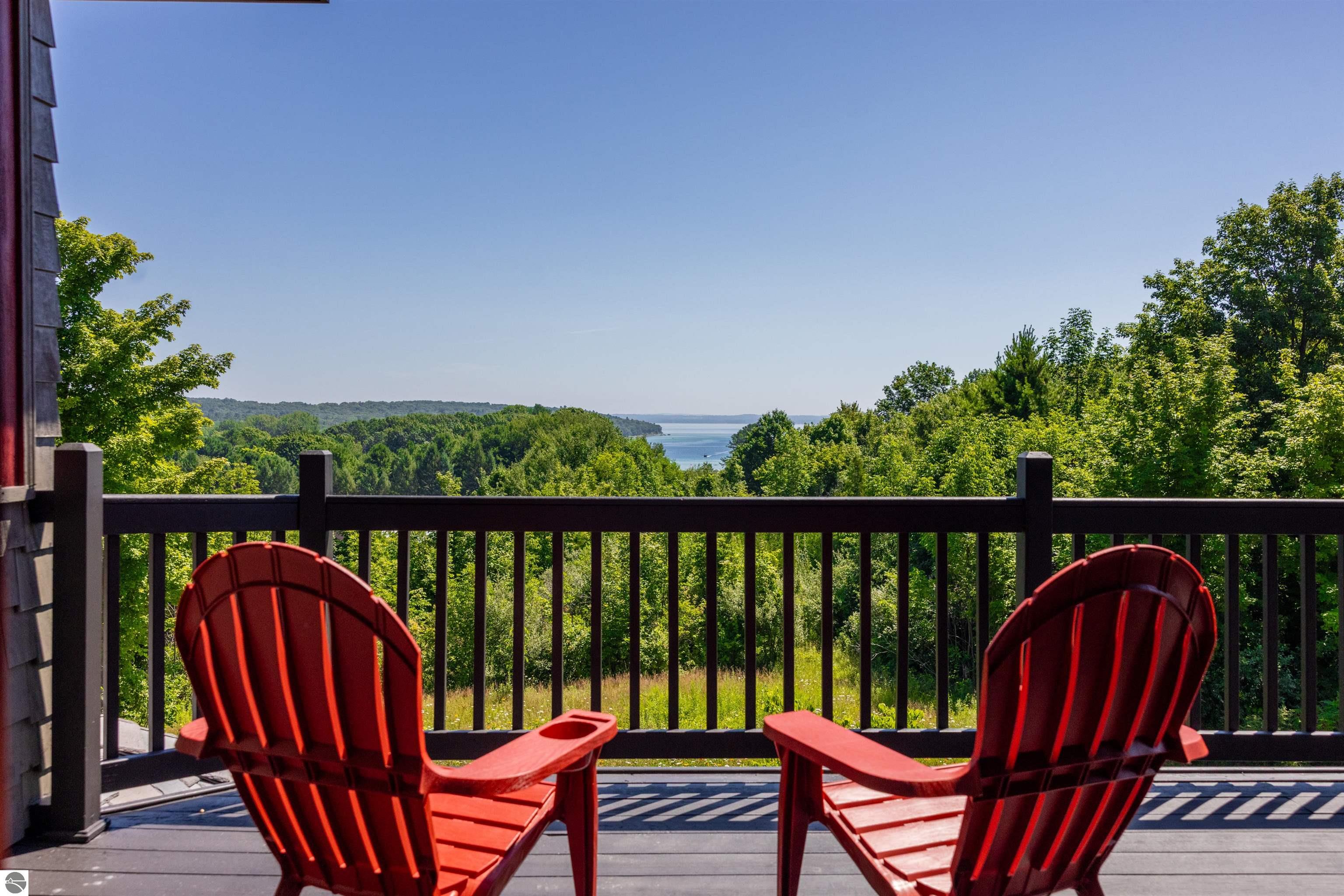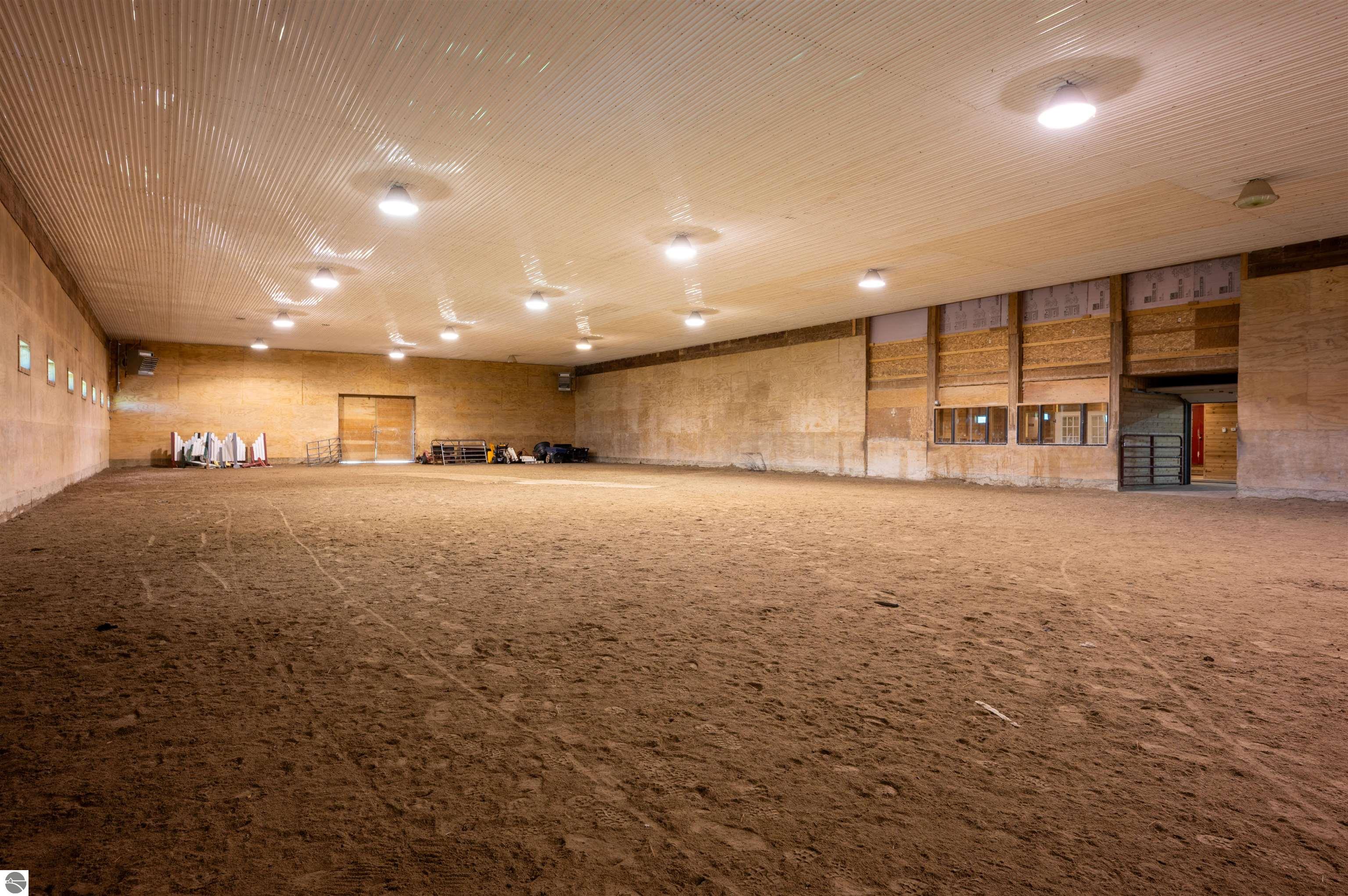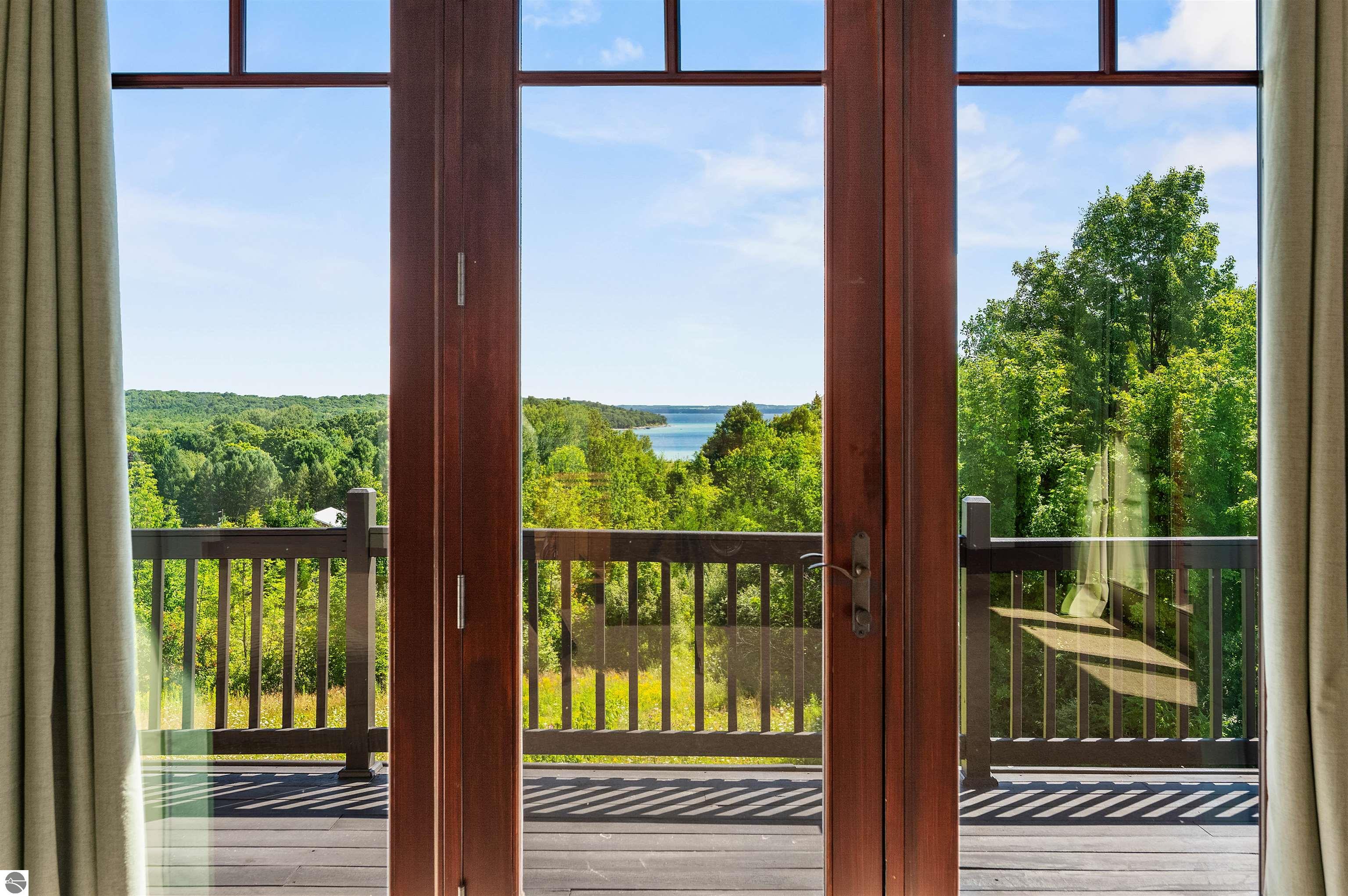 Nestled on the coveted Old Mission Peninsula, this majestic equestrian estate offers breathtaking, panoramic views of East Bay. Just a short distance from one of Michigan's most pristine beaches, this one-of-a-kind property combines luxury, functionality and natural beauty. The home is replete with distinctive, custom amenities, beginning with rich African Teak wood flooring, heated marble floors and custom moldings throughout. Fireplaces grace each level of spacious living rooms adding warmth and charm. The gourmet kitchen, complete with large walk-in pantry, a cozy eat-in nook and attached family room serves as the heart of the home. The adjacent dining room sets the stage for elegant entertaining. This estate offers an abundance of spaces for work, leisure and relaxation. The luxurious primary suite boasts a private sitting area, dual vanities, soaking tub, a spacious walk-in closet, laundry area and a private wrap around balcony overlooking the bay. Perfect for sun and moonrises over the water. The expansive walkout lower floor offers additional living and recreational spaces ideal for hosting gatherings as the doors open to patios and a level backyard lawn. Also included on this level are the theatre room, sauna, large marble steam room, billiards room/bar area, additional office space, indoor sports court, laundry and a large bonus room. Set amid a mature vineyard and apple orchard. This estate is designed for equestrian enthusiasts with a 21 stall barn equipped with living quarters and indoor arena. 3 Ramm-fenced paddocks with run-ins and an additional seven large paddocks. A separate 3 stall stable with fenced pastures is in the northeast corner of the property and provides additional space for horses. Includes a market stand and 3 custom made chicken coops. The versatile potential for horse training, boarding and winemaking makes this a rare to find estate and once-in-a-lifetime opportunity in a highly sought after location.