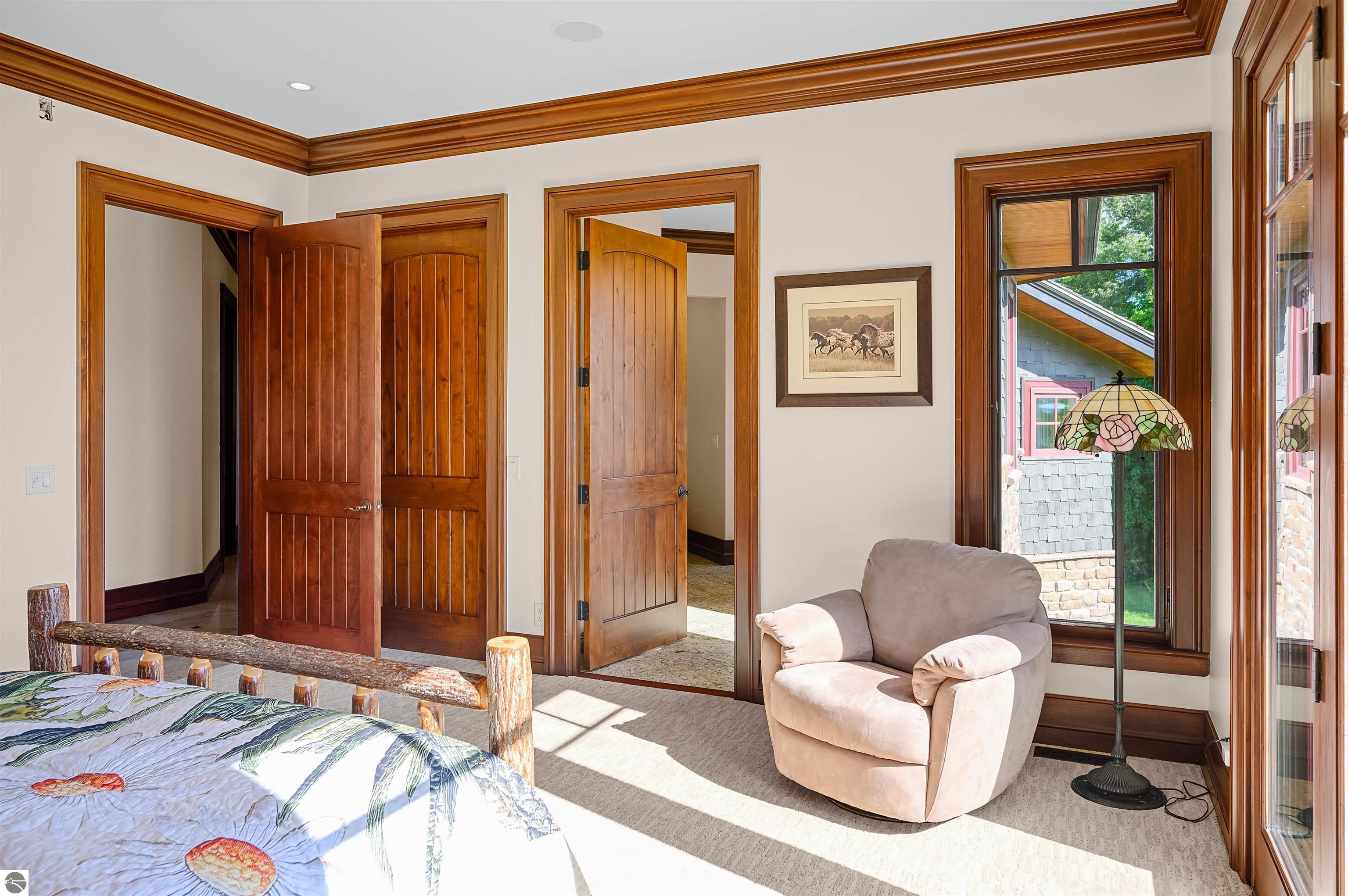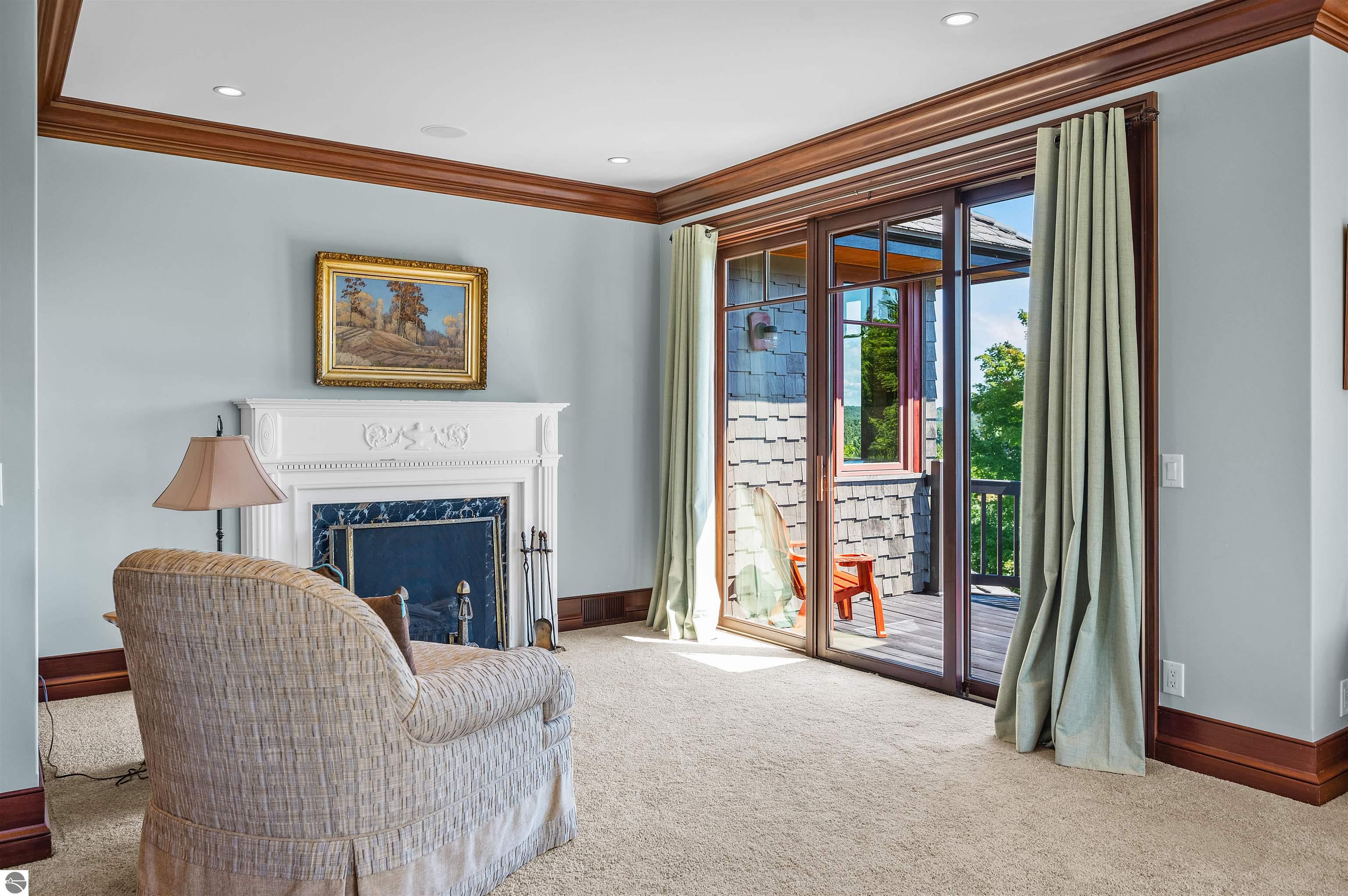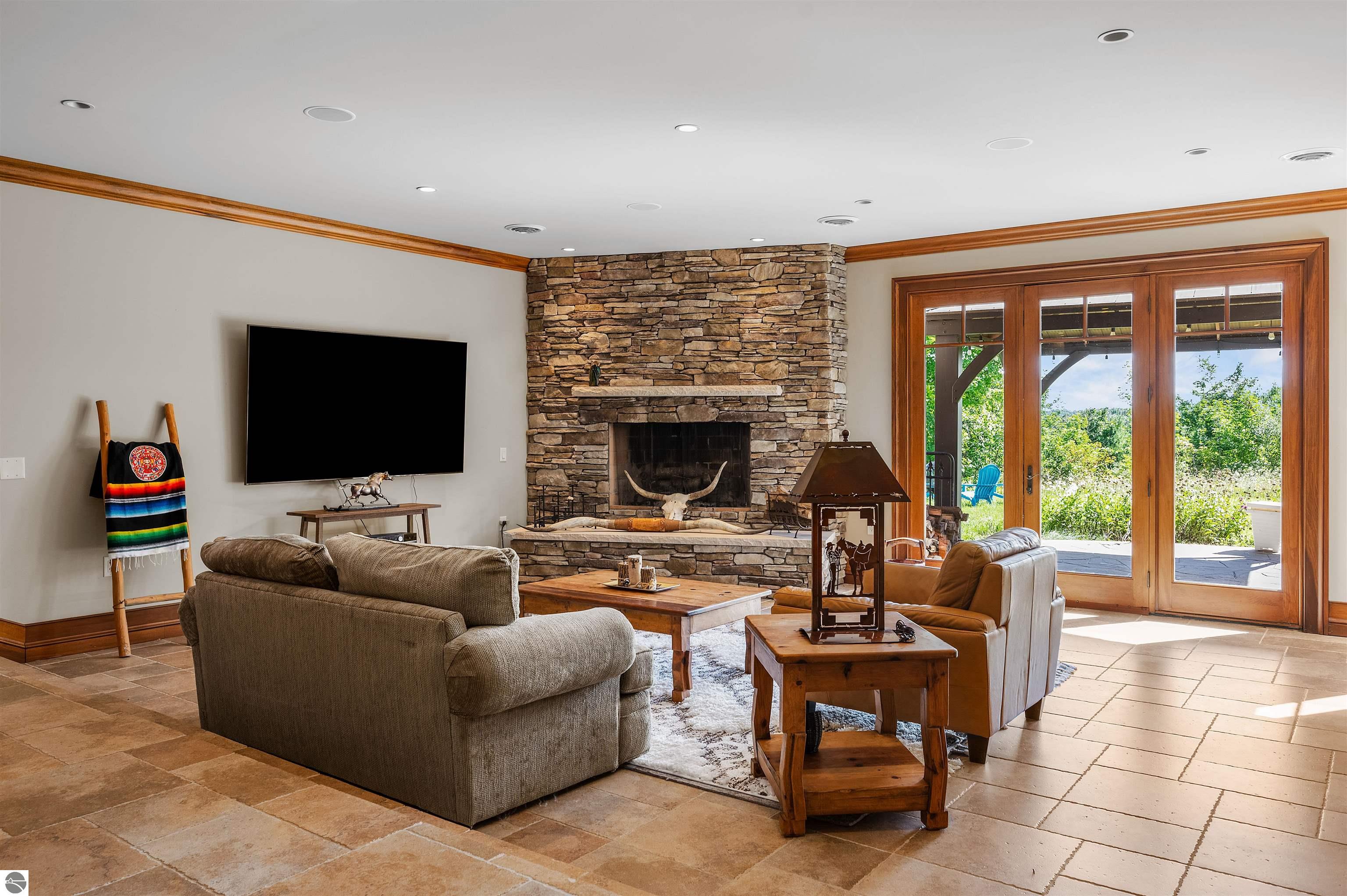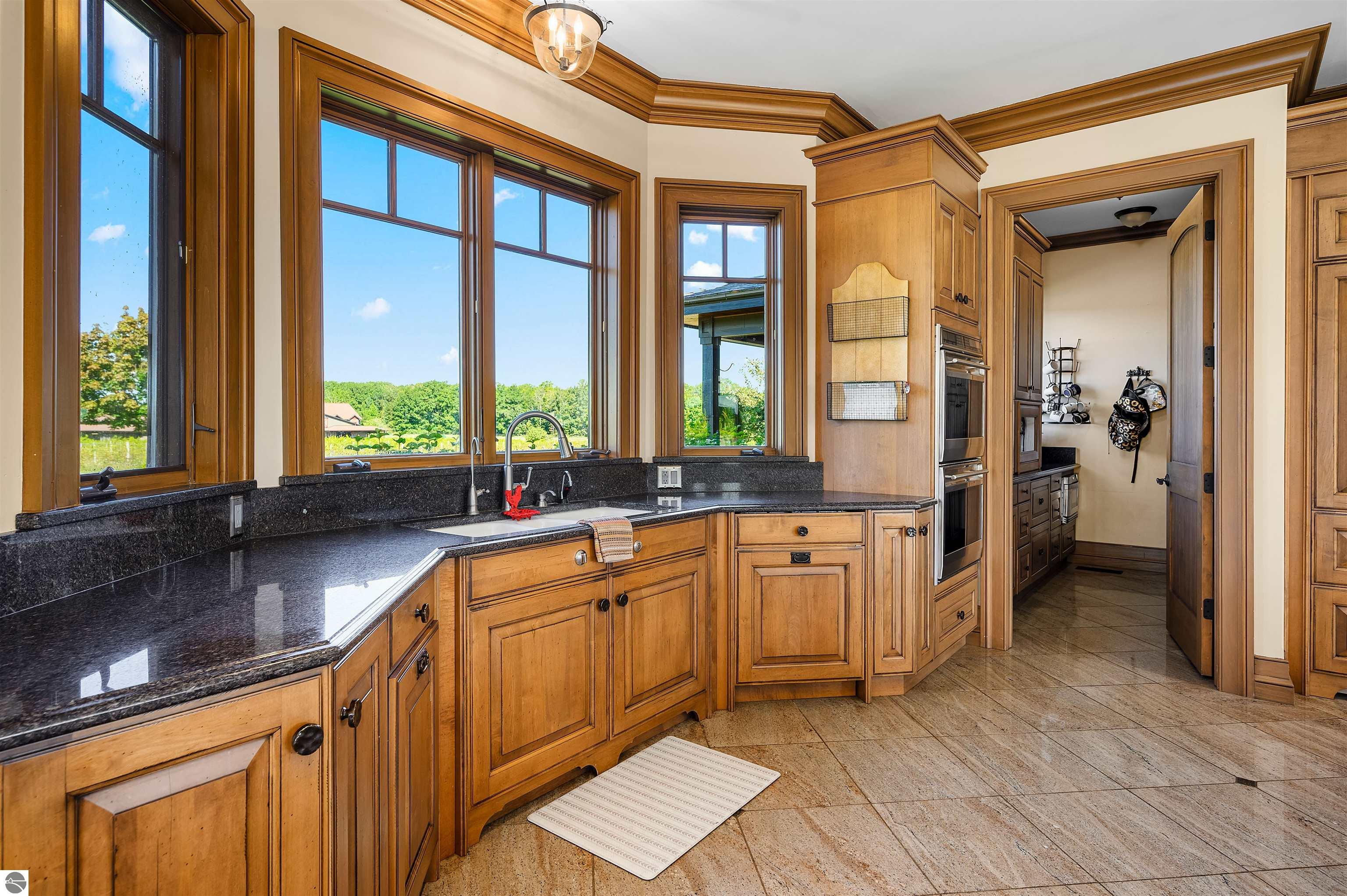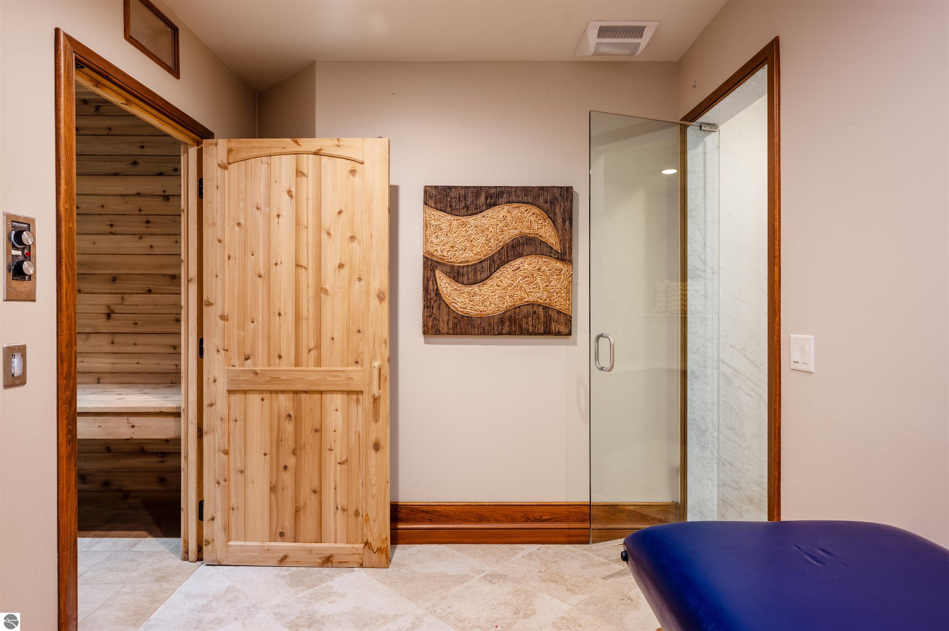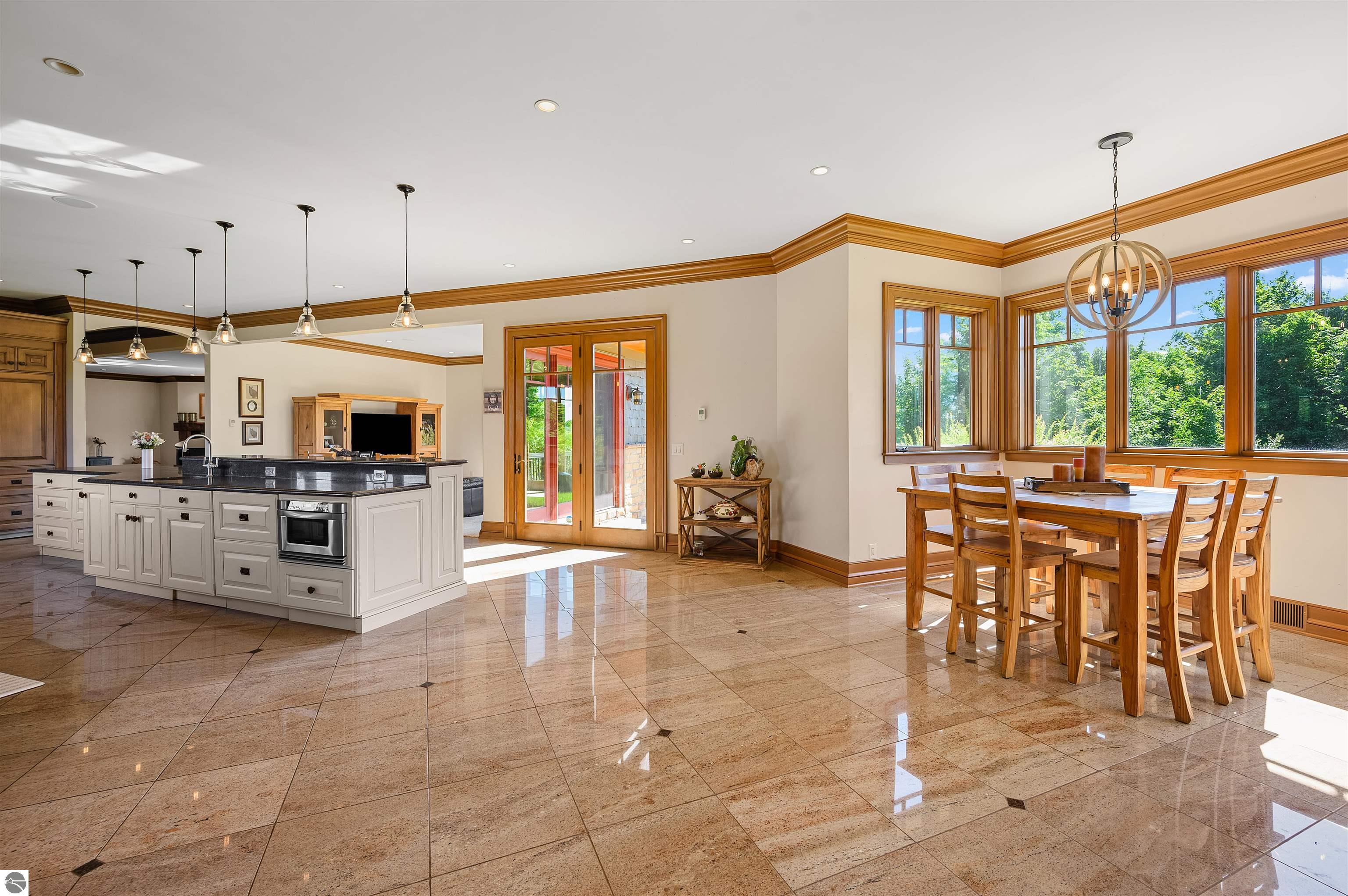 Nestled on the coveted Old Mission Peninsula, this majestic equestrian estate offers breathtaking, panoramic views of East Bay. Just a short distance from one of Michigan's most pristine beaches, this one-of-a-kind property combines luxury, functionality and natural beauty. The home is replete with distinctive, custom amenities, beginning with rich African Teak wood flooring, heated marble floors and custom moldings throughout. Fireplaces grace each level of spacious living rooms adding warmth and charm. The gourmet kitchen, complete with large walk-in pantry, a cozy eat-in nook and attached family room serves as the heart of the home. The adjacent dining room sets the stage for elegant entertaining. This estate offers an abundance of spaces for work, leisure and relaxation. The luxurious primary suite boasts a private sitting area, dual vanities, soaking tub, a spacious walk-in closet, laundry area and a private wrap around balcony overlooking the bay. Perfect for sun and moonrises over the water. The expansive walkout lower floor offers additional living and recreational spaces ideal for hosting gatherings as the doors open to patios and a level backyard lawn. Also included on this level are the theatre room, sauna, large marble steam room, billiards room/bar area, additional office space, indoor sports court, laundry and a large bonus room. Set amid a mature vineyard and apple orchard. This estate is designed for equestrian enthusiasts with a 21 stall barn equipped with living quarters and indoor arena. 3 Ramm-fenced paddocks with run-ins and an additional seven large paddocks. A separate 3 stall stable with fenced pastures is in the northeast corner of the property and provides additional space for horses. Includes a market stand and 3 custom made chicken coops. The versatile potential for horse training, boarding and winemaking makes this a rare to find estate and once-in-a-lifetime opportunity in a highly sought after location.