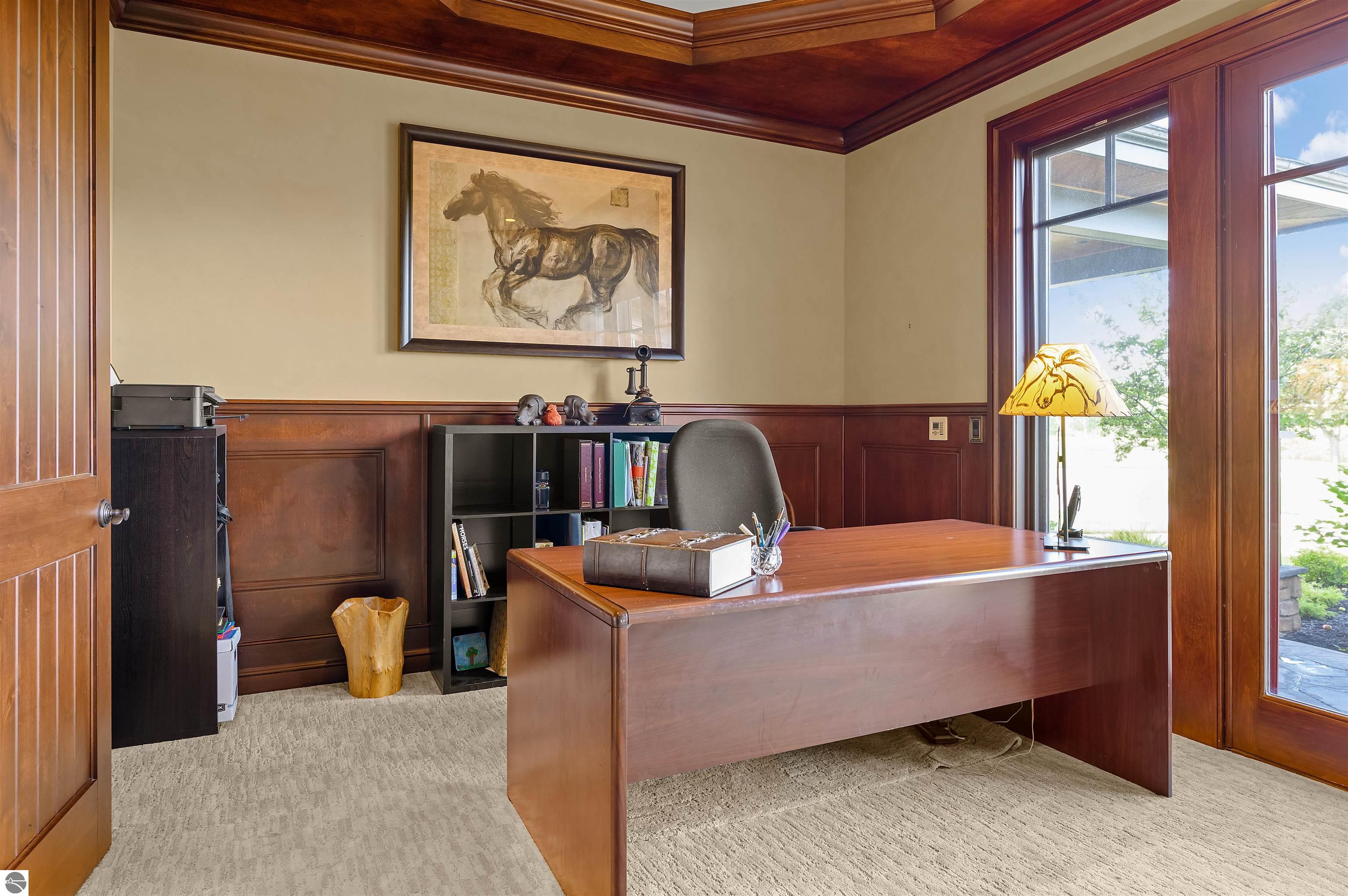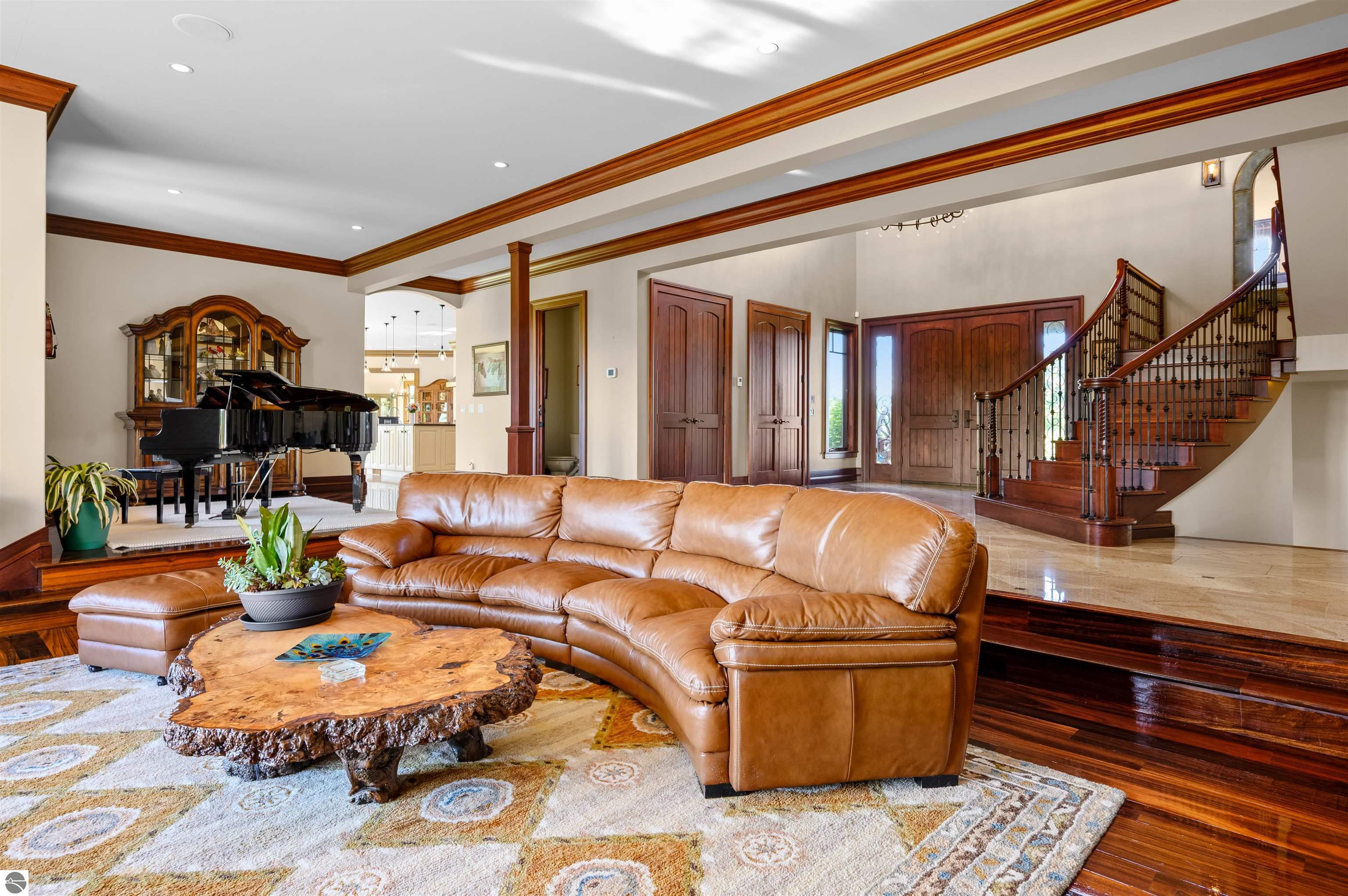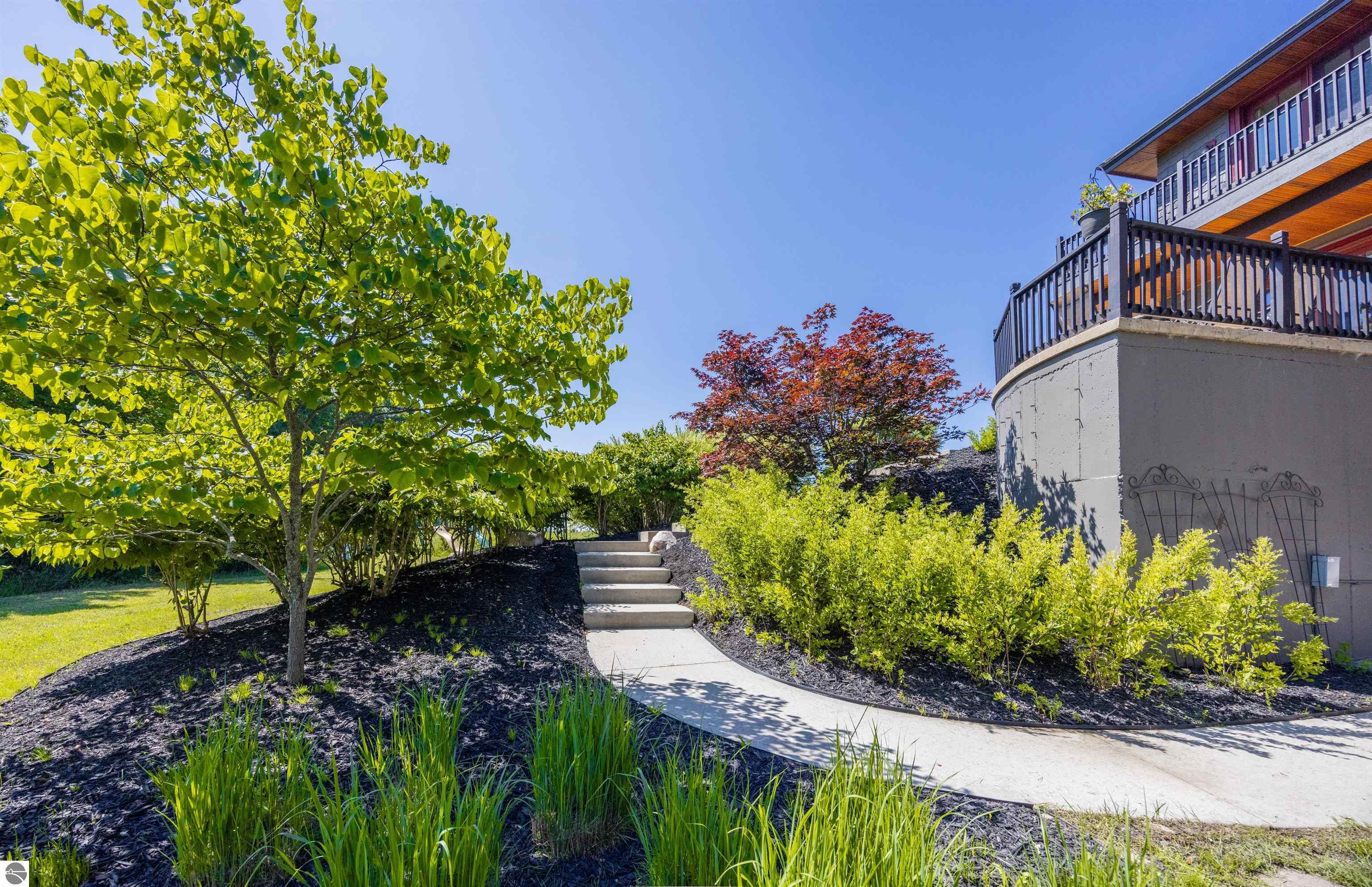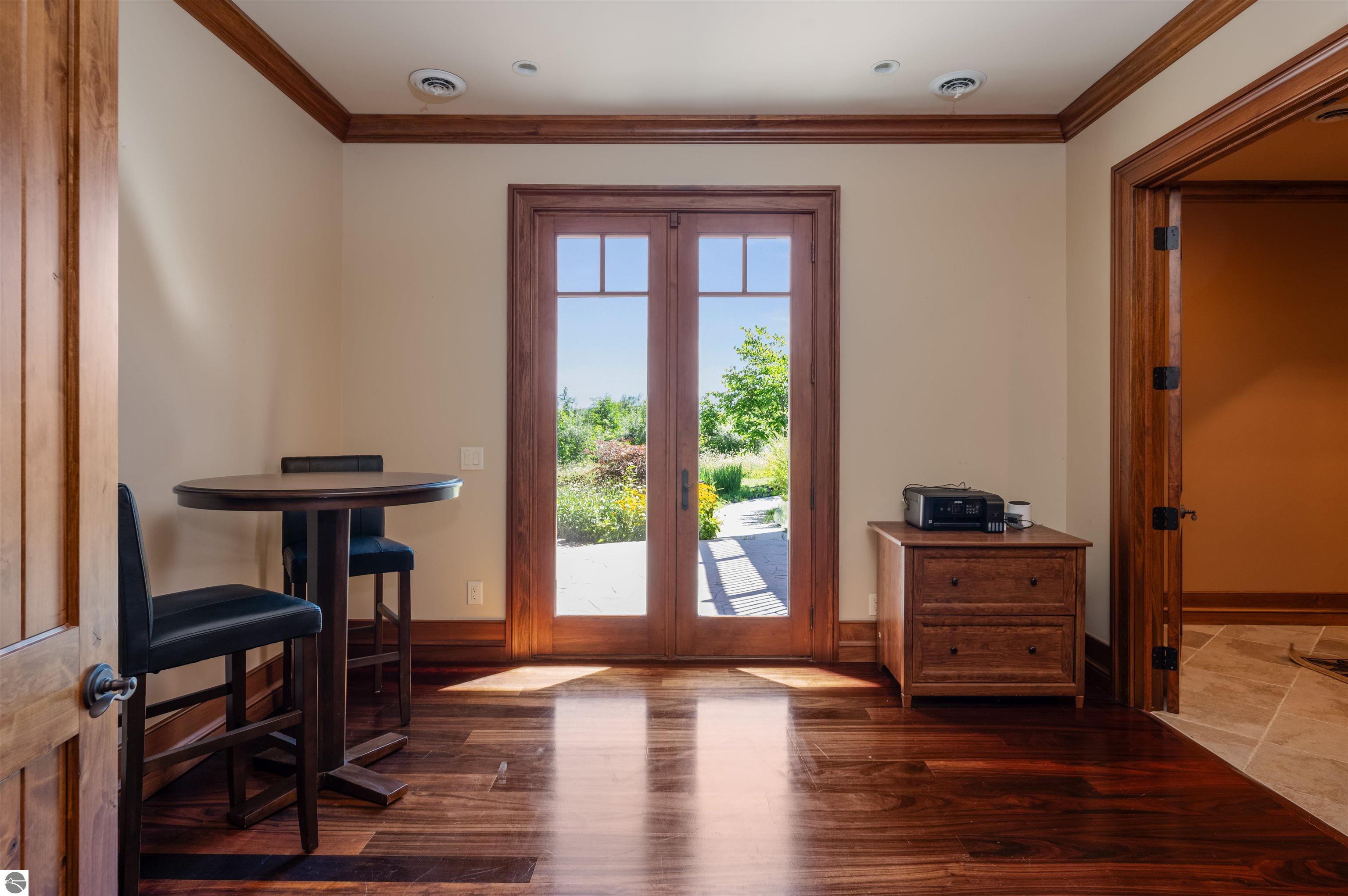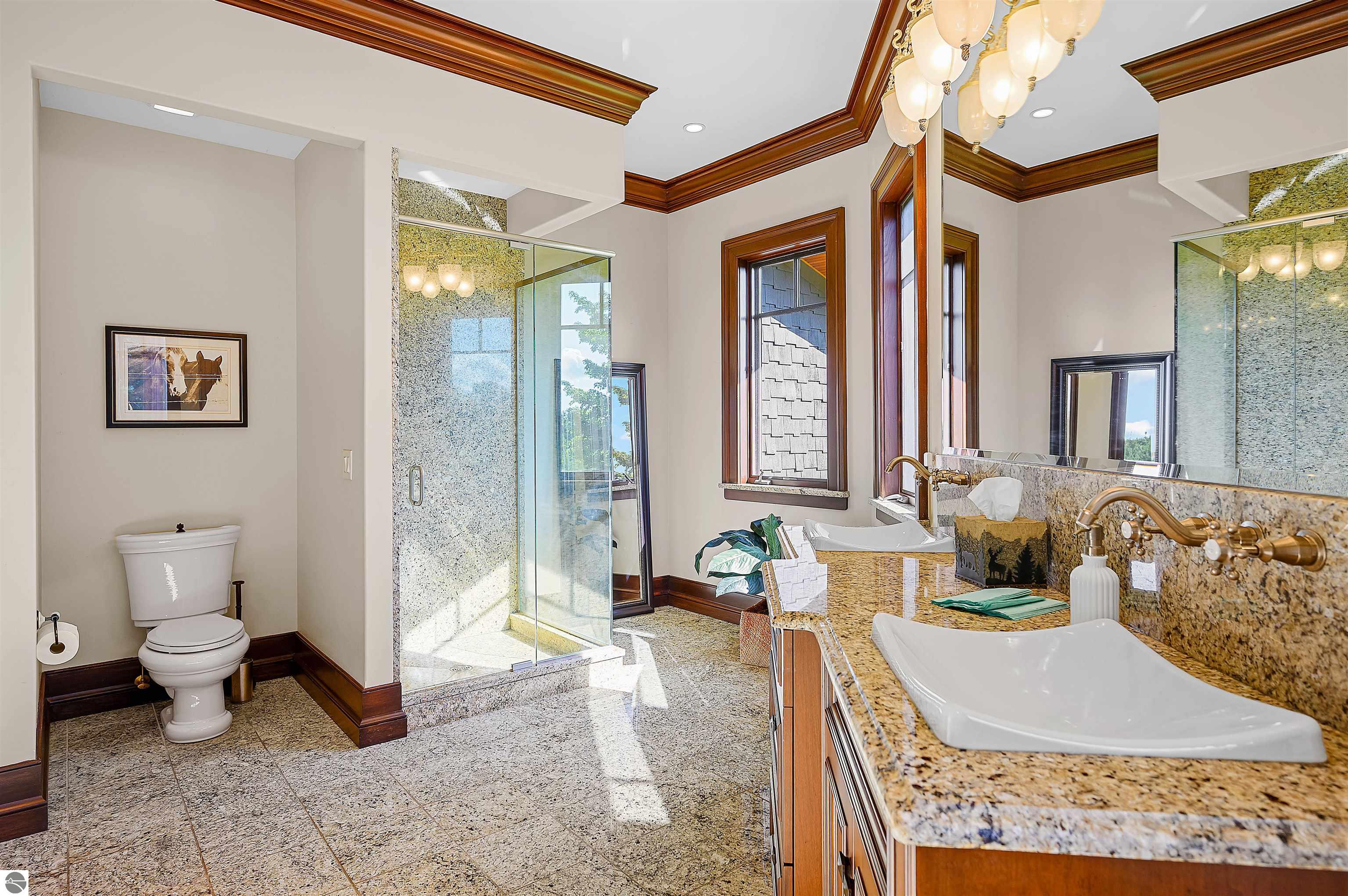 Nestled on the coveted Old Mission Peninsula, this majestic equestrian estate offers breathtaking, panoramic views of East Bay. Just a short distance from one of Michigan's most pristine beaches, this one-of-a-kind property combines luxury, functionality and natural beauty. The home is replete with distinctive, custom amenities, beginning with rich African Teak wood flooring, heated marble floors and custom moldings throughout. Fireplaces grace each level of spacious living rooms adding warmth and charm. The gourmet kitchen, complete with large walk-in pantry, a cozy eat-in nook and attached family room serves as the heart of the home. The adjacent dining room sets the stage for elegant entertaining. This estate offers an abundance of spaces for work, leisure and relaxation. The luxurious primary suite boasts a private sitting area, dual vanities, soaking tub, a spacious walk-in closet, laundry area and a private wrap around balcony overlooking the bay. Perfect for sun and moonrises over the water. The expansive walkout lower floor offers additional living and recreational spaces ideal for hosting gatherings as the doors open to patios and a level backyard lawn. Also included on this level are the theatre room, sauna, large marble steam room, billiards room/bar area, additional office space, indoor sports court, laundry and a large bonus room. Set amid a mature vineyard and apple orchard. This estate is designed for equestrian enthusiasts with a 21 stall barn equipped with living quarters and indoor arena. 3 Ramm-fenced paddocks with run-ins and an additional seven large paddocks. A separate 3 stall stable with fenced pastures is in the northeast corner of the property and provides additional space for horses. Includes a market stand and 3 custom made chicken coops. The versatile potential for horse training, boarding and winemaking makes this a rare to find estate and once-in-a-lifetime opportunity in a highly sought after location.