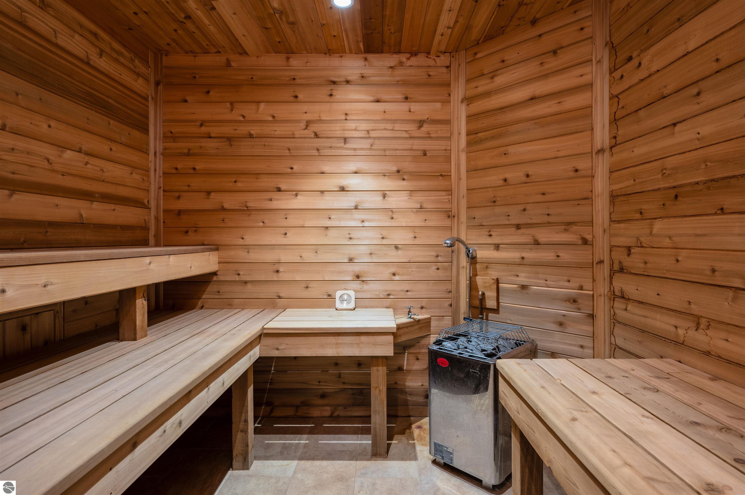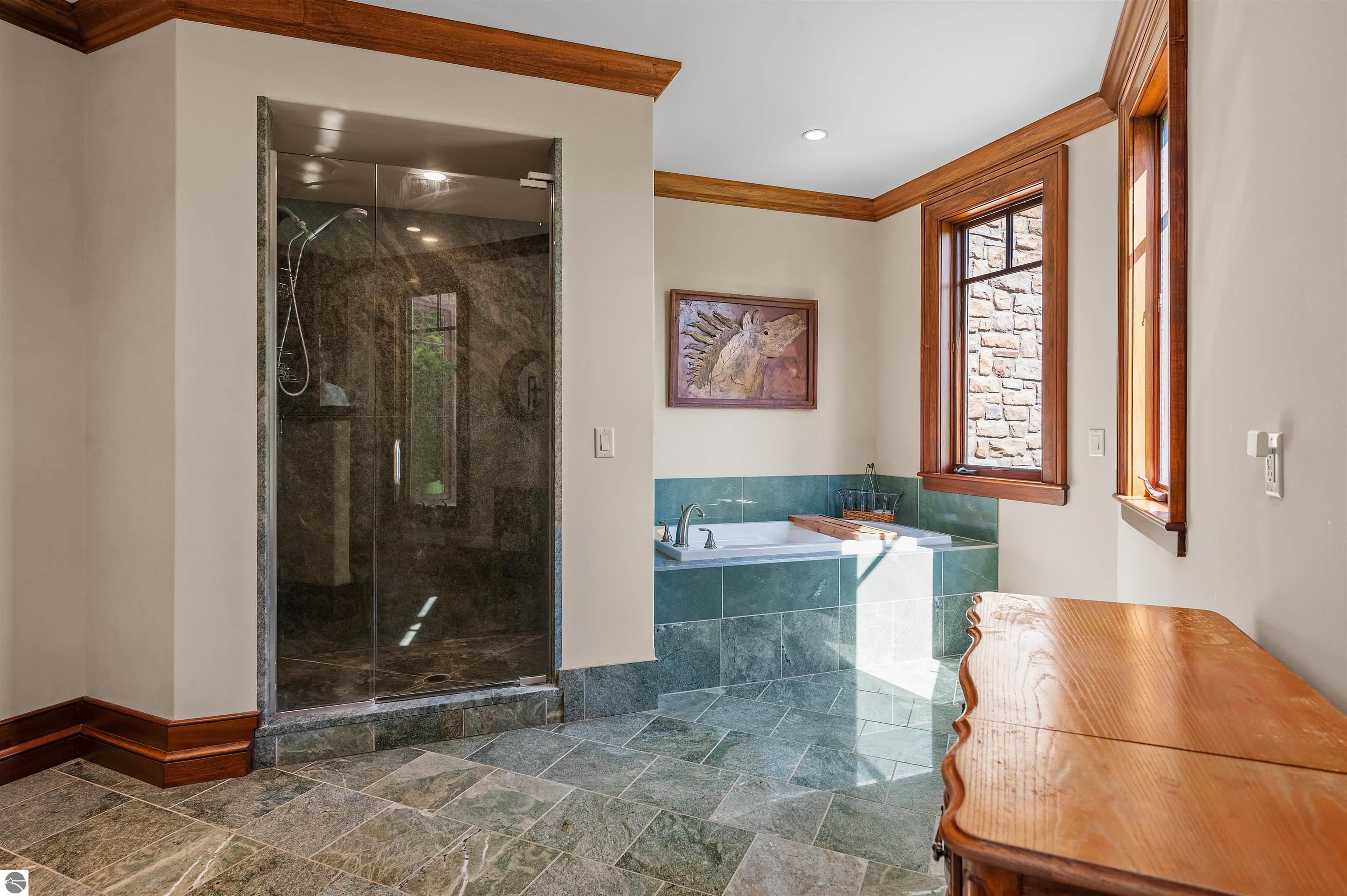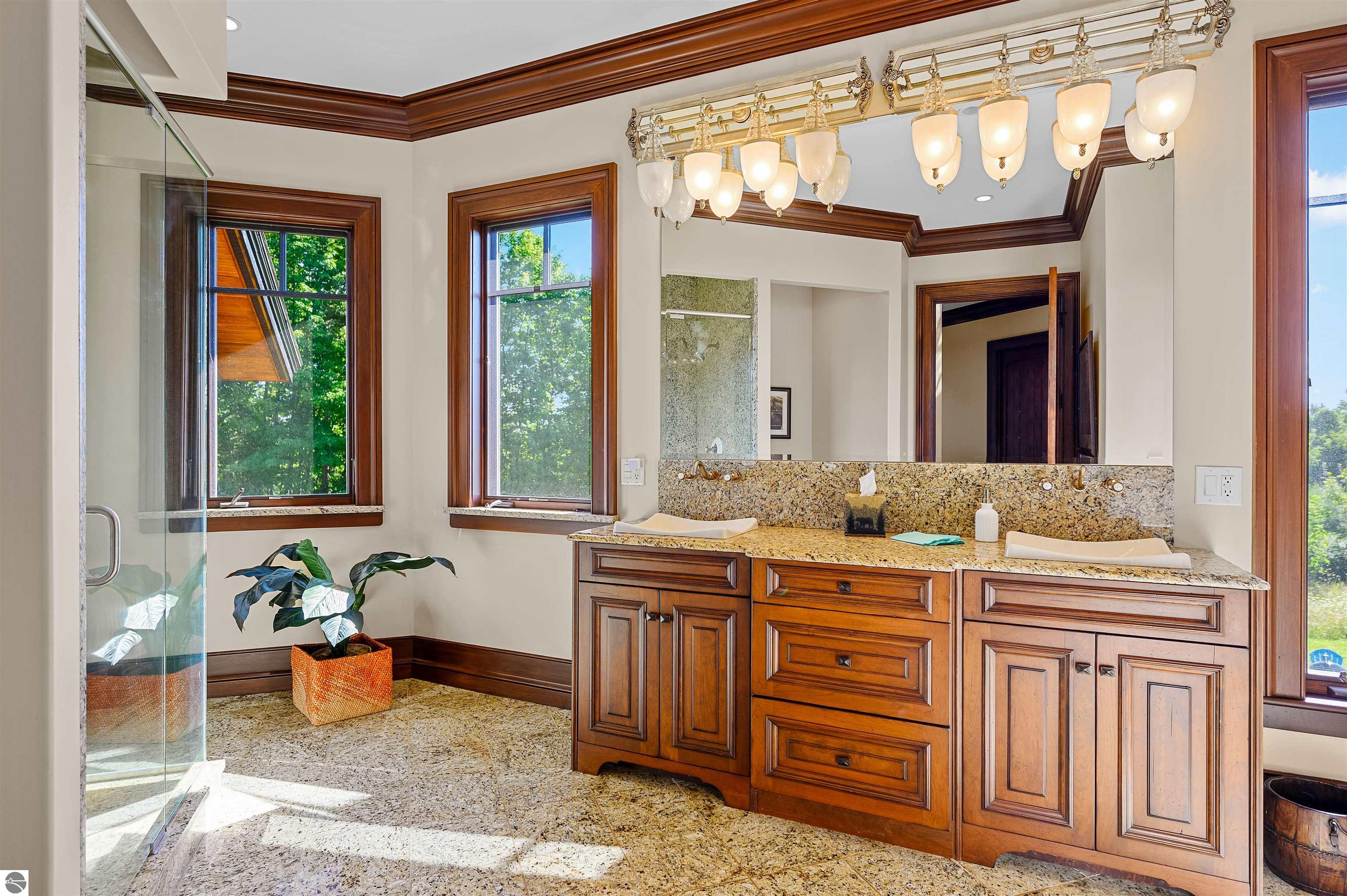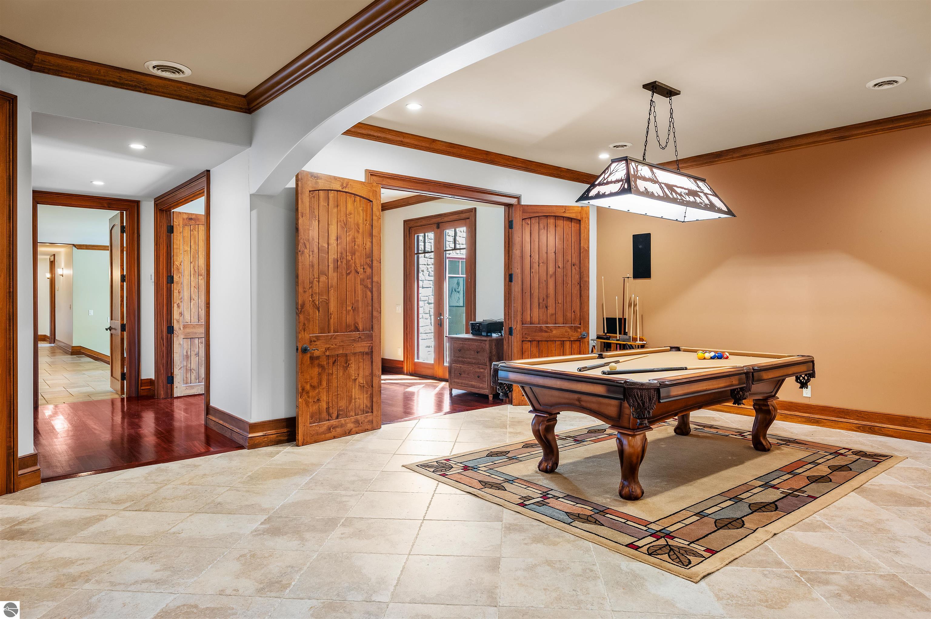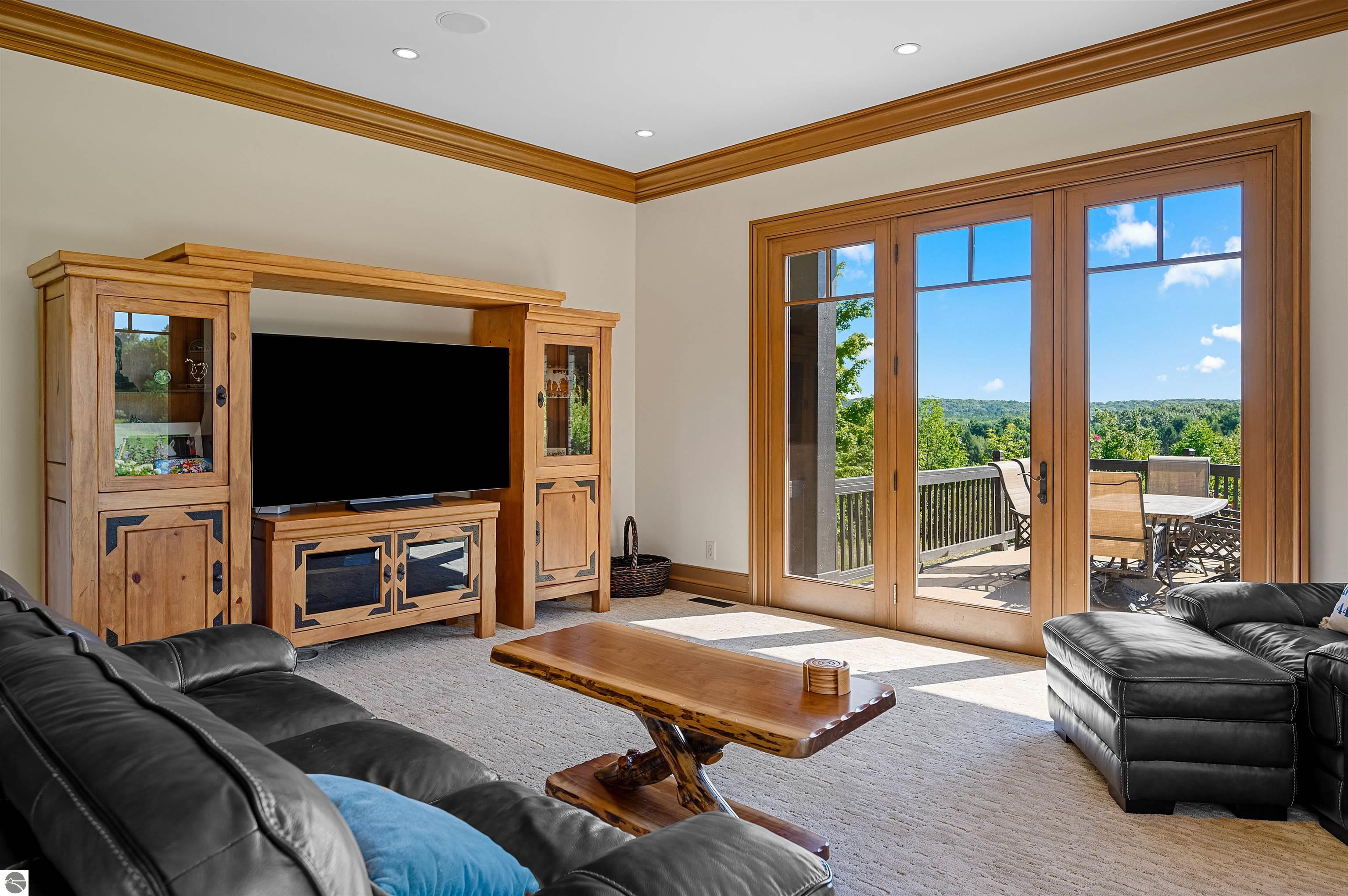 Nestled on the coveted Old Mission Peninsula, this majestic equestrian estate offers breathtaking, panoramic views of East Bay. Just a short distance from one of Michigan's most pristine beaches, this one-of-a-kind property combines luxury, functionality and natural beauty. The home is replete with distinctive, custom amenities, beginning with rich African Teak wood flooring, heated marble floors and custom moldings throughout. Fireplaces grace each level of spacious living rooms adding warmth and charm. The gourmet kitchen, complete with large walk-in pantry, a cozy eat-in nook and attached family room serves as the heart of the home. The adjacent dining room sets the stage for elegant entertaining. This estate offers an abundance of spaces for work, leisure and relaxation. The luxurious primary suite boasts a private sitting area, dual vanities, soaking tub, a spacious walk-in closet, laundry area and a private wrap around balcony overlooking the bay. Perfect for sun and moonrises over the water. The expansive walkout lower floor offers additional living and recreational spaces ideal for hosting gatherings as the doors open to patios and a level backyard lawn. Also included on this level are the theatre room, sauna, large marble steam room, billiards room/bar area, additional office space, indoor sports court, laundry and a large bonus room. Set amid a mature vineyard and apple orchard. This estate is designed for equestrian enthusiasts with a 21 stall barn equipped with living quarters and indoor arena. 3 Ramm-fenced paddocks with run-ins and an additional seven large paddocks. A separate 3 stall stable with fenced pastures is in the northeast corner of the property and provides additional space for horses. Includes a market stand and 3 custom made chicken coops. The versatile potential for horse training, boarding and winemaking makes this a rare to find estate and once-in-a-lifetime opportunity in a highly sought after location.