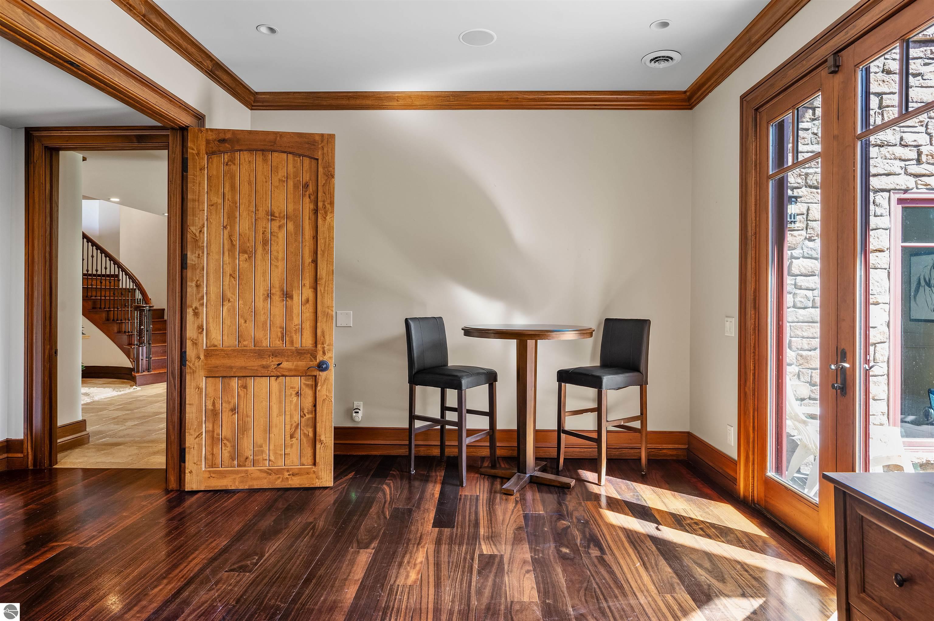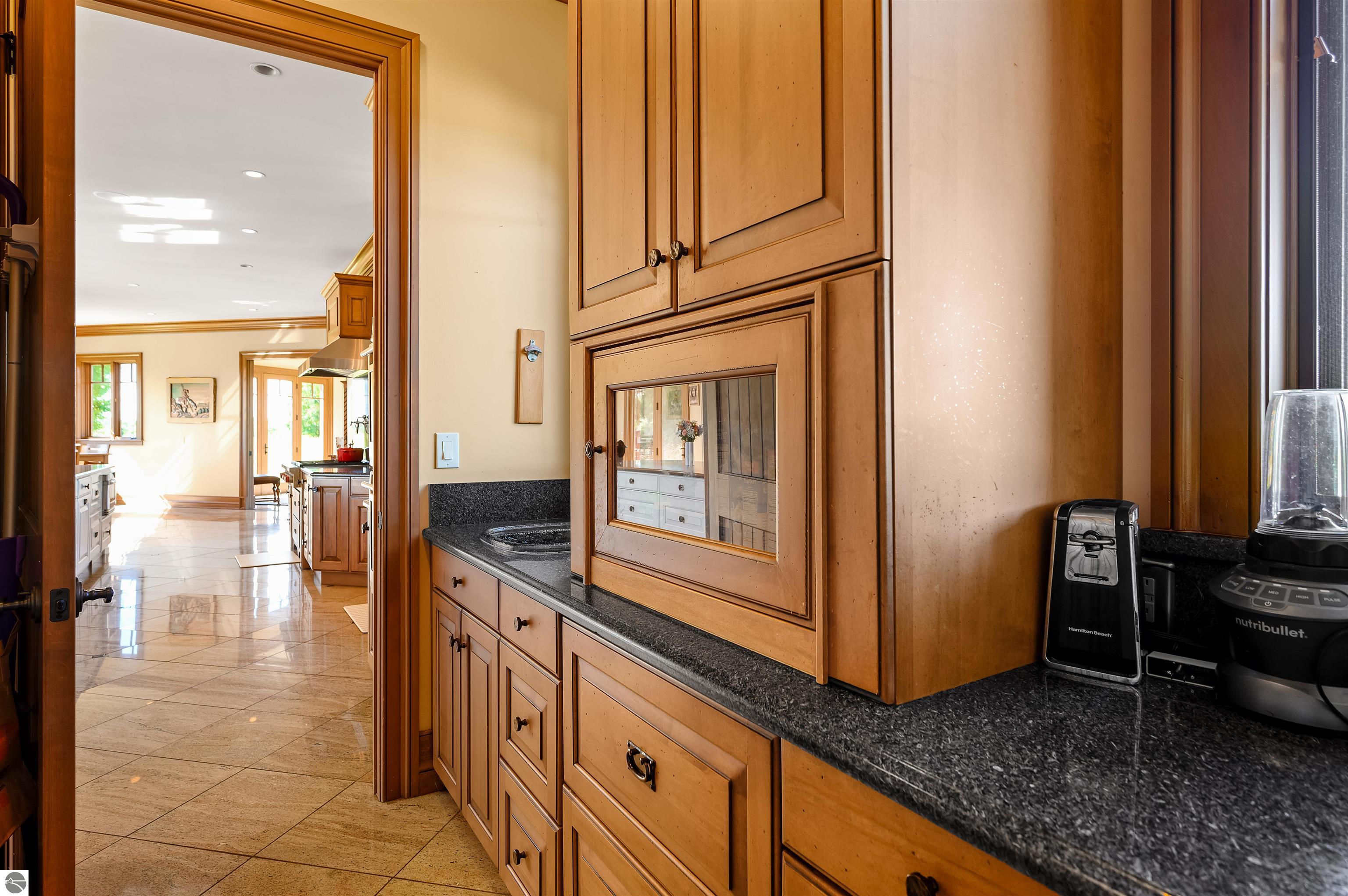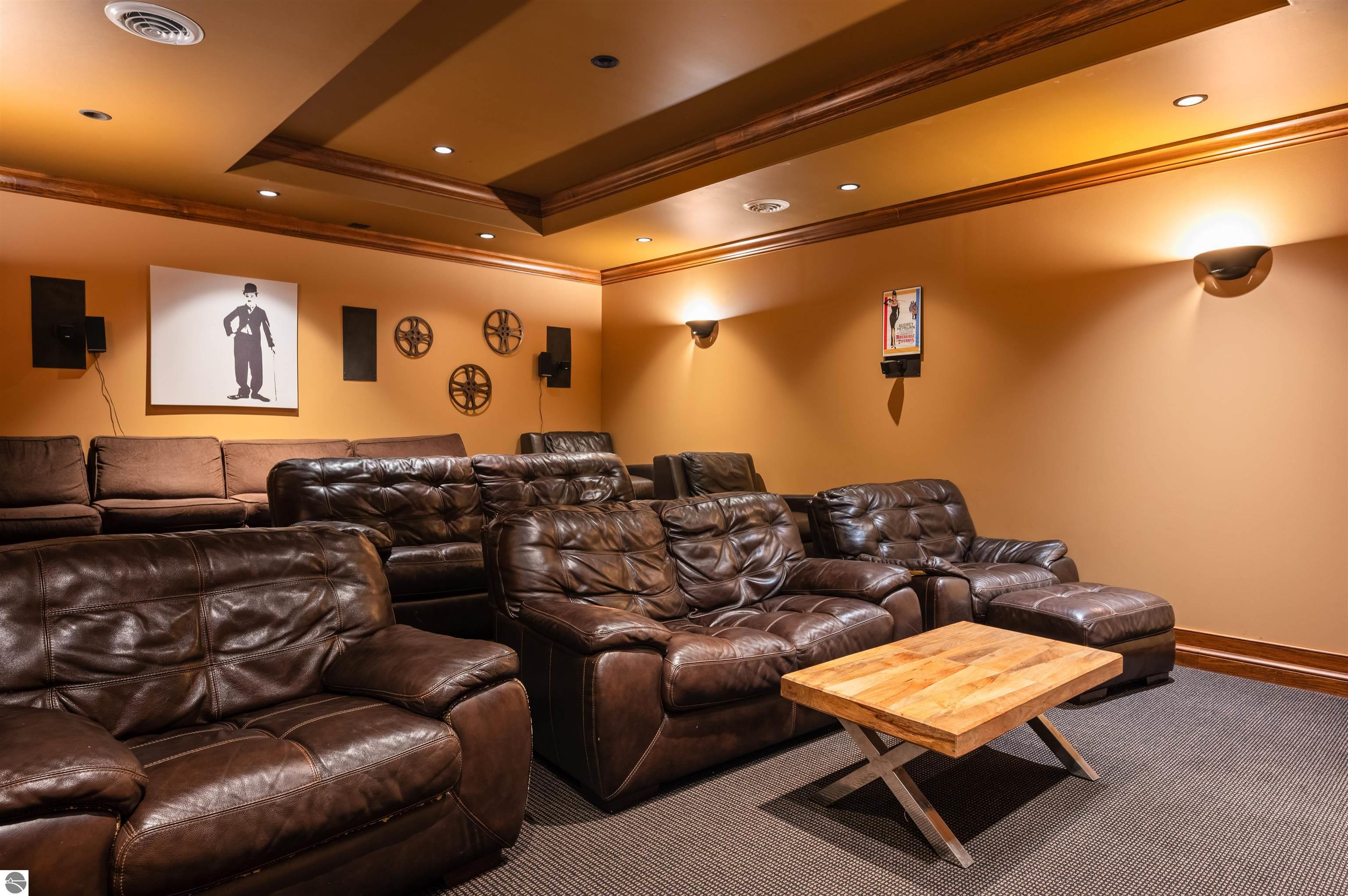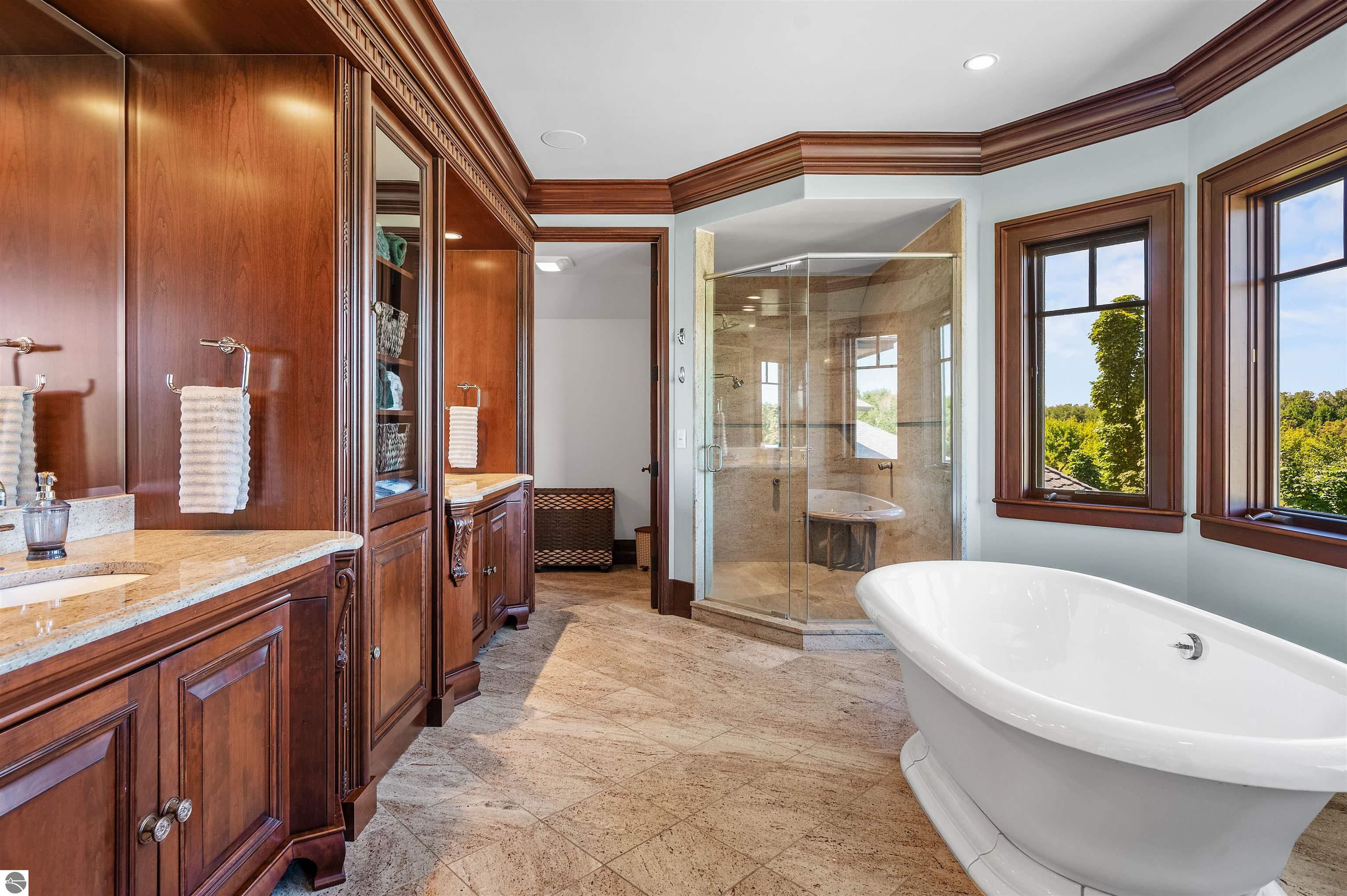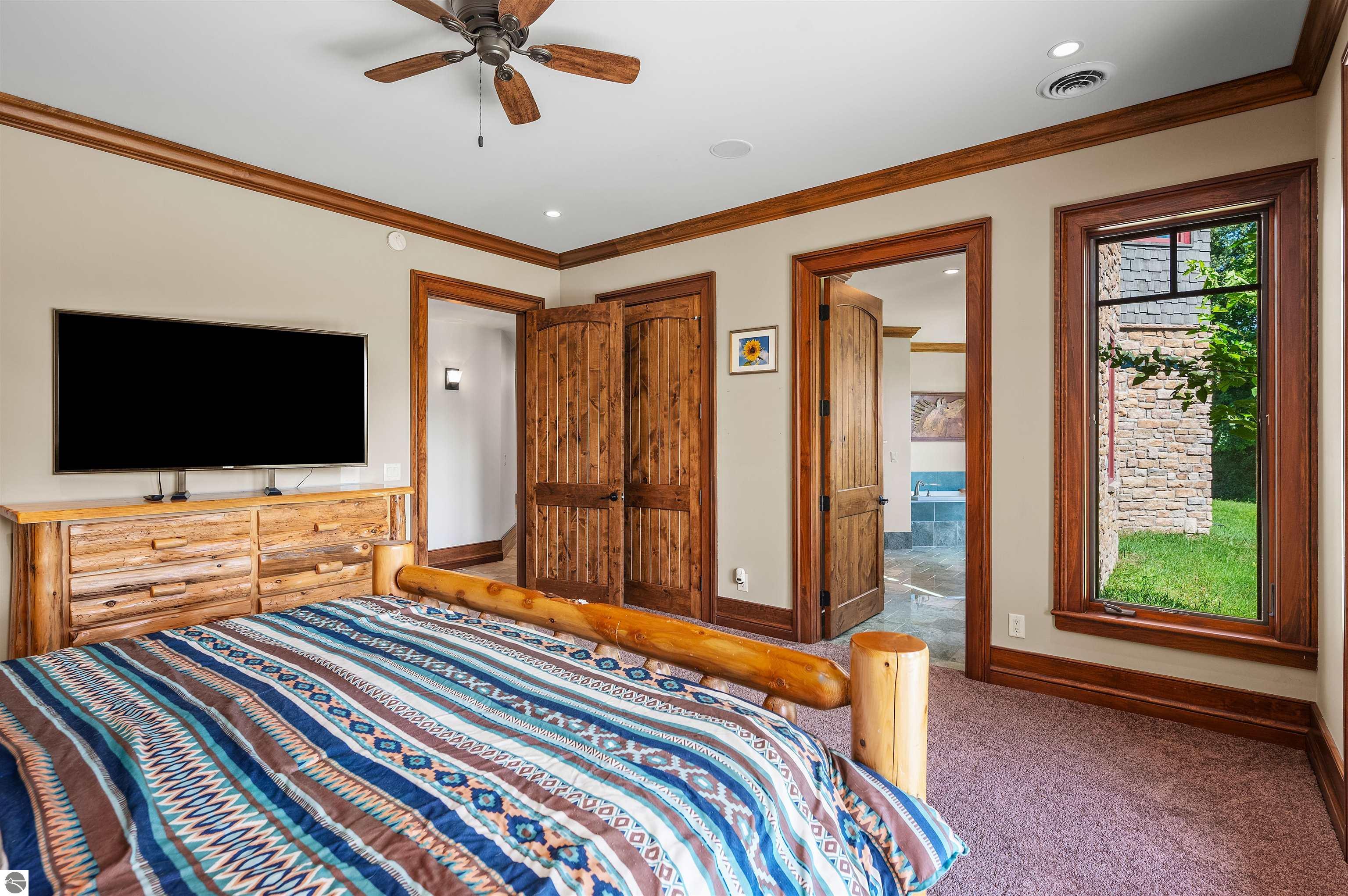 Nestled on the coveted Old Mission Peninsula, this majestic equestrian estate offers breathtaking, panoramic views of East Bay. Just a short distance from one of Michigan's most pristine beaches, this one-of-a-kind property combines luxury, functionality and natural beauty. The home is replete with distinctive, custom amenities, beginning with rich African Teak wood flooring, heated marble floors and custom moldings throughout. Fireplaces grace each level of spacious living rooms adding warmth and charm. The gourmet kitchen, complete with large walk-in pantry, a cozy eat-in nook and attached family room serves as the heart of the home. The adjacent dining room sets the stage for elegant entertaining. This estate offers an abundance of spaces for work, leisure and relaxation. The luxurious primary suite boasts a private sitting area, dual vanities, soaking tub, a spacious walk-in closet, laundry area and a private wrap around balcony overlooking the bay. Perfect for sun and moonrises over the water. The expansive walkout lower floor offers additional living and recreational spaces ideal for hosting gatherings as the doors open to patios and a level backyard lawn. Also included on this level are the theatre room, sauna, large marble steam room, billiards room/bar area, additional office space, indoor sports court, laundry and a large bonus room. Set amid a mature vineyard and apple orchard. This estate is designed for equestrian enthusiasts with a 21 stall barn equipped with living quarters and indoor arena. 3 Ramm-fenced paddocks with run-ins and an additional seven large paddocks. A separate 3 stall stable with fenced pastures is in the northeast corner of the property and provides additional space for horses. Includes a market stand and 3 custom made chicken coops. The versatile potential for horse training, boarding and winemaking makes this a rare to find estate and once-in-a-lifetime opportunity in a highly sought after location.