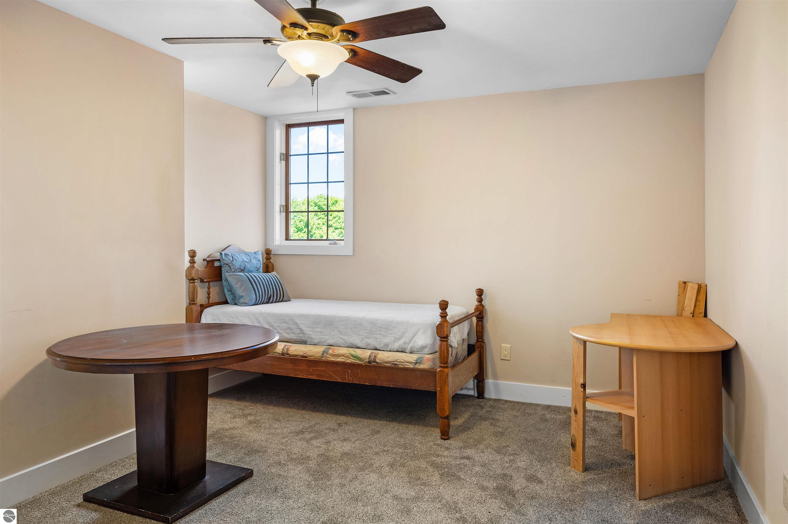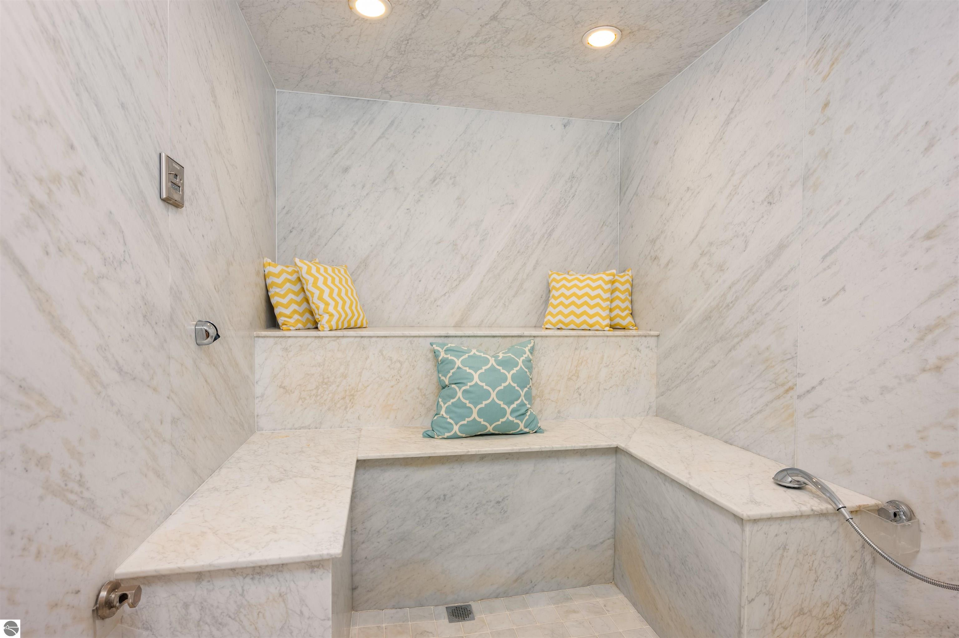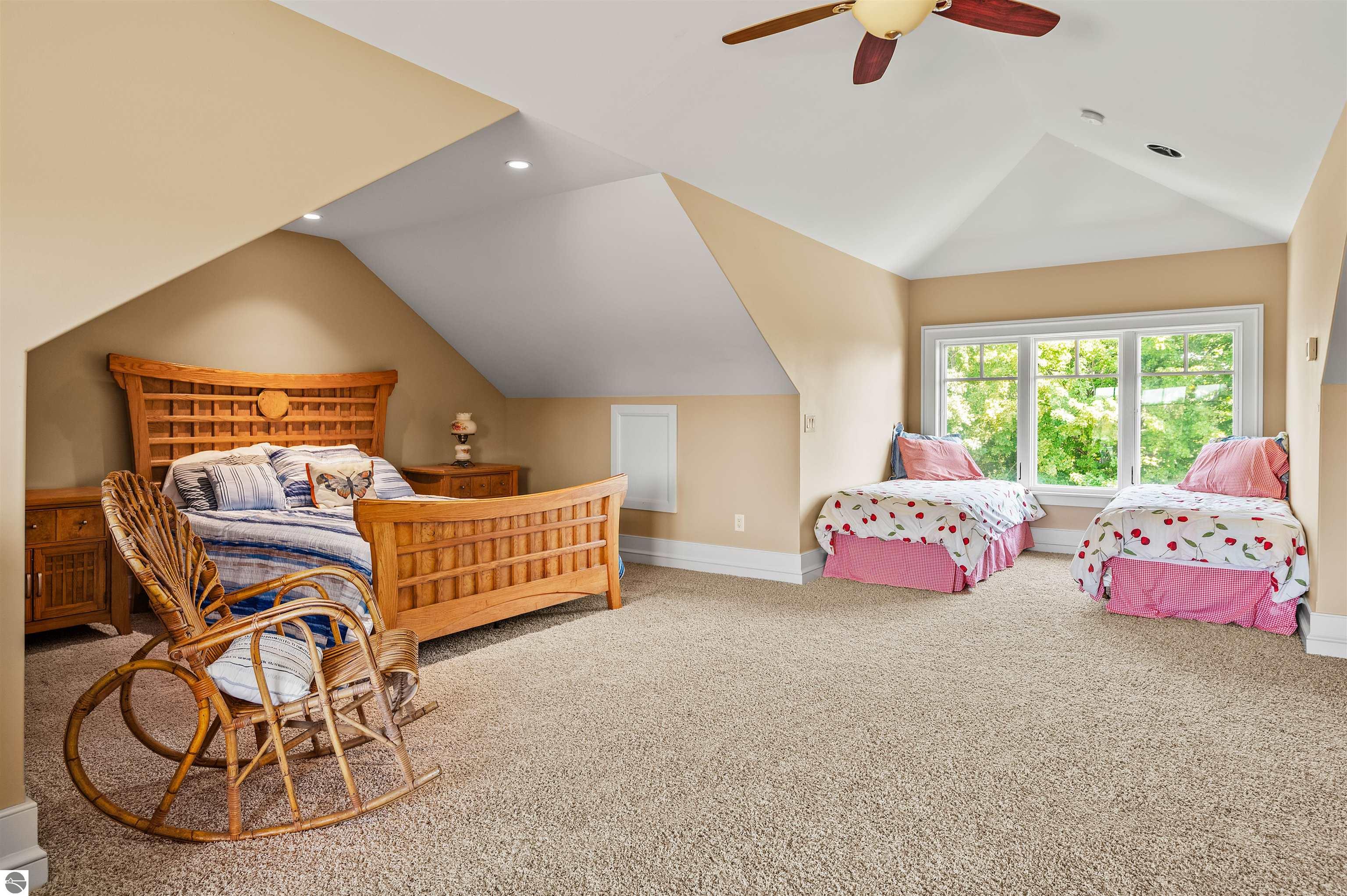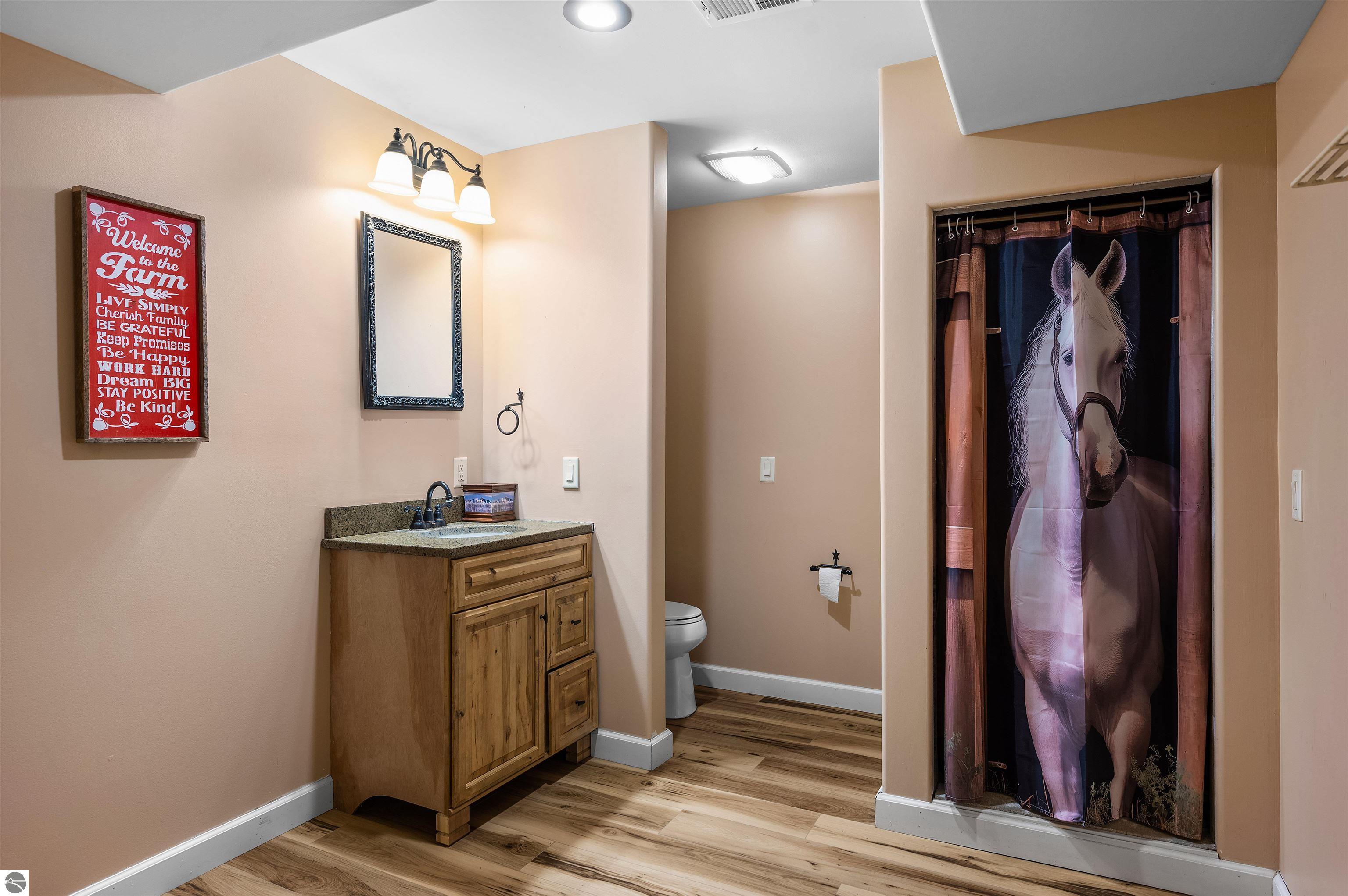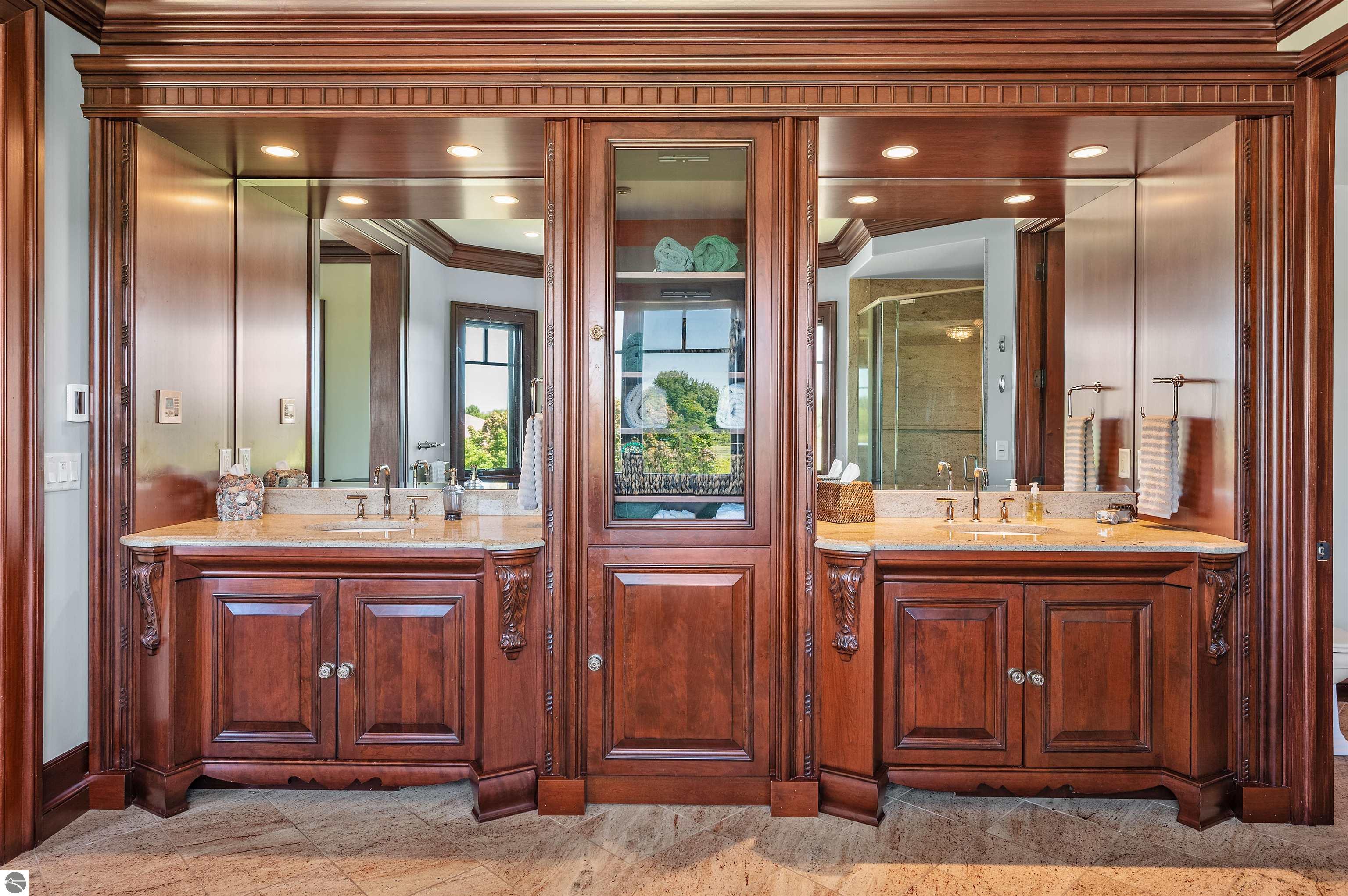 Nestled on the coveted Old Mission Peninsula, this majestic equestrian estate offers breathtaking, panoramic views of East Bay. Just a short distance from one of Michigan's most pristine beaches, this one-of-a-kind property combines luxury, functionality and natural beauty. The home is replete with distinctive, custom amenities, beginning with rich African Teak wood flooring, heated marble floors and custom moldings throughout. Fireplaces grace each level of spacious living rooms adding warmth and charm. The gourmet kitchen, complete with large walk-in pantry, a cozy eat-in nook and attached family room serves as the heart of the home. The adjacent dining room sets the stage for elegant entertaining. This estate offers an abundance of spaces for work, leisure and relaxation. The luxurious primary suite boasts a private sitting area, dual vanities, soaking tub, a spacious walk-in closet, laundry area and a private wrap around balcony overlooking the bay. Perfect for sun and moonrises over the water. The expansive walkout lower floor offers additional living and recreational spaces ideal for hosting gatherings as the doors open to patios and a level backyard lawn. Also included on this level are the theatre room, sauna, large marble steam room, billiards room/bar area, additional office space, indoor sports court, laundry and a large bonus room. Set amid a mature vineyard and apple orchard. This estate is designed for equestrian enthusiasts with a 21 stall barn equipped with living quarters and indoor arena. 3 Ramm-fenced paddocks with run-ins and an additional seven large paddocks. A separate 3 stall stable with fenced pastures is in the northeast corner of the property and provides additional space for horses. Includes a market stand and 3 custom made chicken coops. The versatile potential for horse training, boarding and winemaking makes this a rare to find estate and once-in-a-lifetime opportunity in a highly sought after location.