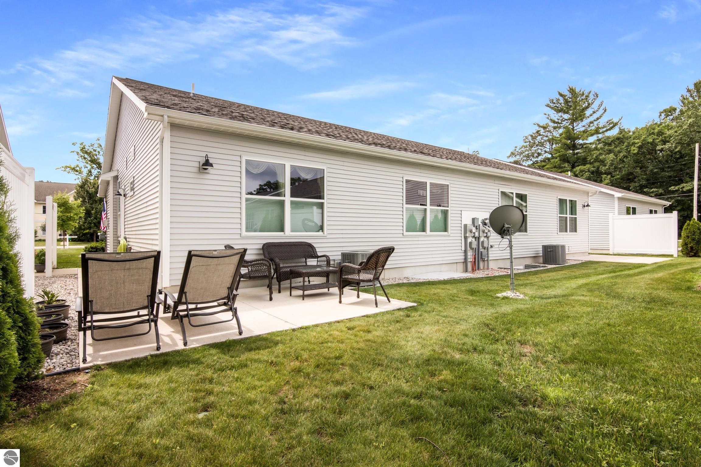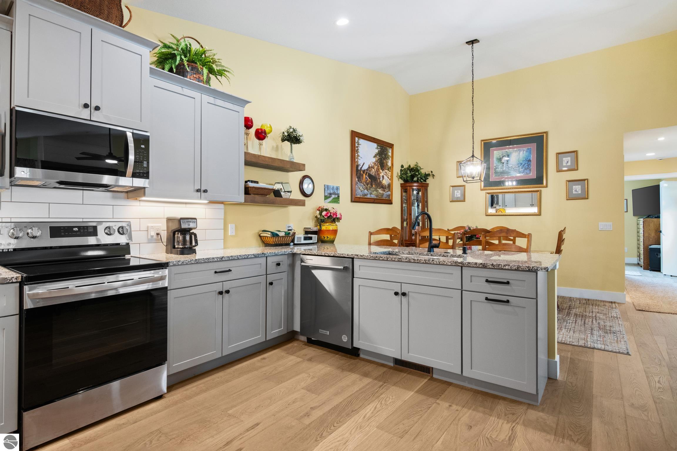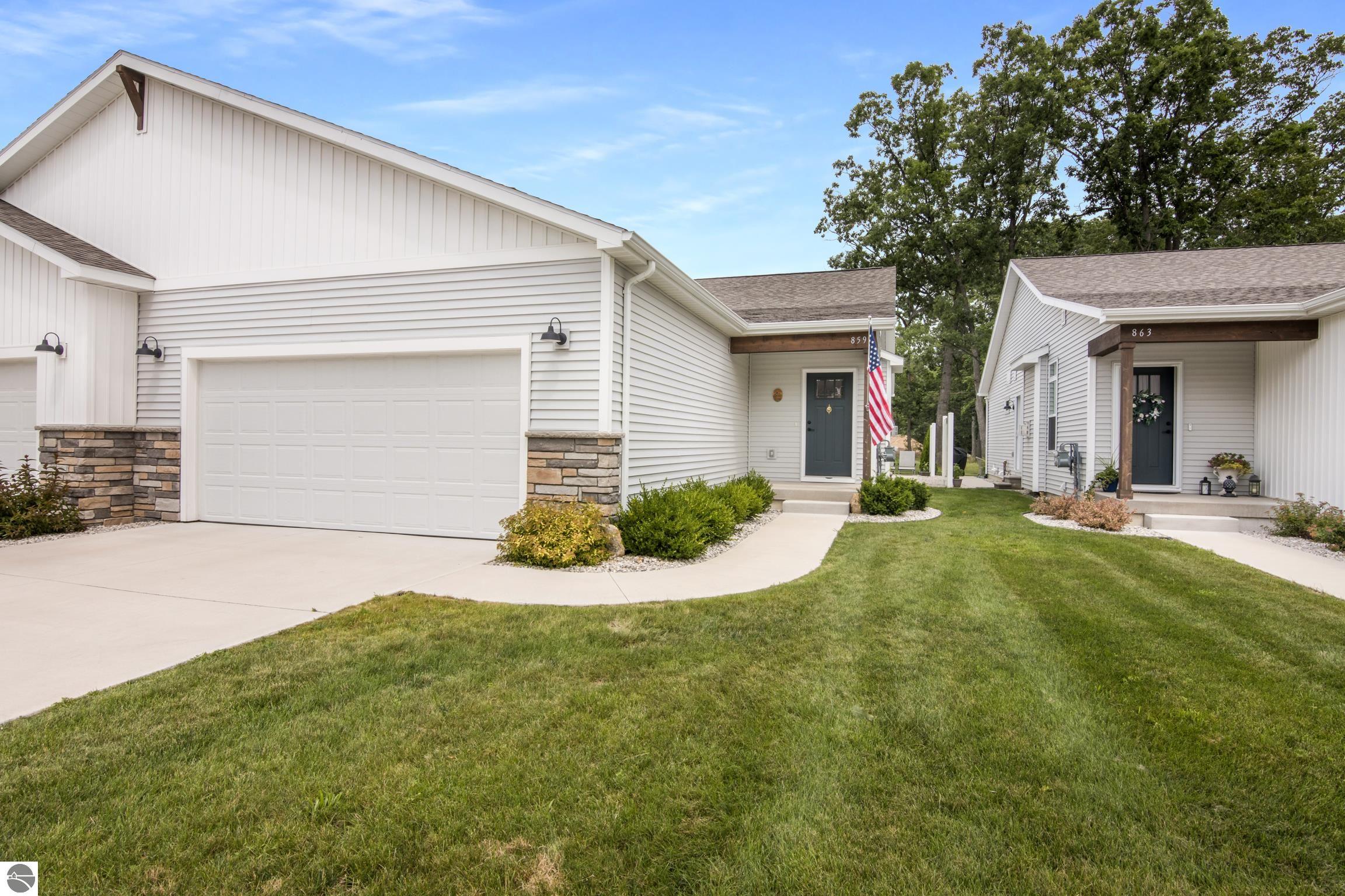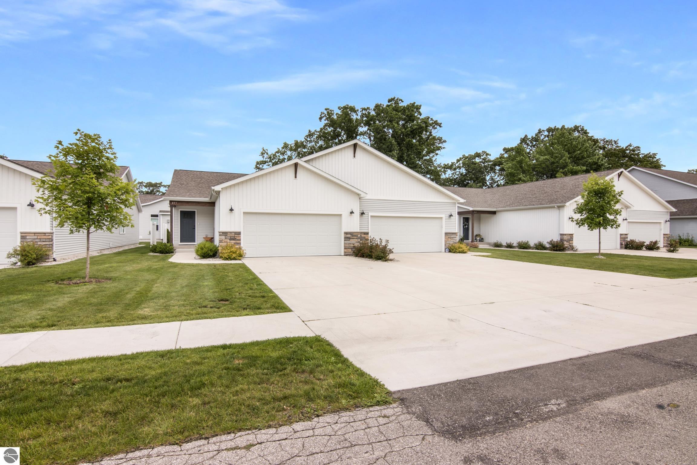 Experience modern living in this 2023-built condo, ideally located minutes from downtown Traverse City, the airport, beaches, and the public library. The light-filled, open floor plan showcases vaulted ceilings, engineered hardwood flooring on the main level and luxury vinyl in the lower level along with a welcoming gas fireplace in the living area on the main level. The main level features two bedrooms—including a private primary suite with a spa-inspired en-suite bath featuring high-end glass shower doors—plus convenient main-floor laundry. The spacious kitchen shines with custom pull-out cabinetry and upgraded appliances, seamlessly connecting to the living and dining areas for easy entertaining. A finished lower level adds a spacious multi-use room and an additional bedroom, perfect for guests or a home office. Many more upgrades & custom materials added by seller during construction. Enjoy the attached two-car garage and beautifully landscaped private courtyard park, or stroll to nearby restaurants, amenities, and the TC Curling Club.