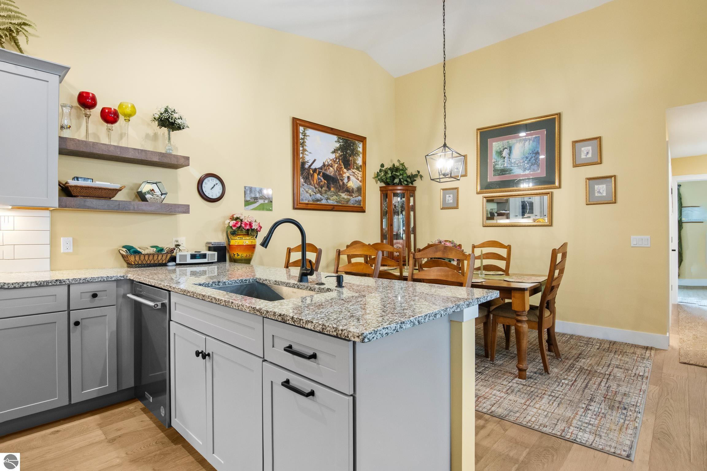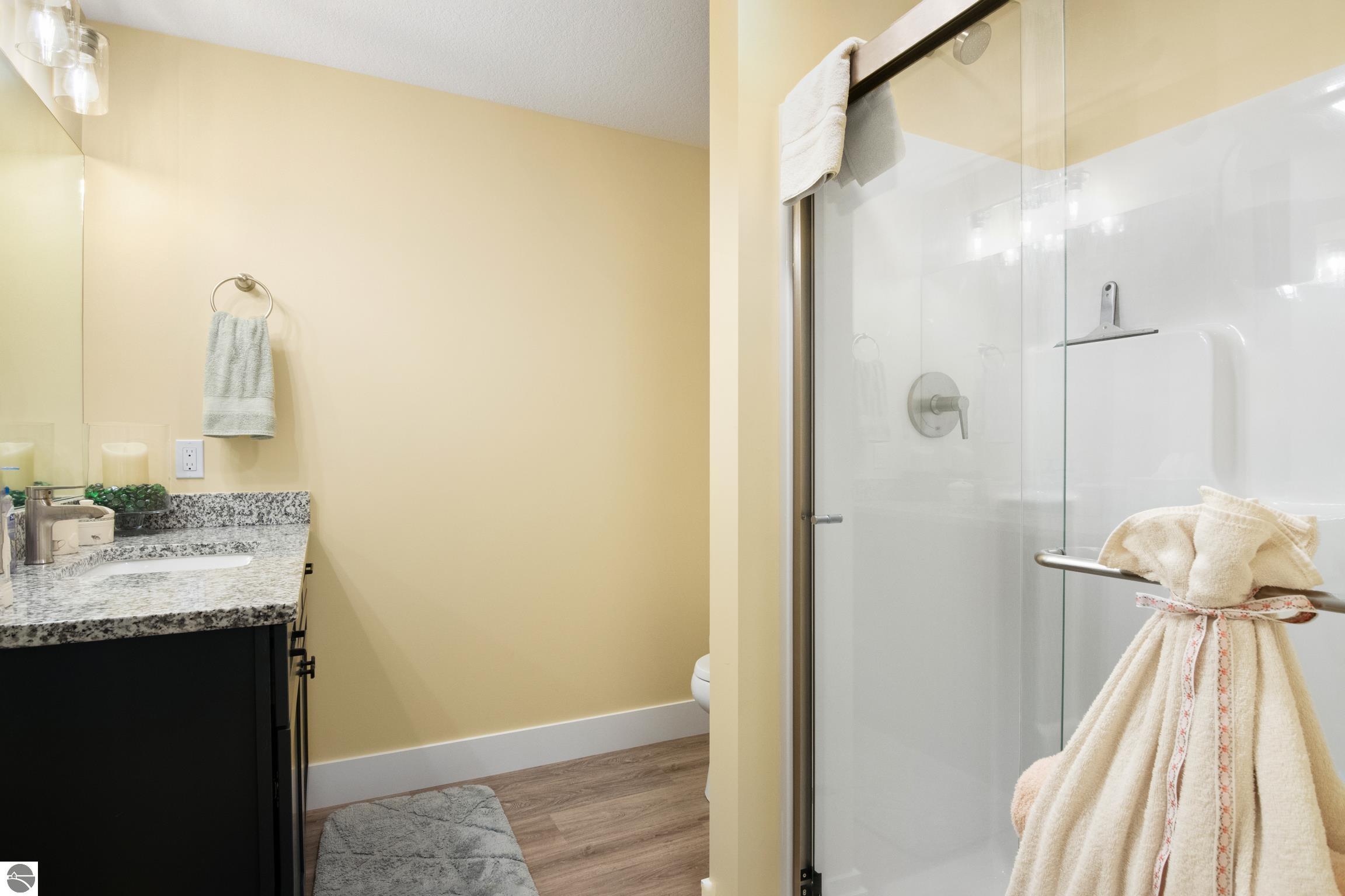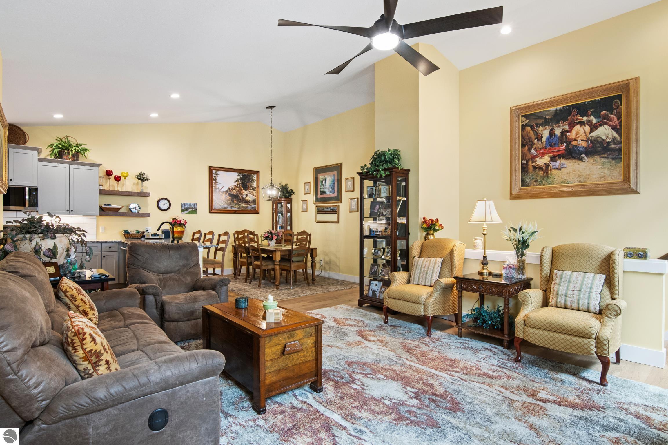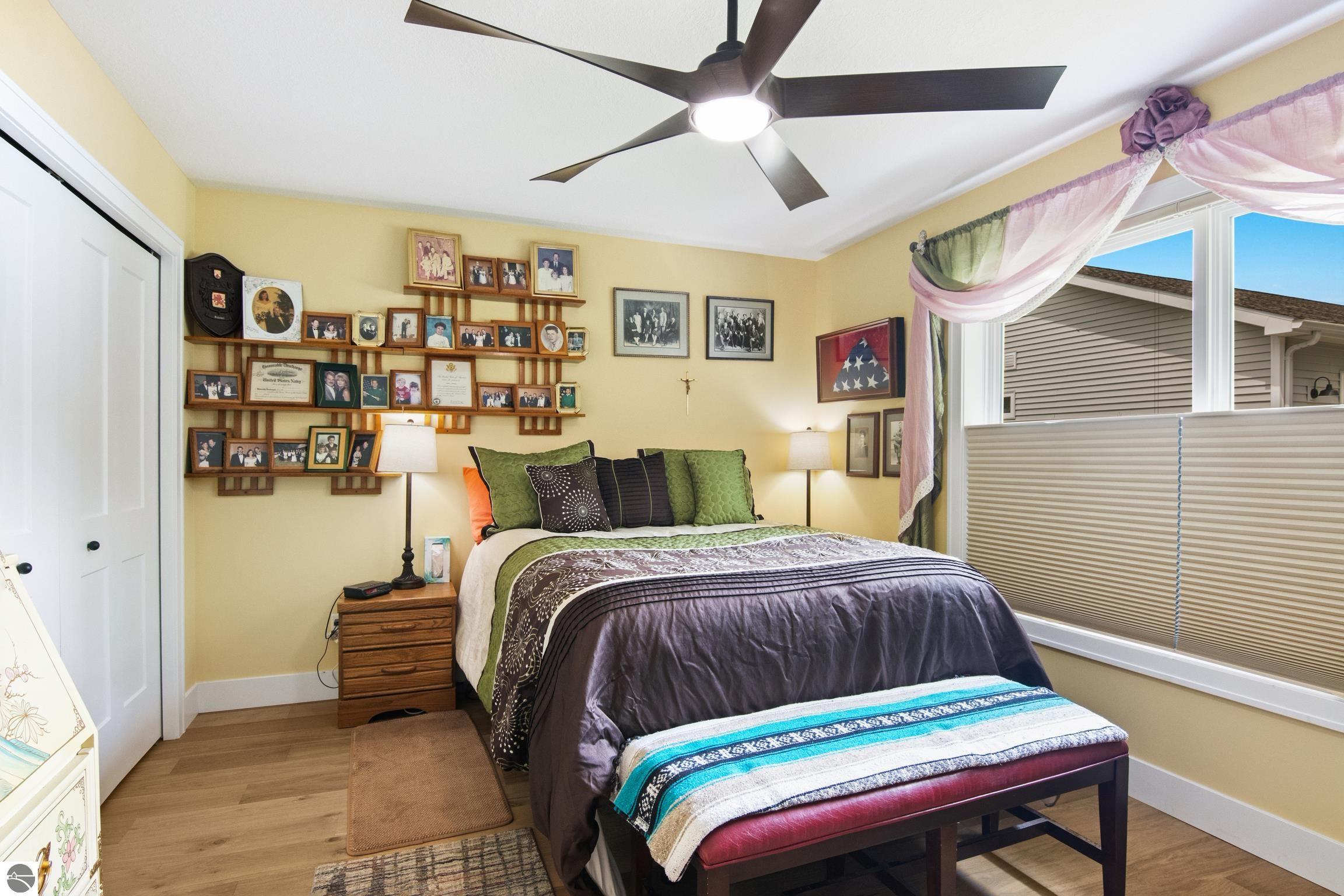 Experience modern living in this 2023-built condo, ideally located minutes from downtown Traverse City, the airport, beaches, and the public library. The light-filled, open floor plan showcases vaulted ceilings, engineered hardwood flooring on the main level and luxury vinyl in the lower level along with a welcoming gas fireplace in the living area on the main level. The main level features two bedrooms—including a private primary suite with a spa-inspired en-suite bath featuring high-end glass shower doors—plus convenient main-floor laundry. The spacious kitchen shines with custom pull-out cabinetry and upgraded appliances, seamlessly connecting to the living and dining areas for easy entertaining. A finished lower level adds a spacious multi-use room and an additional bedroom, perfect for guests or a home office. Many more upgrades & custom materials added by seller during construction. Enjoy the attached two-car garage and beautifully landscaped private courtyard park, or stroll to nearby restaurants, amenities, and the TC Curling Club.