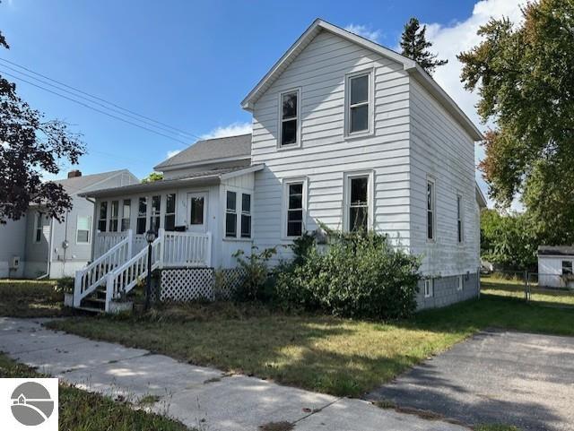 Awesome Location to downtown East Tawas and Tawas Bay!! Plenty of potential for this mature home that offers character from way back when (built in 1894 and was surely one of the first in the area)! The convenient front deck leads you into the inviting enclosed front porch that will be a favorite space with plenty of windows and great natural lighting! READY for REHAB! You will love the high ceilings and the wood built-ins! Carpets have been removed and the original wood floors are now visible. This style of home typically would have a front parlor and back parlor with dining room as well! This property is being sold AS-IS and the kitchen cabinets will be left in the home to be reinstalled should you choose to use them as part of making this home your own during your remodel process! The bathroom had updates not long ago, but flooring will be needed. There is one main level bedroom and 2 upstairs along with great walk-in attic space that may offer extra potential for the creative mind! There is a full Michigan basement for all your storage needs. The utility room area is in the basement along with a half bath. The furnace and air conditioning are not even 5 years old. The back yard is fenced and there is a storage shed too! There is a Lake Huron view from the front yard and porch just a block away!