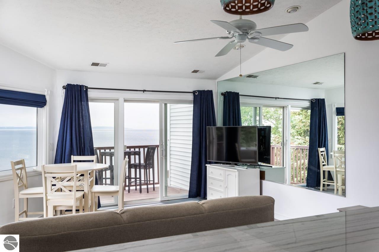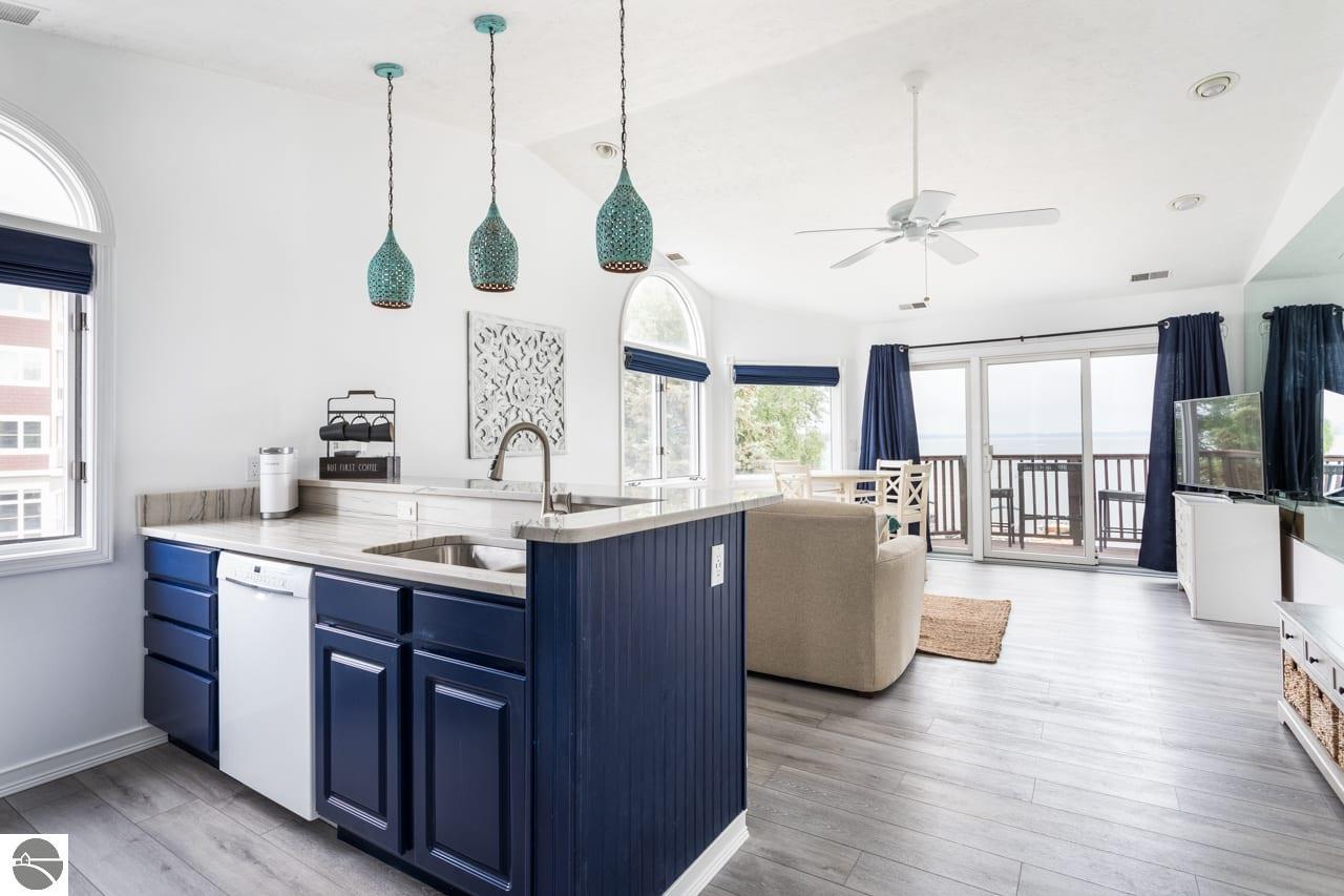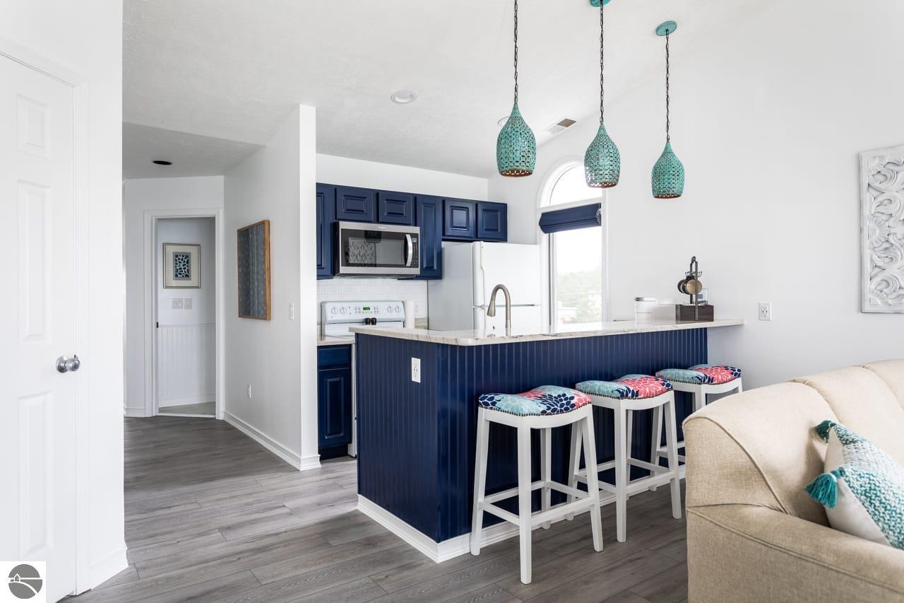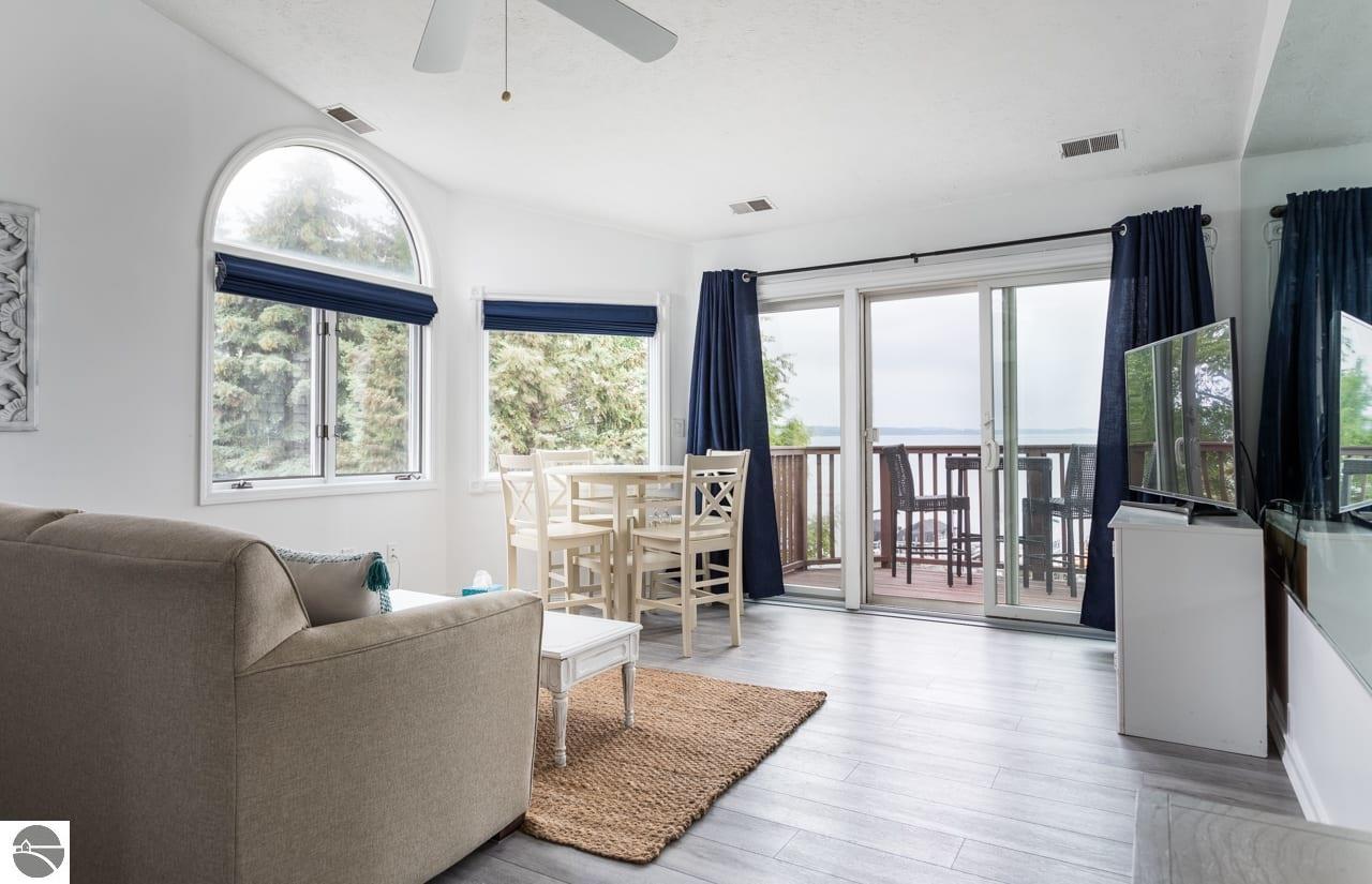 This fully furnished, beautiful beachfront condo at The Beach Condominiums is truly turn-key and ready for you to enjoy! Perfectly situated on the coveted shores of East Bay, this 3rd floor end unit offers the best sandy beaches in the Traverse City area and is directly adjacent to a convenient boat ramp—ideal for water enthusiasts. With a proven history of great investment income, this condo is not only a relaxing retreat, but also a smart investment. Enjoy amazing views of the bay from your private balcony and take advantage of exclusive amenities including a private sandy beach, heated pool, hot tub, and elevator for easy access. This end unit boasts more quiet and privacy than others, featuring vaulted ceilings and extra half-moon windows that flood the space with natural light. The master suite includes a beautiful private bay window. Completely renovated from floors to ceiling in 2021, the condo features an updated bathroom with a large walk-in marble tile shower, a private water closet, and a brand new washer and dryer (2024) with a transferable extended warranty. Attention to detail is evident throughout: USB outlets are installed for modern convenience, unique lighting adds character, and blackout designer cloth blinds and curtains ensure restful nights. The kitchen is a chef’s delight with updated appliances, granite countertops, a stylish tile backsplash, and a brand new stainless steel refrigerator being installed on October 5th! Located just 5 miles from downtown Traverse City, you’ll have quick access to top-rated dining, shopping, and entertainment. Nearby businesses include Hopscotch Brick Oven & Taproom, Osorio Tacos y Salsas, and Grand Traverse Resort and Spa. This gorgeously decorated property won’t last long! Don’t miss your chance to own this exceptional slice of paradise in Traverse City’s premier beachfront community—where every day feels like a vacation!