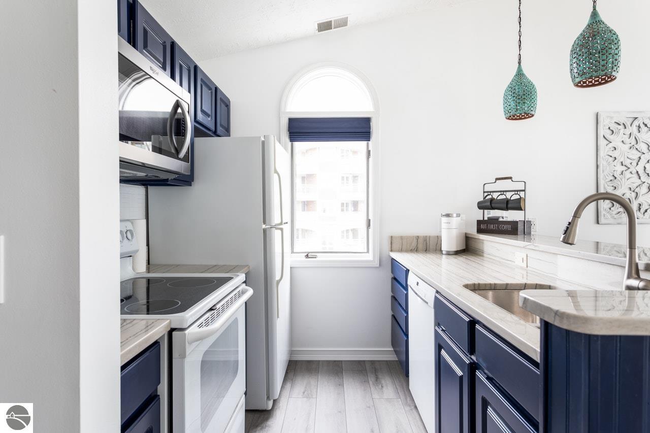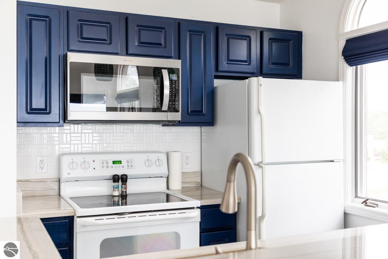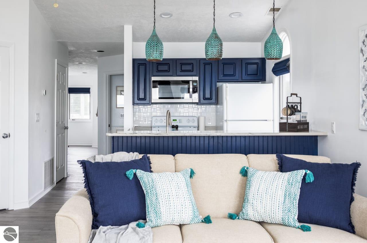 This fully furnished, beautiful beachfront condo at The Beach Condominiums is truly turn-key and ready for you to enjoy! Perfectly situated on the coveted shores of East Bay, this 3rd floor end unit offers the best sandy beaches in the Traverse City area and is directly adjacent to a convenient boat ramp—ideal for water enthusiasts. With a proven history of great investment income, this condo is not only a relaxing retreat, but also a smart investment. Enjoy amazing views of the bay from your private balcony and take advantage of exclusive amenities including a private sandy beach, heated pool, hot tub, and elevator for easy access. This end unit boasts more quiet and privacy than others, featuring vaulted ceilings and extra half-moon windows that flood the space with natural light. The master suite includes a beautiful private bay window. Completely renovated from floors to ceiling in 2021, the condo features an updated bathroom with a large walk-in marble tile shower, a private water closet, and a brand new washer and dryer (2024) with a transferable extended warranty. Attention to detail is evident throughout: USB outlets are installed for modern convenience, unique lighting adds character, and blackout designer cloth blinds and curtains ensure restful nights. The kitchen is a chef’s delight with updated appliances, granite countertops, a stylish tile backsplash, and a brand new stainless steel refrigerator being installed on October 5th! Located just 5 miles from downtown Traverse City, you’ll have quick access to top-rated dining, shopping, and entertainment. Nearby businesses include Hopscotch Brick Oven & Taproom, Osorio Tacos y Salsas, and Grand Traverse Resort and Spa. This gorgeously decorated property won’t last long! Don’t miss your chance to own this exceptional slice of paradise in Traverse City’s premier beachfront community—where every day feels like a vacation!