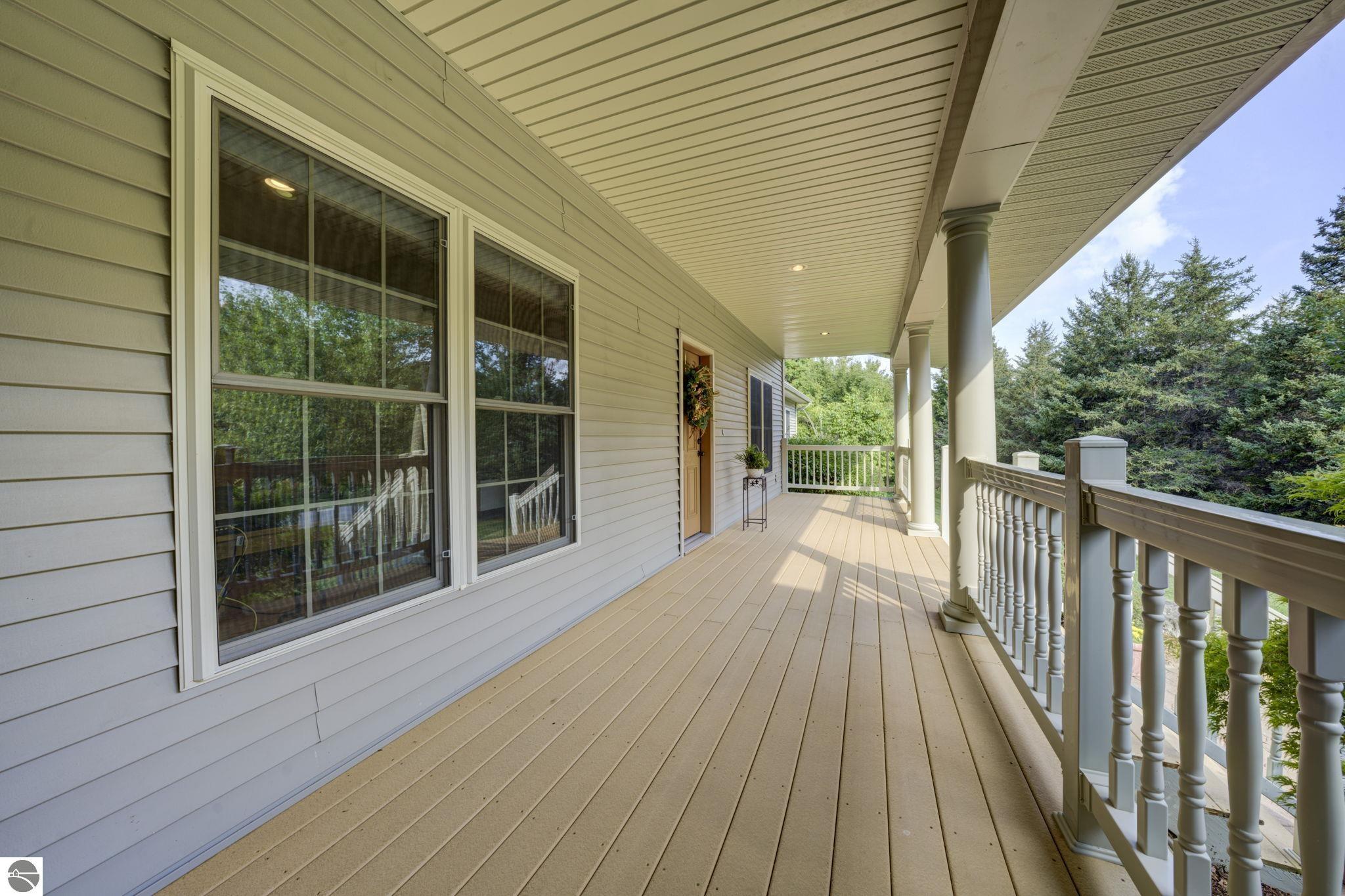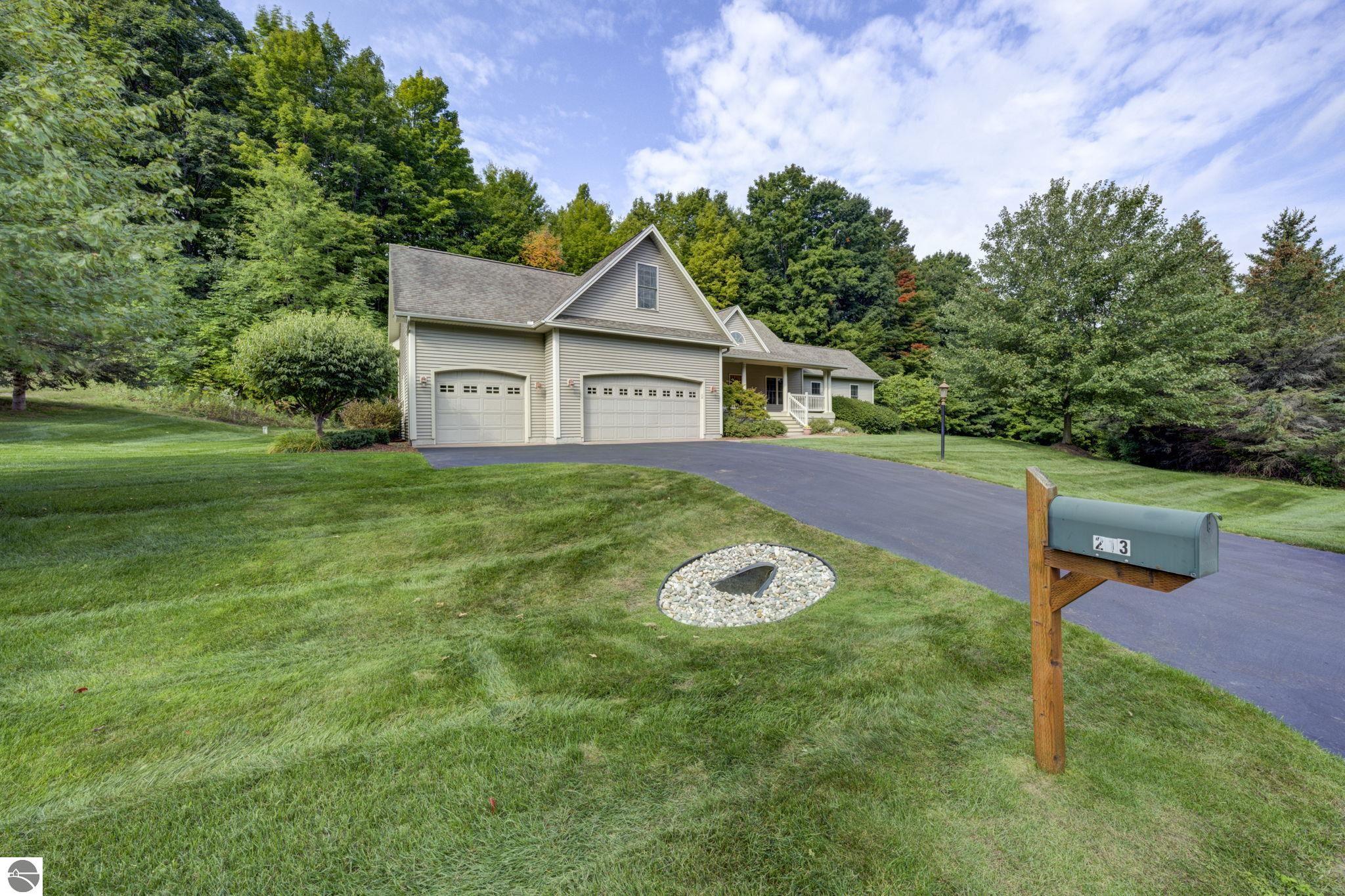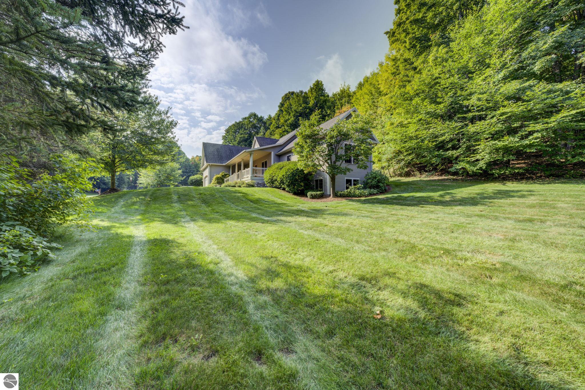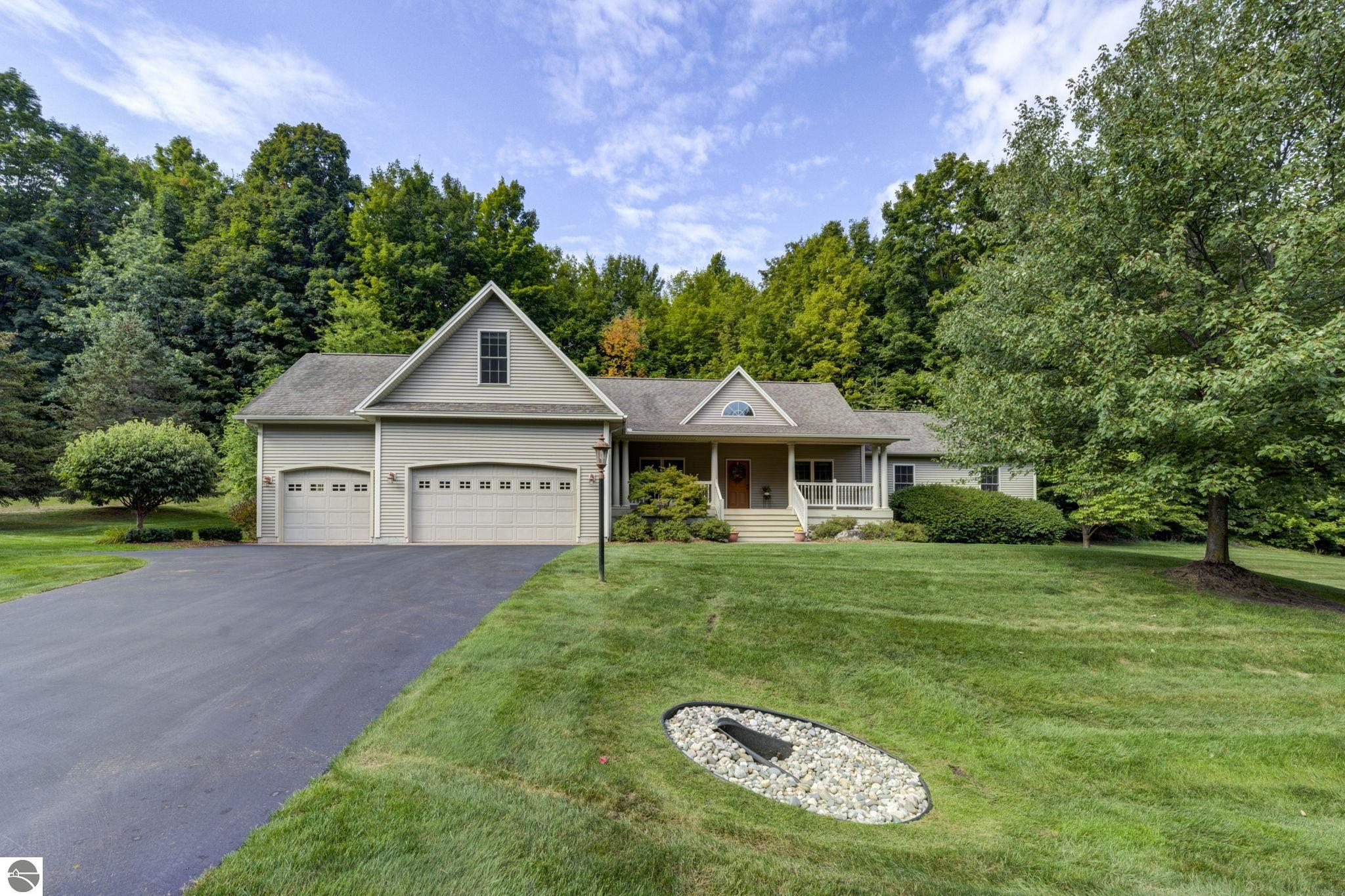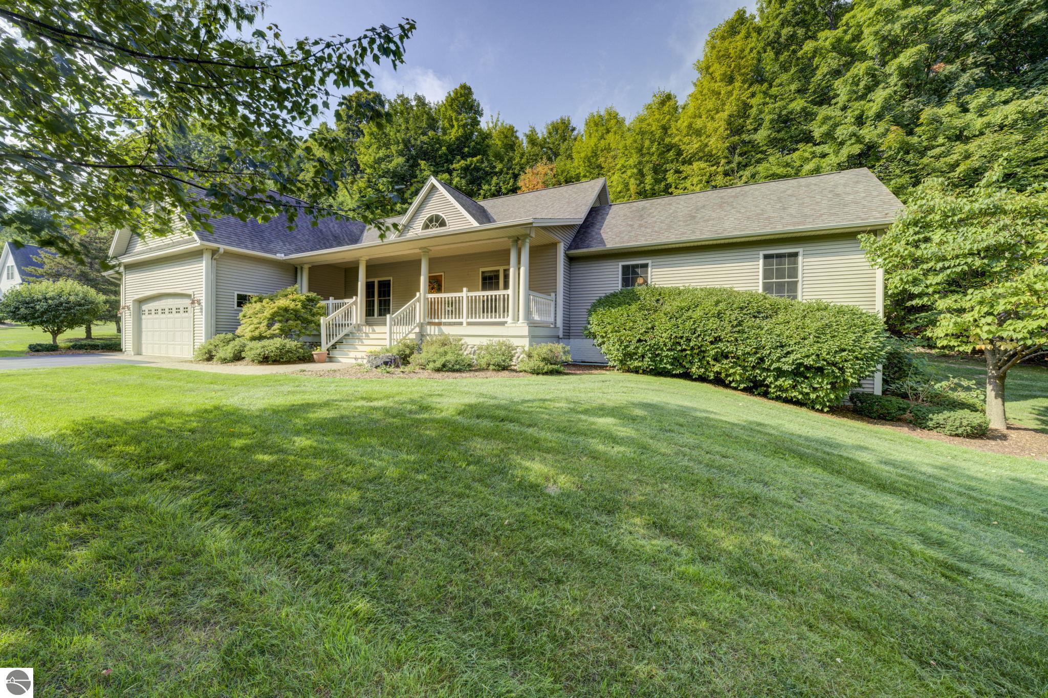 Located just 10 minutes from Traverse City, this well-maintained ranch features nearly 2100 sqft on the main floor with 4 bedrooms (including 2 private suites); 3 full bathrooms with granite; spacious kitchen with maple cabinets, large pantry, 7'x4' granite island; hardwood floors throughout the main level; finished bonus room above garage; covered front porch; composite decking; and 2079 sqft of unfinished space in the basement. Recent updates include furnace, pressure tank, sump pump, water heater, retaining wall. Situated on a 1.5-acre landscaped lot on a peaceful cul-de-sac street with other fine homes, this home offers quality construction, a thoughtfully designed floorplan, plenty of outdoor space, and is just minutes to shopping, schools, trails, restaurants, and beaches.