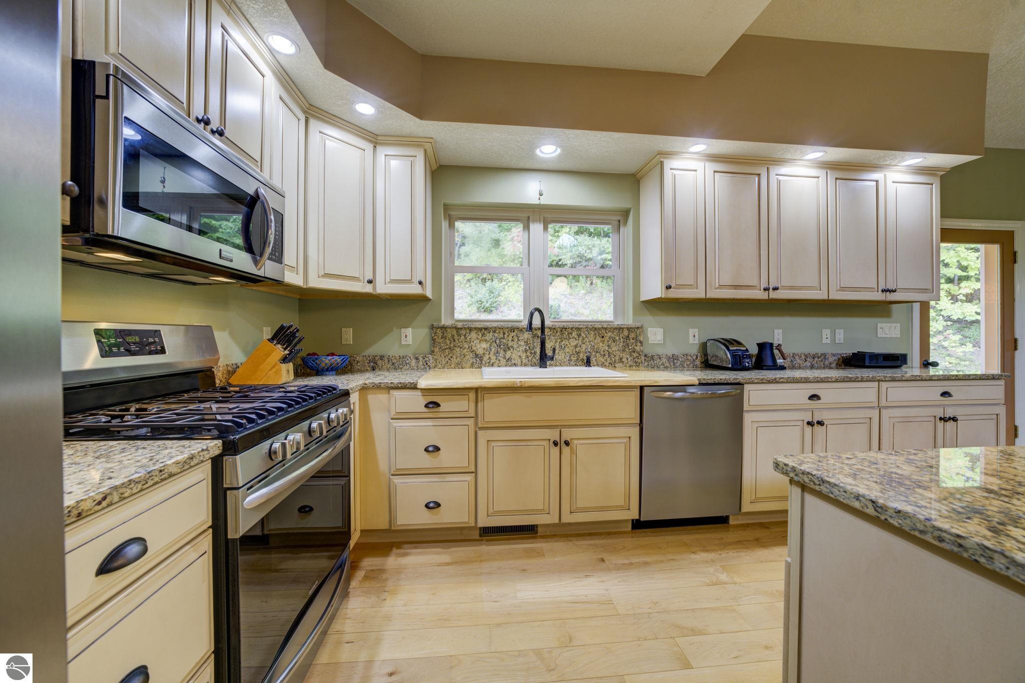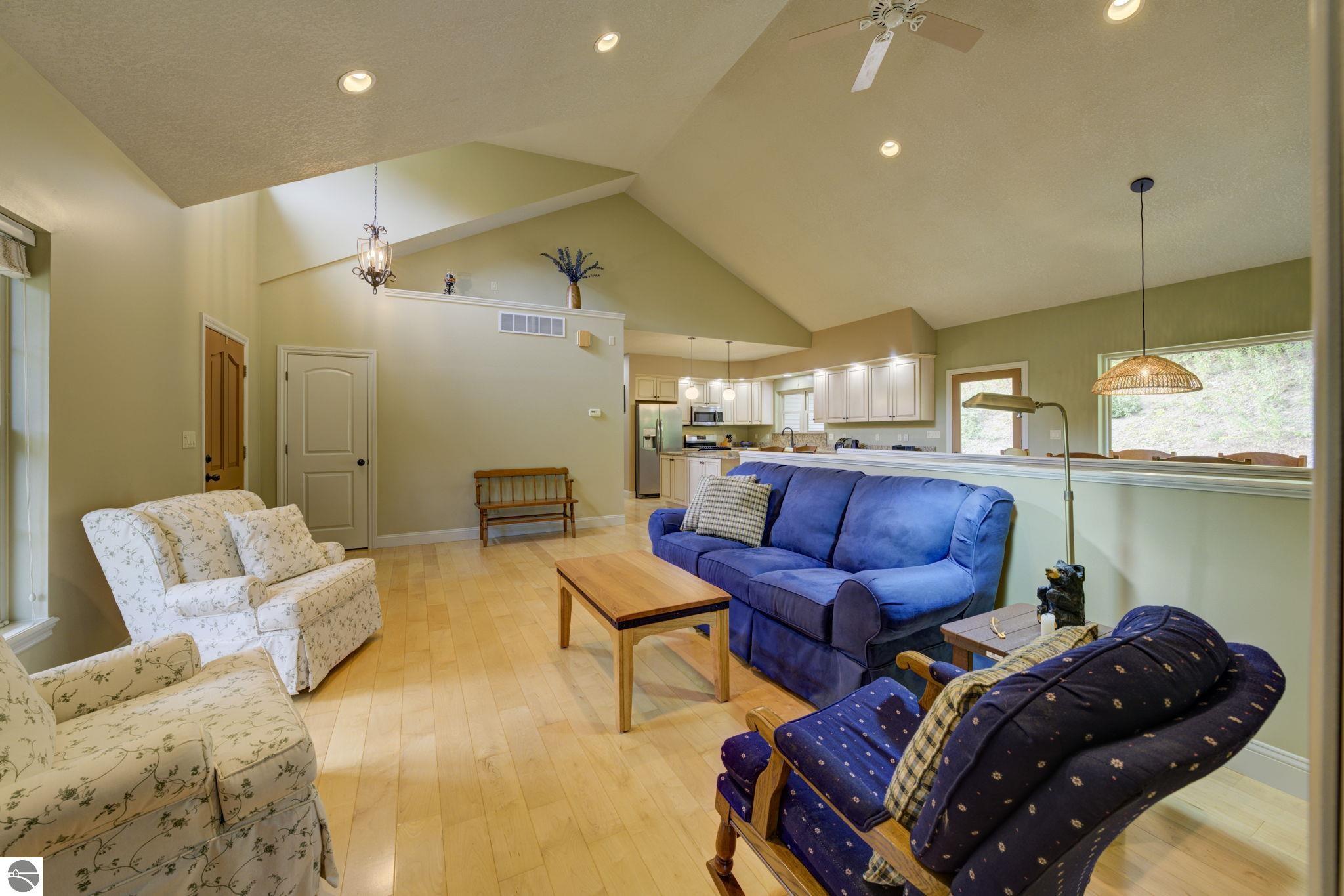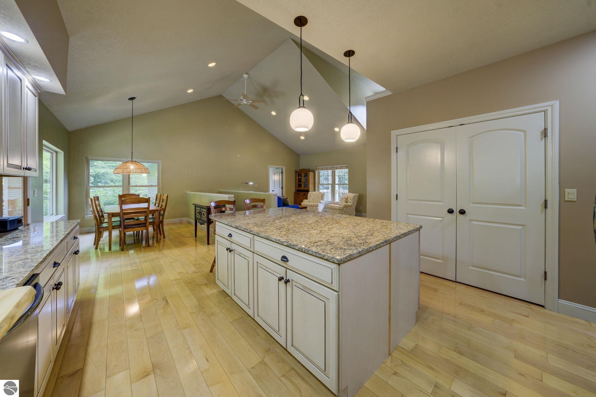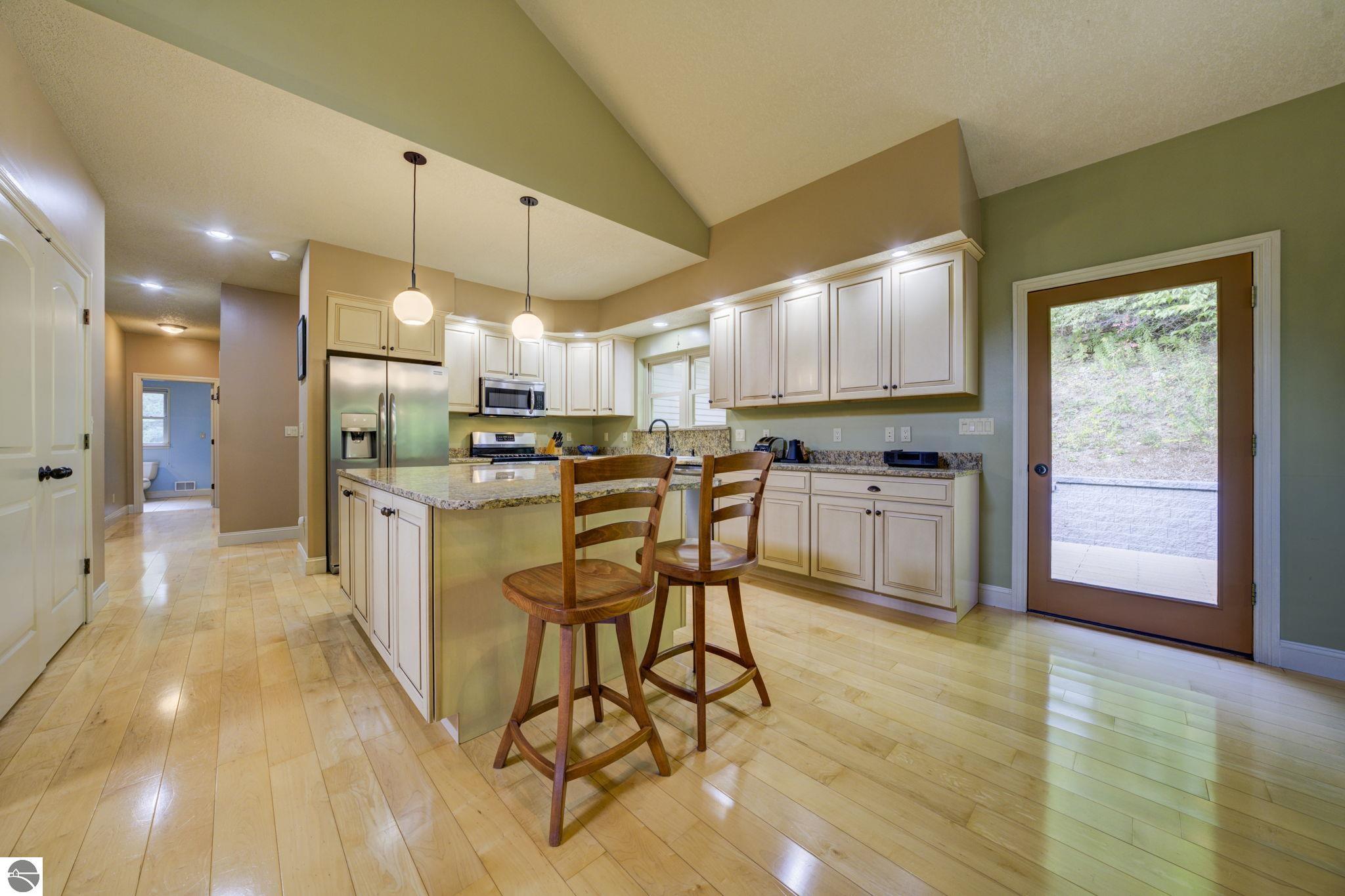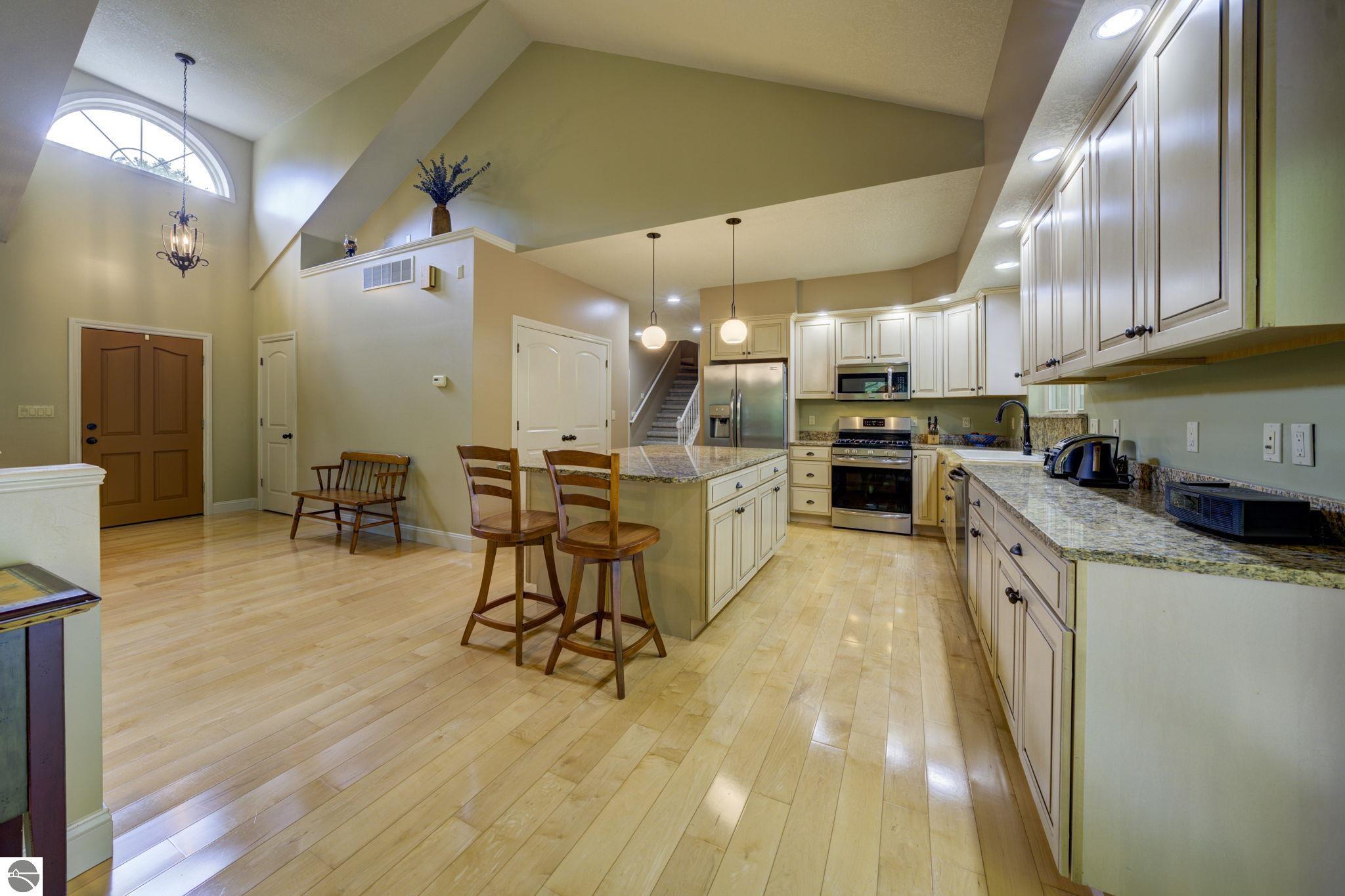 Located just 10 minutes from Traverse City, this well-maintained ranch features nearly 2100 sqft on the main floor with 4 bedrooms (including 2 private suites); 3 full bathrooms with granite; spacious kitchen with maple cabinets, large pantry, 7'x4' granite island; hardwood floors throughout the main level; finished bonus room above garage; covered front porch; composite decking; and 2079 sqft of unfinished space in the basement. Recent updates include furnace, pressure tank, sump pump, water heater, retaining wall. Situated on a 1.5-acre landscaped lot on a peaceful cul-de-sac street with other fine homes, this home offers quality construction, a thoughtfully designed floorplan, plenty of outdoor space, and is just minutes to shopping, schools, trails, restaurants, and beaches.