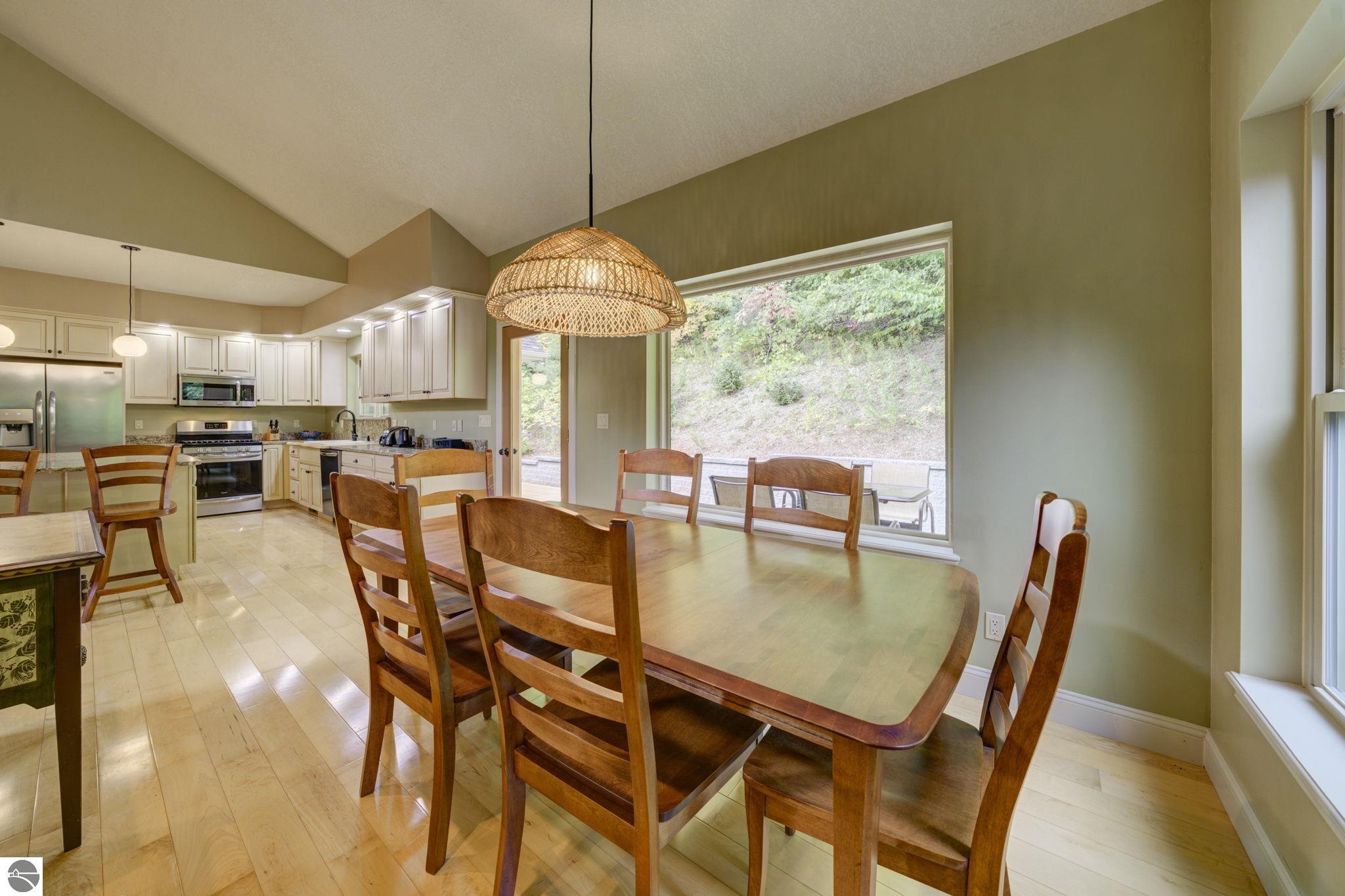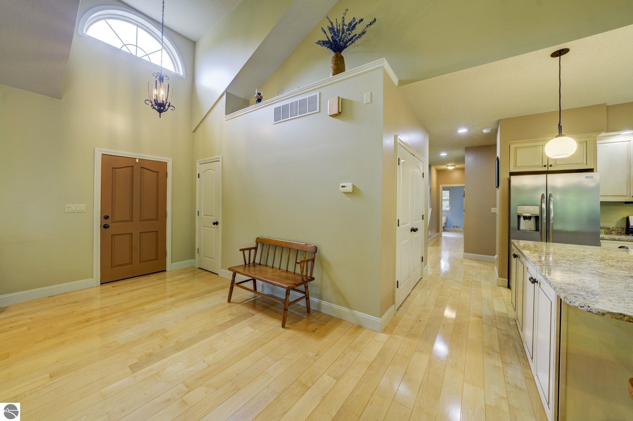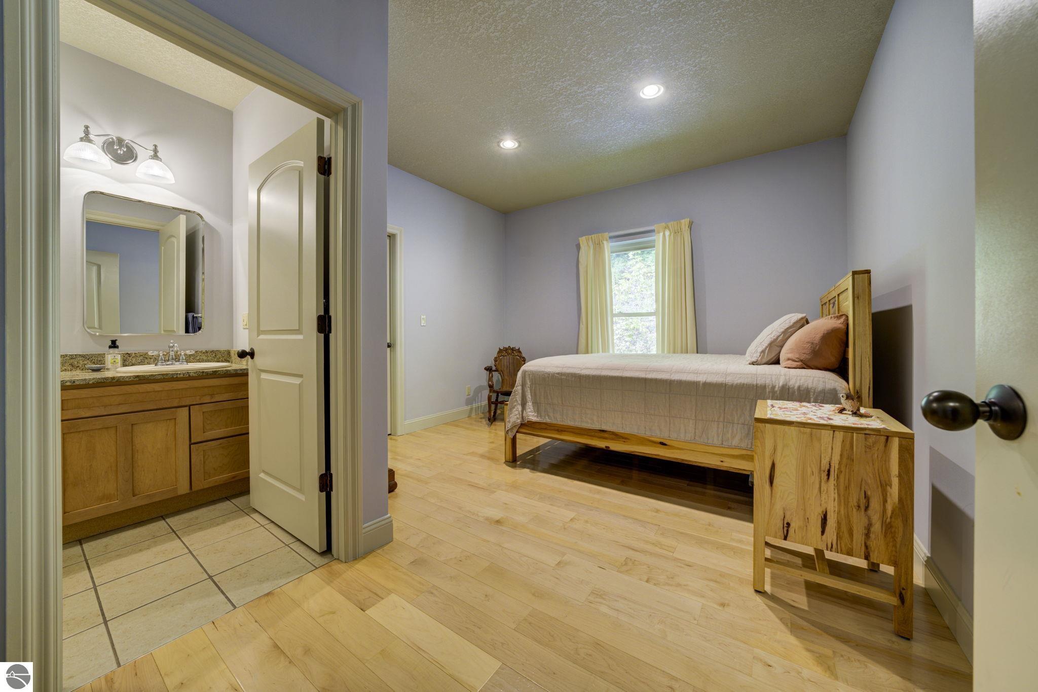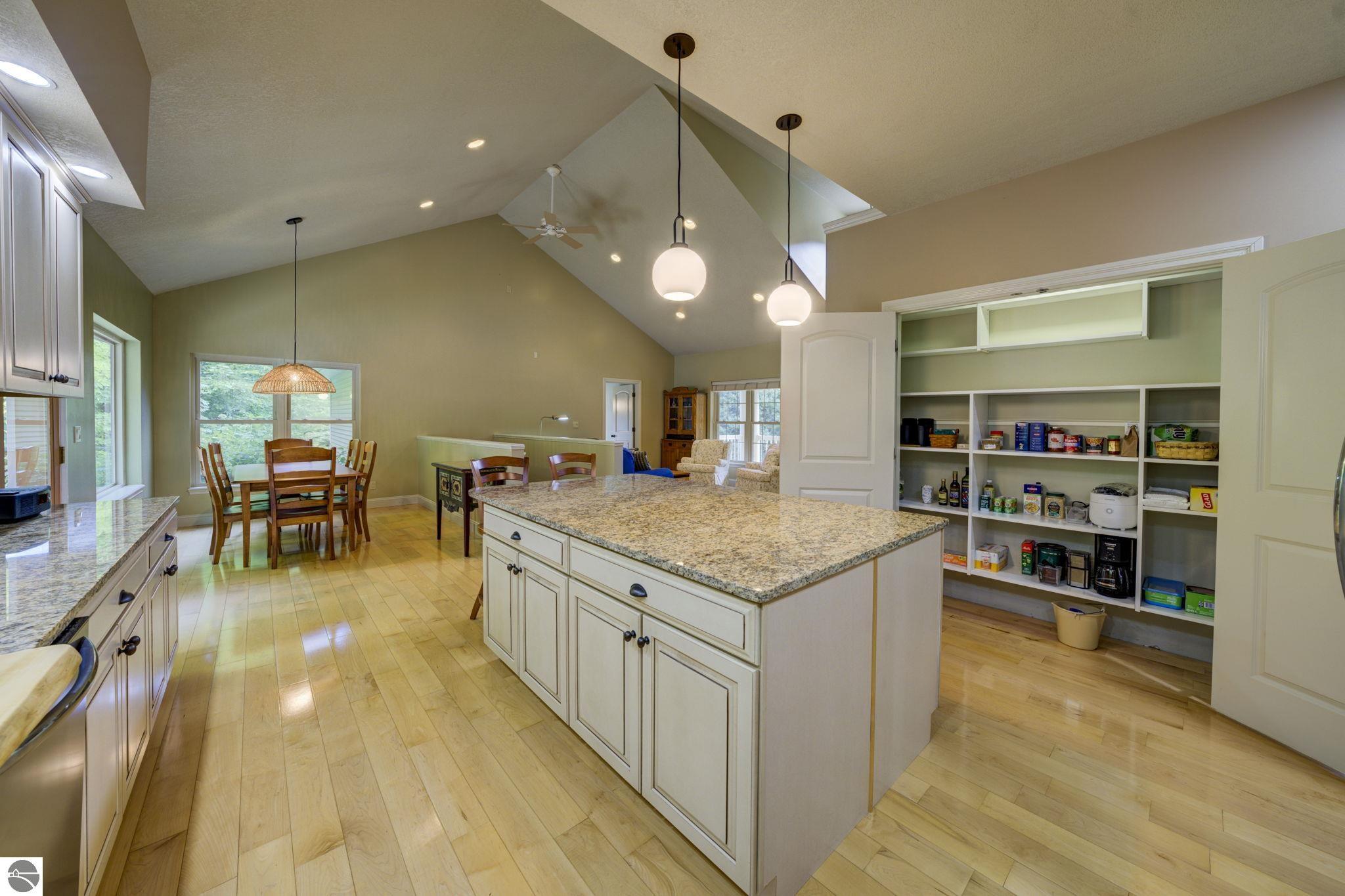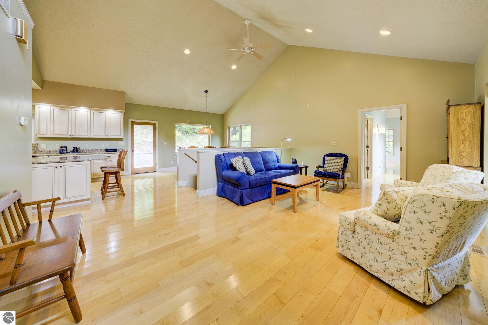 Located just 10 minutes from Traverse City, this well-maintained ranch features nearly 2100 sqft on the main floor with 4 bedrooms (including 2 private suites); 3 full bathrooms with granite; spacious kitchen with maple cabinets, large pantry, 7'x4' granite island; hardwood floors throughout the main level; finished bonus room above garage; covered front porch; composite decking; and 2079 sqft of unfinished space in the basement. Recent updates include furnace, pressure tank, sump pump, water heater, retaining wall. Situated on a 1.5-acre landscaped lot on a peaceful cul-de-sac street with other fine homes, this home offers quality construction, a thoughtfully designed floorplan, plenty of outdoor space, and is just minutes to shopping, schools, trails, restaurants, and beaches.