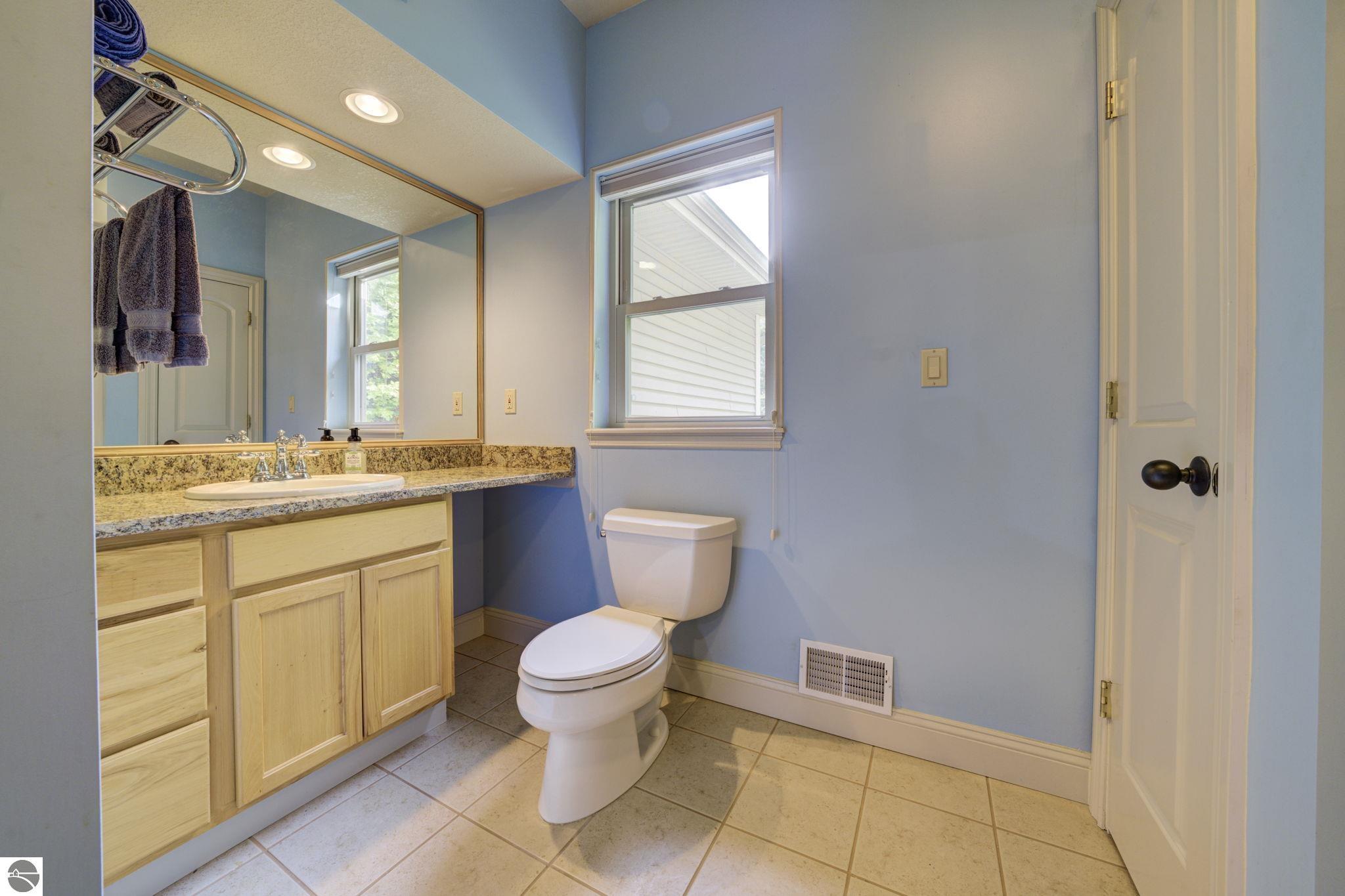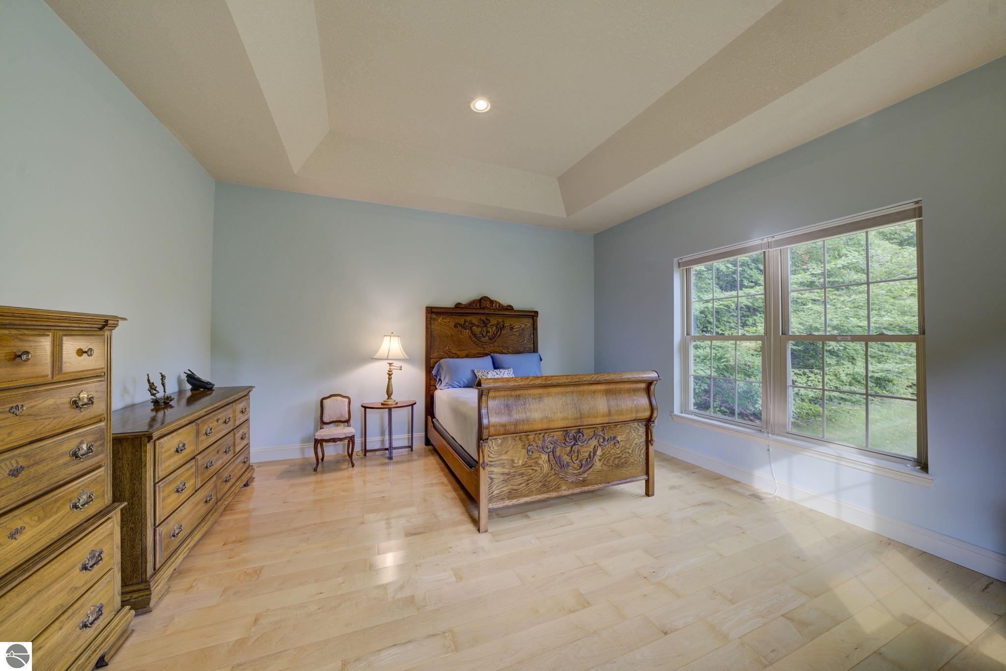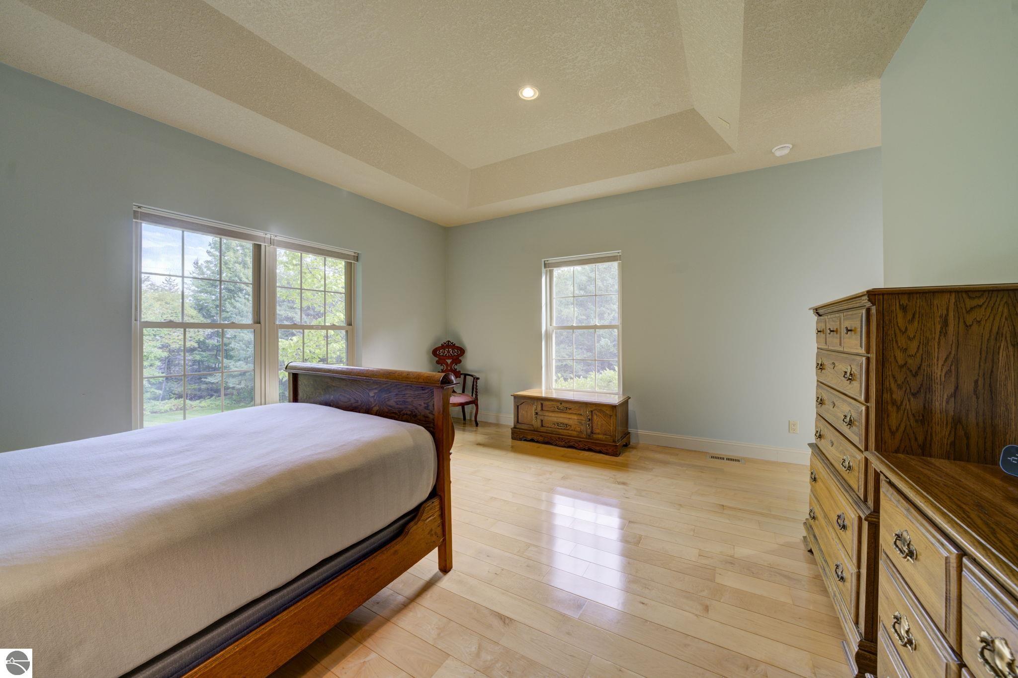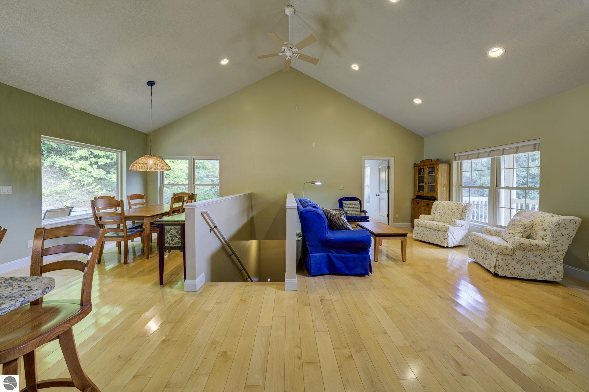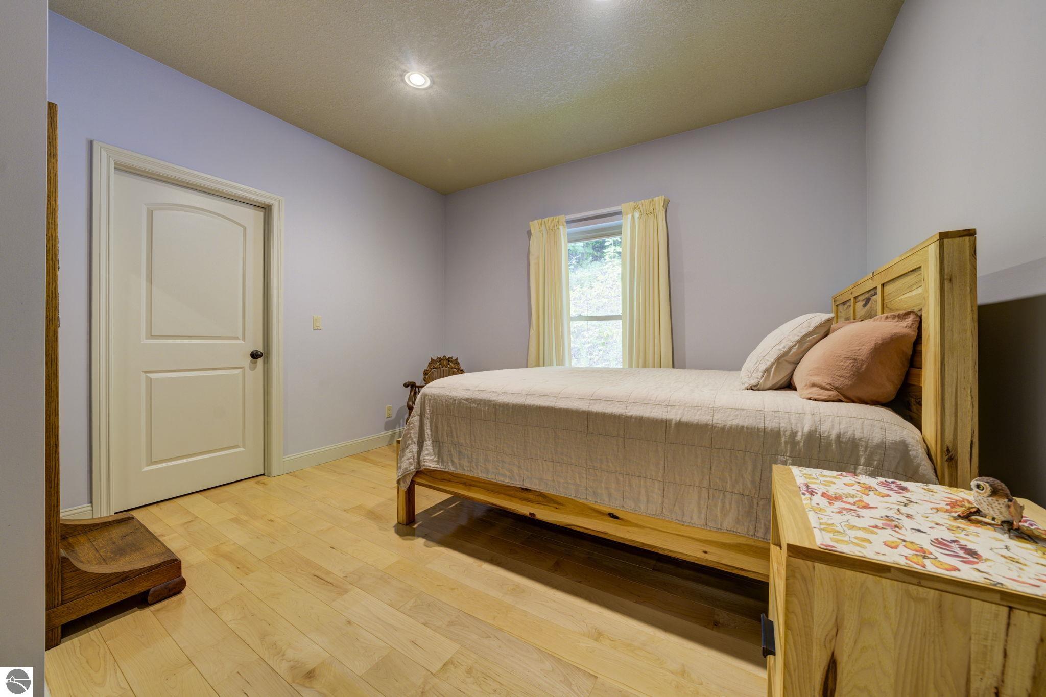 Located just 10 minutes from Traverse City, this well-maintained ranch features nearly 2100 sqft on the main floor with 4 bedrooms (including 2 private suites); 3 full bathrooms with granite; spacious kitchen with maple cabinets, large pantry, 7'x4' granite island; hardwood floors throughout the main level; finished bonus room above garage; covered front porch; composite decking; and 2079 sqft of unfinished space in the basement. Recent updates include furnace, pressure tank, sump pump, water heater, retaining wall. Situated on a 1.5-acre landscaped lot on a peaceful cul-de-sac street with other fine homes, this home offers quality construction, a thoughtfully designed floorplan, plenty of outdoor space, and is just minutes to shopping, schools, trails, restaurants, and beaches.