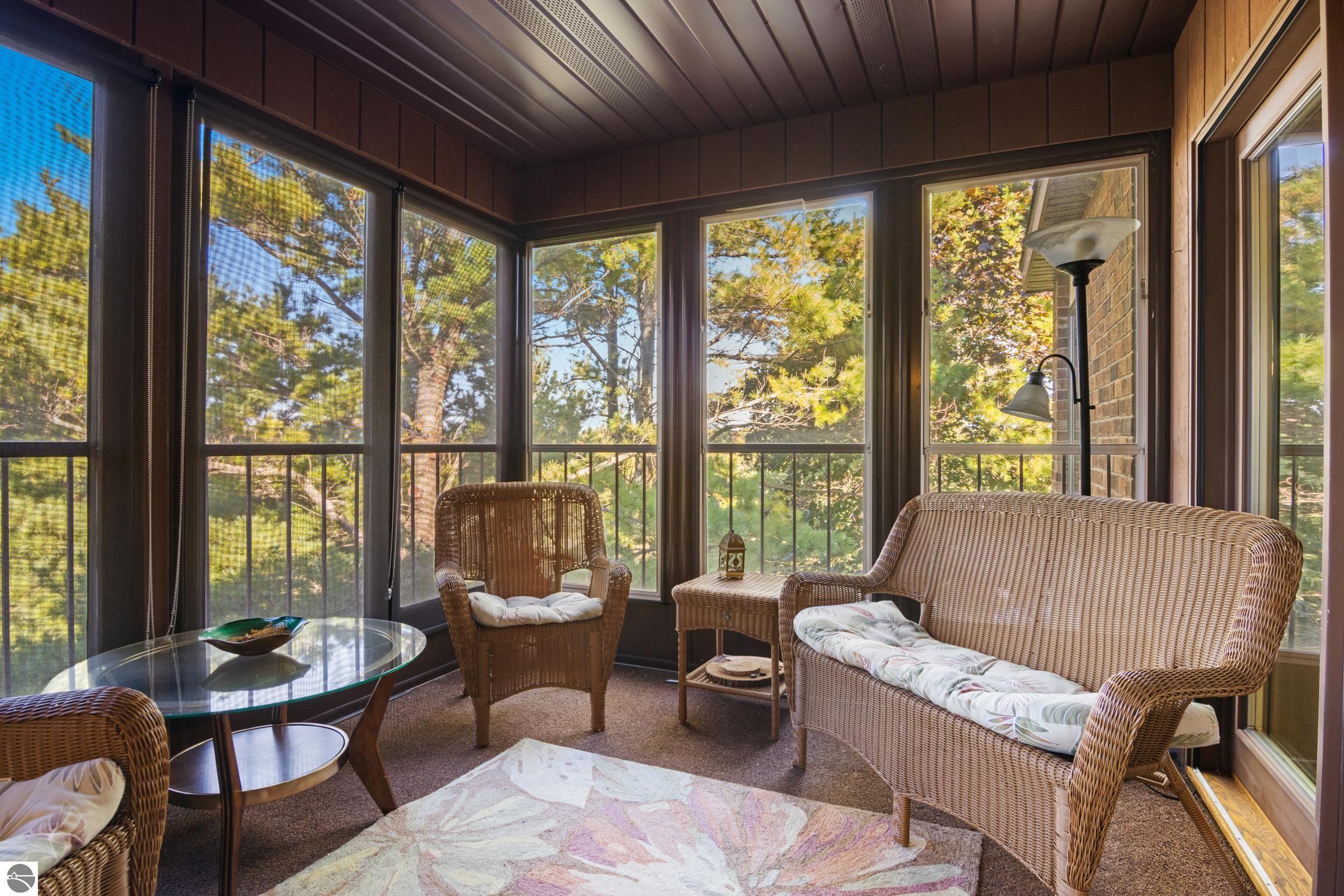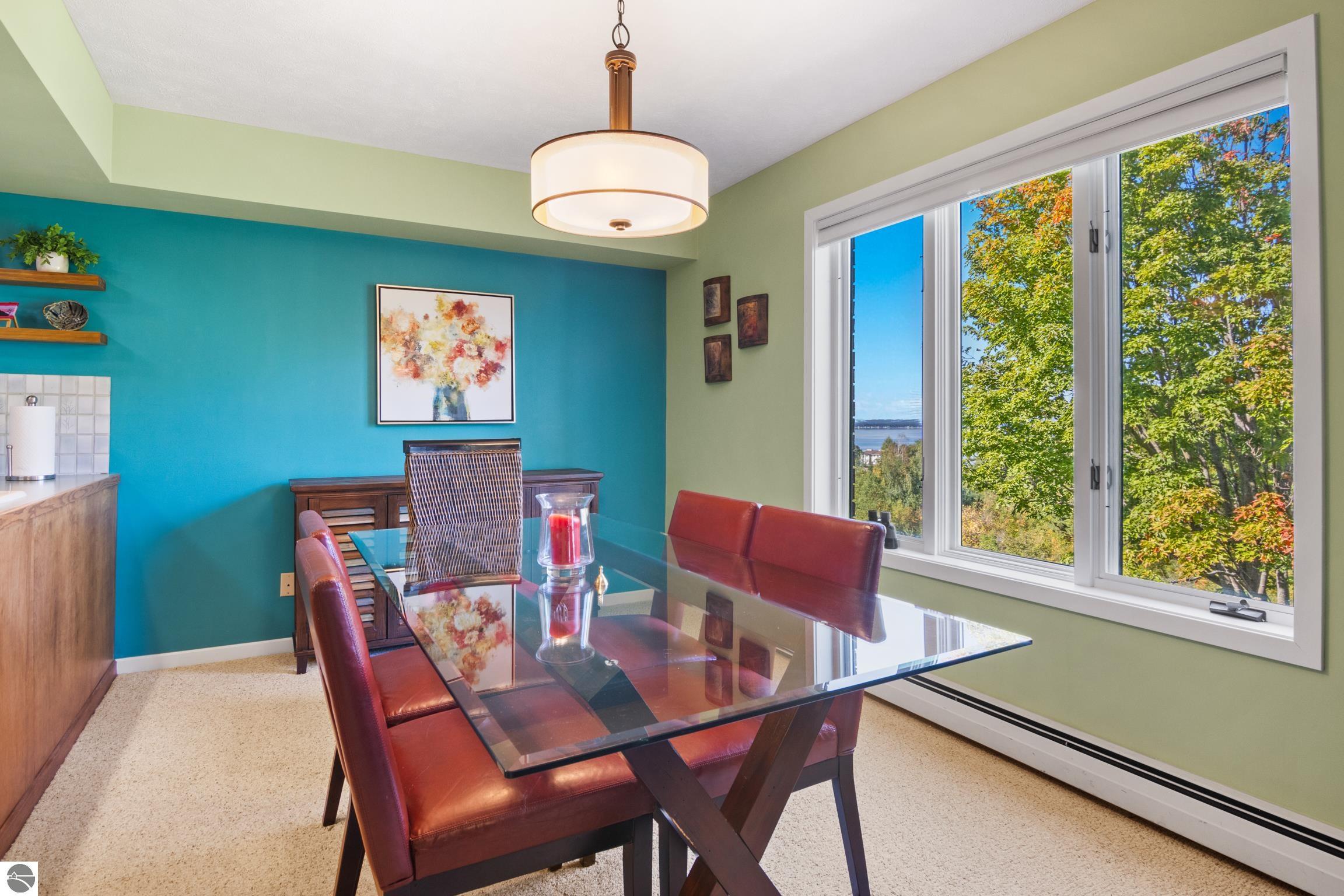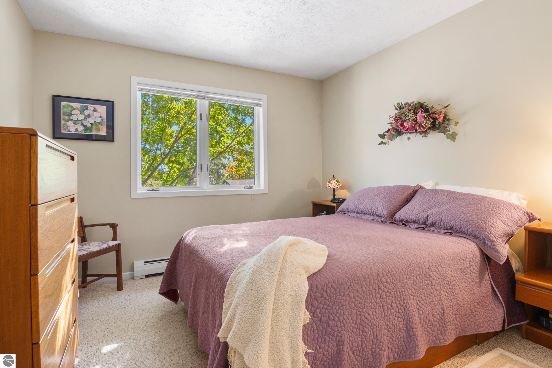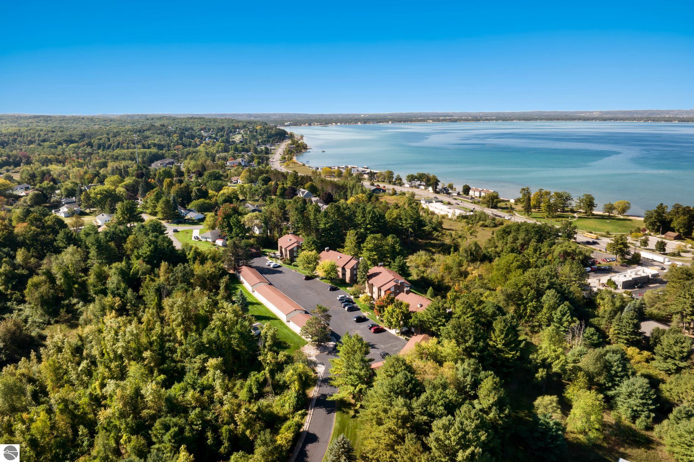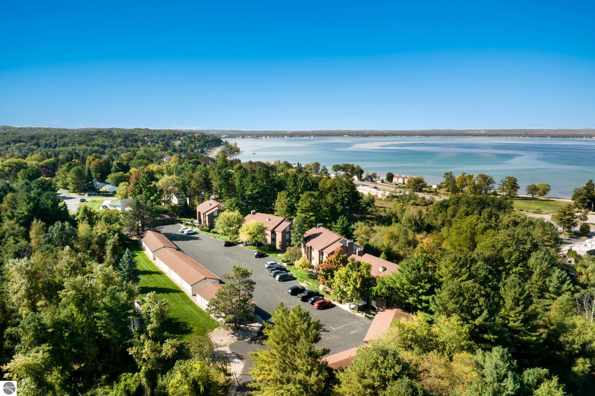 Enjoy some fun East Bay views from this immaculate 2 BR 2 Bath Condo in Juniper Hills. Check out the fantastic location offering both maximum privacy and convenience close to Bay beaches and parks, the TART trail, and the Grand Traverse Resort spa, golf, shops, and restaurants. This upper end unit is found in the end building and has a great layout for social gatherings. There is a bay view from the kitchen through the dining room and wooded views from the living room through the three-season porch. Many updates include the tiled kitchen floor and backsplash, new paint palette throughout, plus an updated primary bath with tiled shower, glass shower door, and Cambria counter. The living room features a cozy, woodburning, brick fireplace and large windows framing a glass door to the screened 10x12 porch, where you can catch a breeze, read a book, or entertain in a treehouse ambiance. The dining room offers another entry to the porch. A real laundry room, not a closet, offers counter space, drawers and shelves in addition to the washer and dryer. All major appliances are included. Amenities include efficient hot water baseboard heat, cable TV and internet. Your monthly maintenance fee covers heat, water, sewer, waste removal, and the usual exterior building and grounds maintenance, including snow removal. Park your vehicle and bicycles in the oversized one-car garage with an electric door opener, located just steps from the door. And, don't worry, the usual pet is allowed.