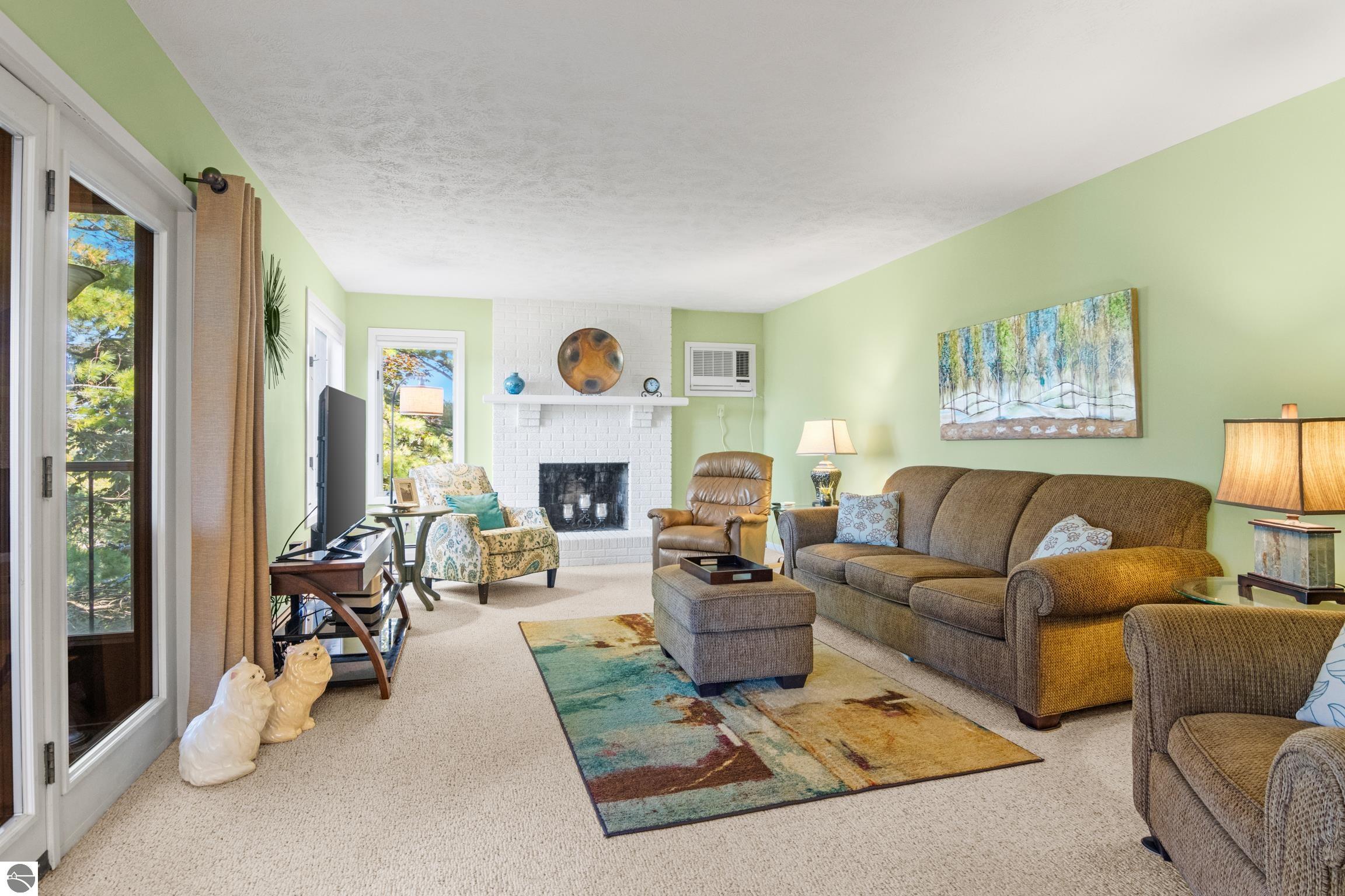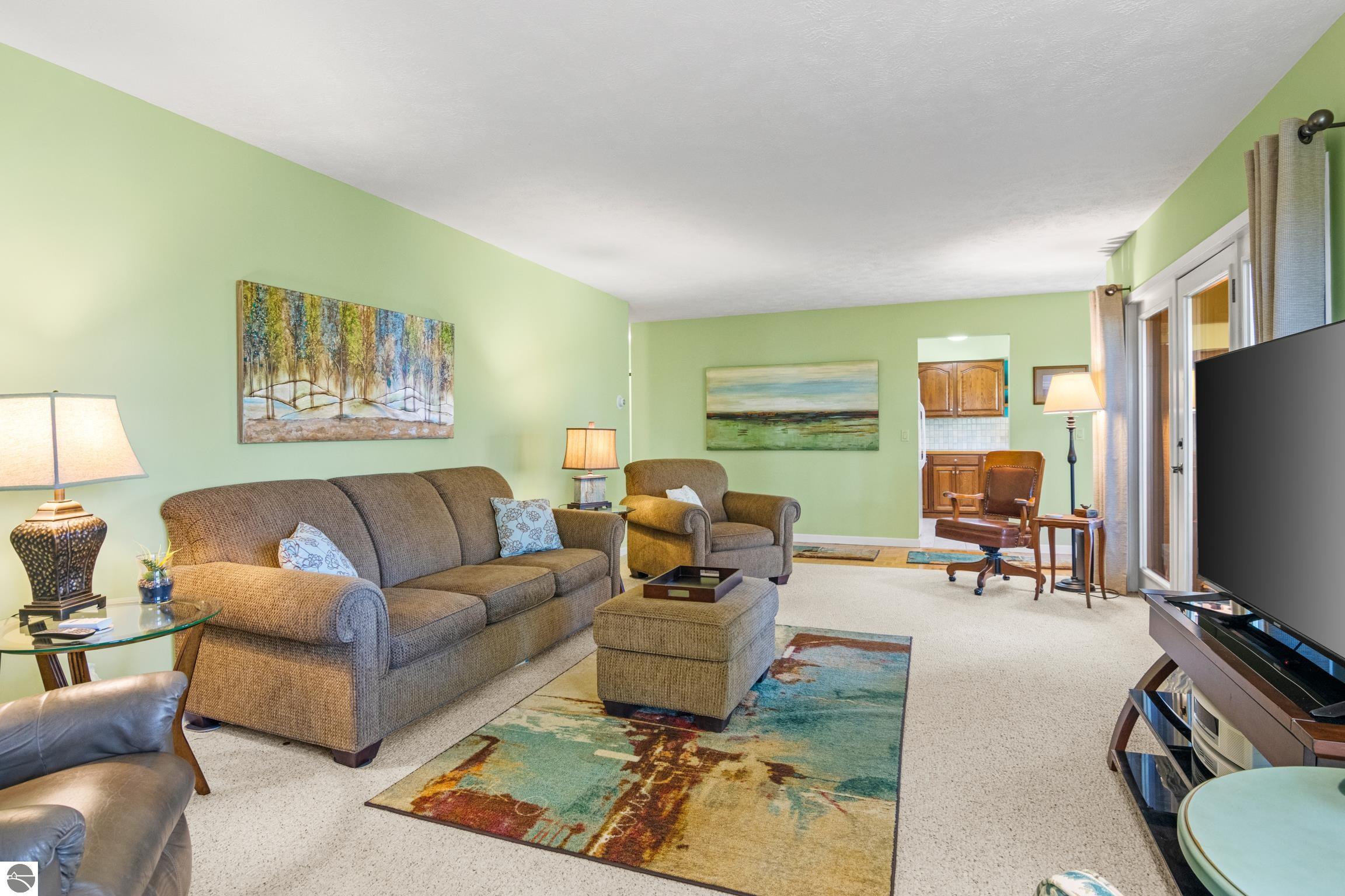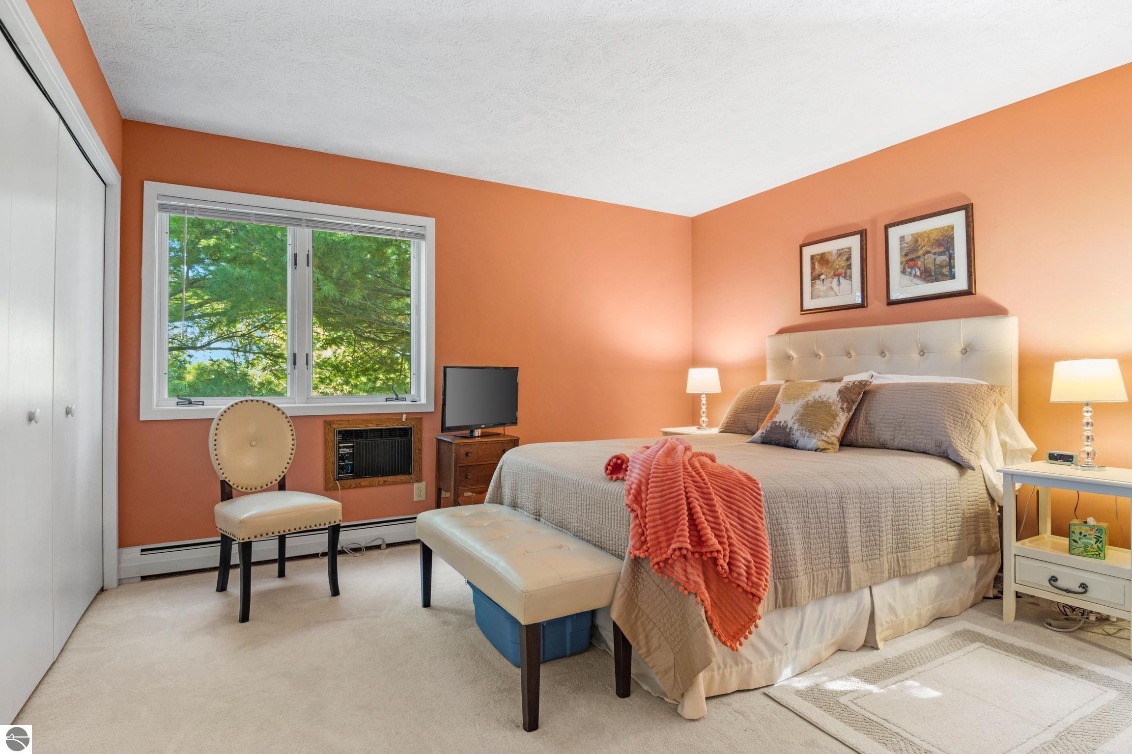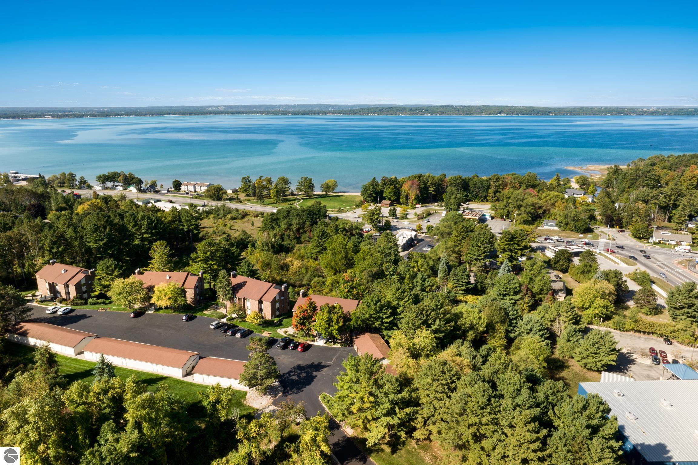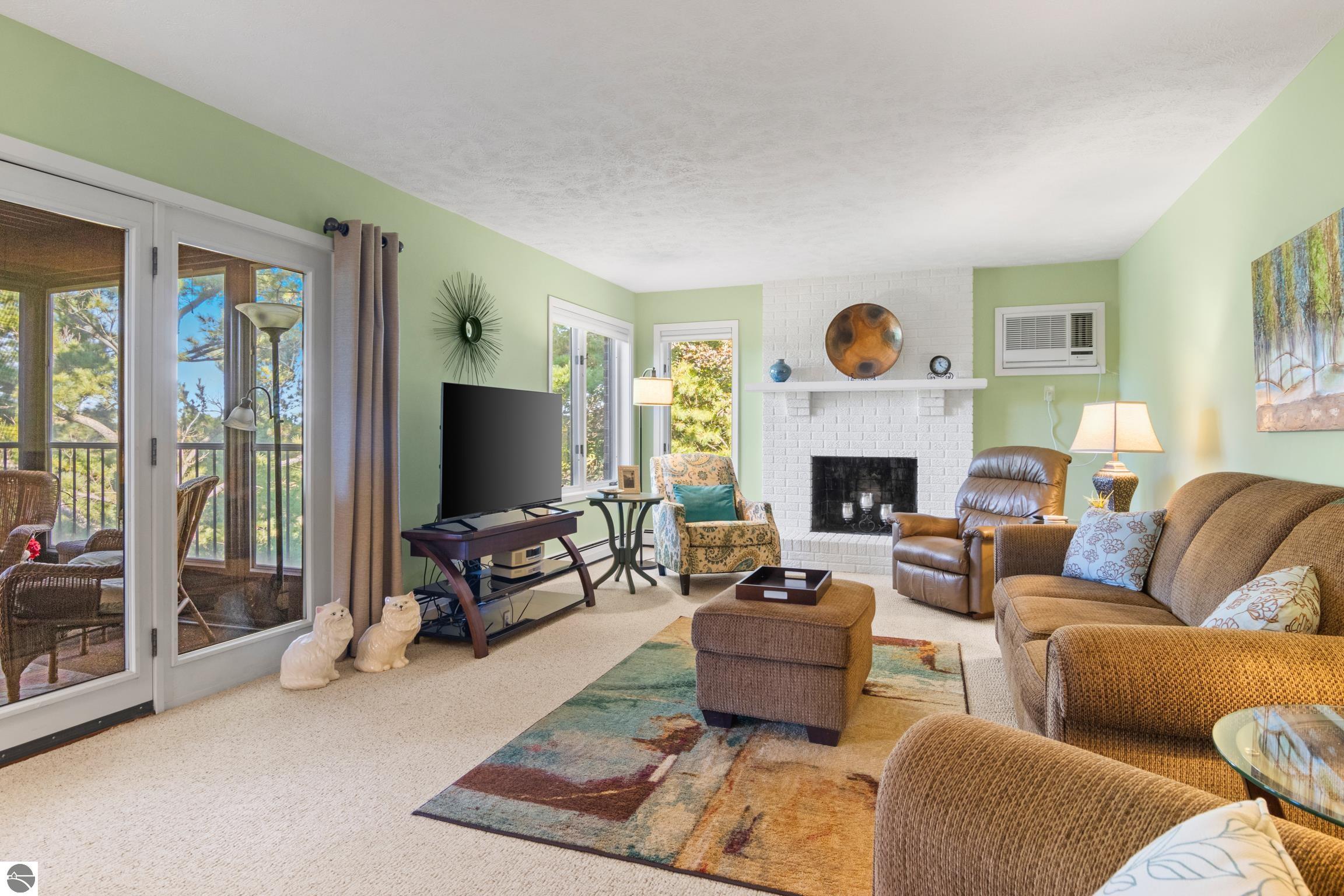 Enjoy some fun East Bay views from this immaculate 2 BR 2 Bath Condo in Juniper Hills. Check out the fantastic location offering both maximum privacy and convenience close to Bay beaches and parks, the TART trail, and the Grand Traverse Resort spa, golf, shops, and restaurants. This upper end unit is found in the end building and has a great layout for social gatherings. There is a bay view from the kitchen through the dining room and wooded views from the living room through the three-season porch. Many updates include the tiled kitchen floor and backsplash, new paint palette throughout, plus an updated primary bath with tiled shower, glass shower door, and Cambria counter. The living room features a cozy, woodburning, brick fireplace and large windows framing a glass door to the screened 10x12 porch, where you can catch a breeze, read a book, or entertain in a treehouse ambiance. The dining room offers another entry to the porch. A real laundry room, not a closet, offers counter space, drawers and shelves in addition to the washer and dryer. All major appliances are included. Amenities include efficient hot water baseboard heat, cable TV and internet. Your monthly maintenance fee covers heat, water, sewer, waste removal, and the usual exterior building and grounds maintenance, including snow removal. Park your vehicle and bicycles in the oversized one-car garage with an electric door opener, located just steps from the door. And, don't worry, the usual pet is allowed.