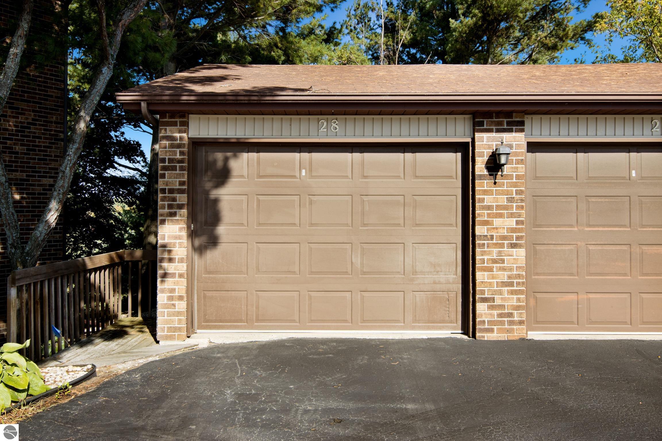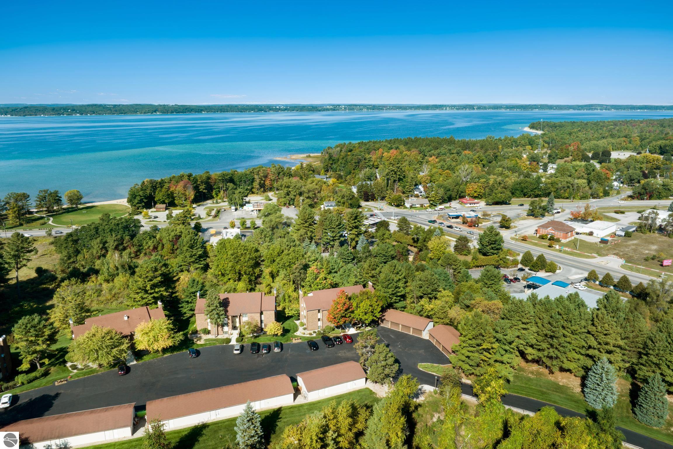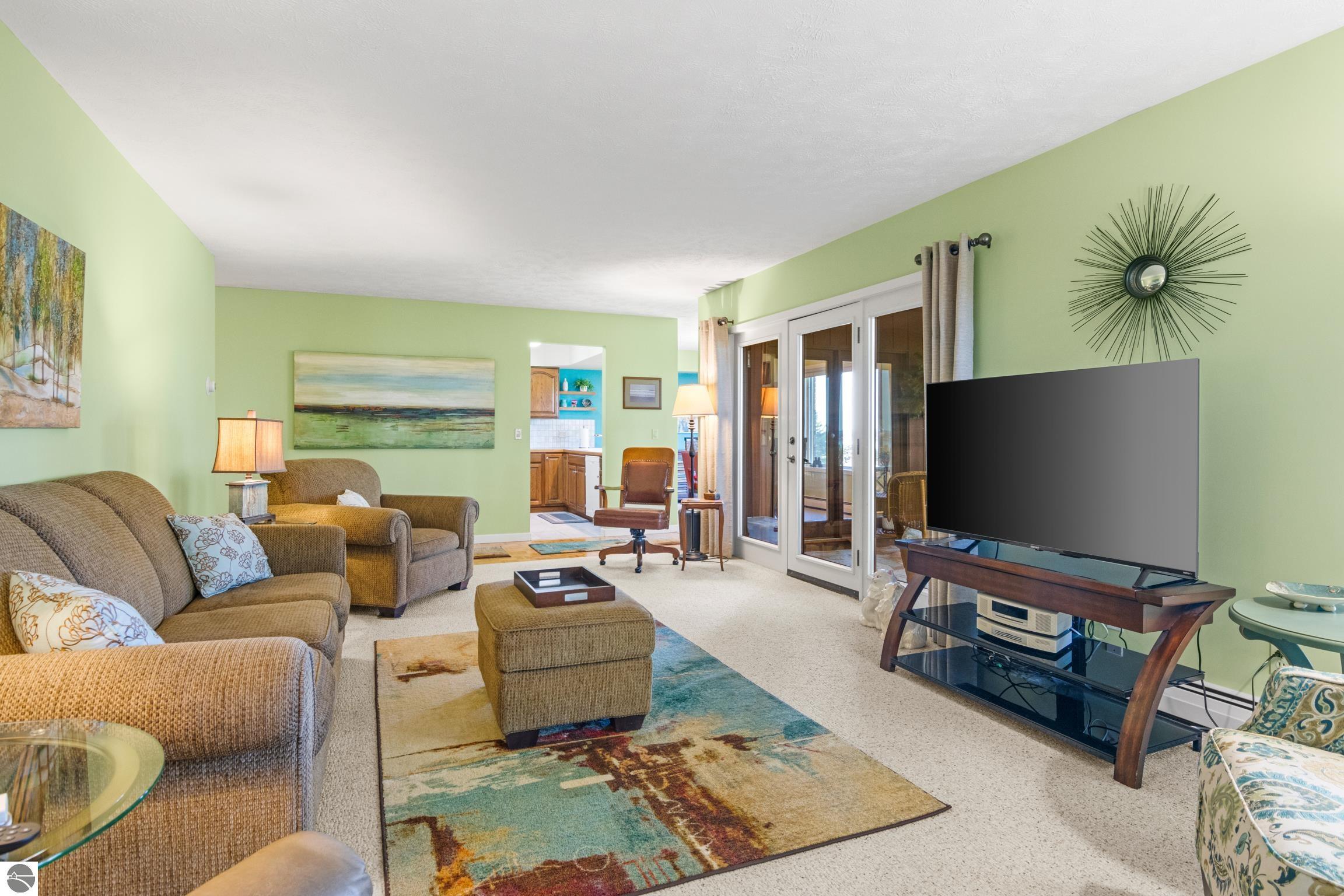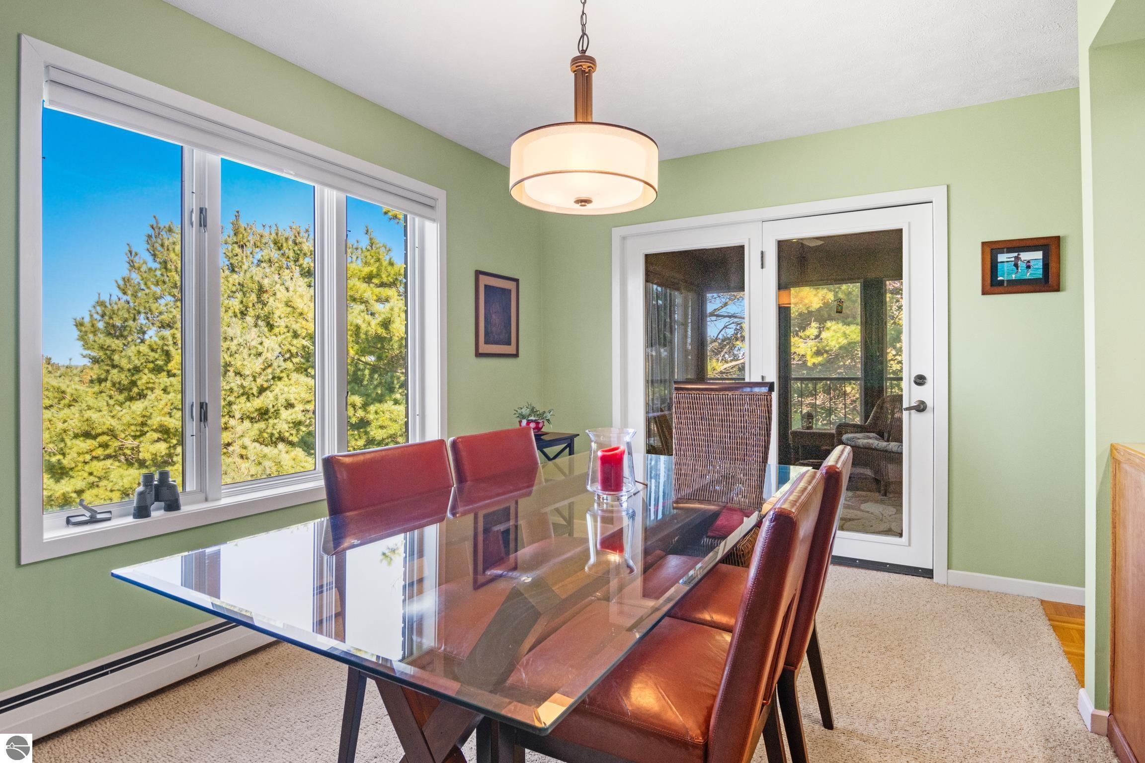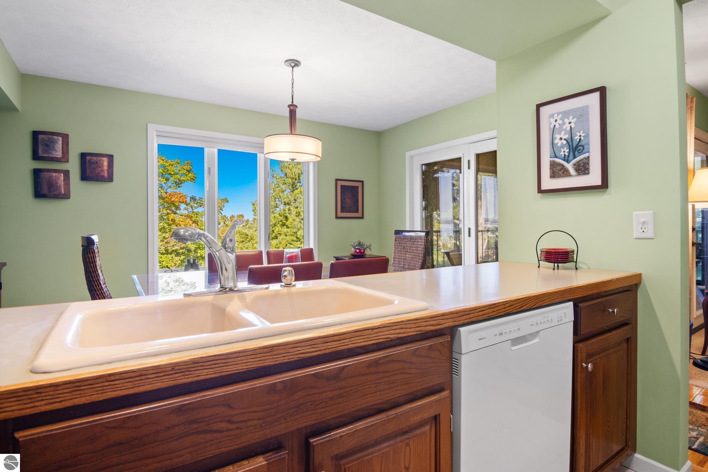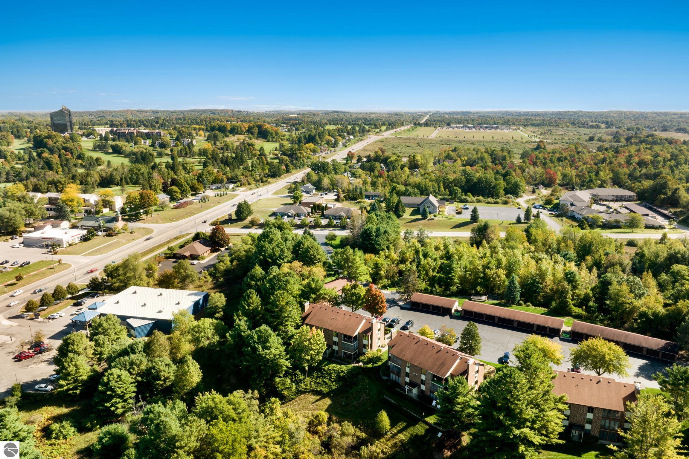 Enjoy some fun East Bay views from this immaculate 2 BR 2 Bath Condo in Juniper Hills. Check out the fantastic location offering both maximum privacy and convenience close to Bay beaches and parks, the TART trail, and the Grand Traverse Resort spa, golf, shops, and restaurants. This upper end unit is found in the end building and has a great layout for social gatherings. There is a bay view from the kitchen through the dining room and wooded views from the living room through the three-season porch. Many updates include the tiled kitchen floor and backsplash, new paint palette throughout, plus an updated primary bath with tiled shower, glass shower door, and Cambria counter. The living room features a cozy, woodburning, brick fireplace and large windows framing a glass door to the screened 10x12 porch, where you can catch a breeze, read a book, or entertain in a treehouse ambiance. The dining room offers another entry to the porch. A real laundry room, not a closet, offers counter space, drawers and shelves in addition to the washer and dryer. All major appliances are included. Amenities include efficient hot water baseboard heat, cable TV and internet. Your monthly maintenance fee covers heat, water, sewer, waste removal, and the usual exterior building and grounds maintenance, including snow removal. Park your vehicle and bicycles in the oversized one-car garage with an electric door opener, located just steps from the door. And, don't worry, the usual pet is allowed.