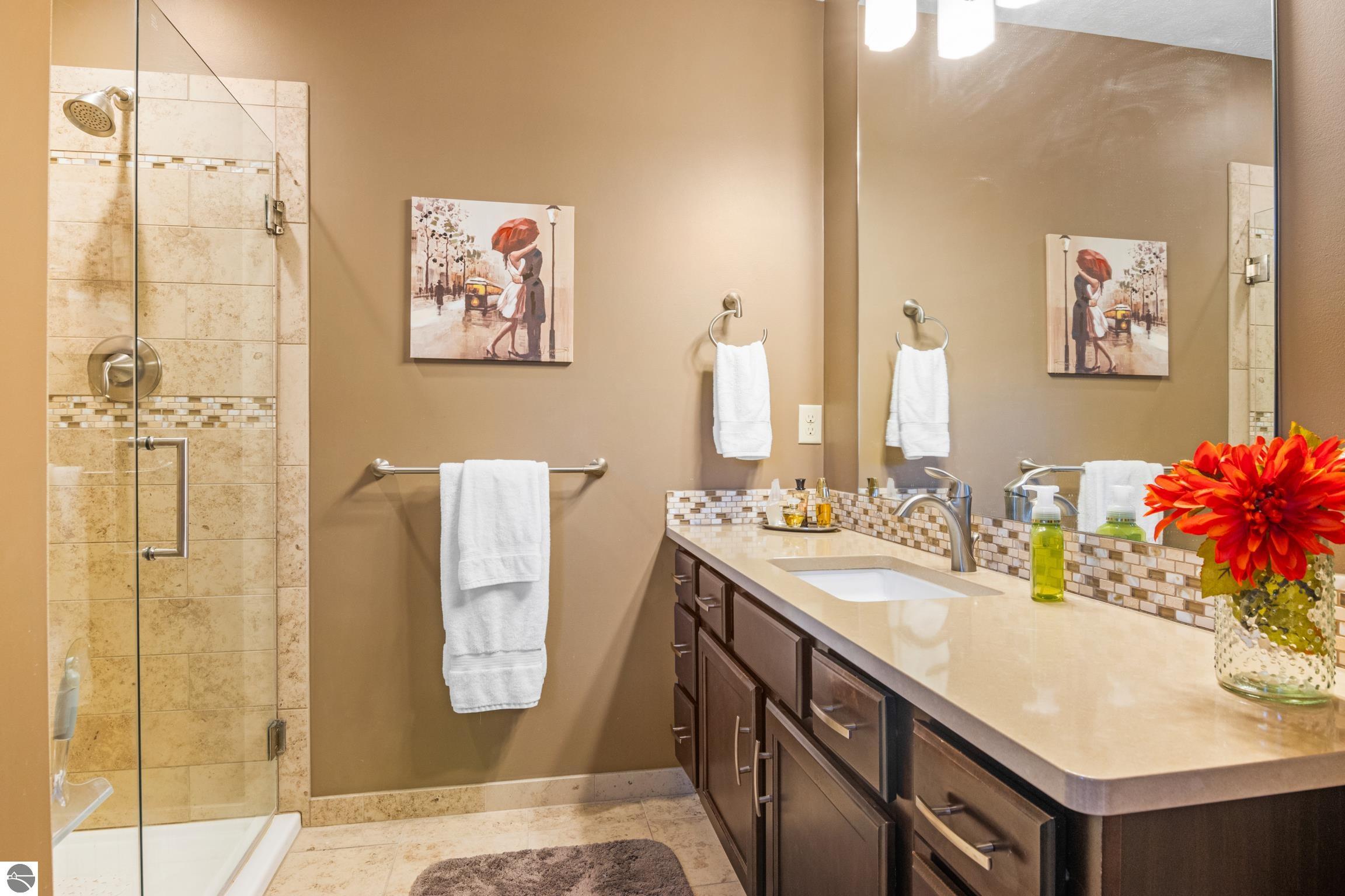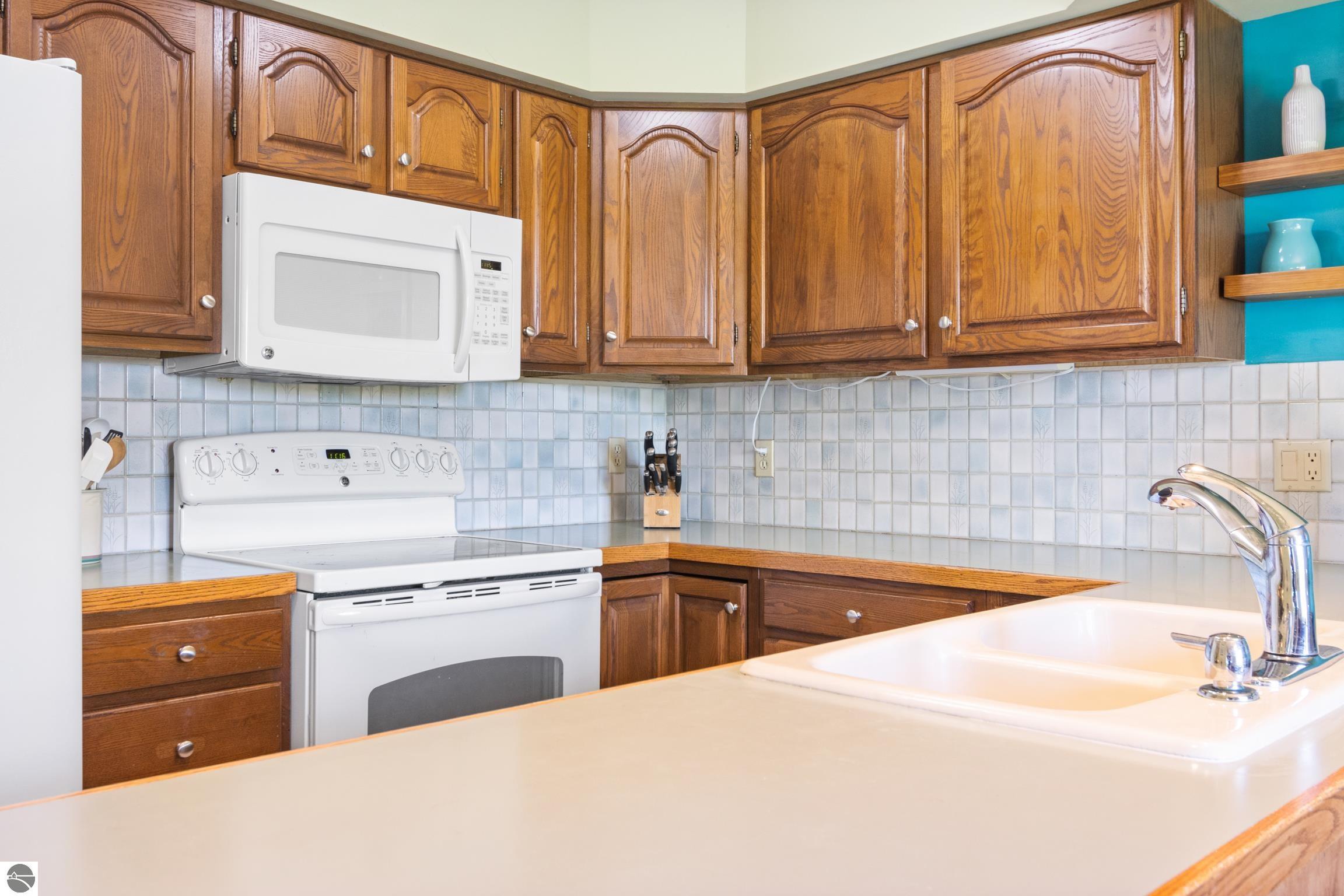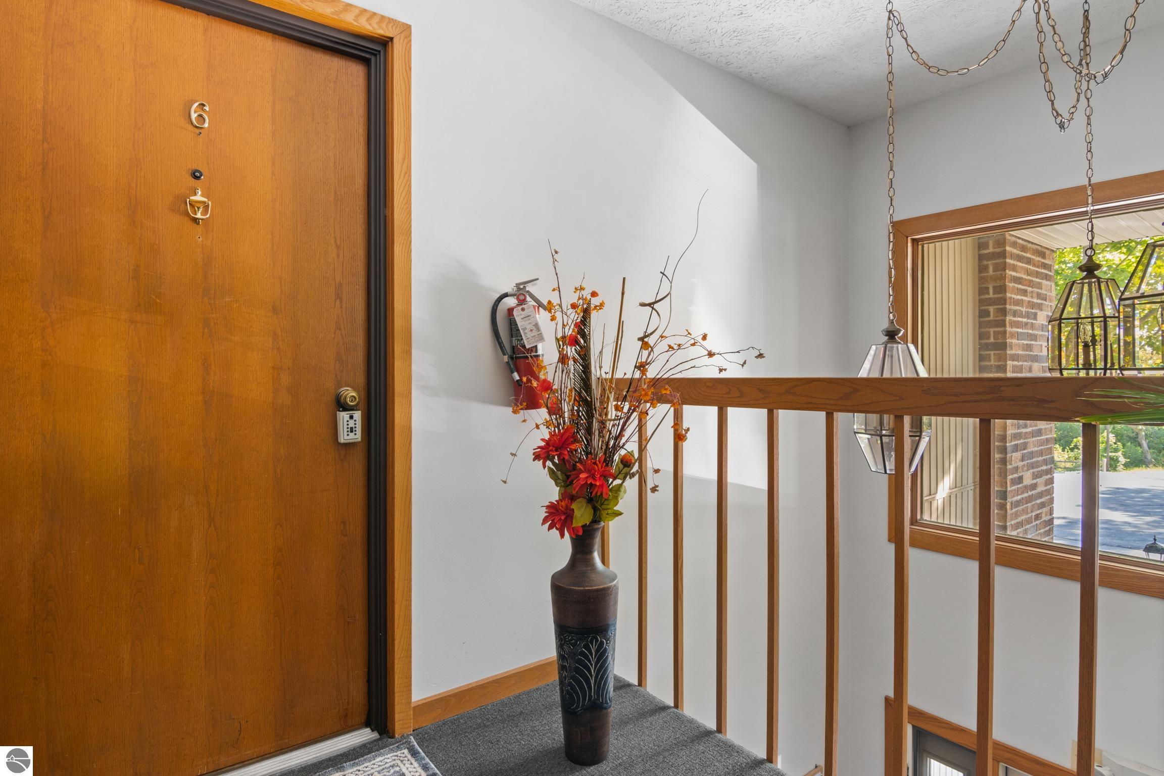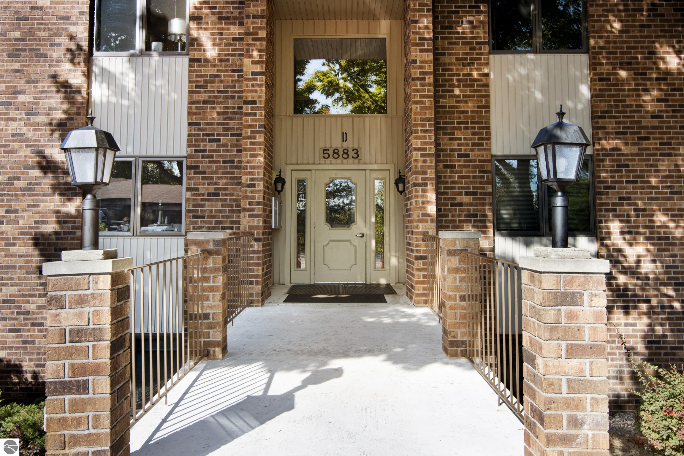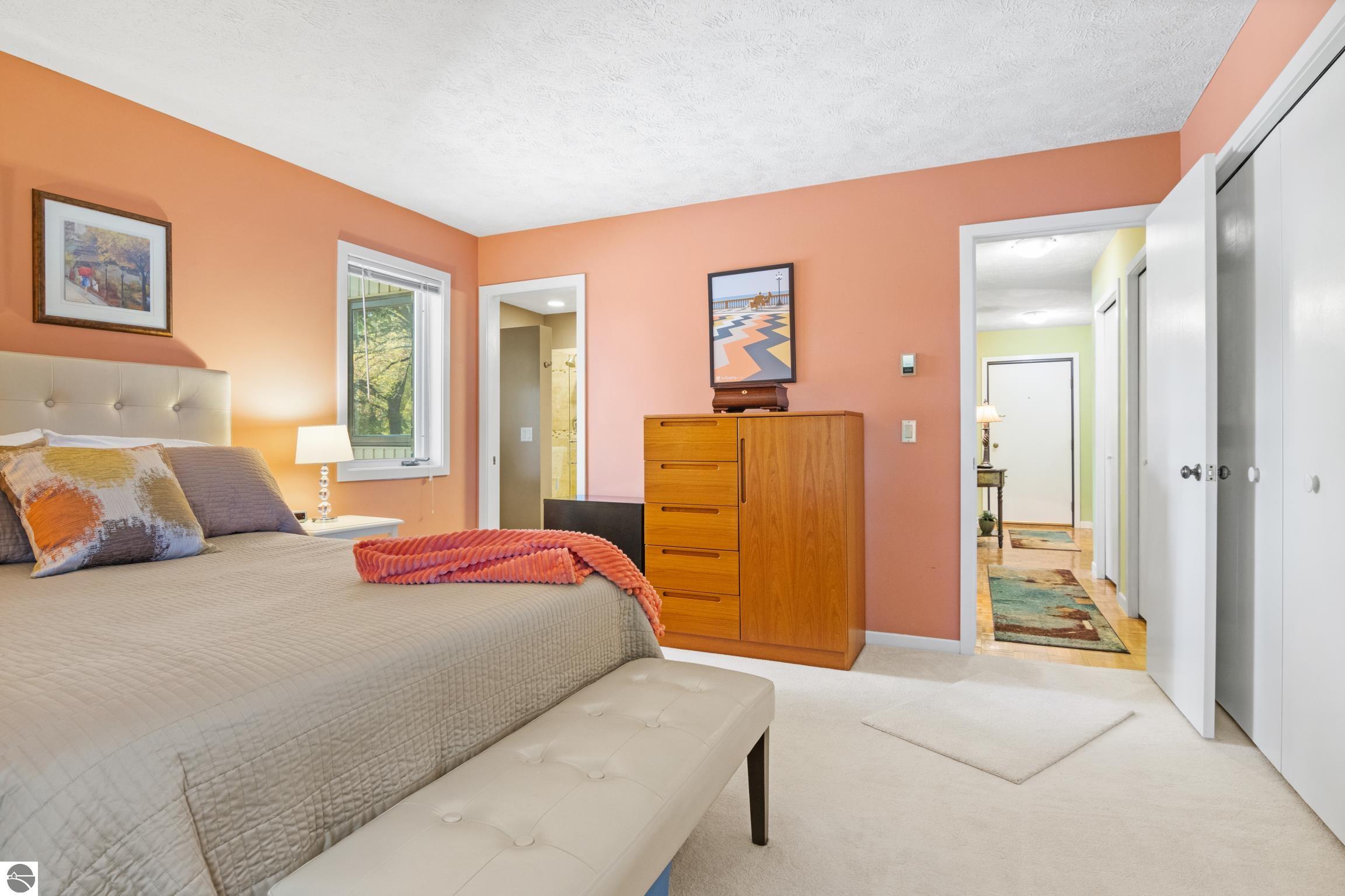 Enjoy some fun East Bay views from this immaculate 2 BR 2 Bath Condo in Juniper Hills. Check out the fantastic location offering both maximum privacy and convenience close to Bay beaches and parks, the TART trail, and the Grand Traverse Resort spa, golf, shops, and restaurants. This upper end unit is found in the end building and has a great layout for social gatherings. There is a bay view from the kitchen through the dining room and wooded views from the living room through the three-season porch. Many updates include the tiled kitchen floor and backsplash, new paint palette throughout, plus an updated primary bath with tiled shower, glass shower door, and Cambria counter. The living room features a cozy, woodburning, brick fireplace and large windows framing a glass door to the screened 10x12 porch, where you can catch a breeze, read a book, or entertain in a treehouse ambiance. The dining room offers another entry to the porch. A real laundry room, not a closet, offers counter space, drawers and shelves in addition to the washer and dryer. All major appliances are included. Amenities include efficient hot water baseboard heat, cable TV and internet. Your monthly maintenance fee covers heat, water, sewer, waste removal, and the usual exterior building and grounds maintenance, including snow removal. Park your vehicle and bicycles in the oversized one-car garage with an electric door opener, located just steps from the door. And, don't worry, the usual pet is allowed.