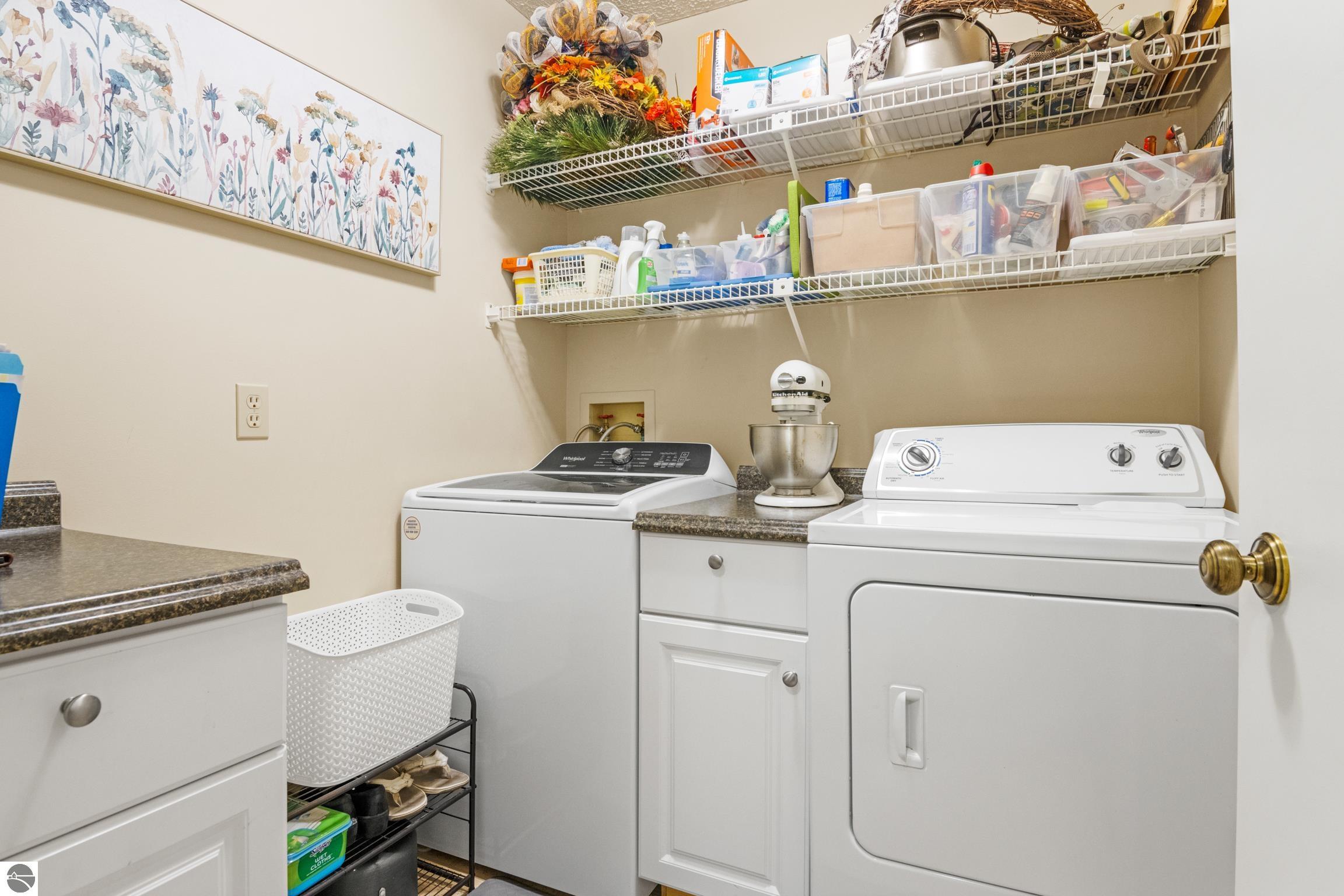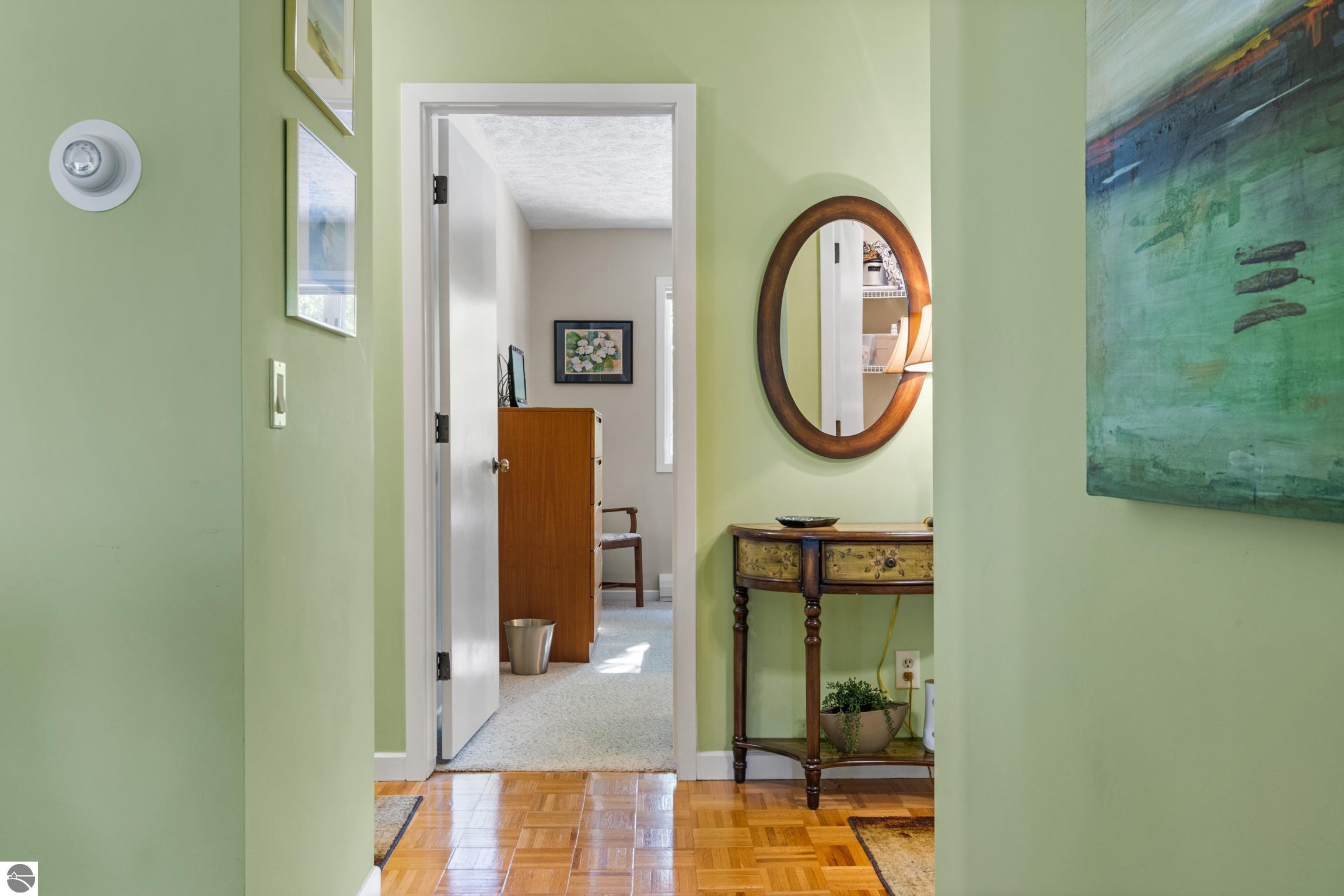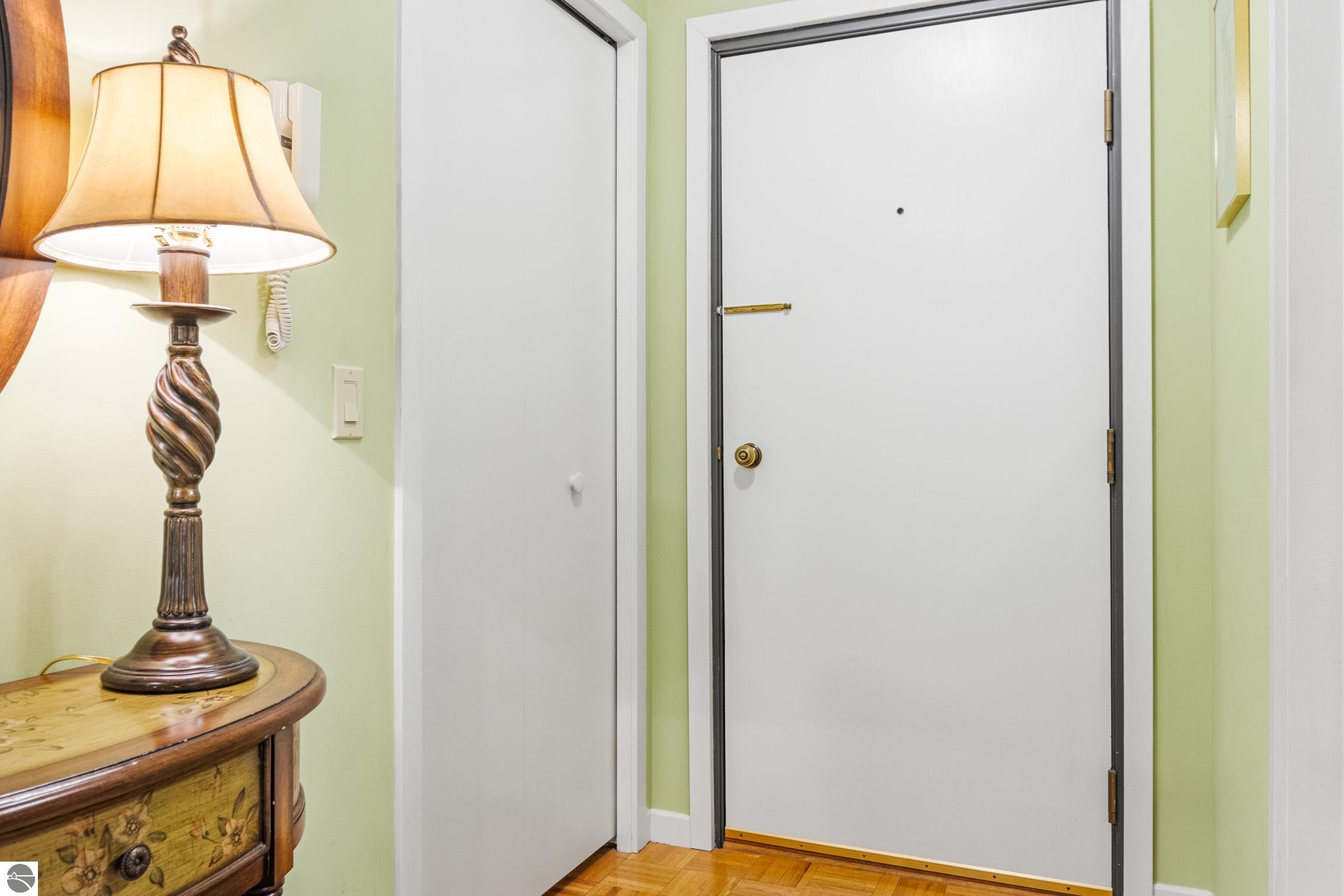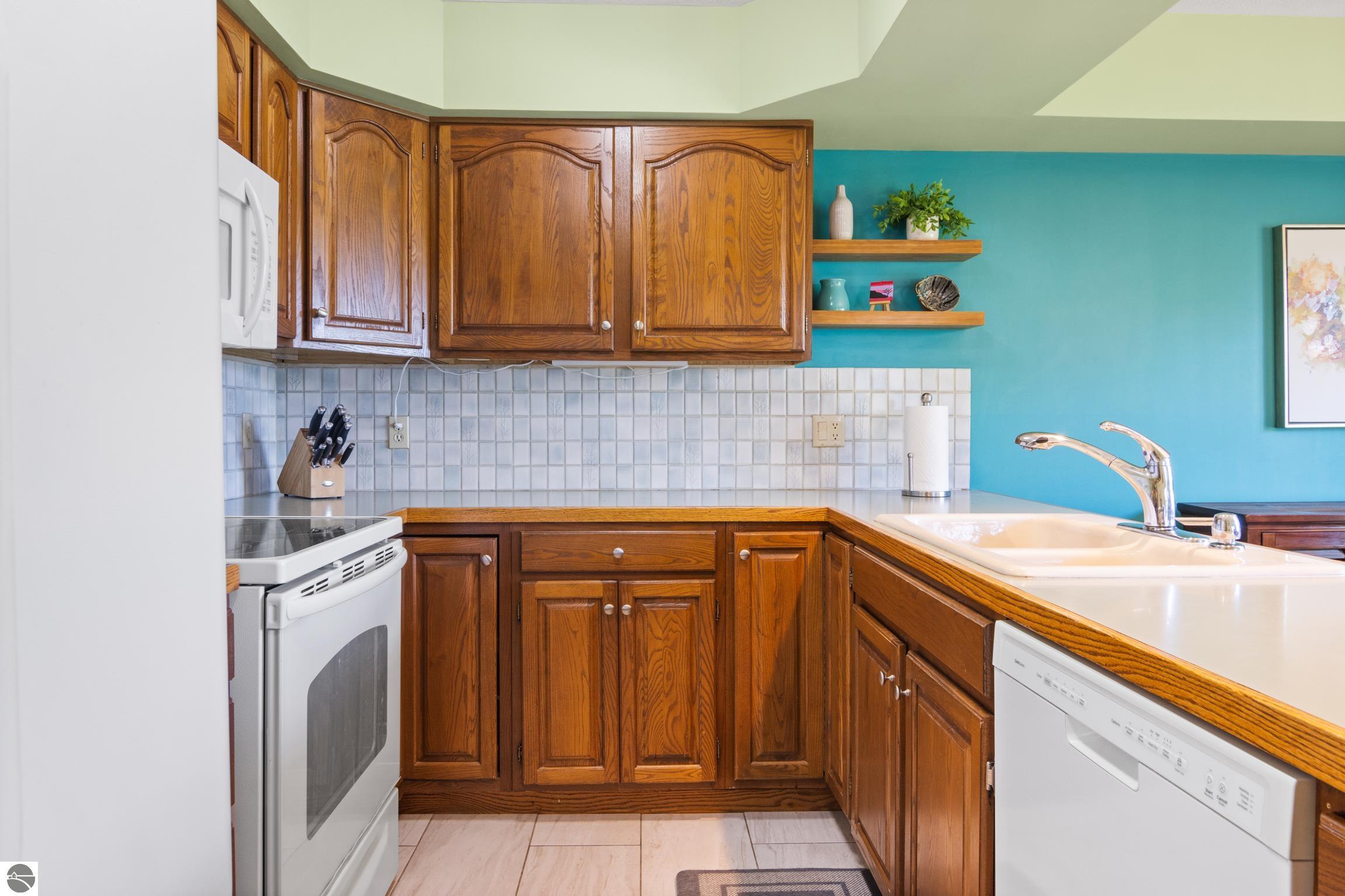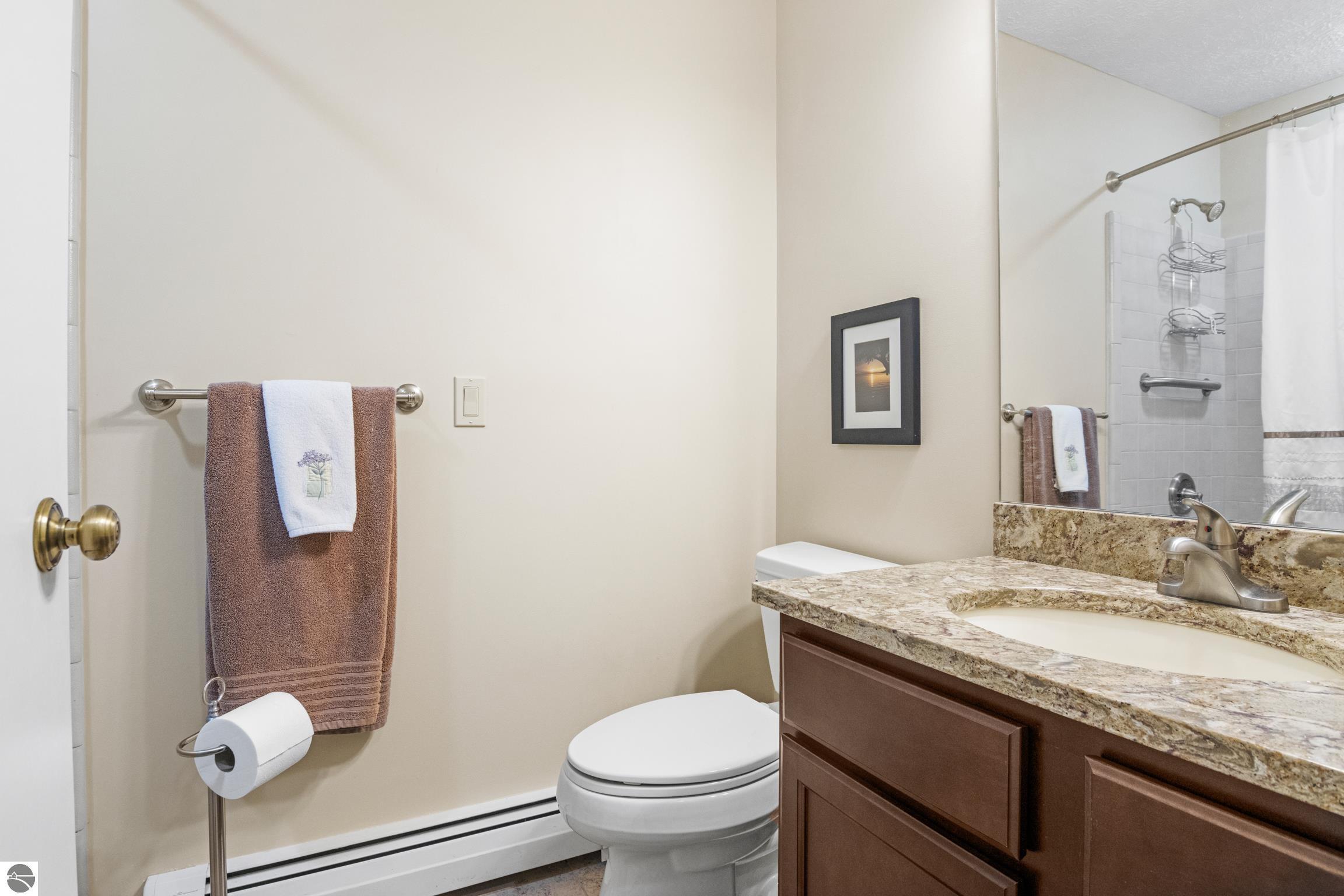Enjoy some fun East Bay views from this immaculate 2 BR 2 Bath Condo in Juniper Hills. Check out the fantastic location offering both maximum privacy and convenience close to Bay beaches and parks, the TART trail, and the Grand Traverse Resort spa, golf, shops, and restaurants. This upper end unit is found in the end building and has a great layout for social gatherings. There is a bay view from the kitchen through the dining room and wooded views from the living room through the three-season porch. Many updates include the tiled kitchen floor and backsplash, new paint palette throughout, plus an updated primary bath with tiled shower, glass shower door, and Cambria counter. The living room features a cozy, woodburning, brick fireplace and large windows framing a glass door to the screened 10x12 porch, where you can catch a breeze, read a book, or entertain in a treehouse ambiance. The dining room offers another entry to the porch. A real laundry room, not a closet, offers counter space, drawers and shelves in addition to the washer and dryer. All major appliances are included. Amenities include efficient hot water baseboard heat, cable TV and internet. Your monthly maintenance fee covers heat, water, sewer, waste removal, and the usual exterior building and grounds maintenance, including snow removal. Park your vehicle and bicycles in the oversized one-car garage with an electric door opener, located just steps from the door. And, don't worry, the usual pet is allowed.