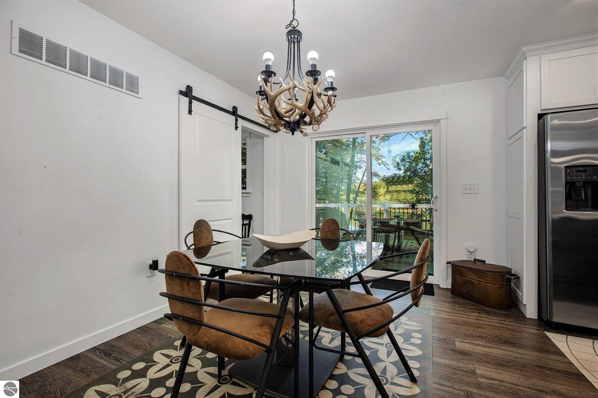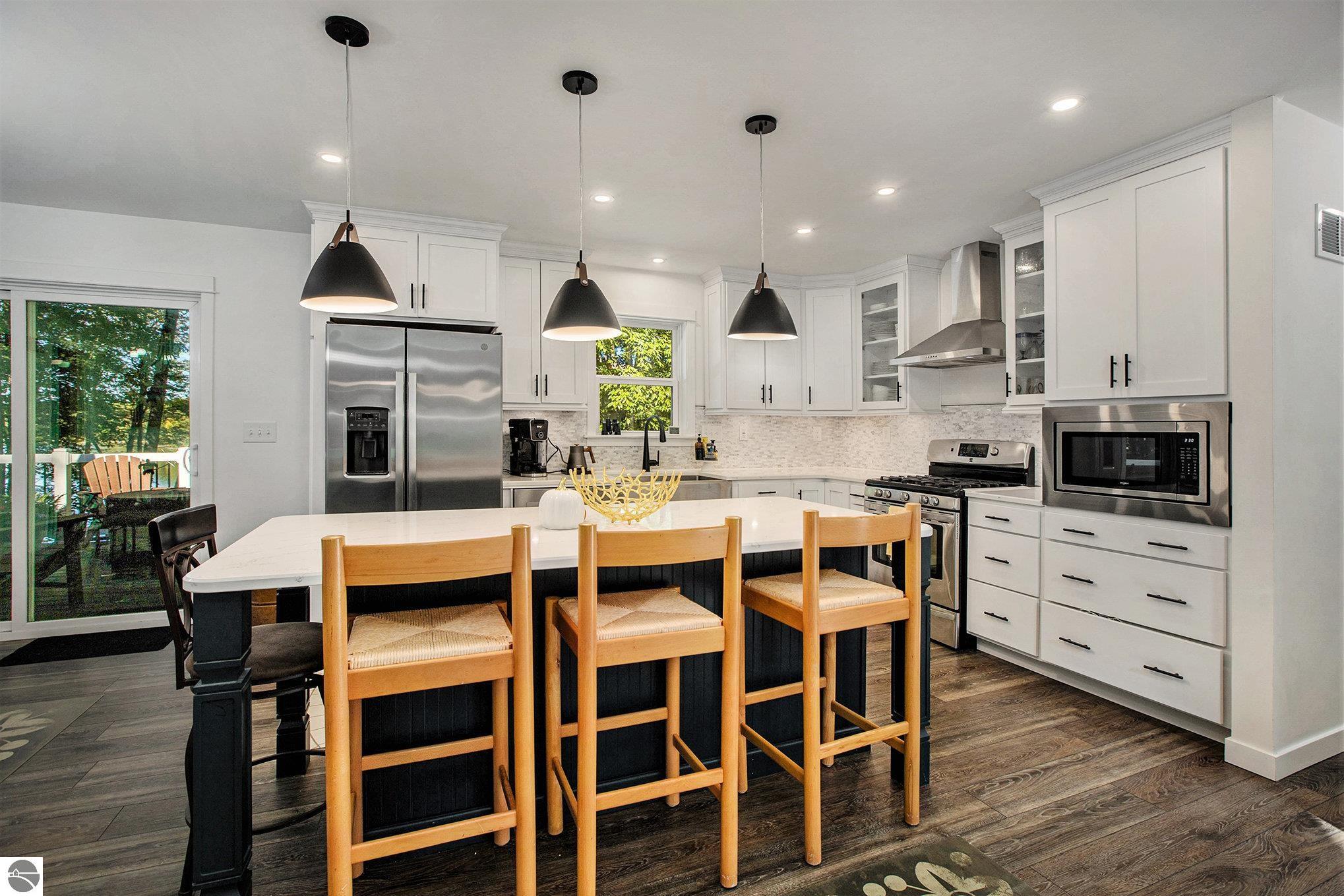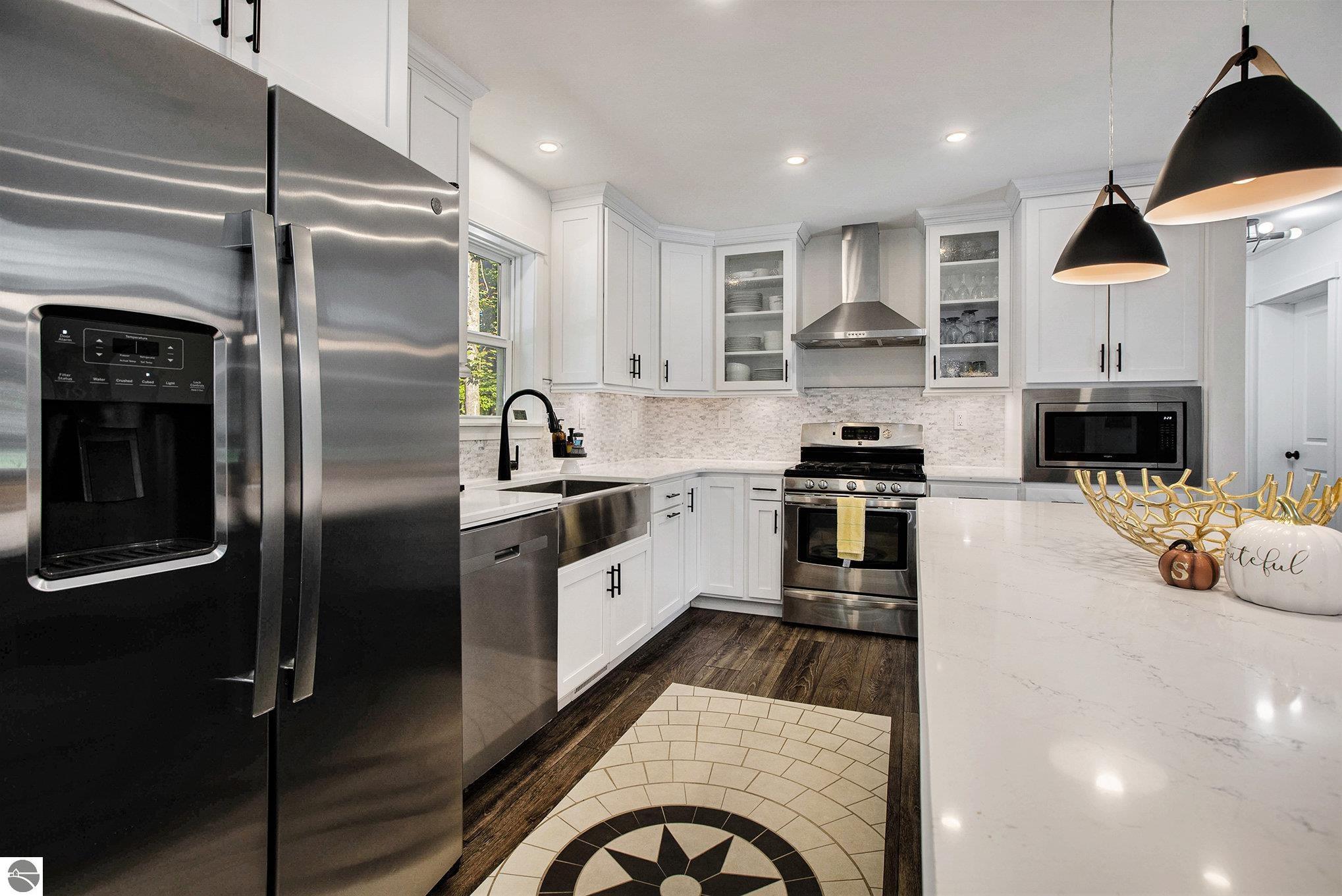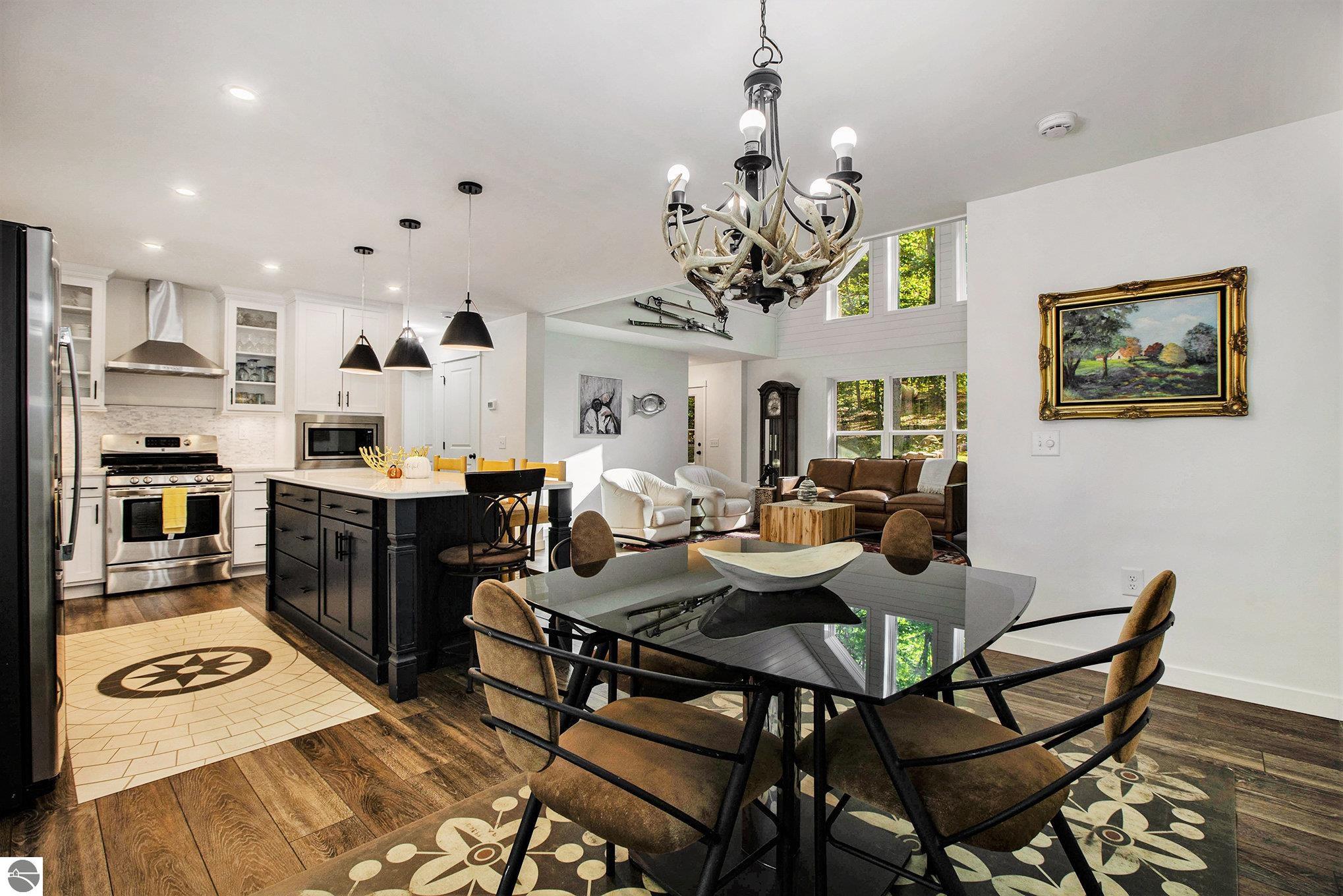 Welcome to modern lakeside living with this beautifully crafted 3-bedroom, 2-bath ranch-style home offers 100 feet of private frontage on the tranquil shores of Turtle Lake. Surrounded by mature hardwoods and offering breathtaking sunset views, this newly constructed home offers modern comfort with natural serenity. Inside, you'll find a thoughtfully designed open-concept floor plan, perfect for entertaining. The beautifully designed kitchen features stainless steel appliances, quartz countertops, a large center island, and an eye-catching tile backsplash. The living room offers tall ceilings and a cozy wood-burning stove, creating a warm, inviting atmosphere year-round. The primary suite is a true retreat, complete with a walk-in closet and spa-like bath featuring a double vanity and tiled walk-in shower. Two additional bedrooms and a full guest bathroom provide ample space for family or visitors. Step outside and immerse yourself in lake life, enjoy your morning coffee on the composite deck, take a soak in the hot tub, or rinse off after a swim in the outdoor shower. The sandy-bottom lakefront is ideal for swimming, kayaking, paddleboarding, and quiet relaxation. A 30x40 pole barn offers abundant storage with full electric service—perfect for your boat, RV, or seasonal toys. Nature lovers will appreciate the setting and Turtle Lake is home to a variety of fish, native birds and abundant wildlife. Best of all, the property backs up to hundreds of acres of adjacent State Land, offering endless opportunities for hiking, snowshoeing, hunting, and year-round adventure. All this in a peaceful, private neighborhood, just 20 minutes from Traverse City and close to Lake Michigan, Crystal Lake, Crystal Mountain Resort, and the iconic M-22 corridor leading to Sleeping Bear Dunes National Lakeshore. Whether you're seeking quiet relaxation, outdoor recreation, or proximity to Northern Michigan’s best attractions, this move-in-ready home delivers the full Up North lifestyle.