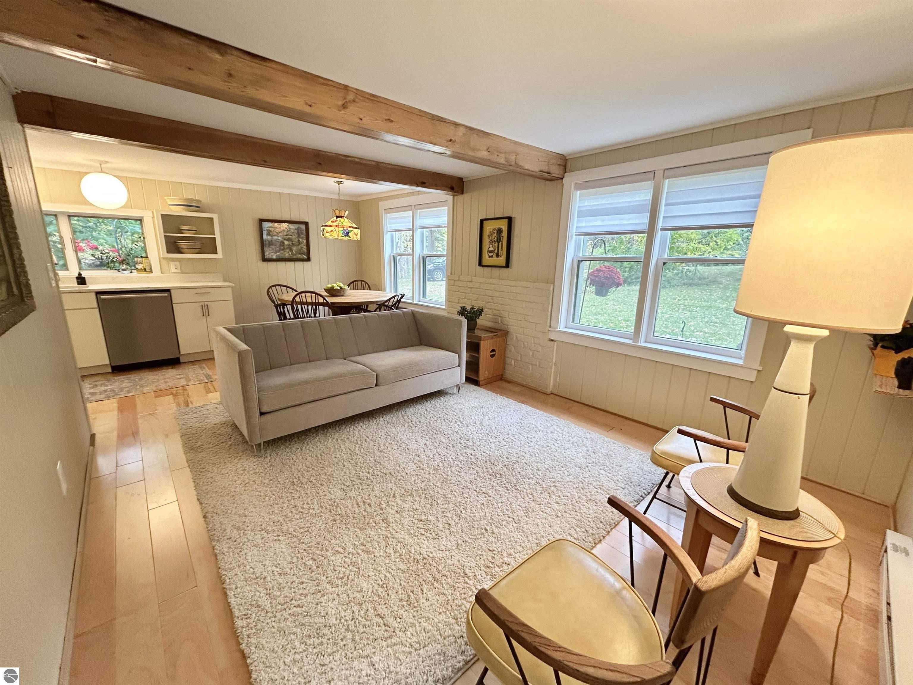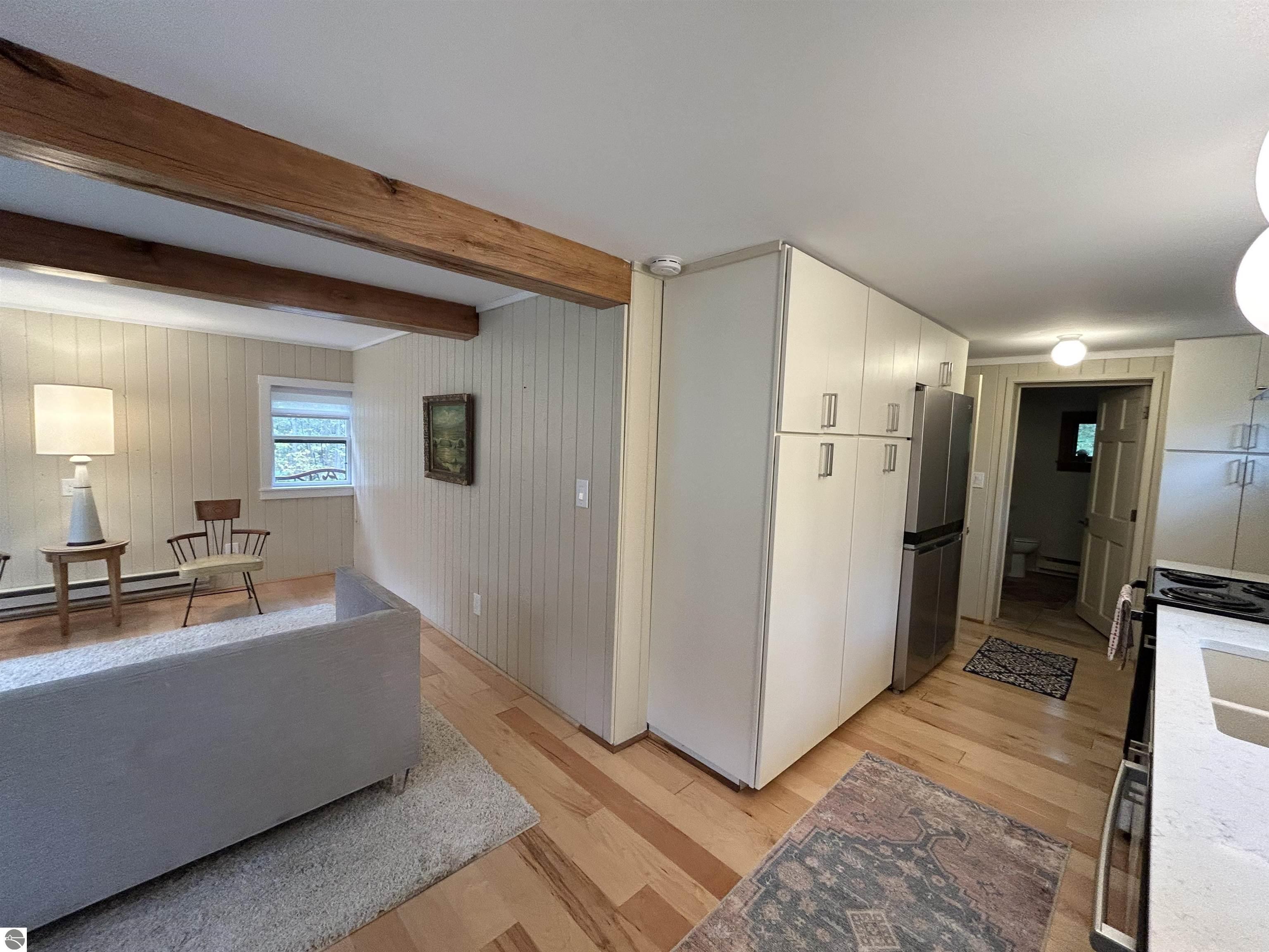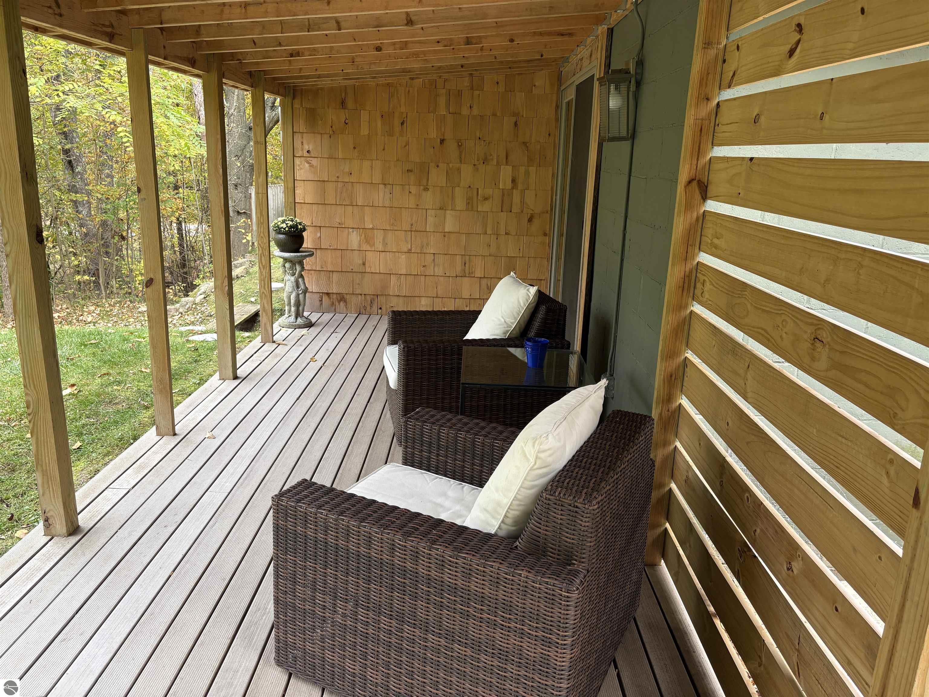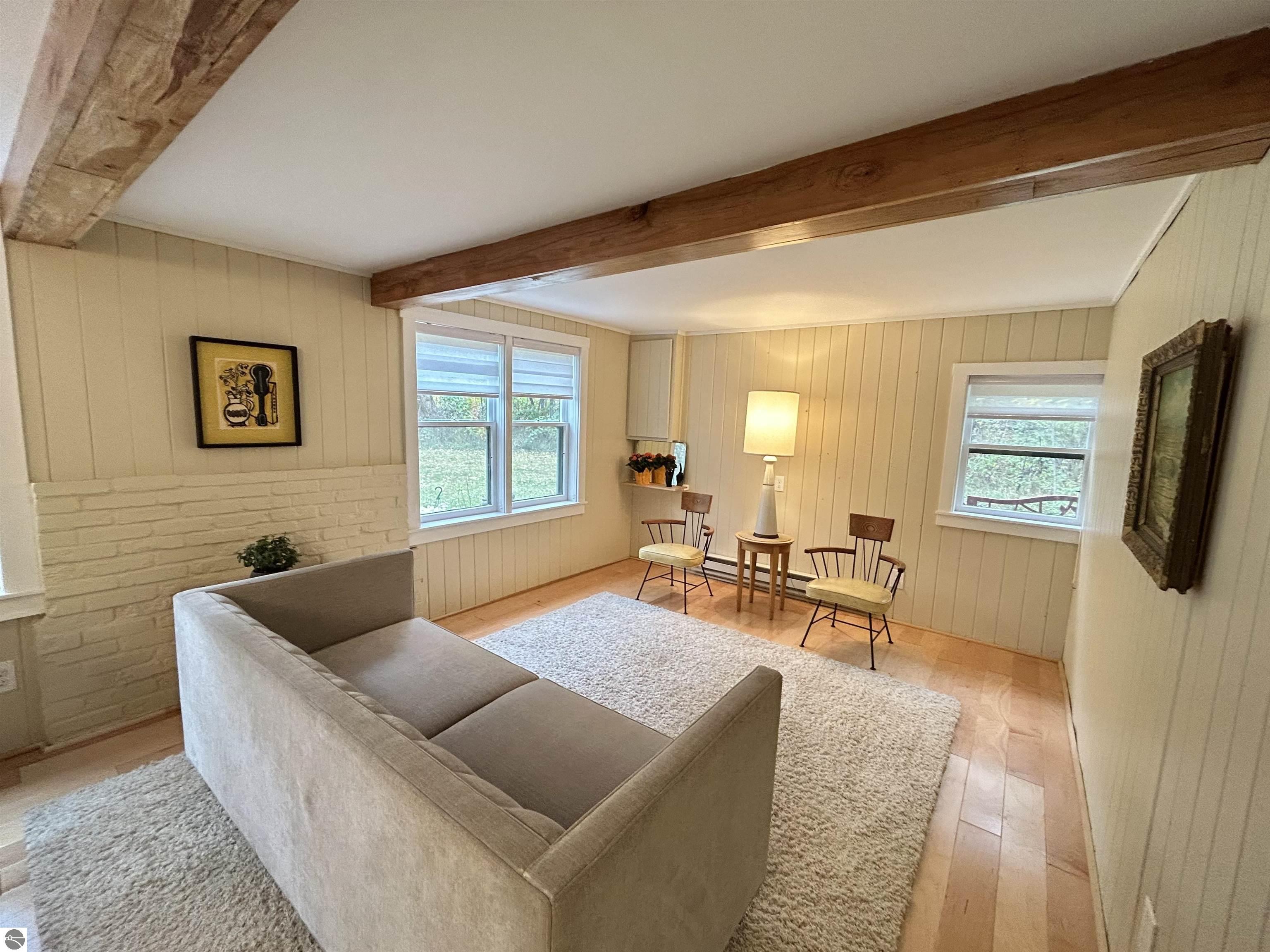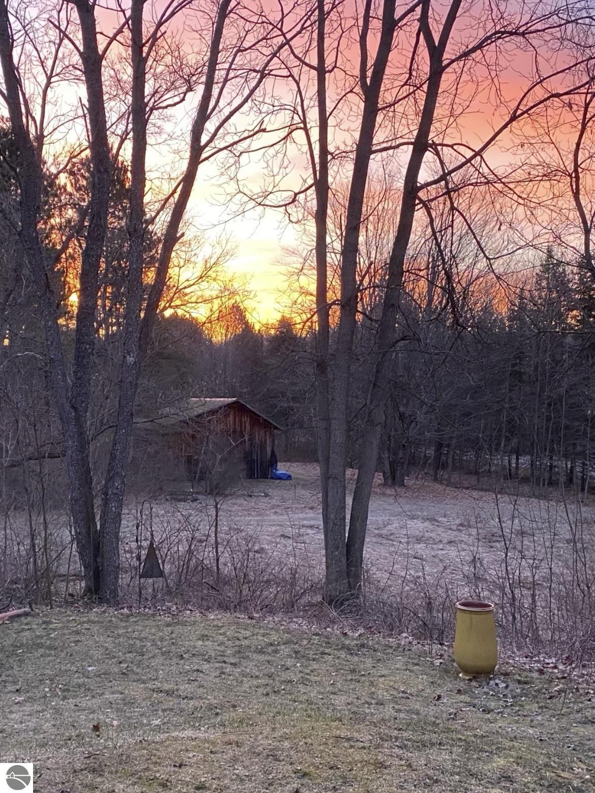 Welcome to your own private slice of Northern Michigan paradise! This beautifully updated 1-bedroom, 1-bath home is nestled on over 8 serene acres, ideal for anyone who loves the outdoors, dreams of homesteading, or simply wants room to breathe. Step inside to discover stylish updates throughout, including engineered maple floors, granite countertops, brand-new cabinetry, modern light fixtures, and updated appliances. The bathroom features a stunning tile and stone shower, offering a spa-like touch. Outside, the property truly shines. The large barn provides endless possibilities, great for a maker's space, woodworking, art, gardening, tinkering, or storing your outdoor equipment. A garden shed with electricity sits nearby the house, ready to be your potting station or cozy crafting retreat. The smaller outbuilding, previously used as an office, could easily serve as storage, a chicken coop, or even a creative studio. The open lean-to has possibilities also. Root Cellar...Yes Please! Spend peaceful mornings watching the sunrise over the barn, or quiet evenings relaxing under the covered porch, surrounded by the sounds of nature. In the winter months, enjoy cross-country skiing, snowshoeing, or snowmobiling, right on your own property or nearby trails. Enjoy the peaceful setting with views of the river's edge from the parcel, just south of Hooker Road. Whether you’re seeking a weekend getaway or a full-time homestead, this property offers the perfect balance of modern comfort and country charm. This property boasts a rustic setting, yet offers modern amenities for year-round living. This home is located just minutes away from the well-known Cherry Bowl Drive-In, approximately 15 minutes from the Sleeping Bear National Lakeshore, 5 minutes to the public access on Little Platte Lake and the Medenbrook Nature Preserve, 30+ minutes from Traverse City, 20 minutes from Frankfort, and more.